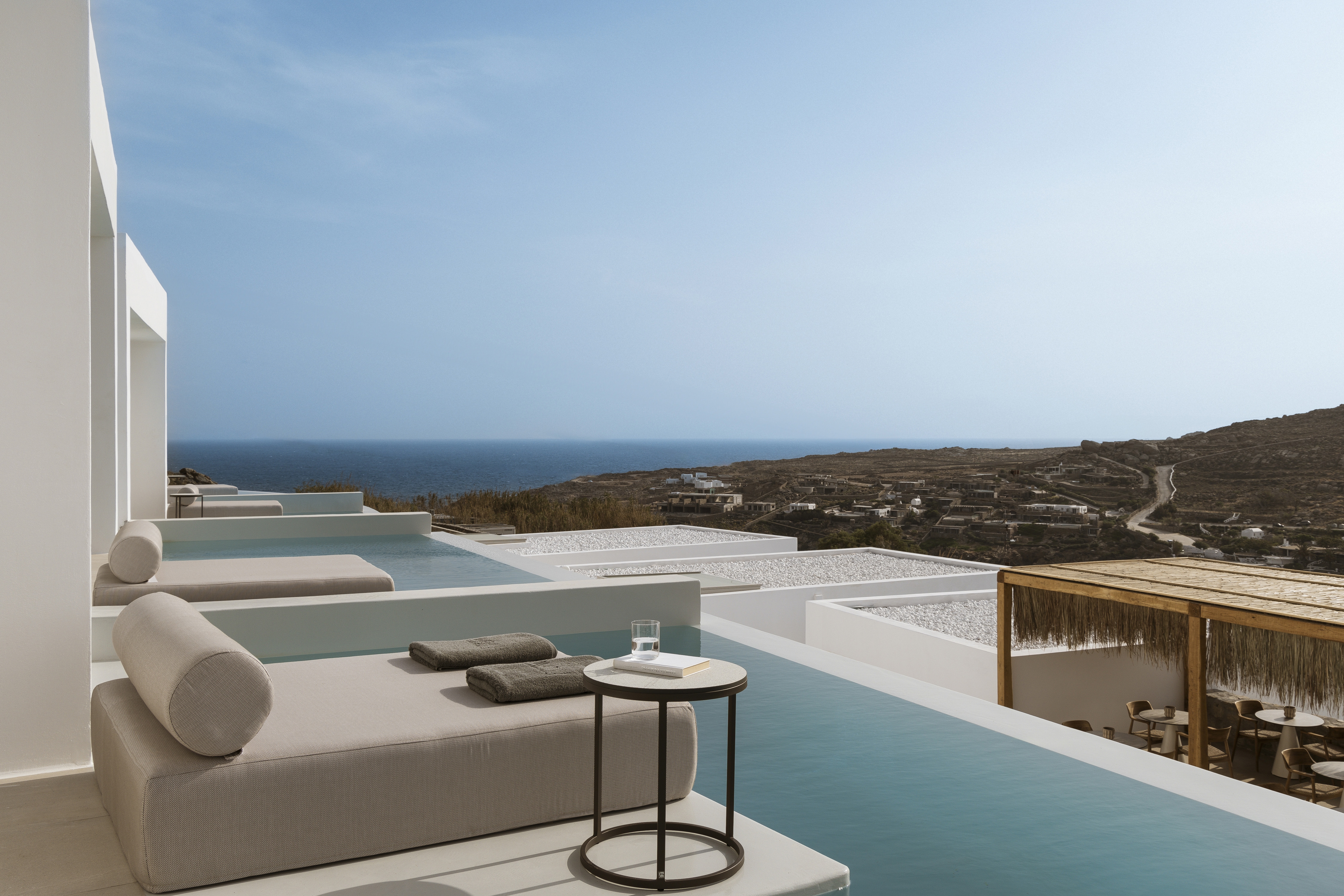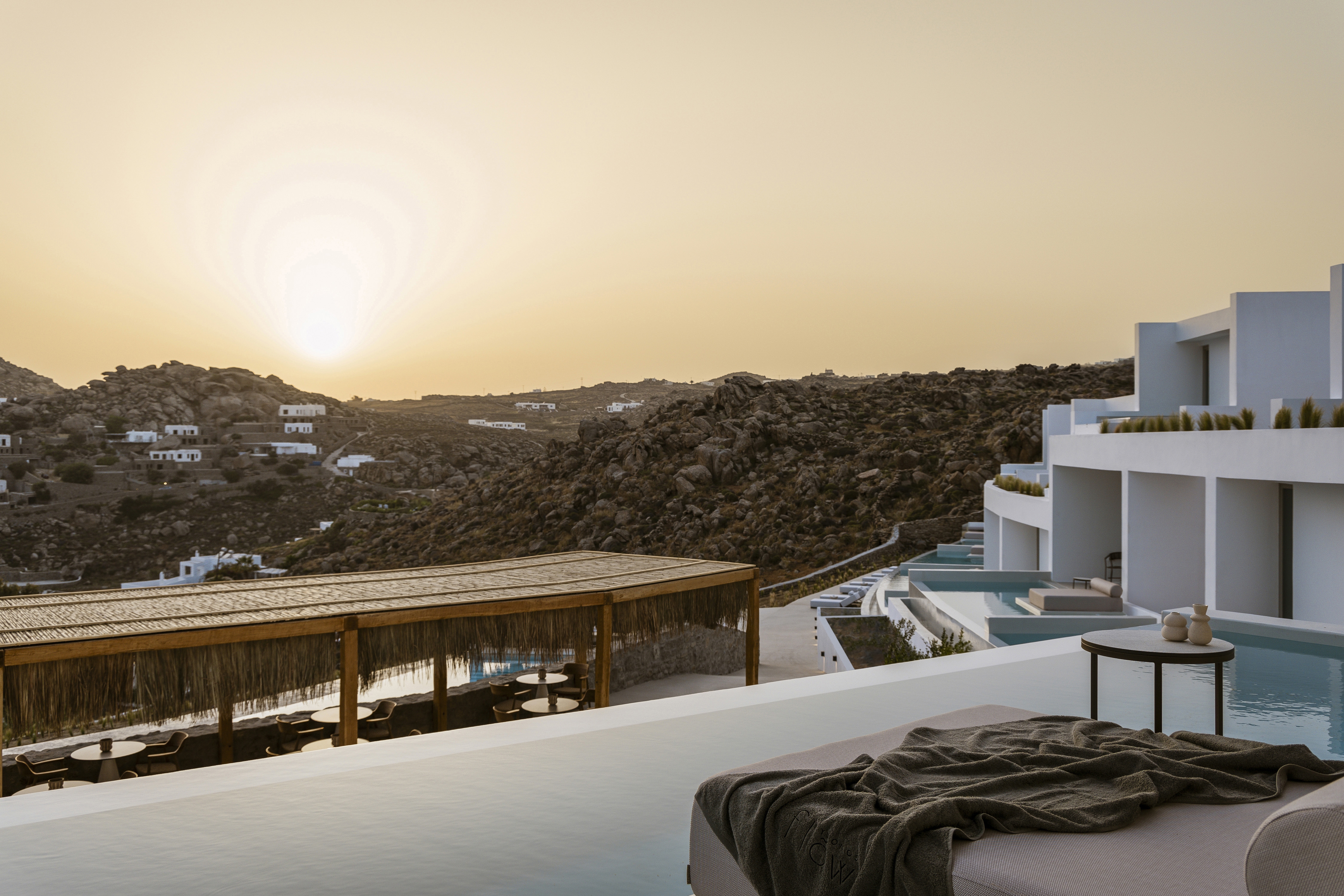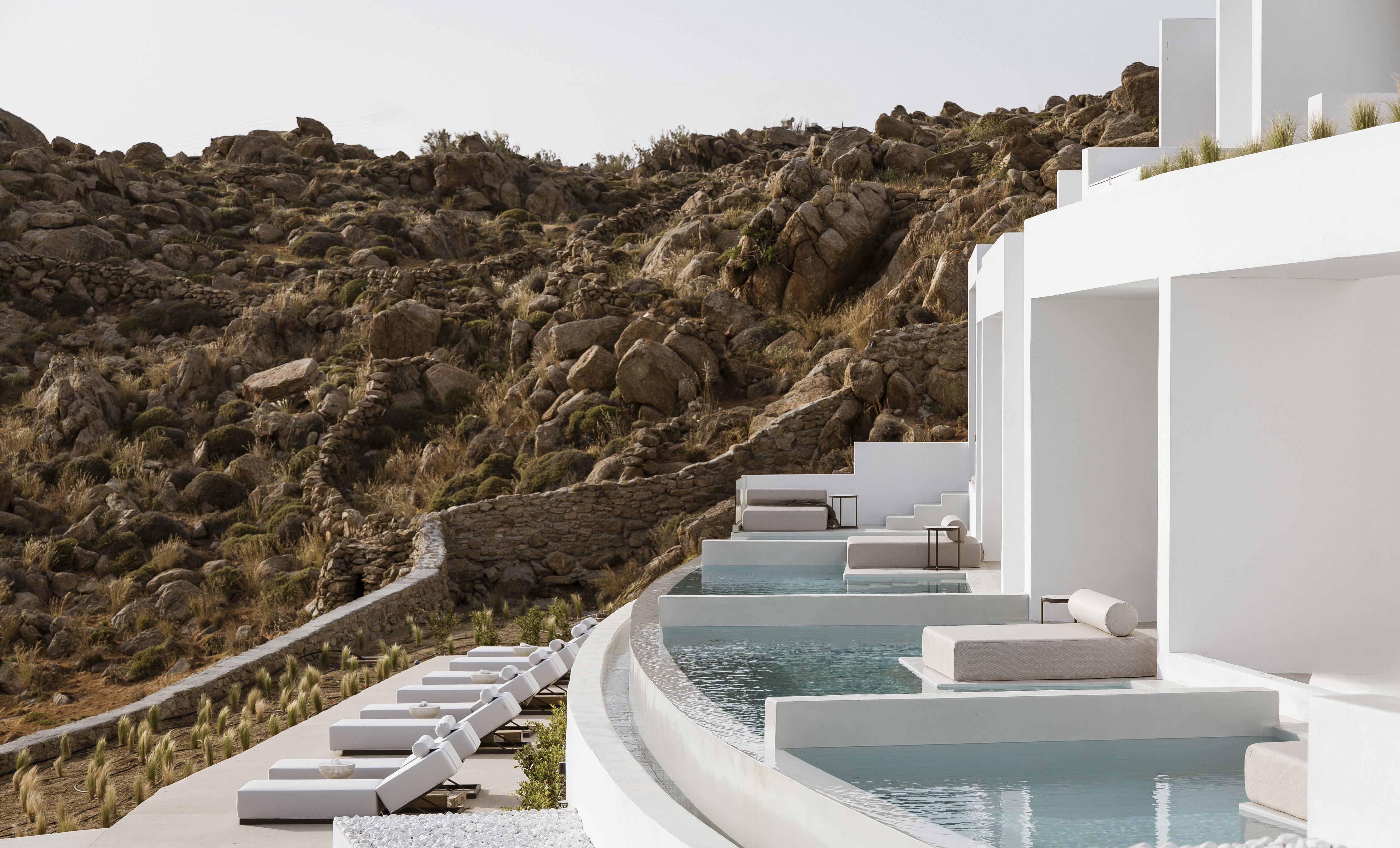 The flow project is a summer accommodation establishment complex in Mykonos, Greece, with amphitheatrical view to the Super Paradise beach. The 5* hotel comprises 21 suites, a lobby, a pool bar, a restaurant and a business center. The main intention of the design is to preserve and highlight the curved forms resulting from the intense terrain and their transcription into the hotel's structure. Prominent identifying element of the synthesis is the creation of longitudinal flow lines, translated into the basic form of the main volumes, as well as all the hotel's outdoor areas.
