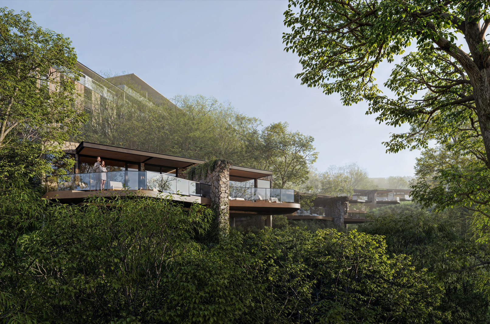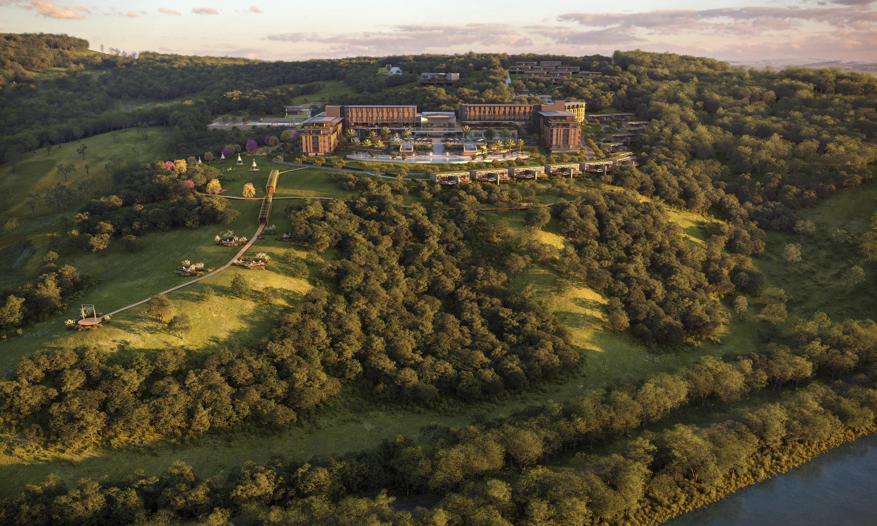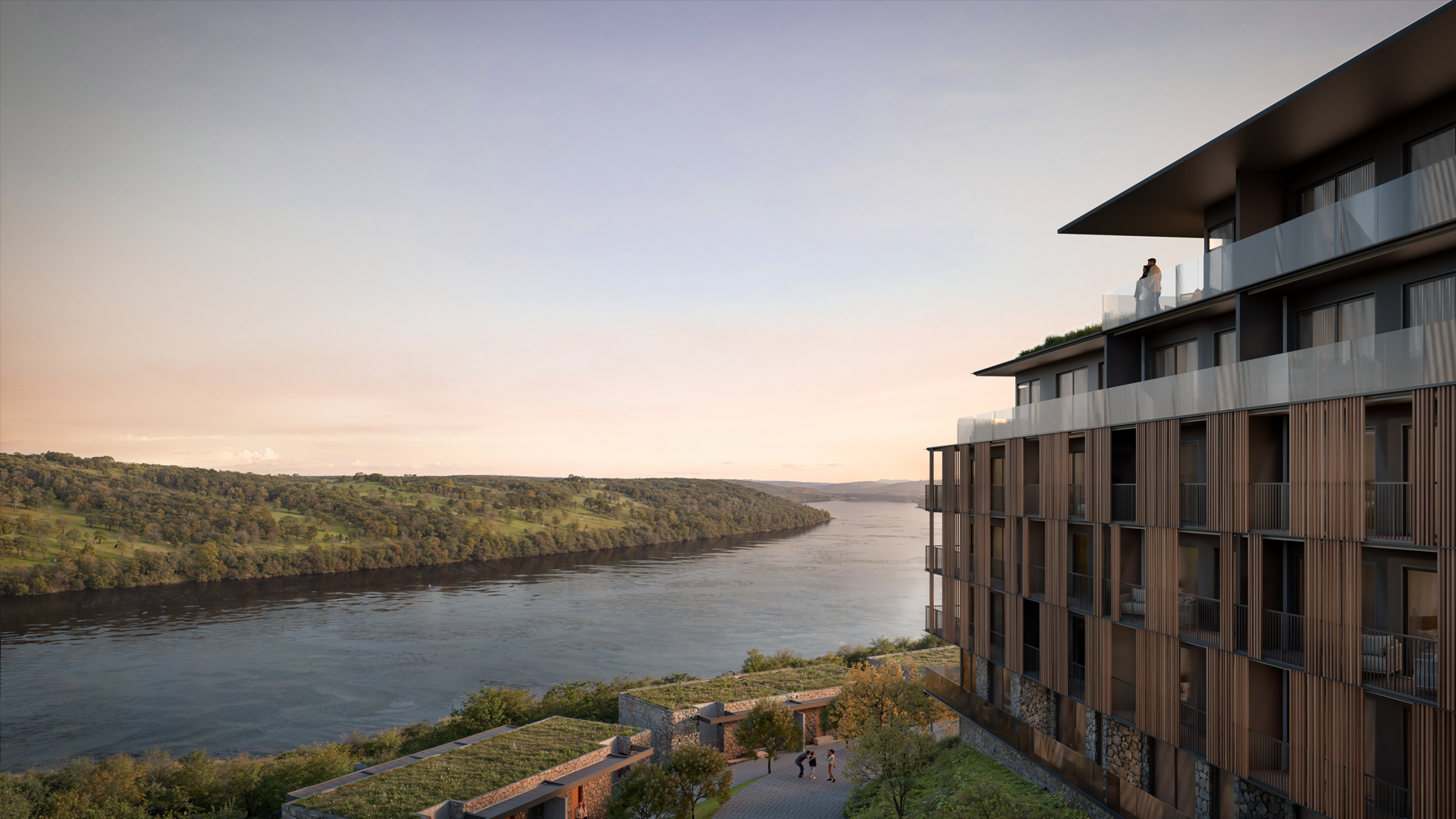 Costana is a sensorial retreat set above the Uruguay River, along the Brazil-Argentina border, in a region marked by Guarani heritage and Jesuit mission history. Despite its cultural and natural richness, the area lacks high-end hospitality infrastructure that reflects its identity. The project addresses this gap through architecture that respects and reinterprets local traditions. Inspired by vernacular costeiros—riverside huts—the design avoids pastiche, translating their spatial intelligence into elevated terraces and a continuous wooden skin. This element buffers thermal variations (3°C to 31°C) and prevailing winds while evoking the gaucho ritual of sharing chimarrão in shaded, semi-open spaces. The spatial strategy follows transatlantic ship logic: the upper deck houses reception and a panoramic restaurant; the middle contains indoor leisure areas; and the lower opens to cascading pools inspired by Salto do Yucumã. Private bungalows are embedded in terraced topography, ensuring immersion and privacy. A mirrored water ceiling crowns the restaurant, reflecting light and river imagery, blurring boundaries between architecture, nature, and memory.