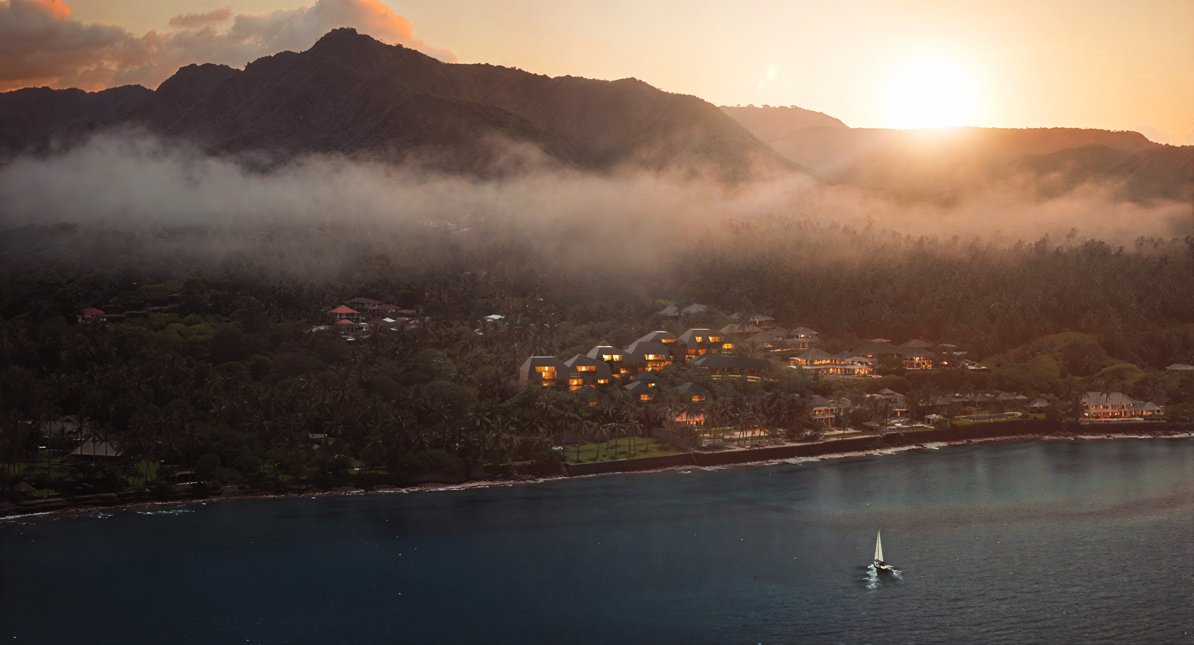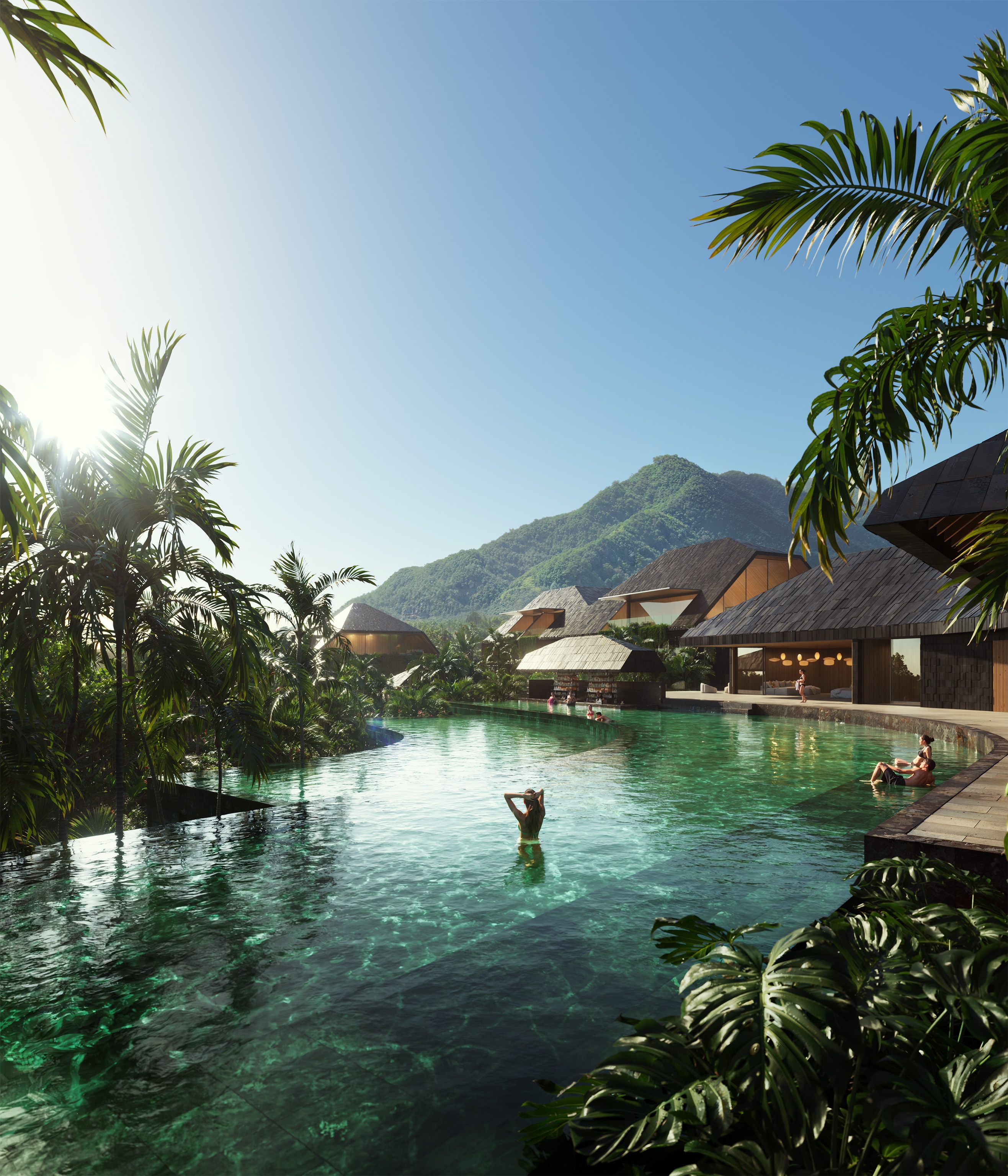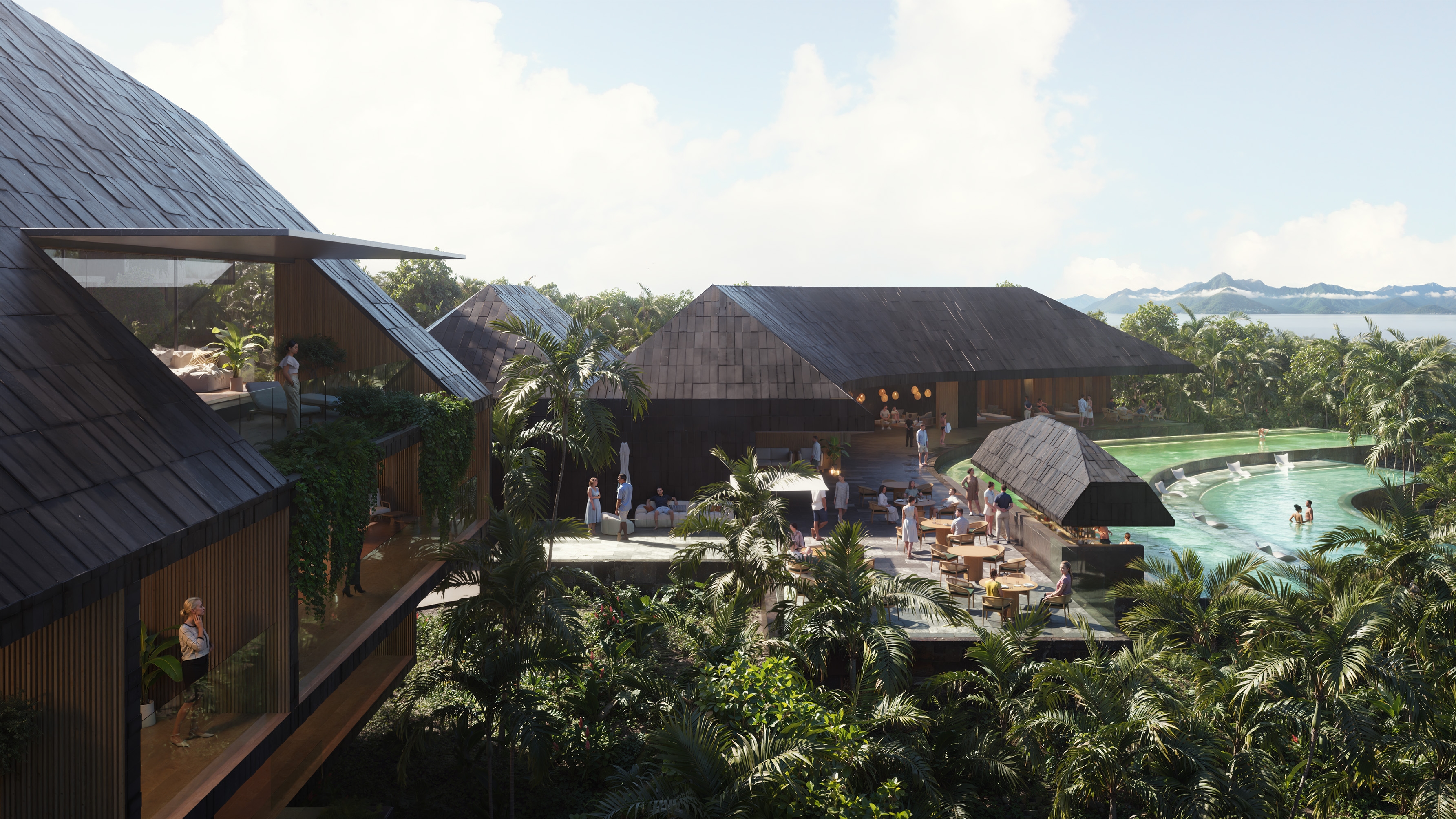 Comprising 60 keys ranging from studio suites to private villas and penthouses, the resort is organized as a cascading composition oriented toward the water. A reception, restaurant, spa, and central terraced pool with a swim-up bar form the social heart of the resort. Throughout, the design cultivates a careful balance of openness and intimacy: panoramic vistas unfold from rooms and terraces, while sheltered courtyards and lush vegetated edges offer quiet moments of retreat. The result is an immersive dialogue between landscape and architecture.
