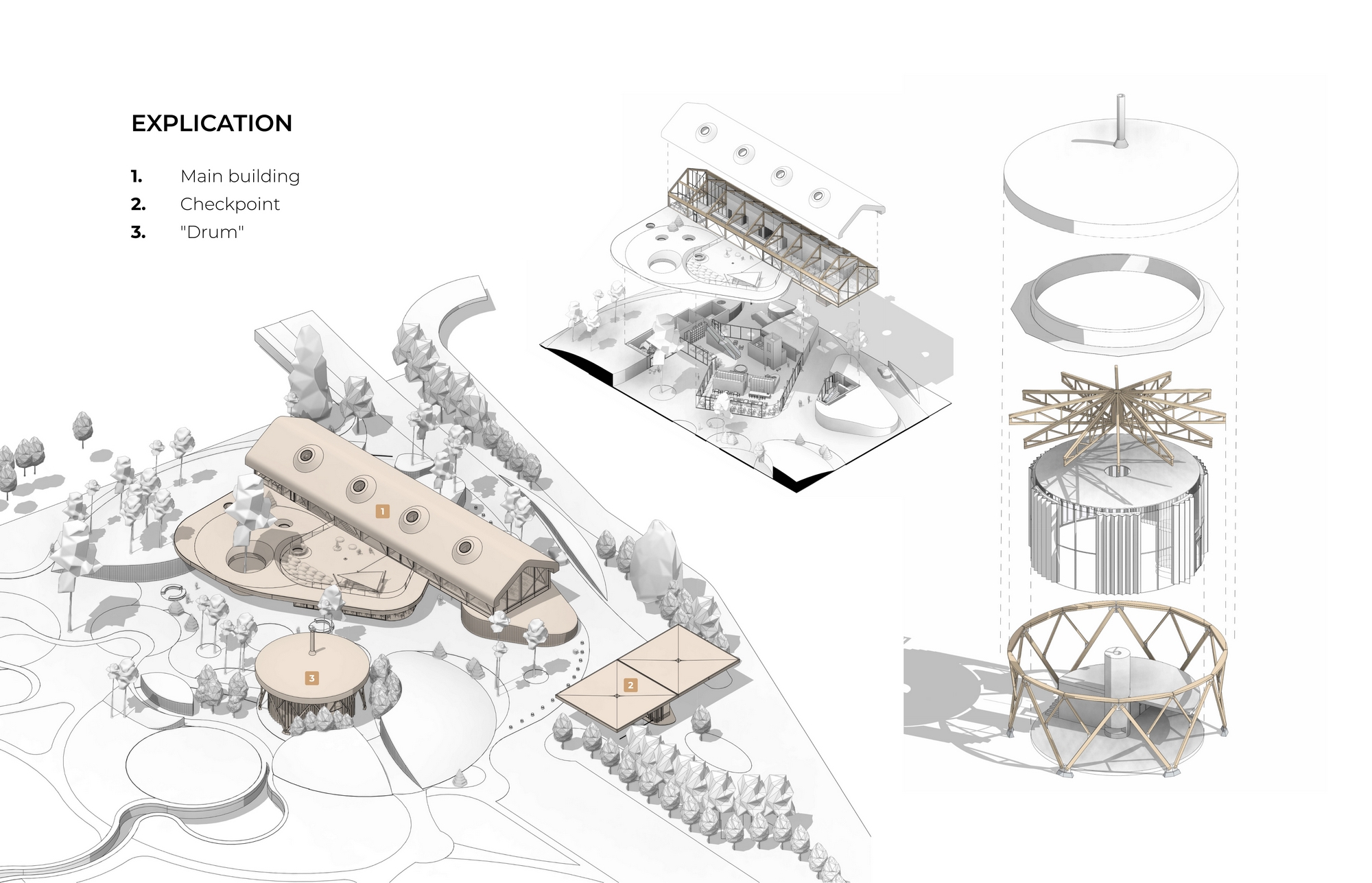 The main building brings together key public functions that support relaxation and social well-being: a bright lobby with a recreational zone, a full-service restaurant, and a children’s area designed for safe, mindful play. A lounge with a fireplace forms a cozy core of the first floor, offering residents a place to unwind in a soothing environment.