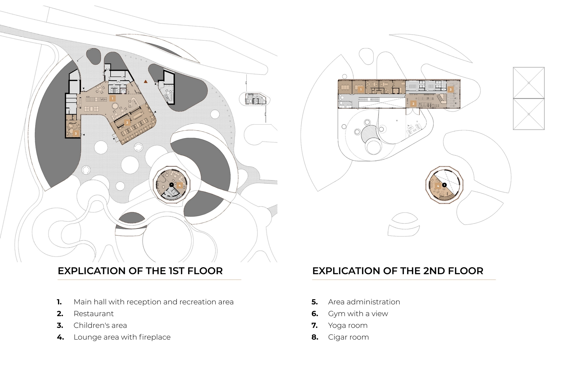 The second floor continues the wellness concept with an administration area, a gym with panoramic views that enhances the training experience, a serene yoga room for meditation, and an intimate cigar room for quiet, reflective leisure.