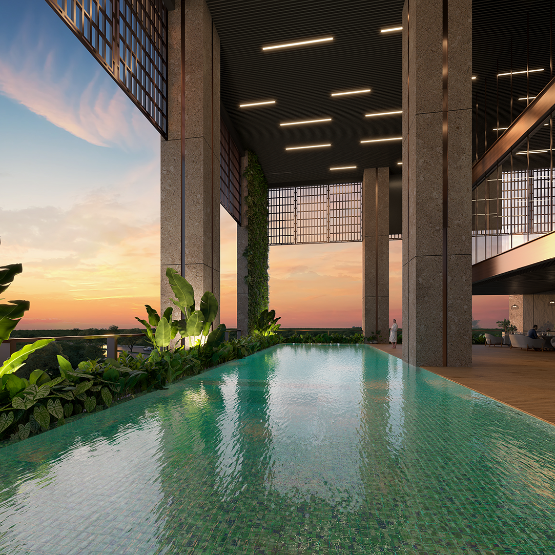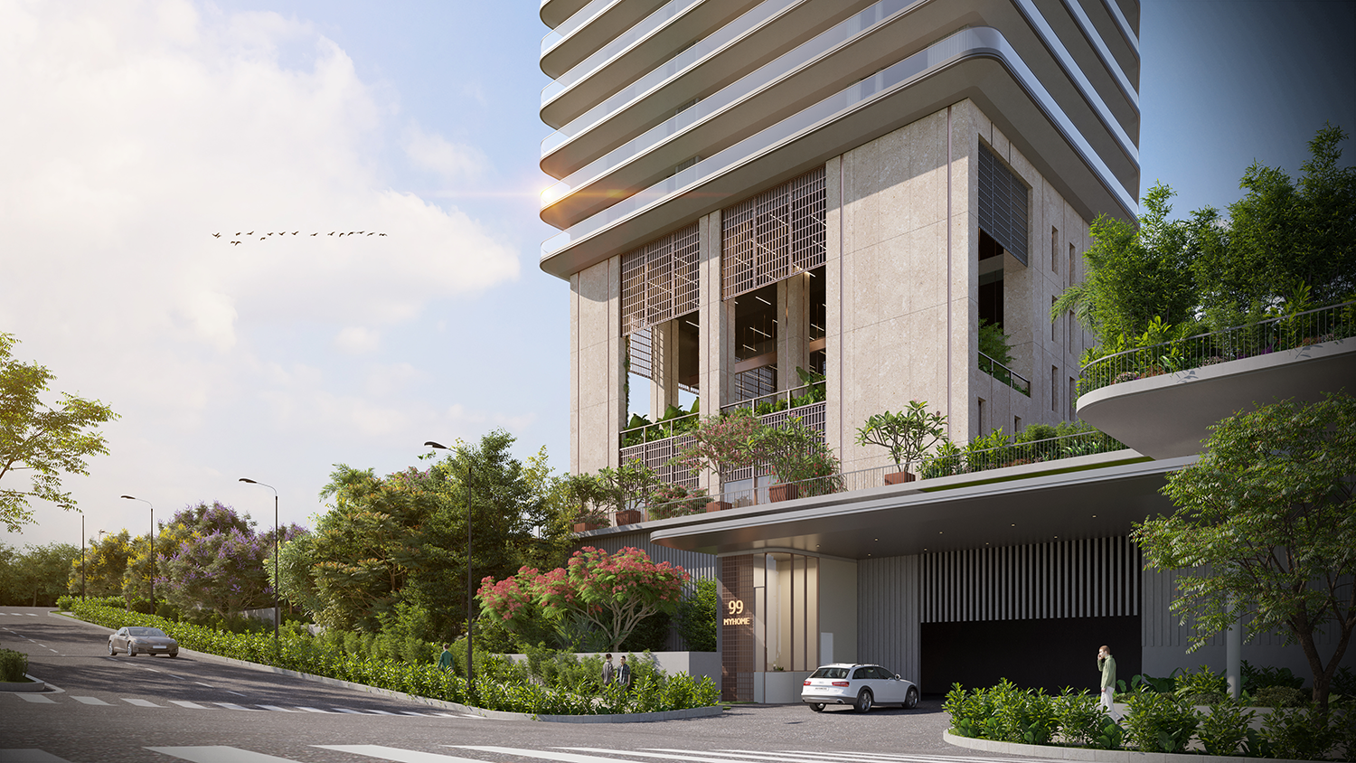Comprising 49 levels of residential units, each an expansive space of approximately 8,000sqf, Myhome99 offers breathtaking views of the tranquil lake, blending nature and luxury. Each floor houses two units designed to provide maximum comfort, with each unit featuring expansive balconies that seamlessly extend the living space, creating a sense of openness and connection with the surroundings. The use of Jaali (traditional Indian screens) as a key design element enhances the aesthetic appeal and provides practical benefits in terms of comfort and privacy.