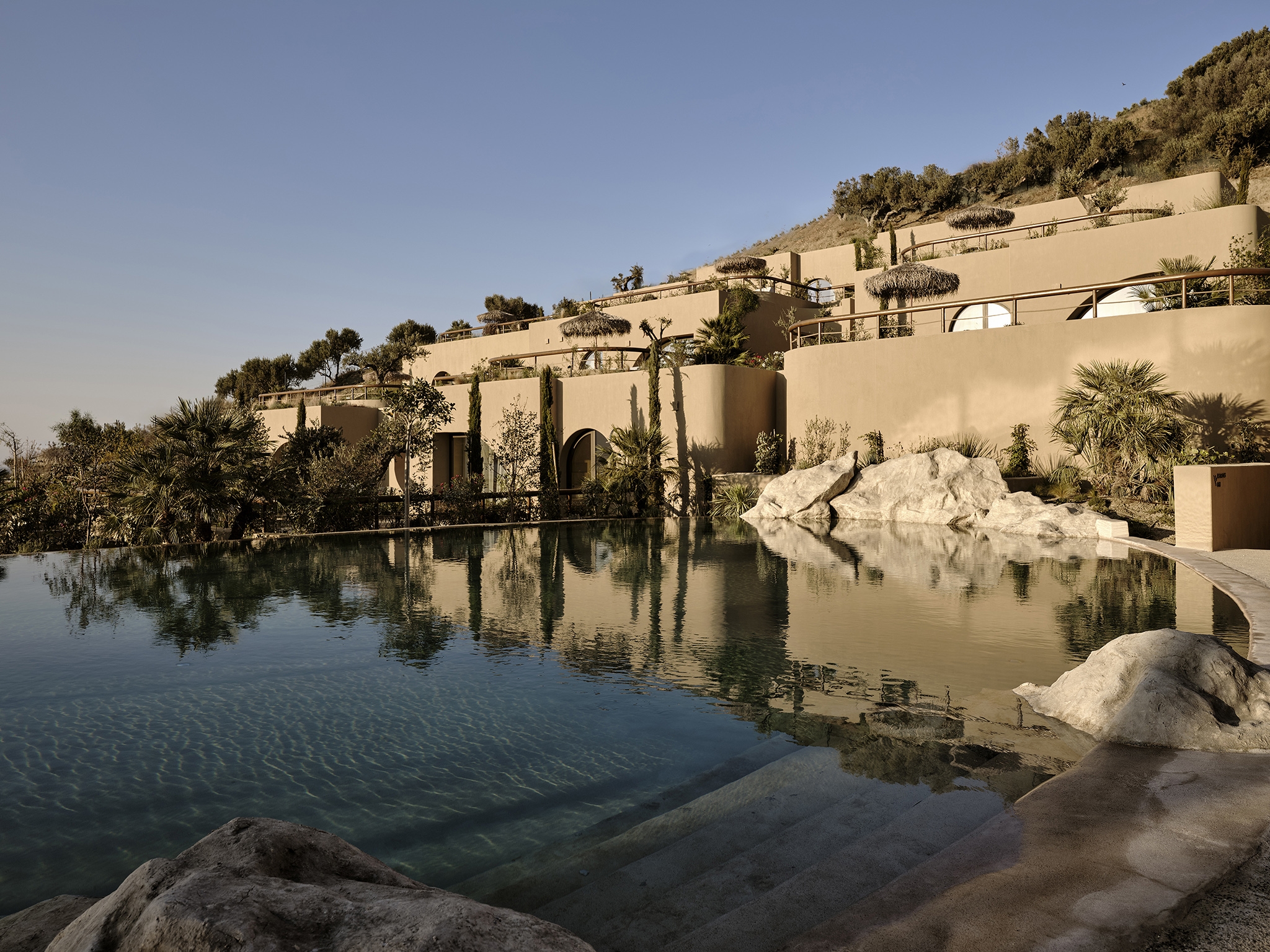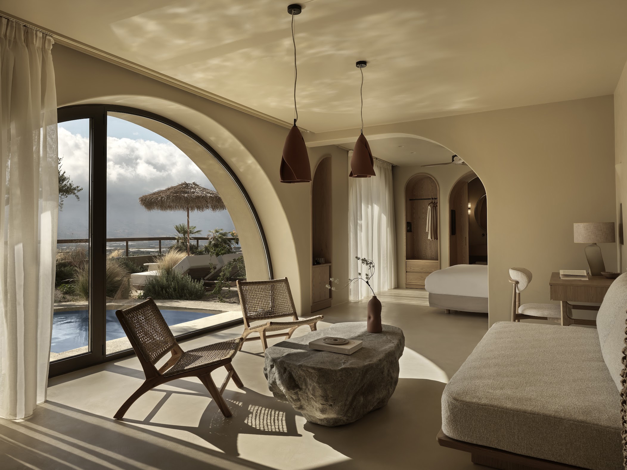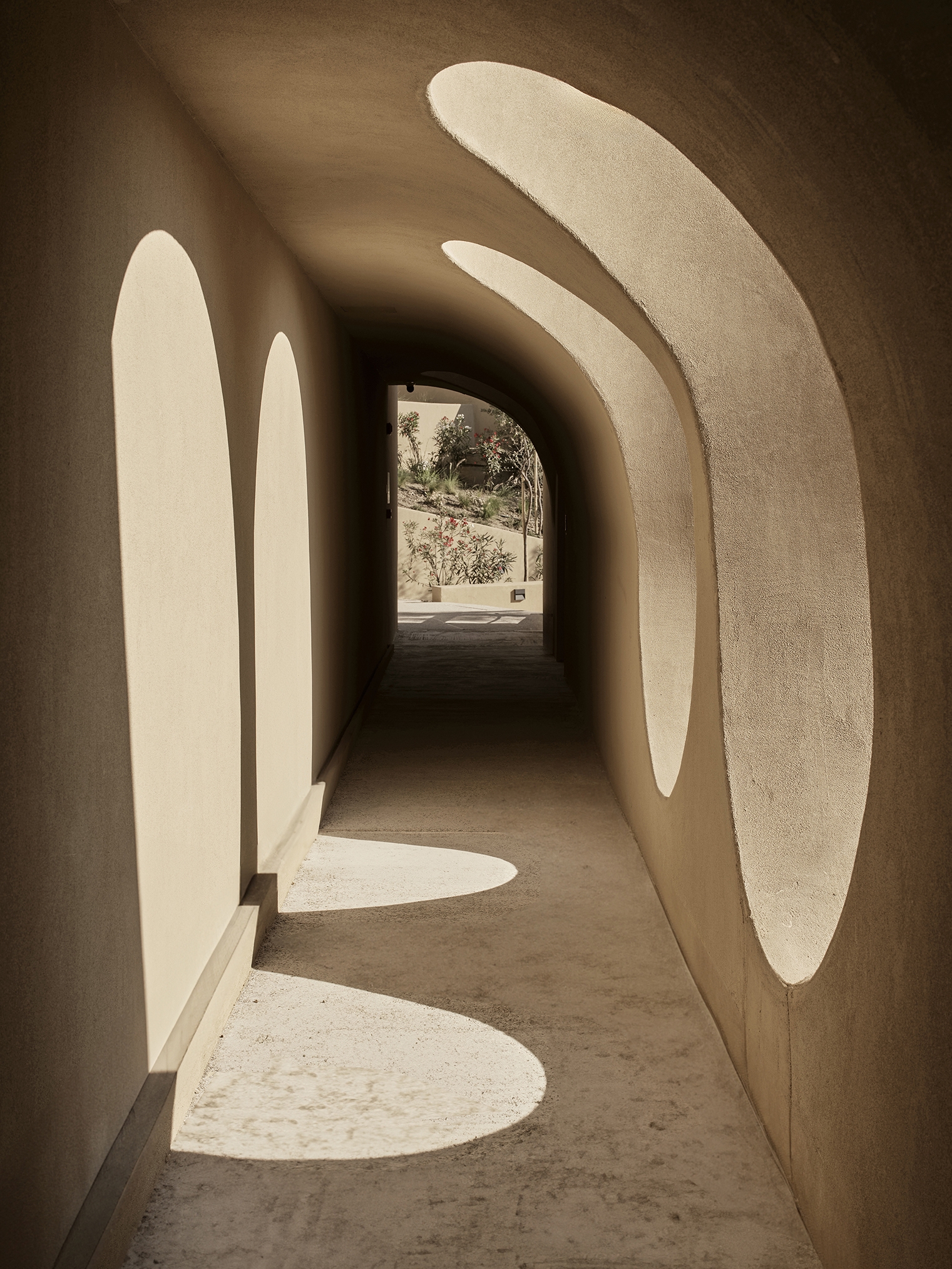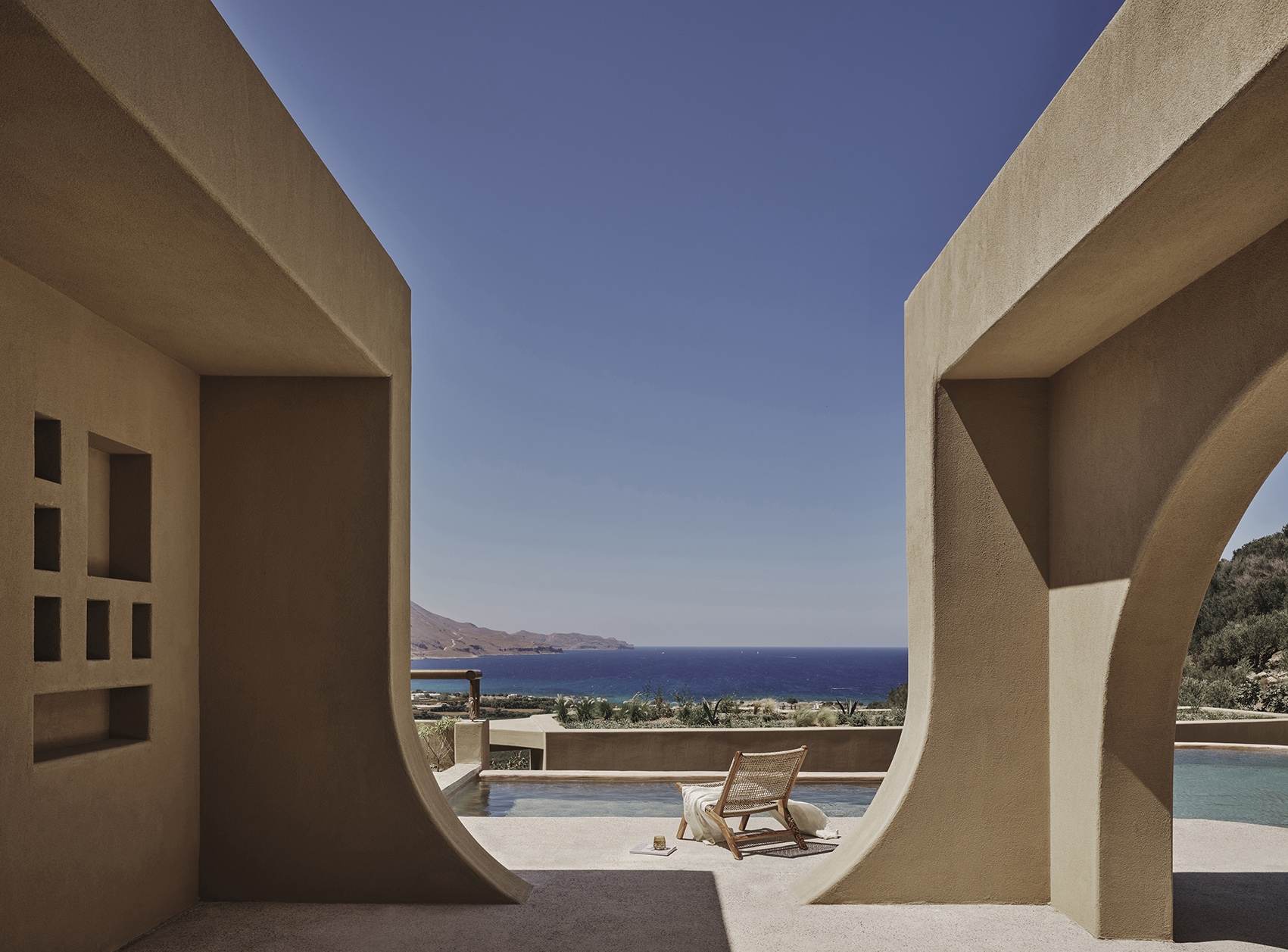 Tella Thera expresses Mediterranean hospitality through architecture rooted in tradition and sustainability. Conceived as a sanctuary outside Chania, the project blends cultural memory with contemporary design to create spaces that support environmental, sensory, and emotional renewal. Set on an olive-lined hillside overlooking the Aegean, the hotel unfolds as a calm sequence of encounters between land, light and texture. Full and half arches, abstracted from Venetian and Ottoman forms, translate Chania’s heritage into a modern language of light and texture. Interiors of continuous hand-applied microcement in earthy tones evoke cave-like stillness, shaped by the play of shadow and material. Outdoor rooms defined by water, plants, lime mortar, and local gravel form gentle microclimates that dissolve boundaries between architecture and landscape. Passive cooling, natural ventilation, and restored native flora reduce mechanical demand, creating a living ecological infrastructure. Slow, intimate, and regenerative, Tella Thera grows from the land, offering hospitality defined by authenticity, simplicity and biophilic minimalism.