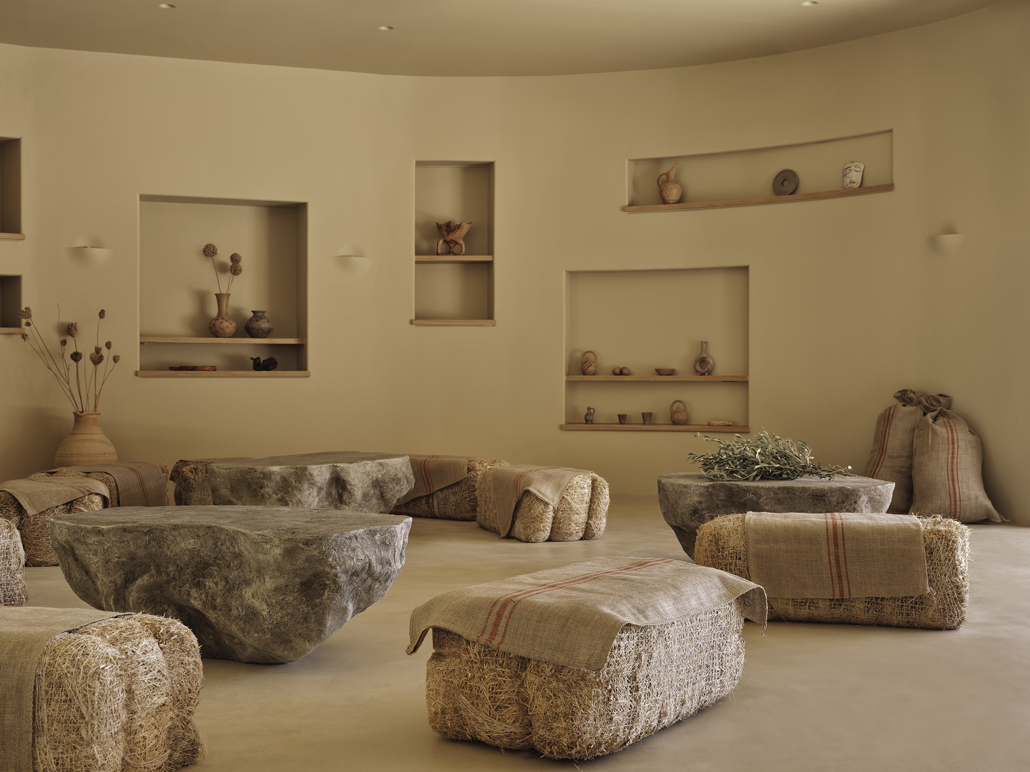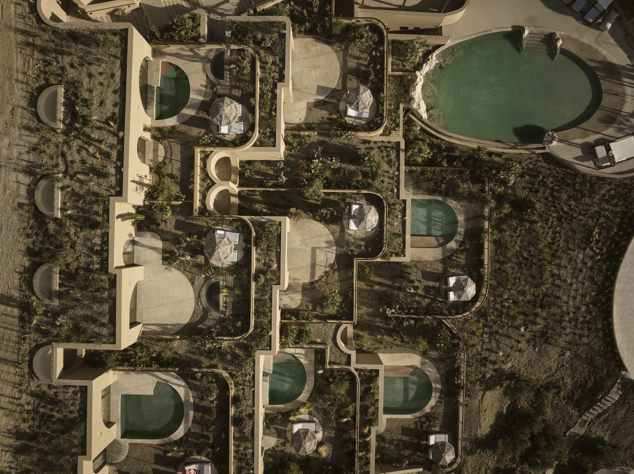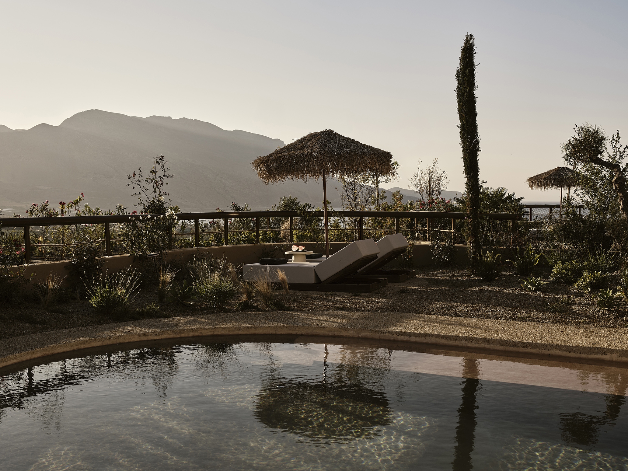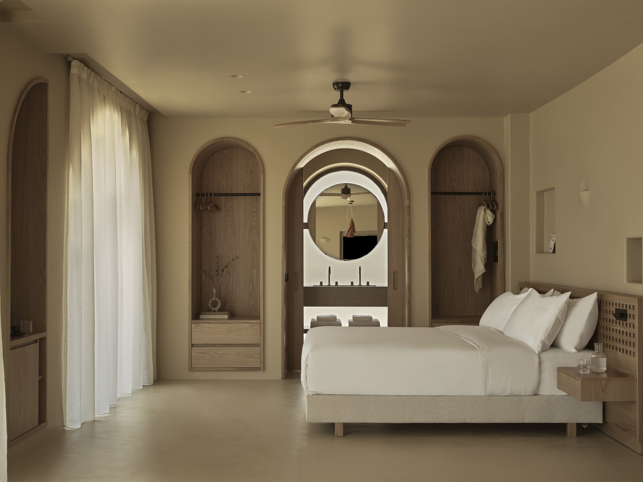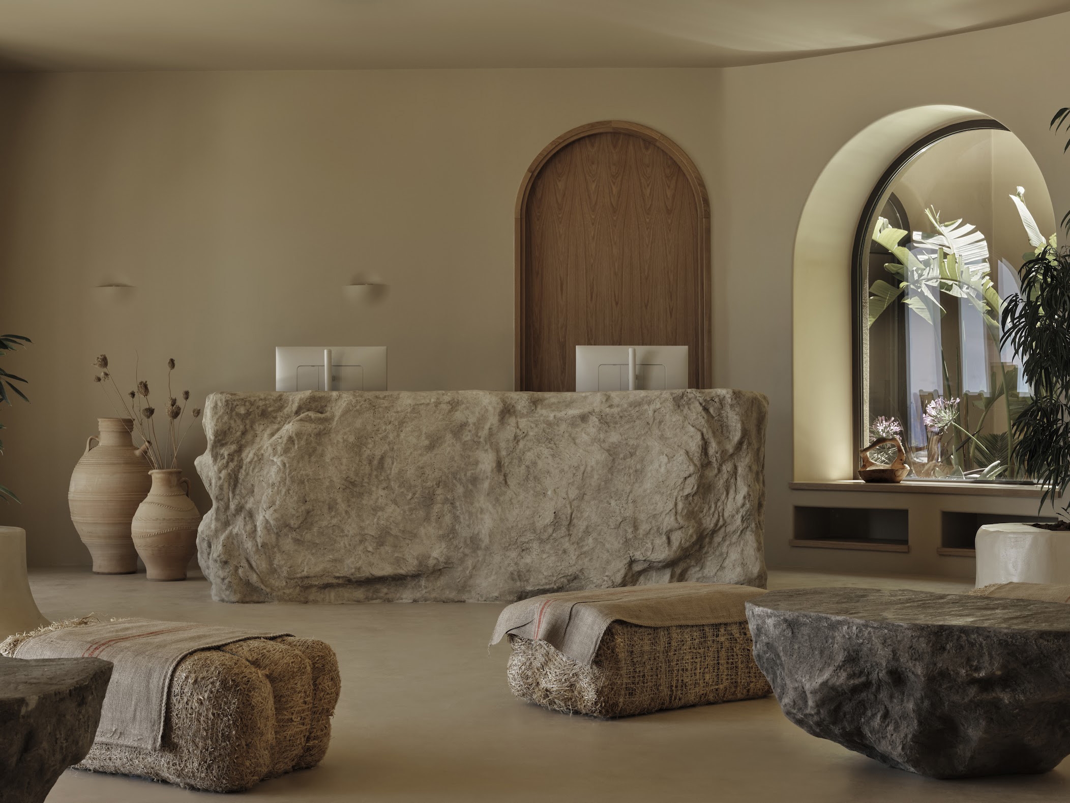 Tella Thera expresses Mediterranean hospitality through architecture rooted in tradition and sustainability. Conceived as a sanctuary outside Chania, the project blends cultural memory with contemporary design to create spaces that support environmental, sensory, and emotional renewal. Set on an olive-lined hillside overlooking the Aegean, the hotel unfolds as a calm sequence of encounters between land, light and texture. Full and half arches, abstracted from Venetian and Ottoman forms, translate Chania’s heritage into a modern language of light and texture. Interiors of continuous hand-applied microcement in earthy tones evoke cave-like stillness, shaped by the play of shadow and material. Outdoor rooms defined by water, plants, lime mortar, and local gravel form gentle microclimates that dissolve boundaries between architecture and landscape. Passive cooling, natural ventilation, and restored native flora reduce mechanical demand, creating a living ecological infrastructure. Slow, intimate, and regenerative, Tella Thera grows from the land, offering hospitality defined by authenticity, simplicity and biophilic minimalism.