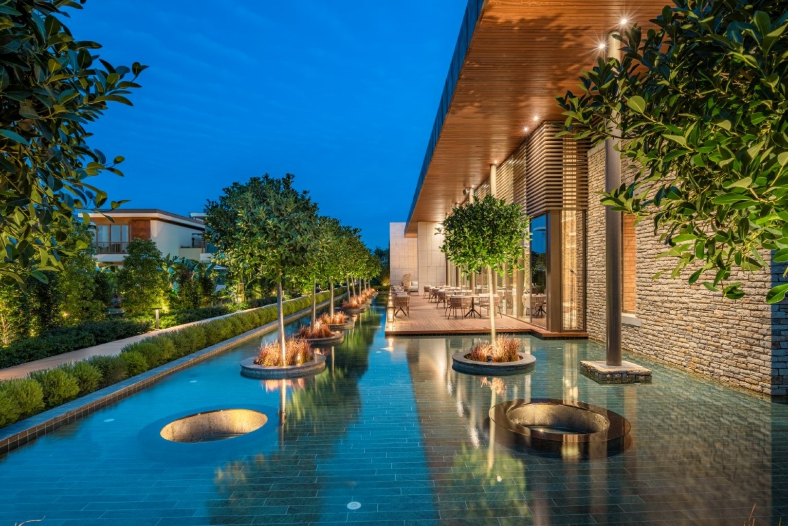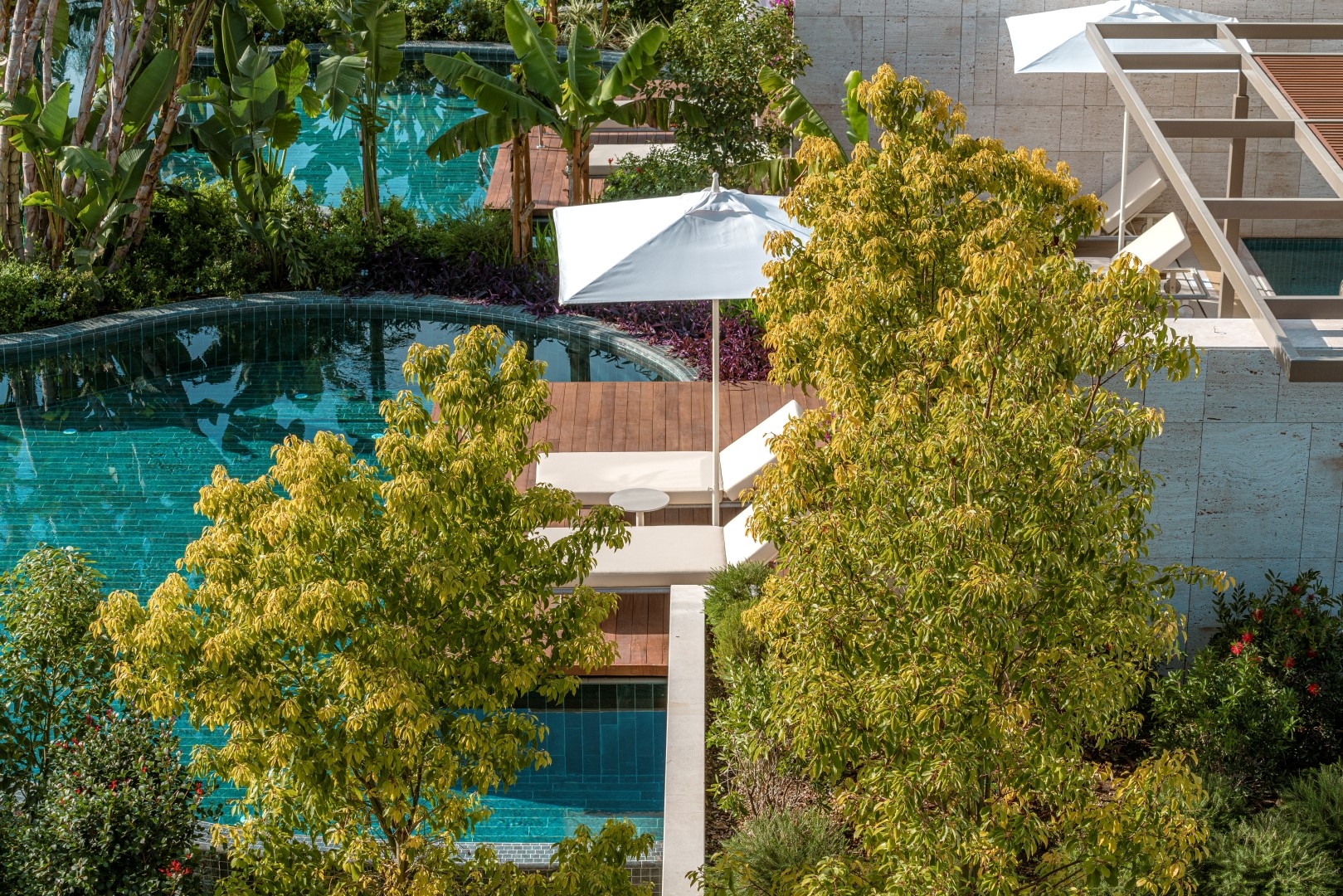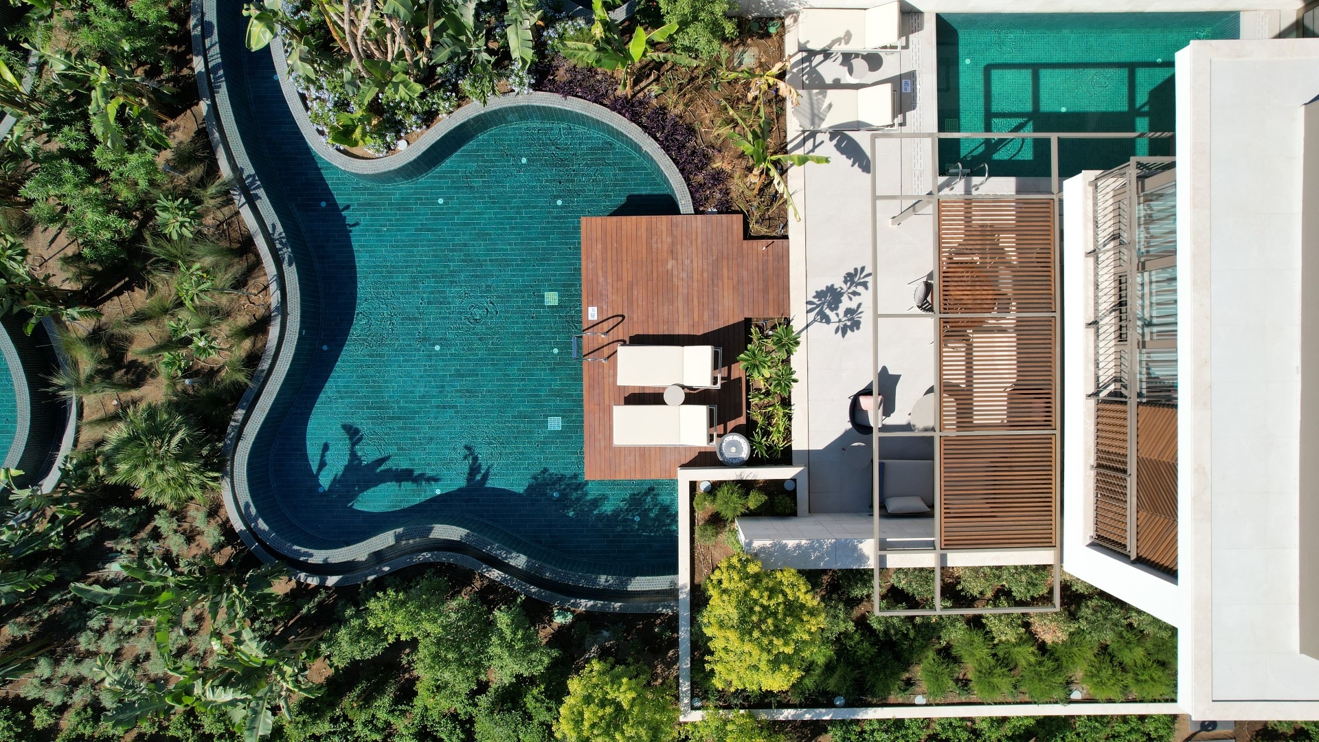 The landscape design is the heart of the project, transforming it into a Mediterranean oasis. Tall, lush trees provide visual and auditory isolation, creating a strong sense of privacy. The vibrant landscape utilizes over 200 plant species. Each villa is surrounded by interconnected exotic gardens and water gardens, where layers of water and greenery establish a distinctive character. The use of both saltwater and freshwater offers varied swimming environments and contributes to an integrated natural ecosystem.