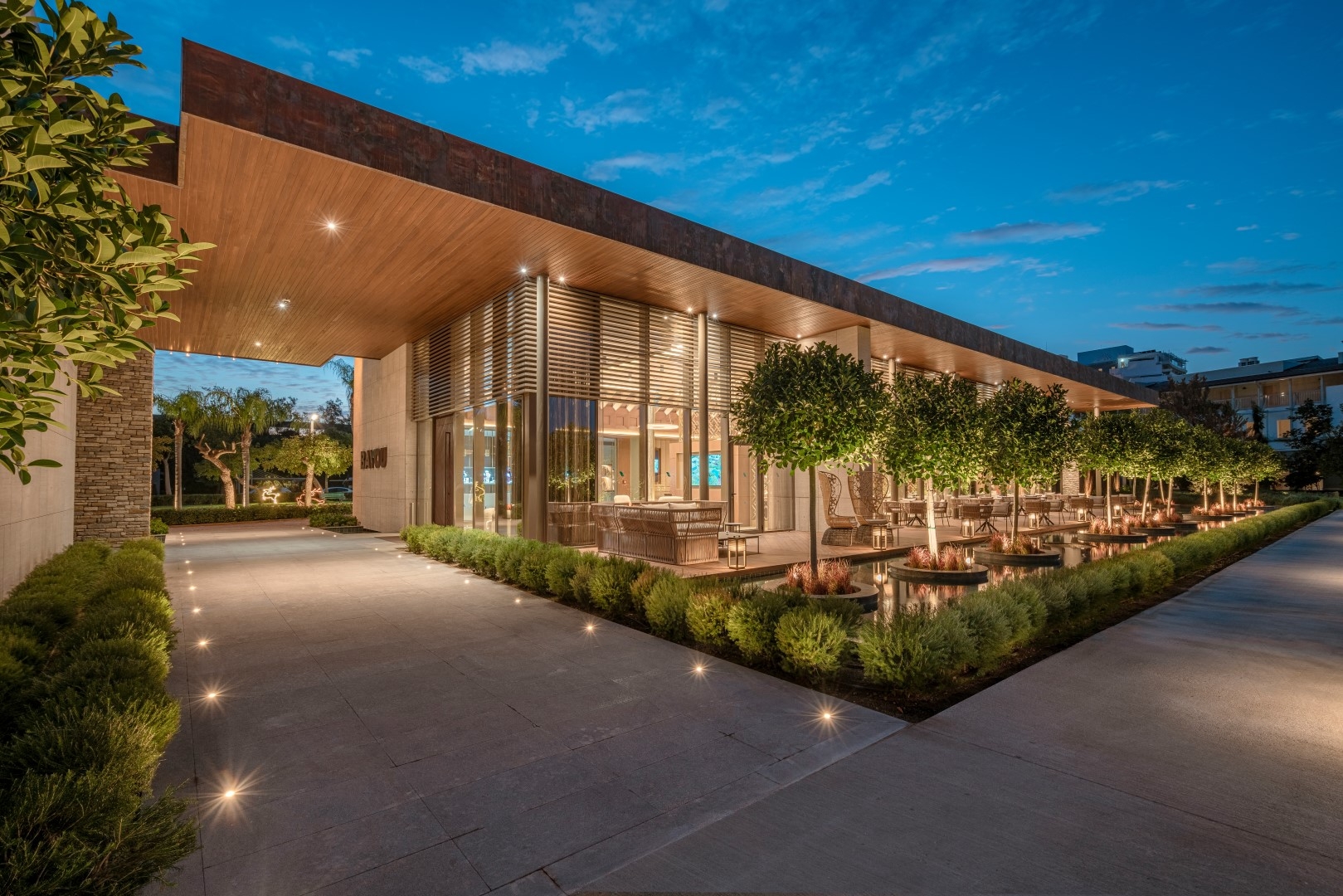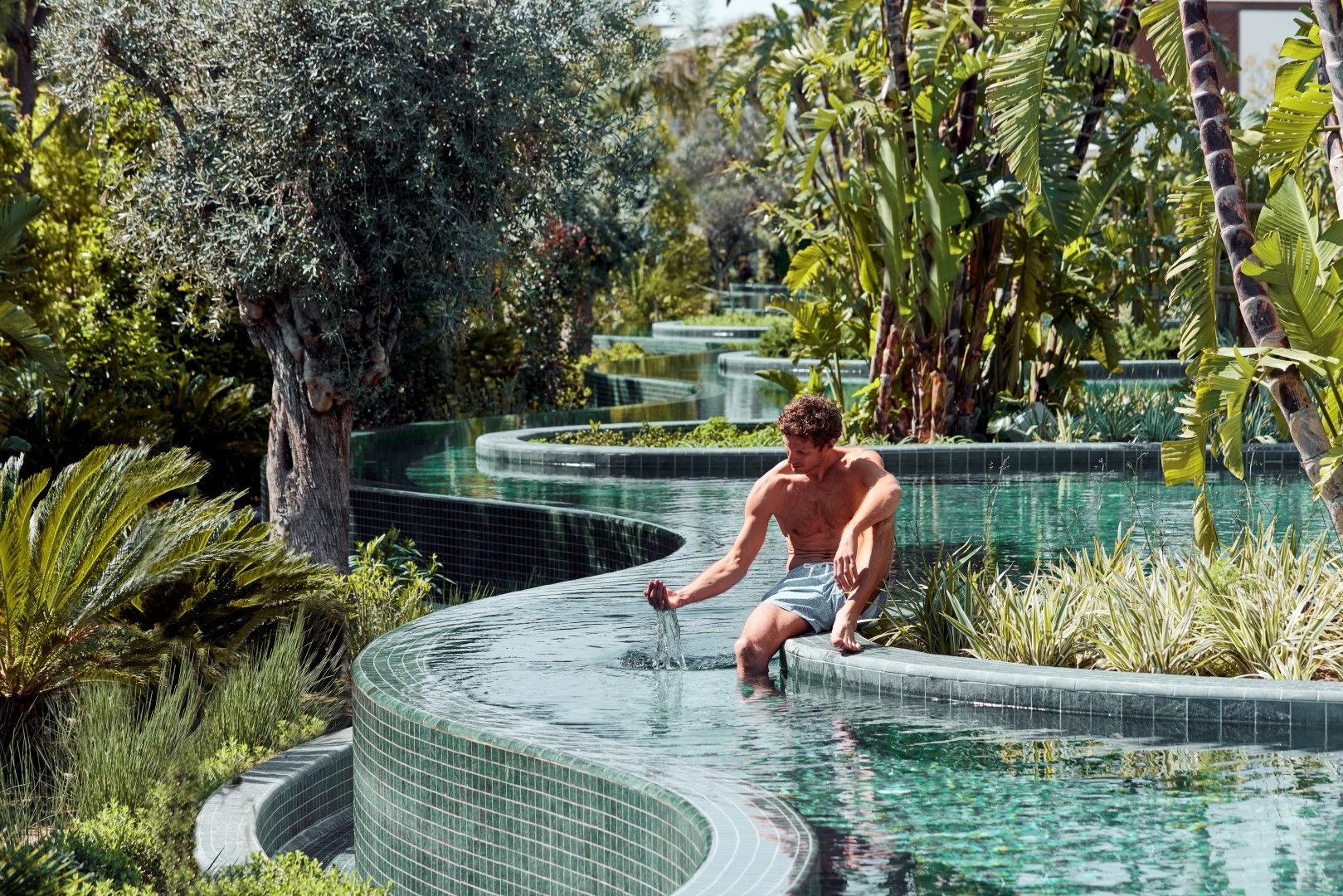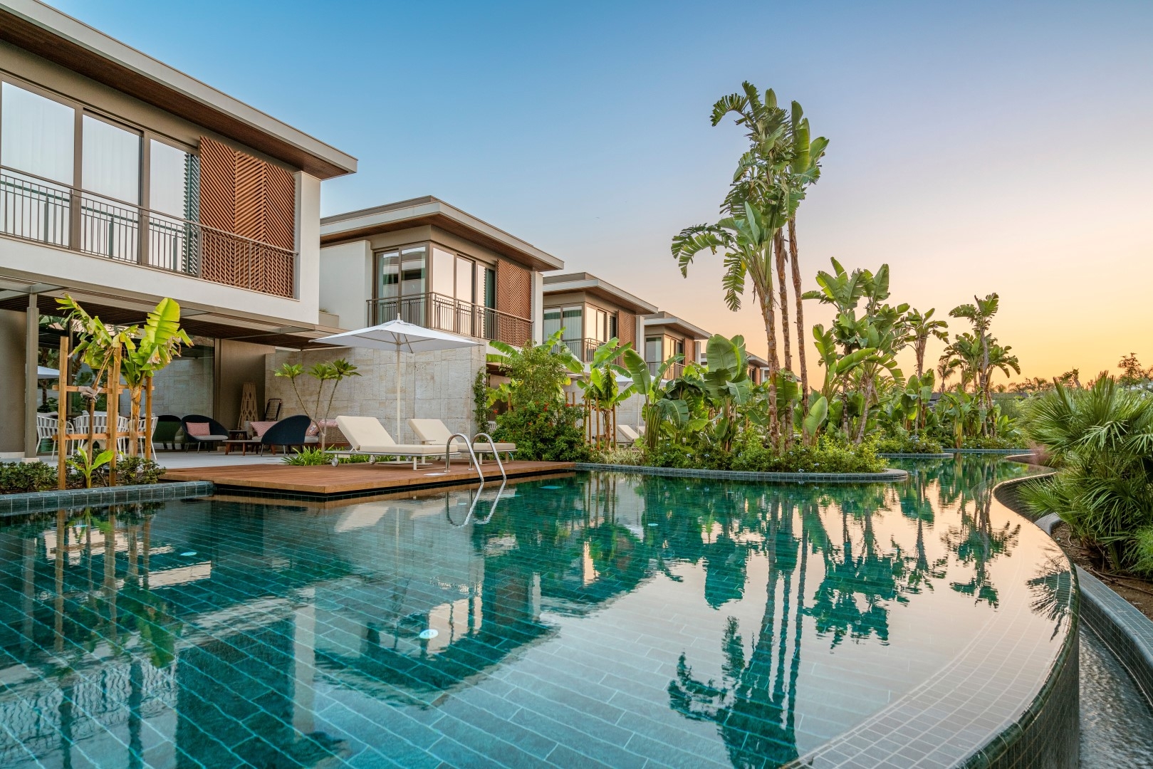 The landscape design is the heart of the project, transforming it into a Mediterranean oasis. Tall, lush trees provide visual and auditory isolation, creating a strong sense of privacy. The vibrant landscape utilizes over 200 plant species. Each villa is surrounded by interconnected exotic gardens and water gardens, where layers of water and greenery establish a distinctive character. The use of both saltwater and freshwater offers varied swimming environments and contributes to an integrated natural ecosystem.