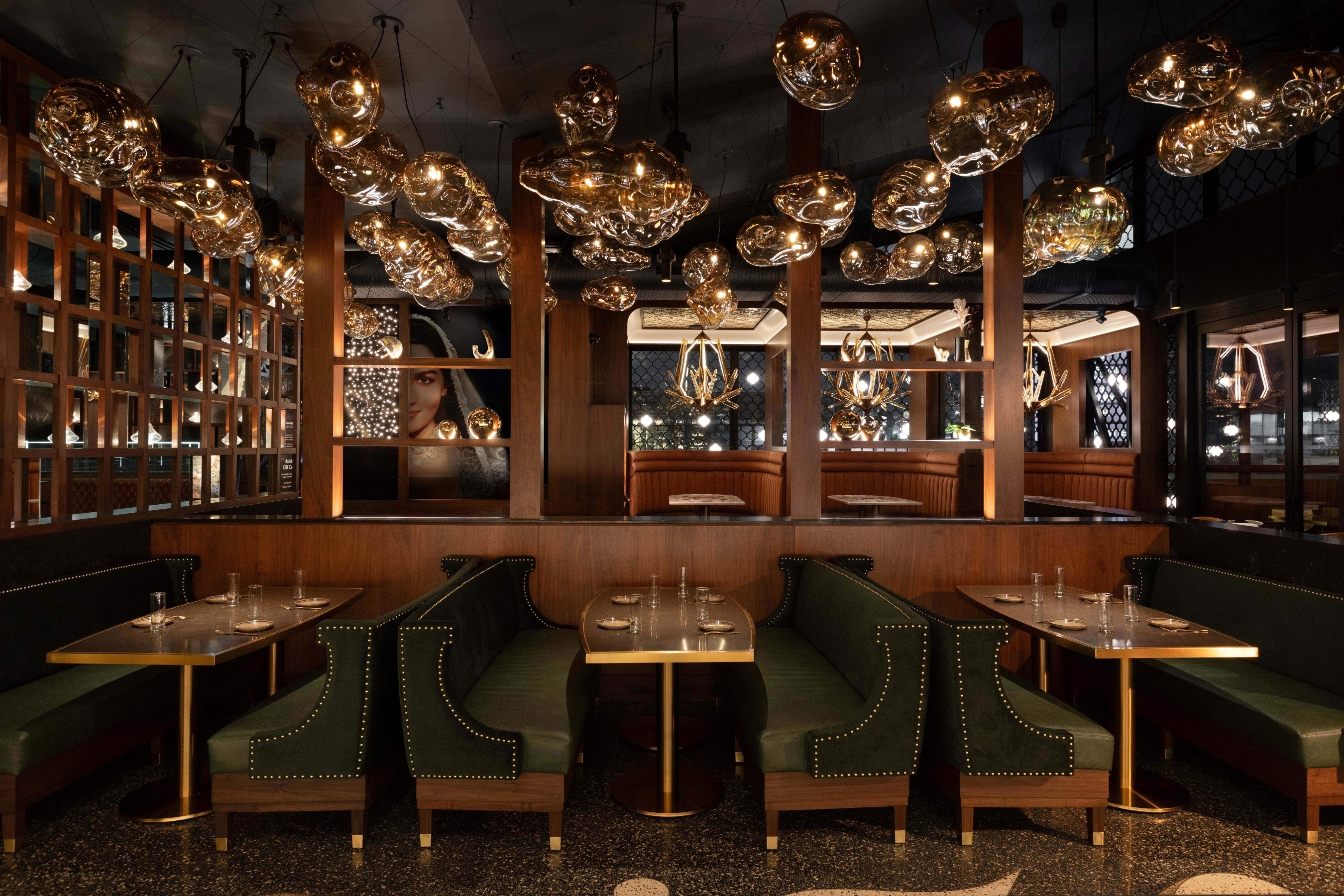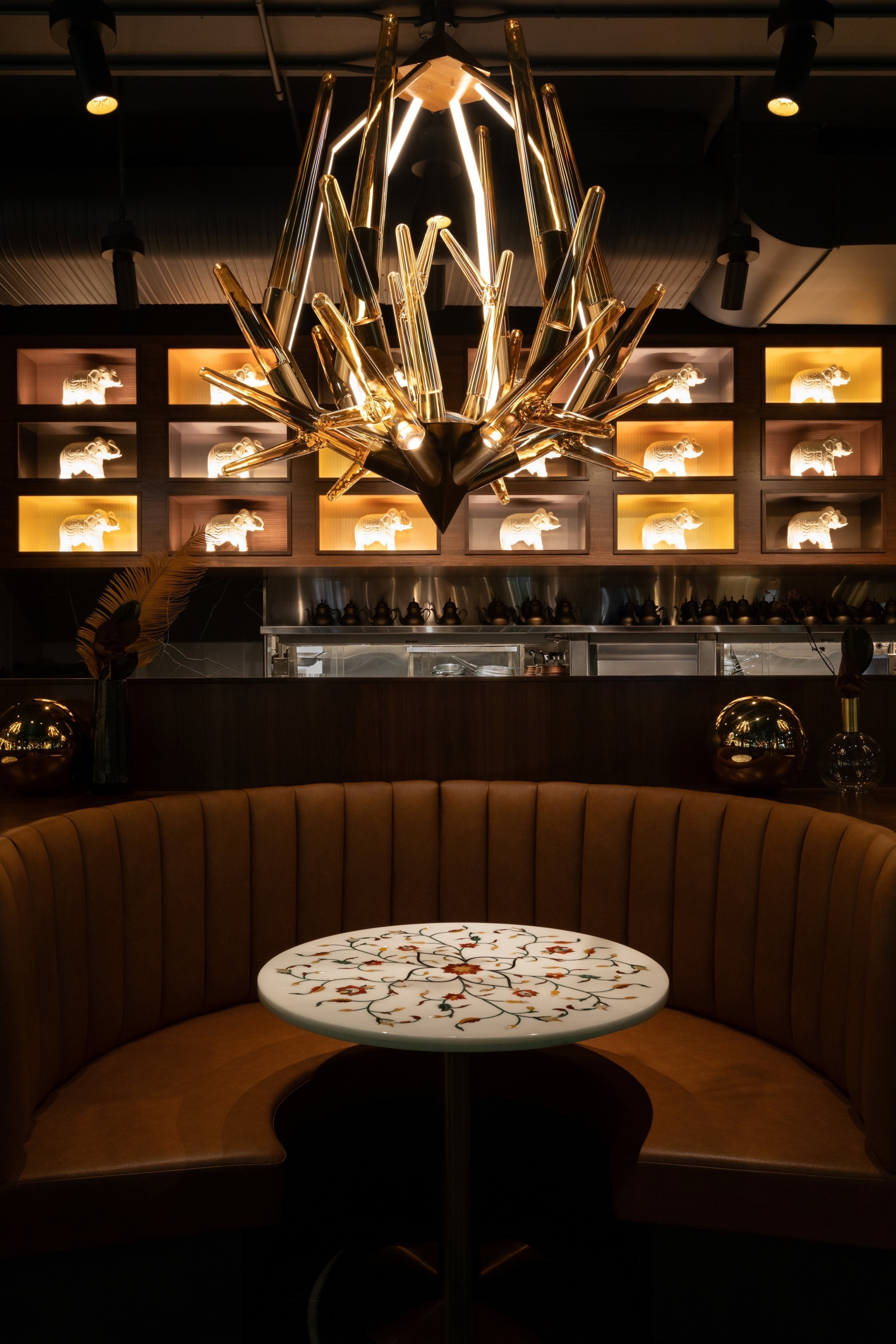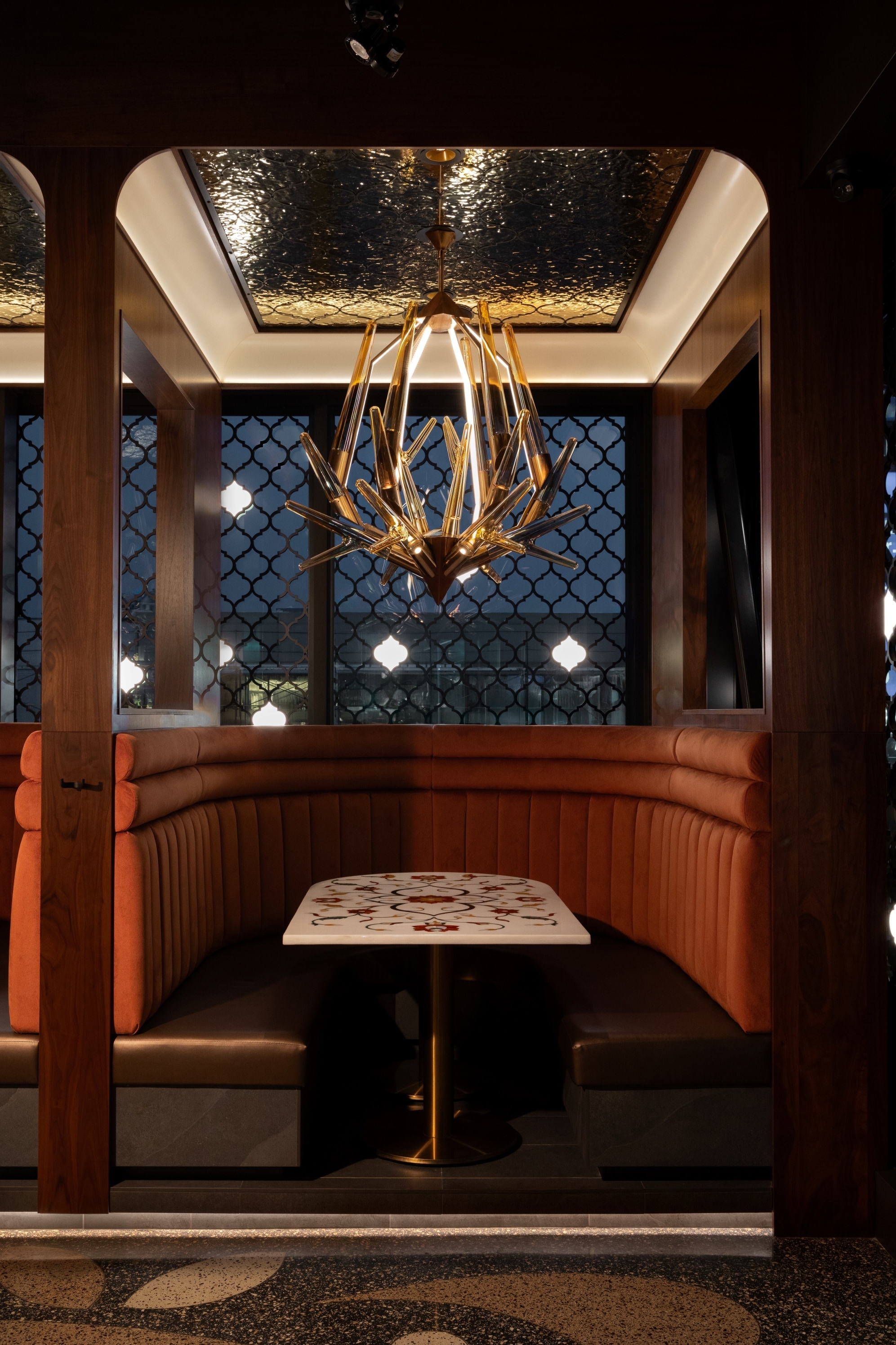The renovation/expansion of this project, originally purpose built office space, has brought new development in this community. As the third location of this family-run business, the site was deliberately selected near the oldest surviving Gurdwara in North America and is a cultural/spiritual landmark in the community. The task was to reconfigure and expand the space to meet functional requirements ensuring the design honored the brand’s cultural heritage in a contemporary, casual dining experience. Achieving a balance of honoring cultural heritage and modernity, while navigating practical challenges ensuring a high level of operational performance, made the project a complex undertaking. Custom paisley patterned terrazzo floors guides guests throughout the space, creating a fluid journey. Culturally, we were intentional with every detail. We collaborated with artisans in Jaipur to create semi-precious stone tables and handblown lighting. We were strategic with authentic and balanced materiality and pattern throughout the space. Every element, from bespoke millwork to all seating, was designed in-house to provide comfort, cultural pride and refinement.