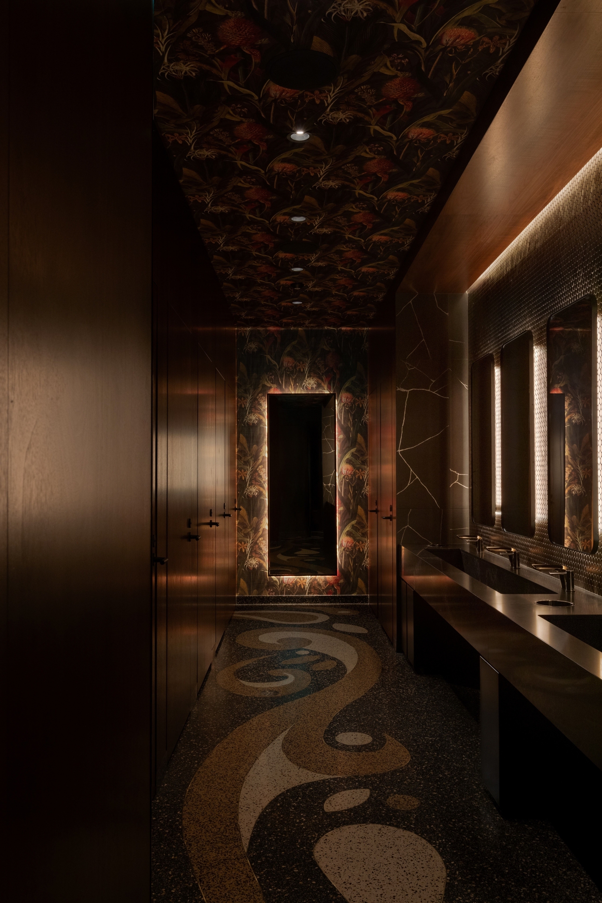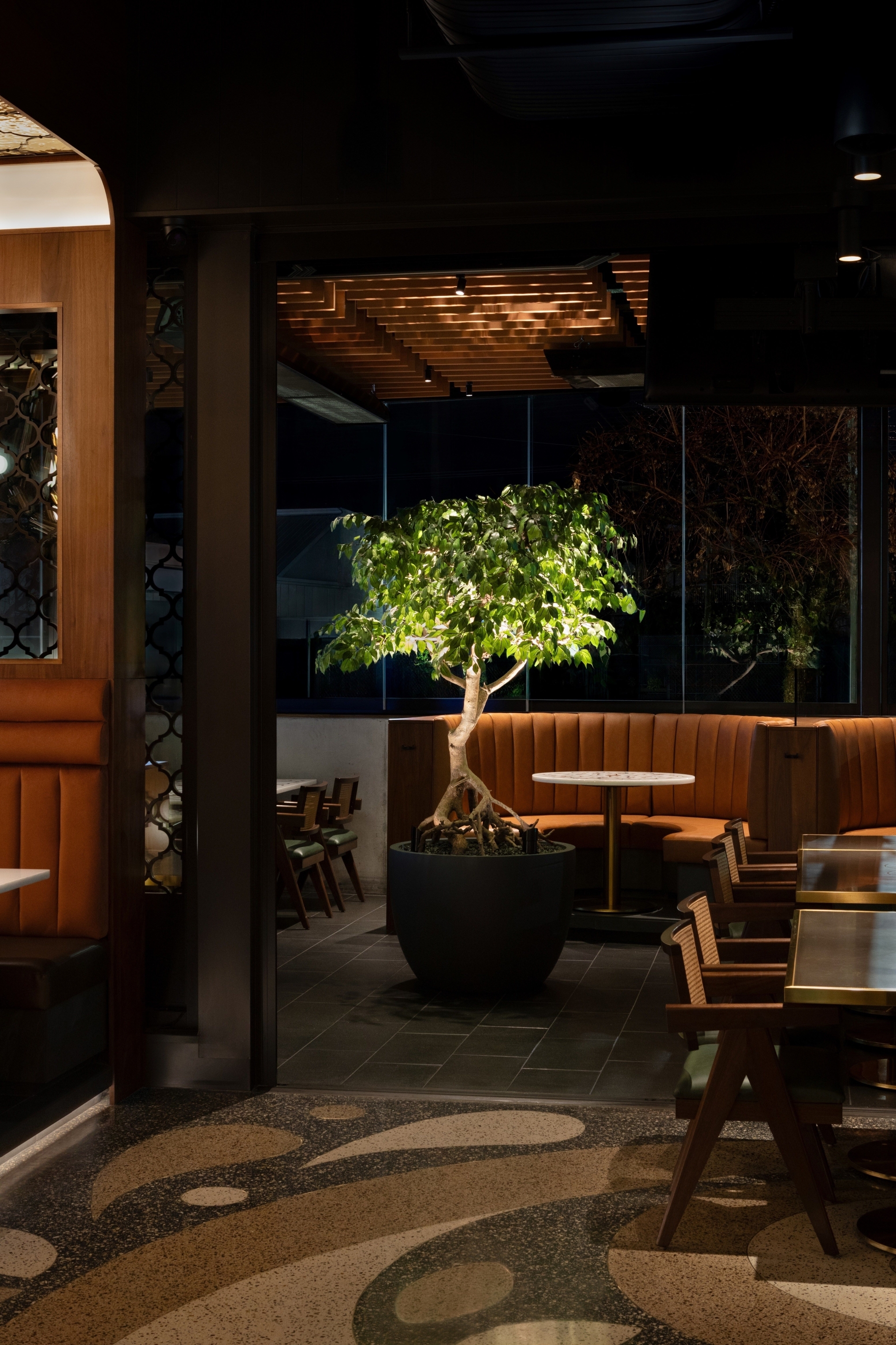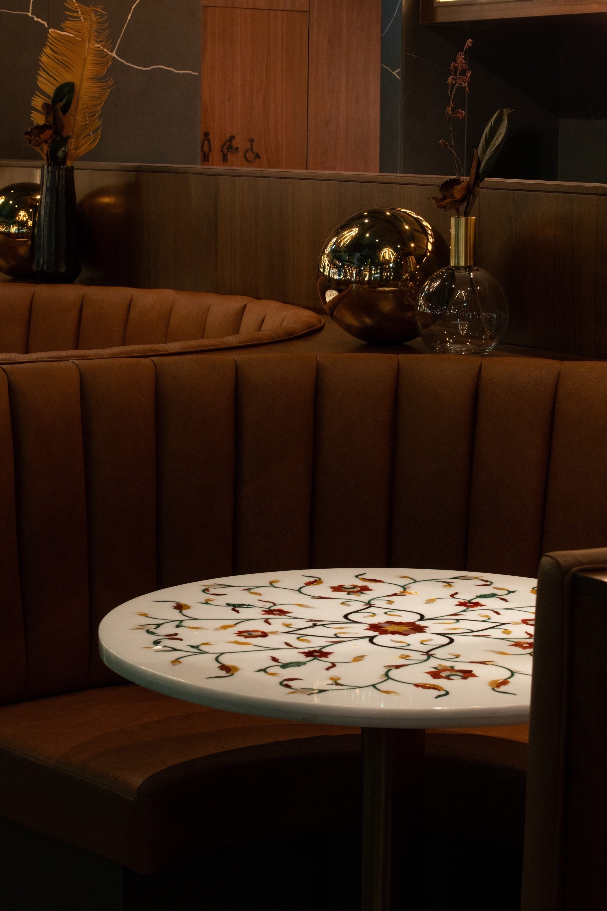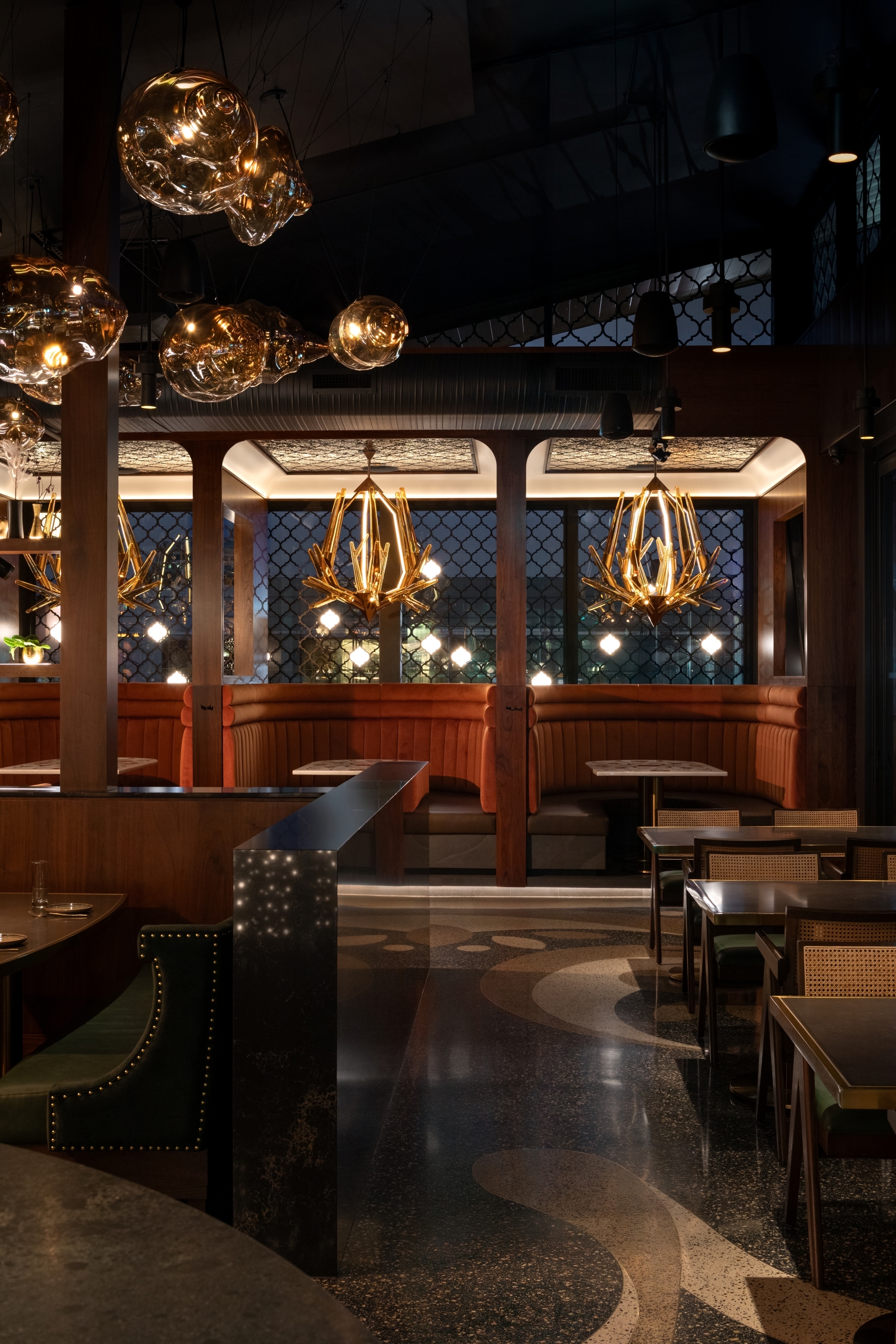 The renovation/expansion of this project, originally purpose built office space, has brought new development in this community. As the third location of this family-run business, the site was deliberately selected near the oldest surviving Gurdwara in North America and is a cultural/spiritual landmark in the community. The task was to reconfigure and expand the space to meet functional requirements ensuring the design honored the brand’s cultural heritage in a contemporary, casual dining experience. Achieving a balance of honoring cultural heritage and modernity, while navigating practical challenges ensuring a high level of operational performance, made the project a complex undertaking. Custom paisley patterned terrazzo floors guides guests throughout the space, creating a fluid journey. Culturally, we were intentional with every detail. We collaborated with artisans in Jaipur to create semi-precious stone tables and handblown lighting. We were strategic with authentic and balanced materiality and pattern throughout the space. Every element, from bespoke millwork to all seating, was designed in-house to provide comfort, cultural pride and refinement.