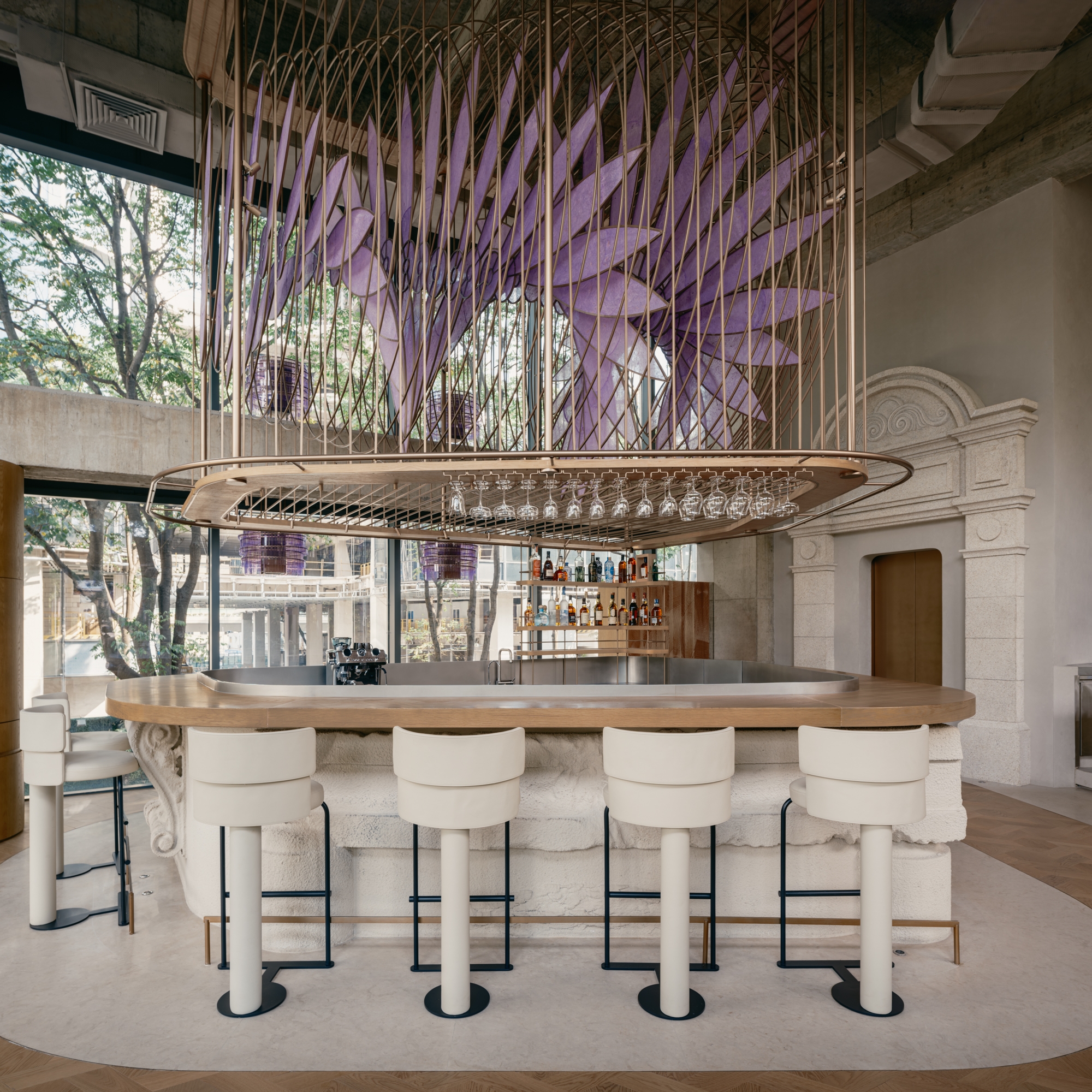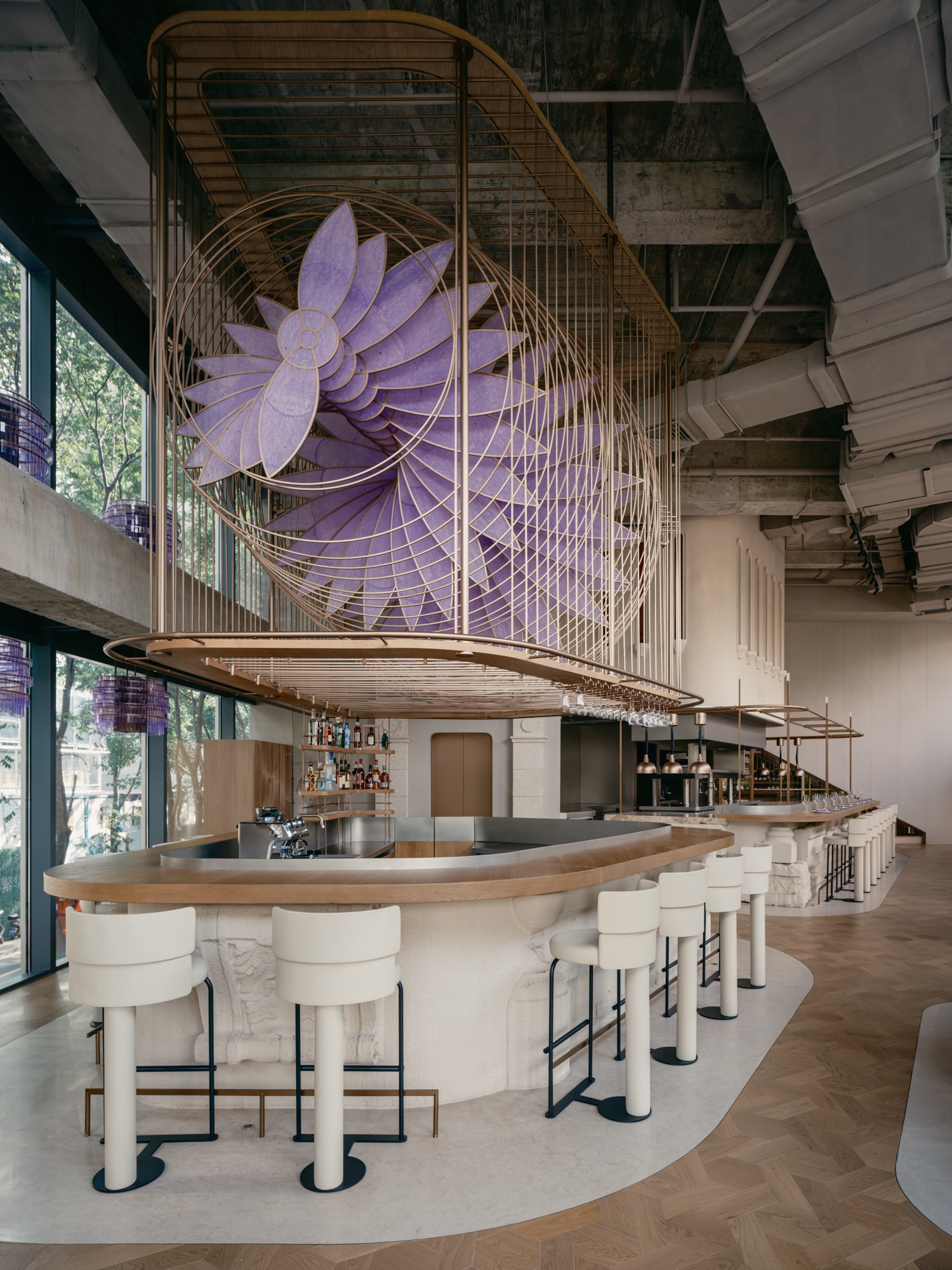 Above, the ceiling echoes the flower’s radiating form. Thirty-nine modular frames spiral gently, each holding a single translucent violet petal made from recycled xuan paper. By night, light grazes their edges, revealing delicate fibers and transforming the ceiling into a drifting violet nebula. The system is sustainable: petals can be re-dyed, and frames reused, extending the flower-inspired rhythm from bar to sky.