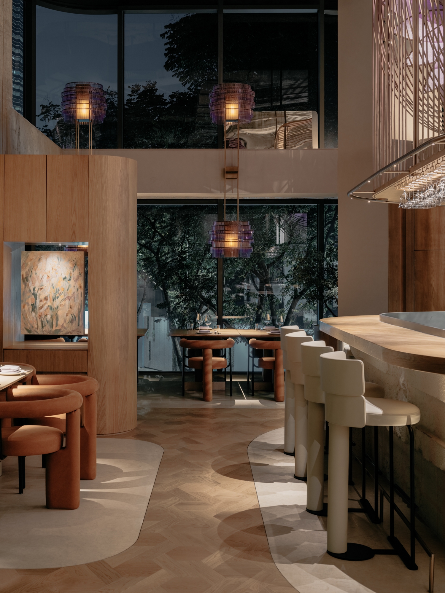 The dining room revolves around an open kitchen, a chef’s counter, and a central cocktail bar, where front and back-of-house operate as one stage. Diners are invited into the culinary process, witnessing preparation, plating, and service unfold with Michelin-style precision.
