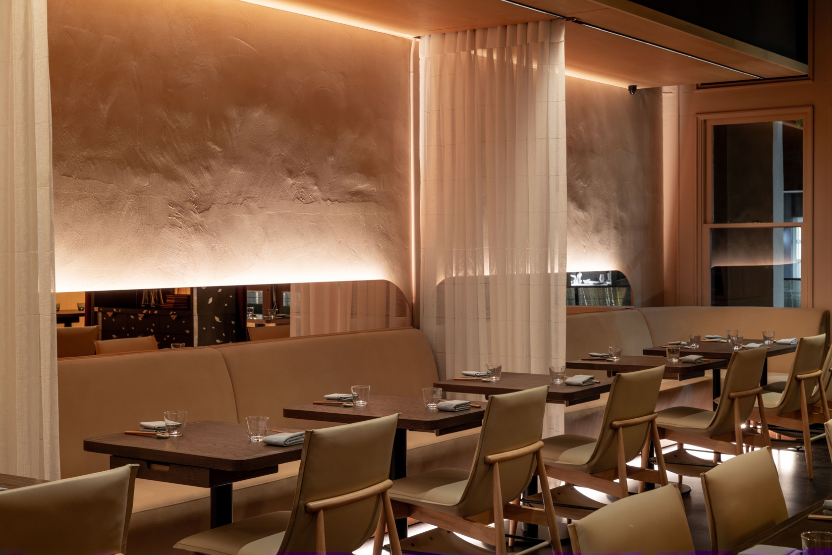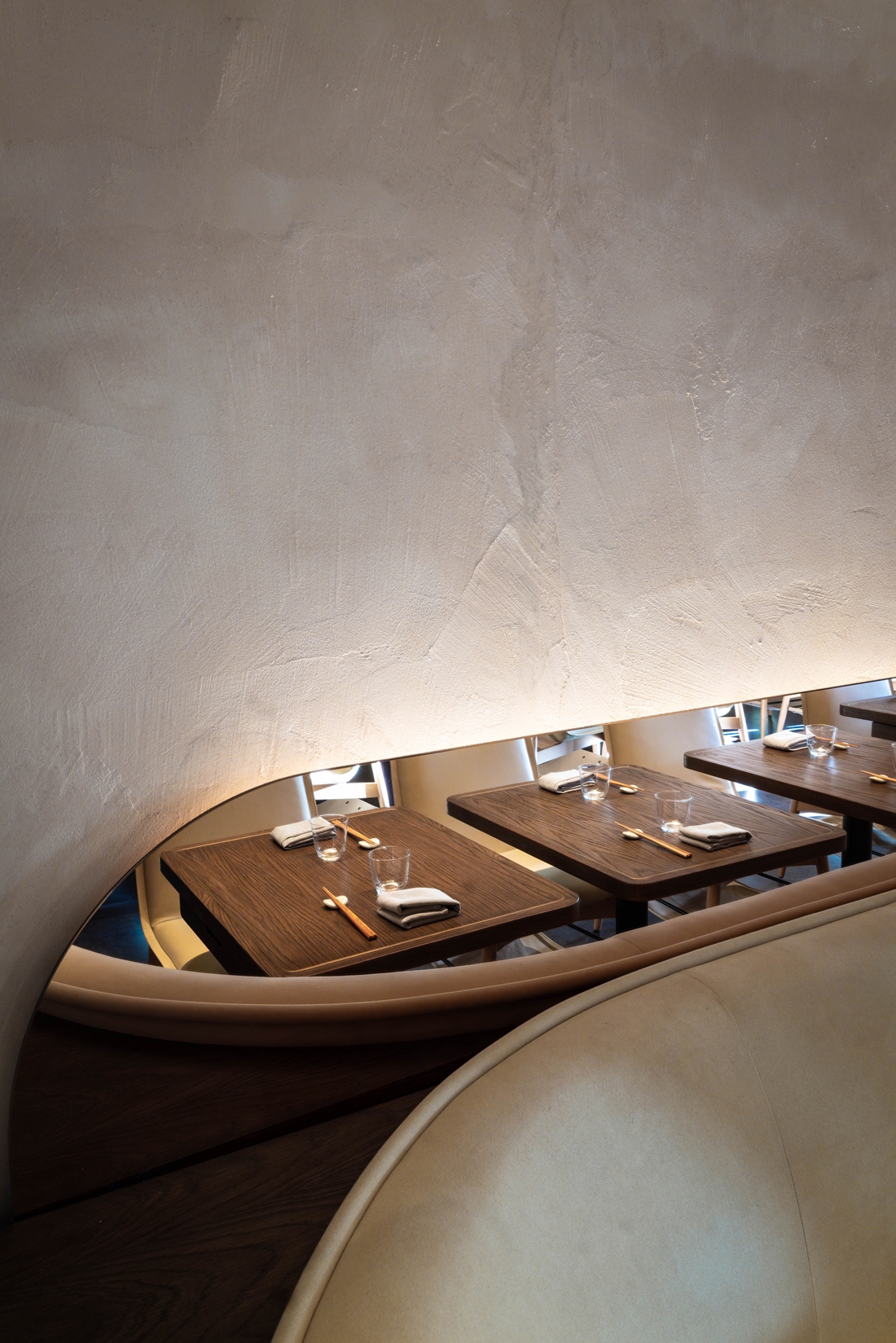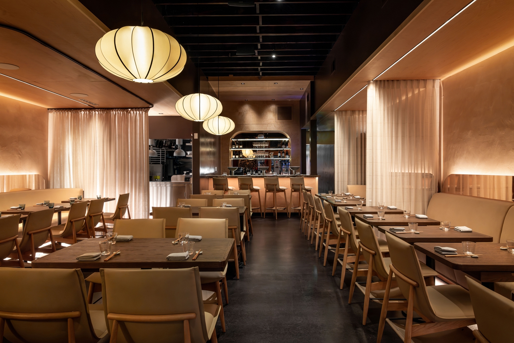Tonal softness is matched with precision. References to Asia are present yet subtle. Tables are outfitted with custom made trays designed for flatware. Sommelier wares are kept in an armoire accented with mother of pearl. Special attention to acoustics holds the room to a murmur. The chefs kitchen is open and food is presented in view.