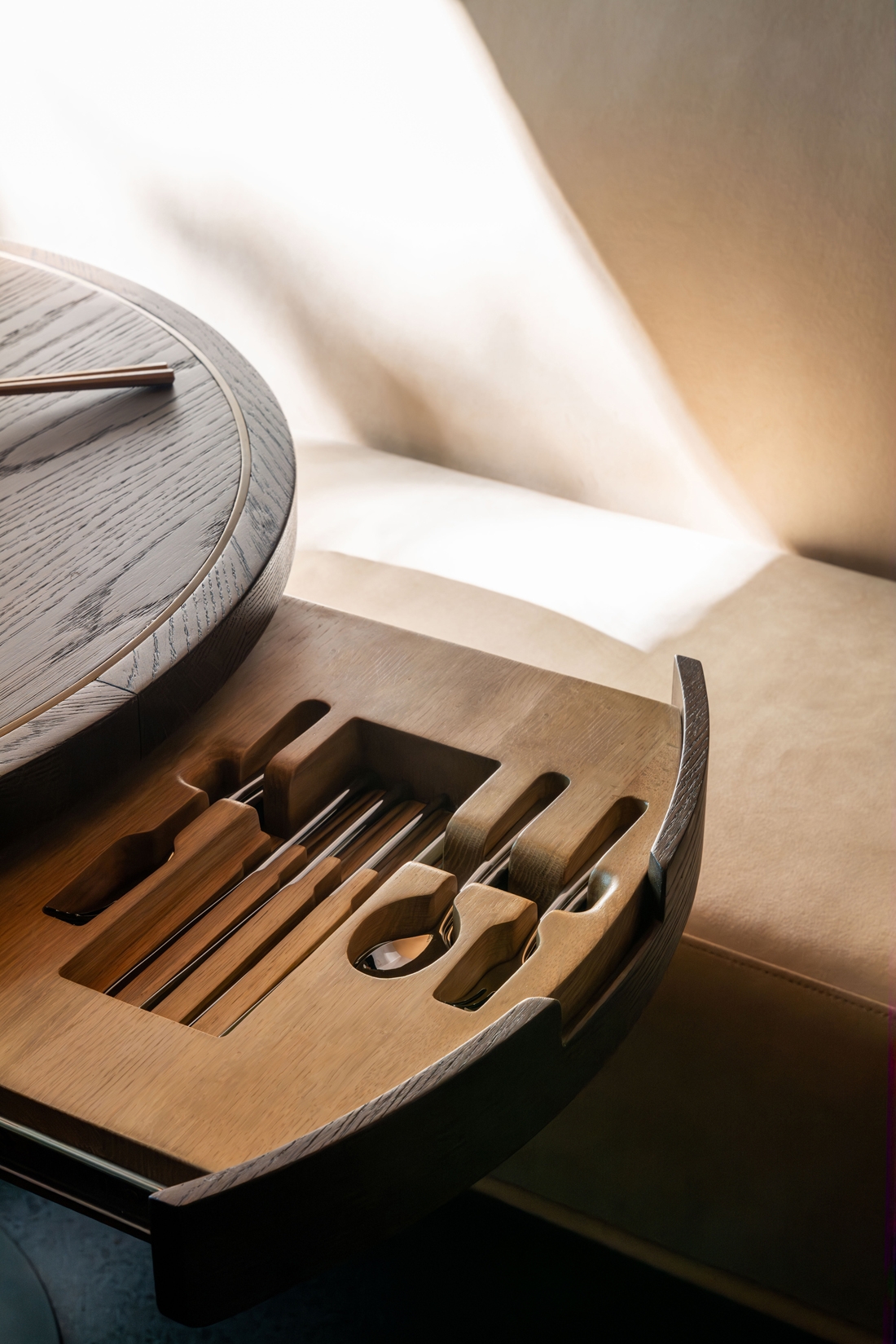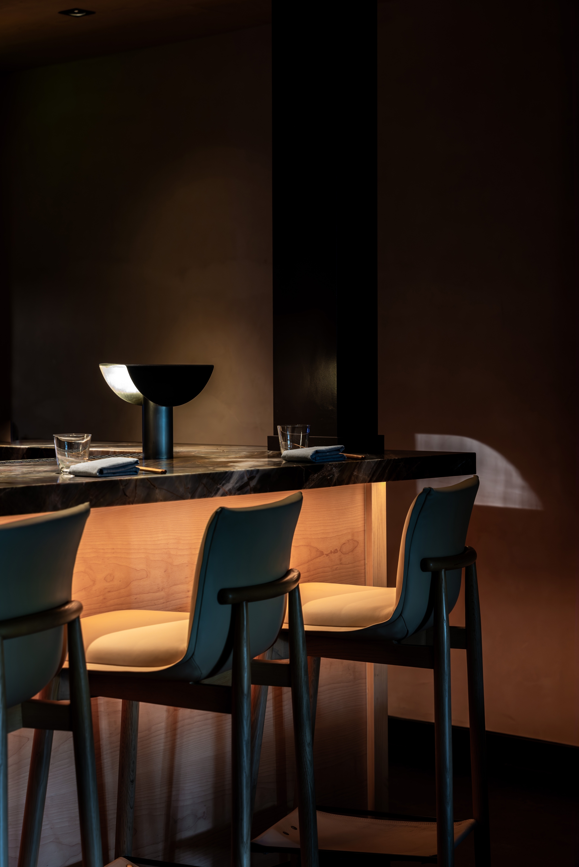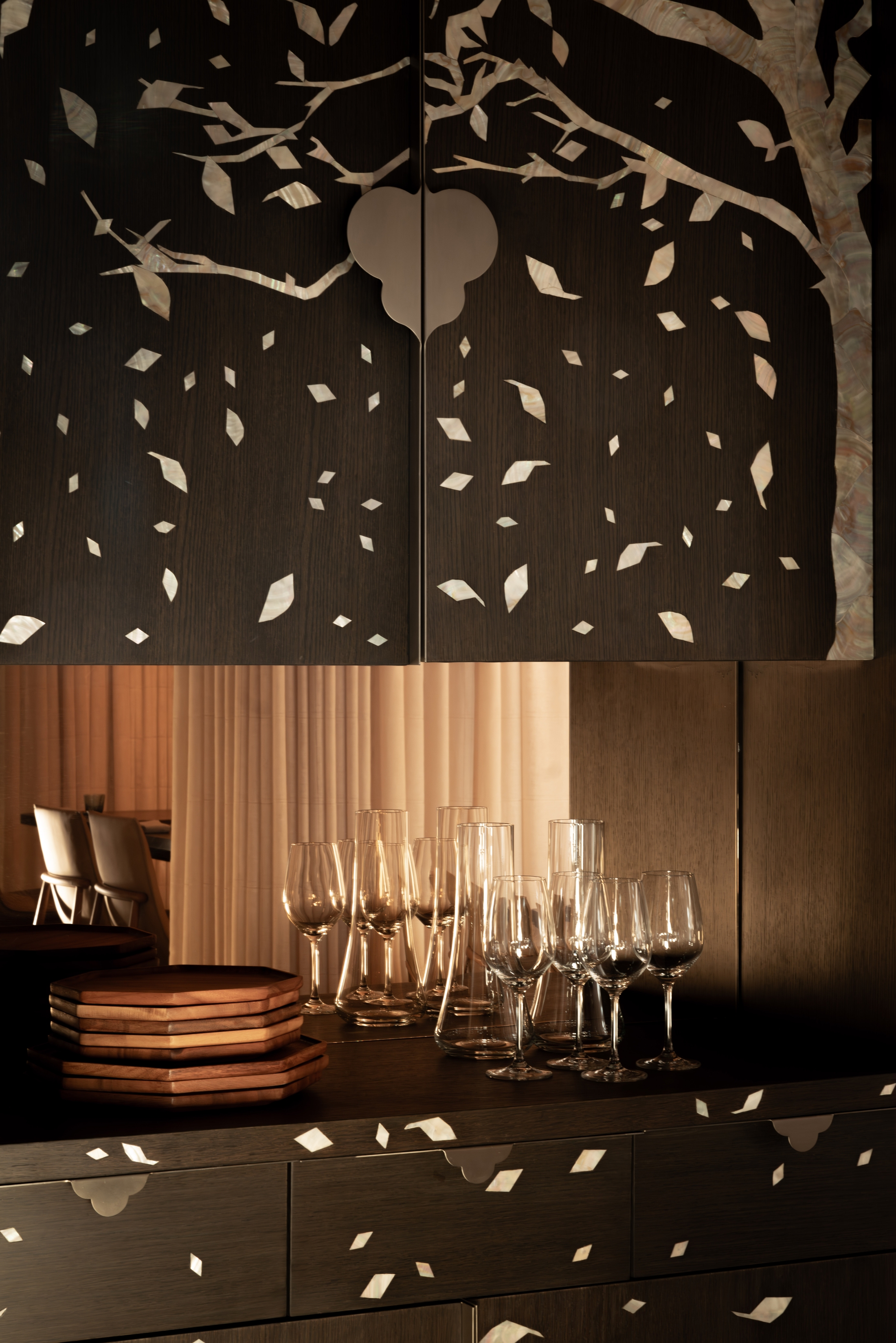 Tonal softness is matched with precision. References to Asia are present yet subtle. Tables are outfitted with custom made trays designed for flatware. Sommelier wares are kept in an armoire accented with mother of pearl. Special attention to acoustics holds the room to a murmur. The chefs kitchen is open and food is presented in view.