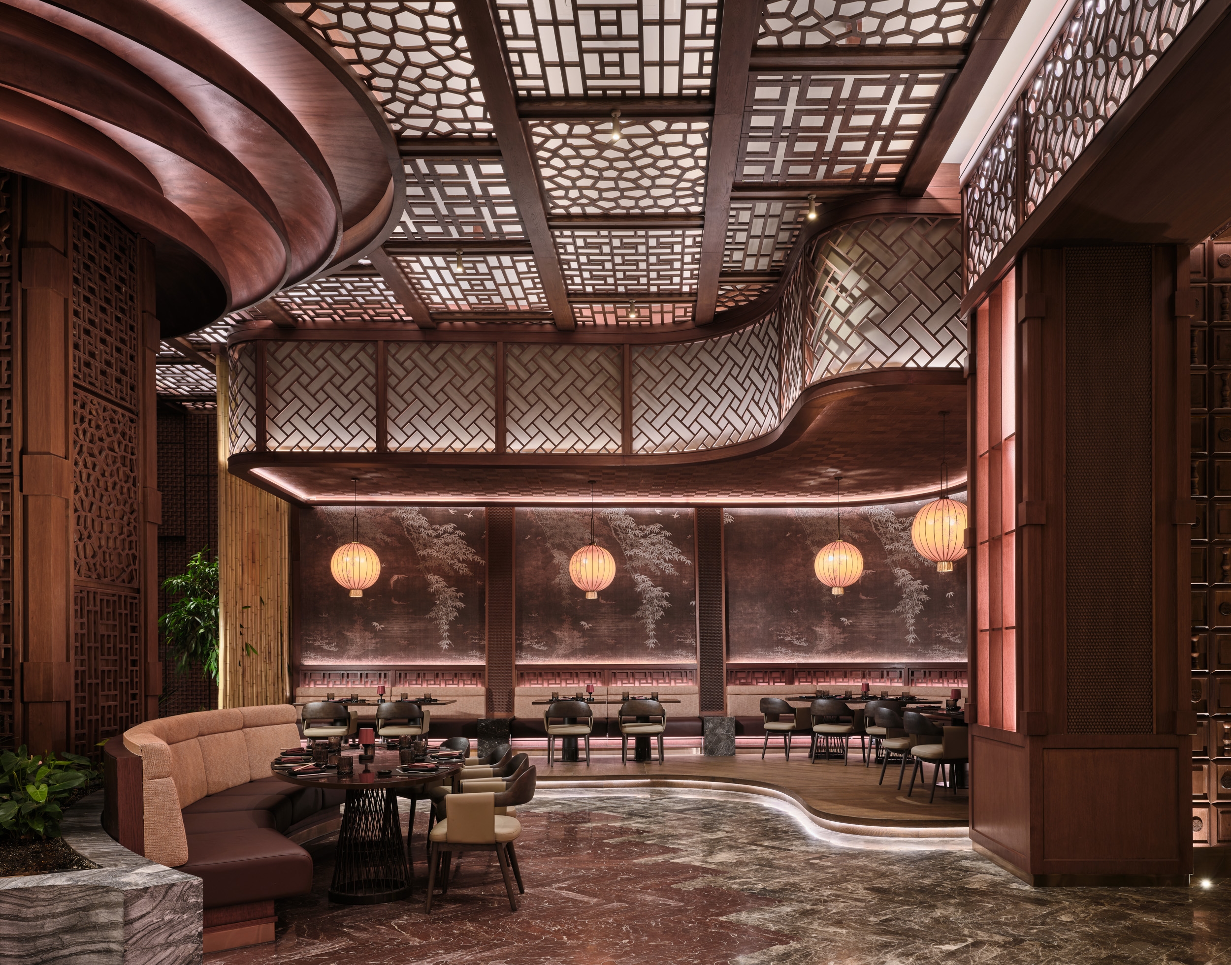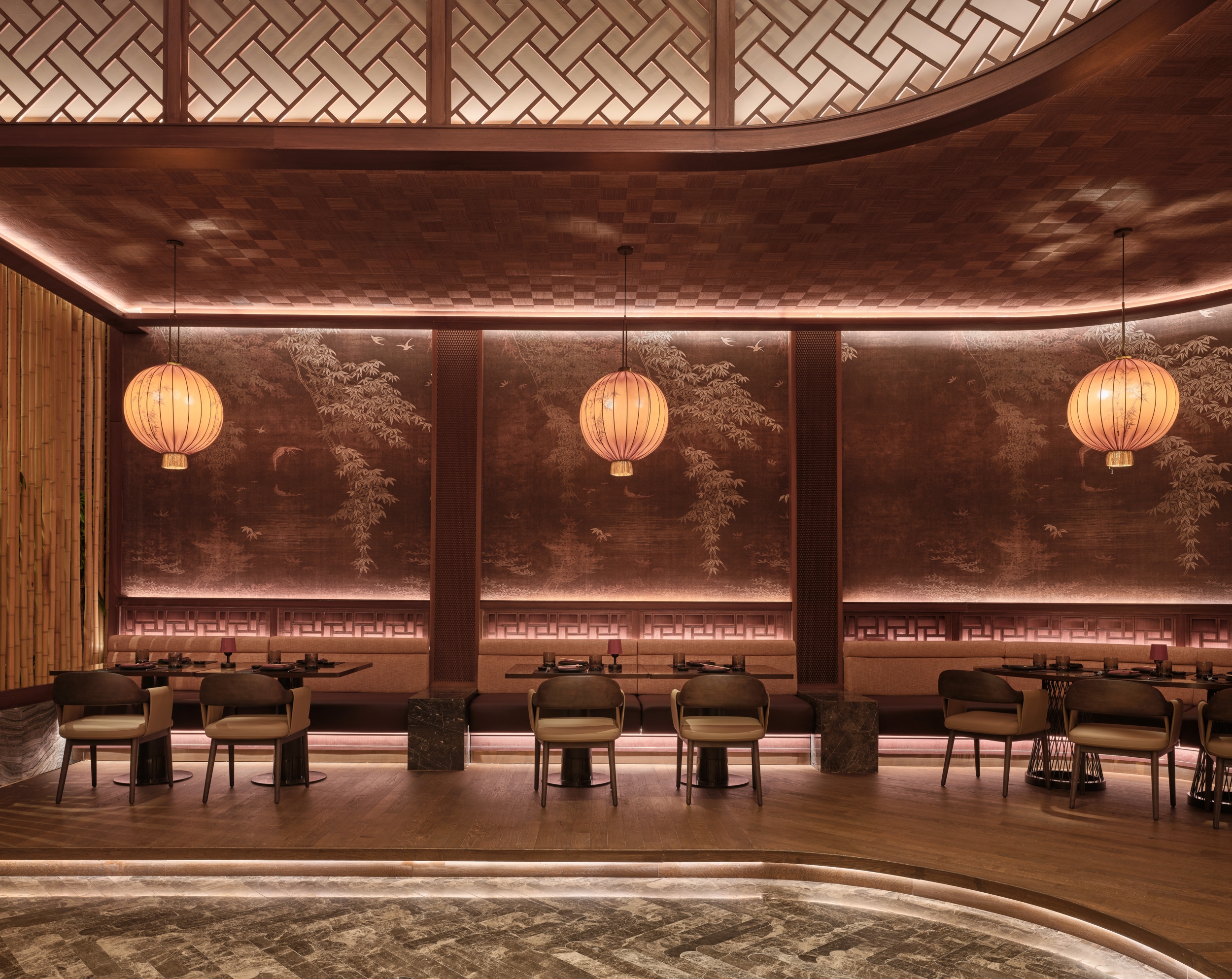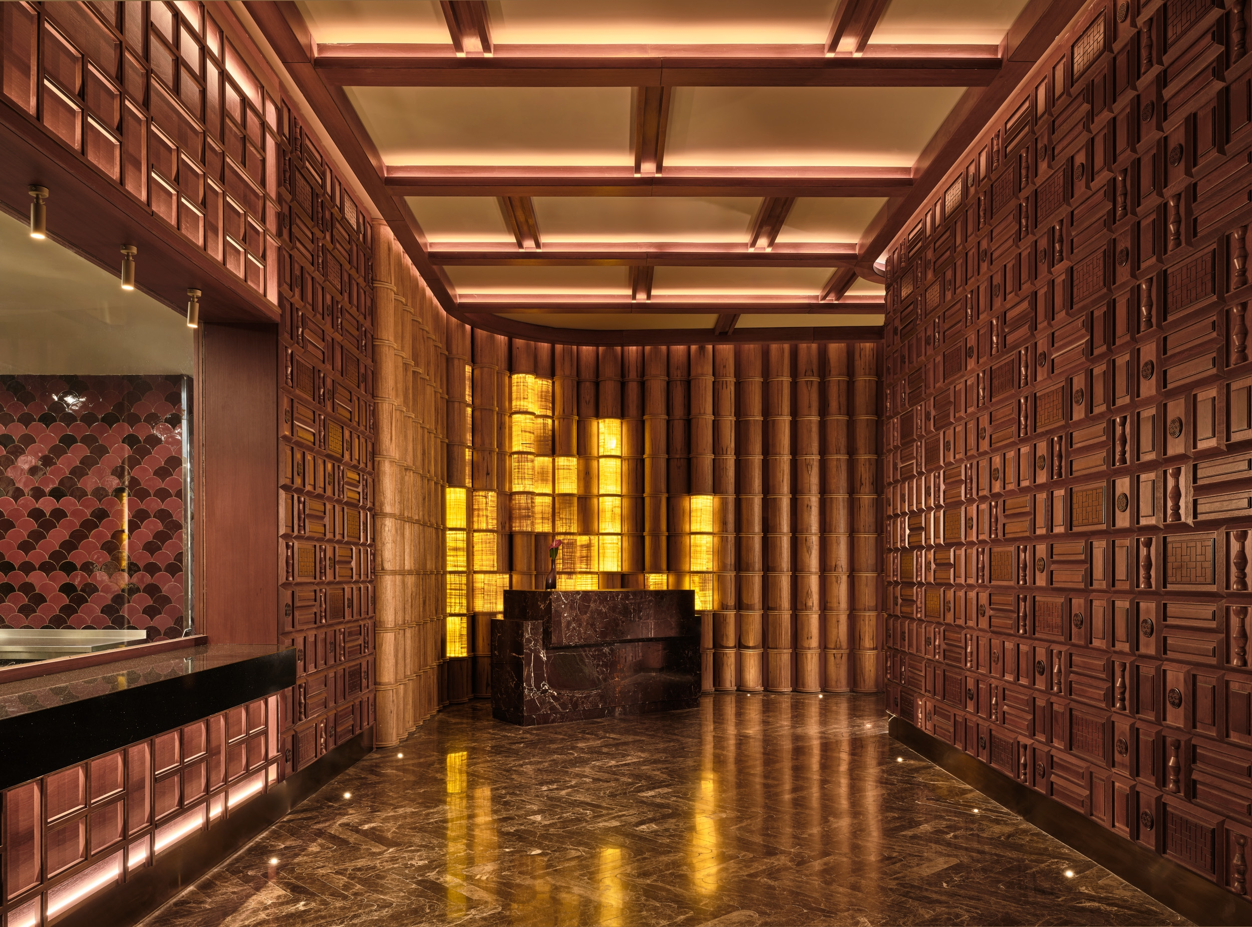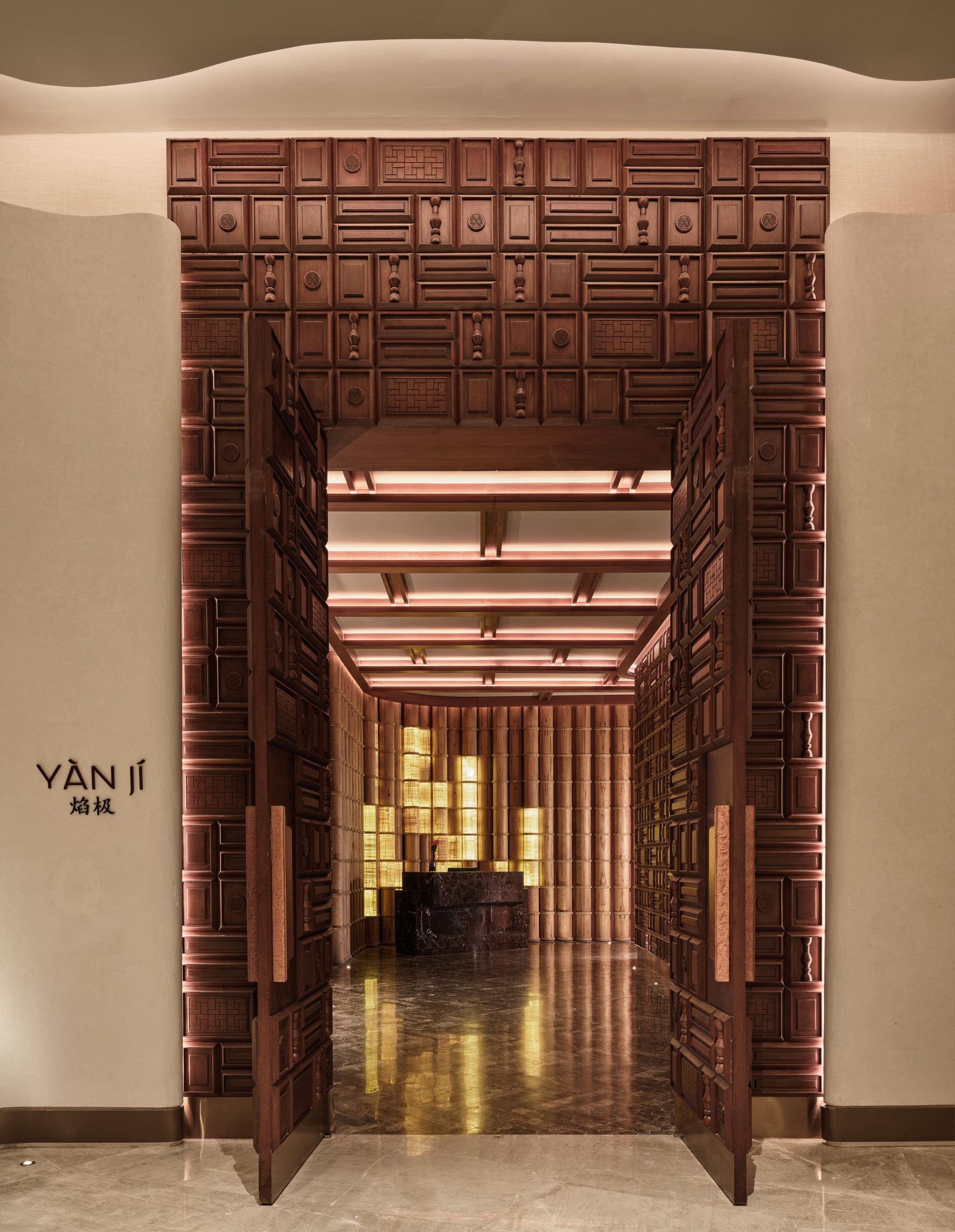Yanji Restaurant reinterprets the spatial hierarchy of a traditional Chinese courtyard within a contemporary hospitality context. The layout organizes seating under lowered ceilings and eaves, creating layers of intimacy and rhythm around the central dining space. Wallcoverings and finishes echo the tactile character of Asian craft, while custom furniture, painted glass panels, and three-dimensional timber claddings transform material into an expressive surface. Cultural symbols are abstracted and reintroduced through woodworking details, establishing continuity between heritage and modern design. Light and reflection play central roles, animating textured surfaces and enhancing the sense of depth. The atmosphere evolves through subtle shifts in color and tone, offering a calm yet sensory experience. Sustainable thinking underpins the design, with durable finishes and upcycled materials extending the life of each crafted surface. Yanji translates cultural memory into a refined architectural language—grounded in craftsmanship, proportion, and spatial clarity.