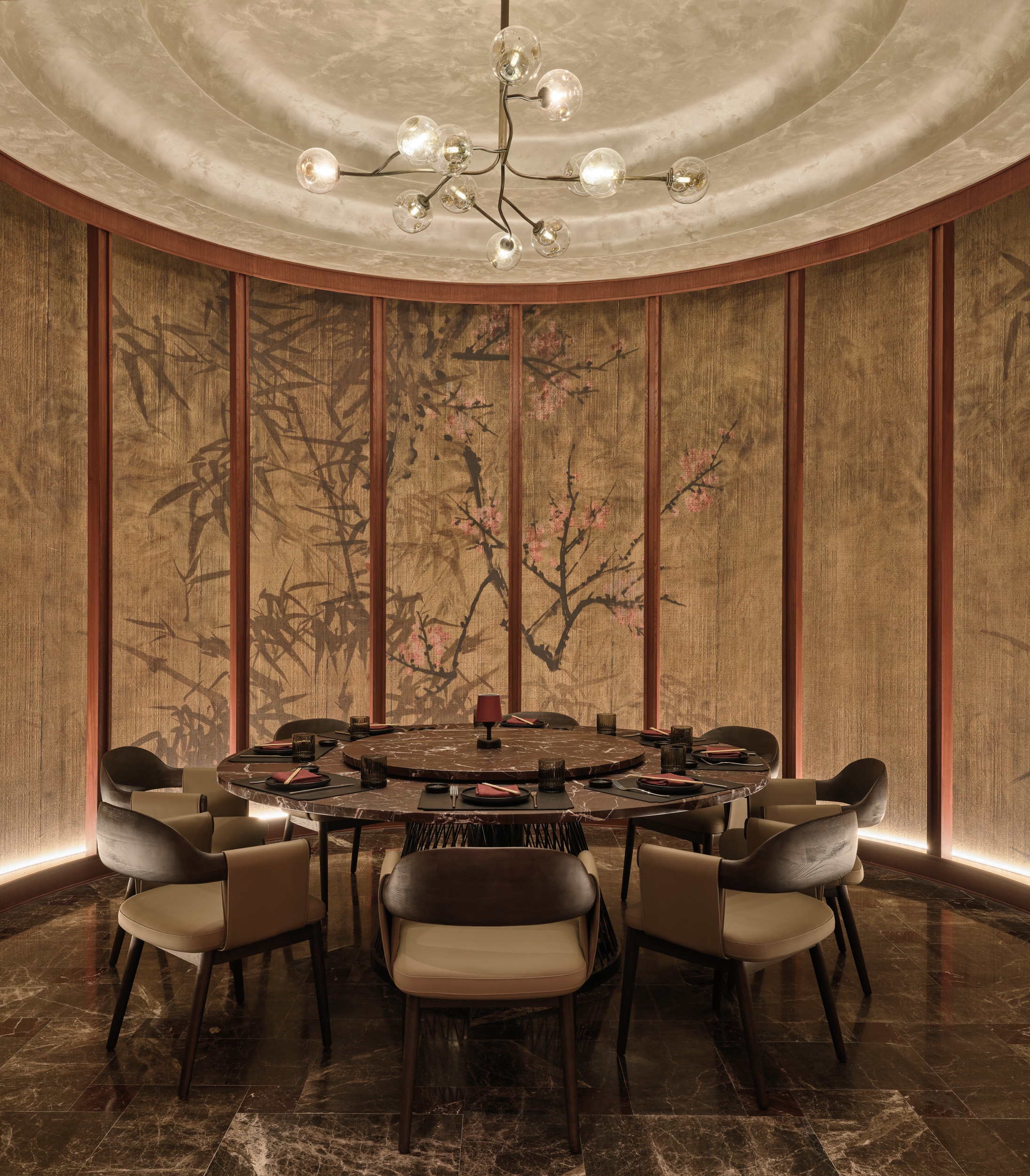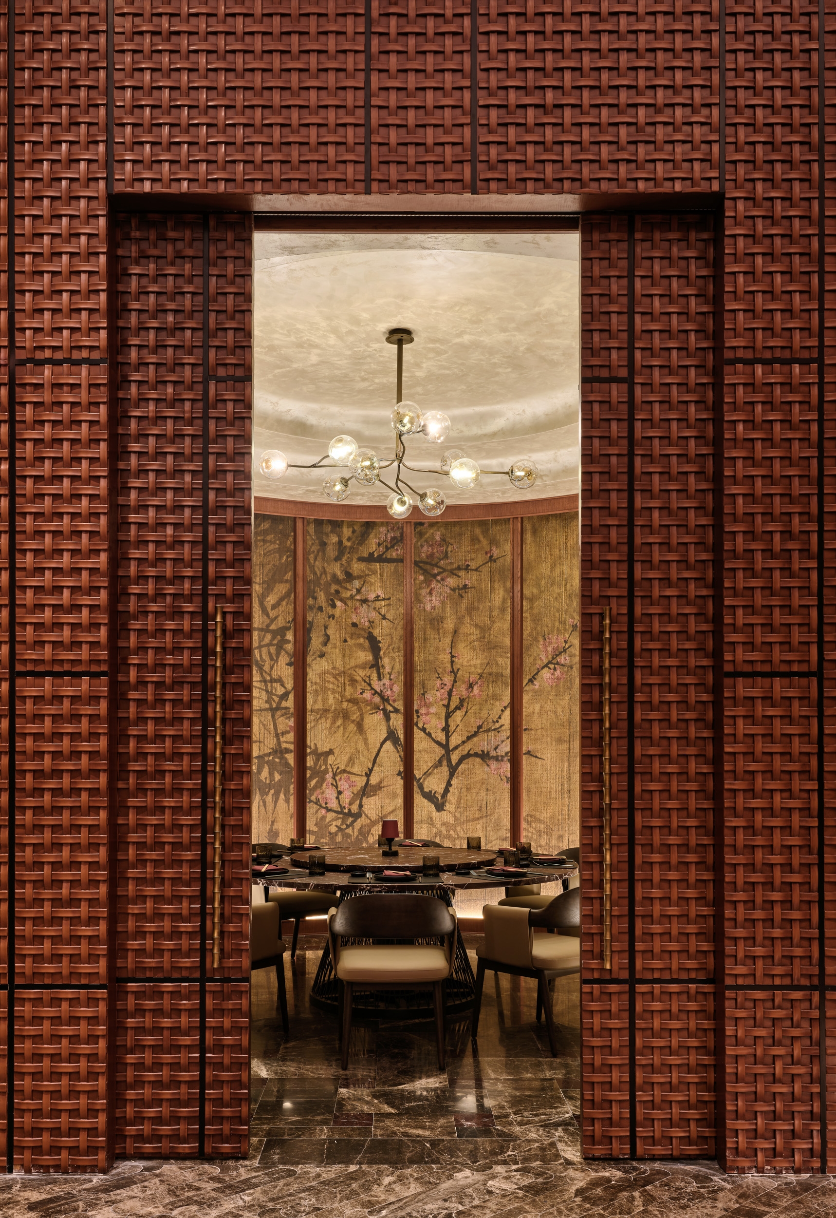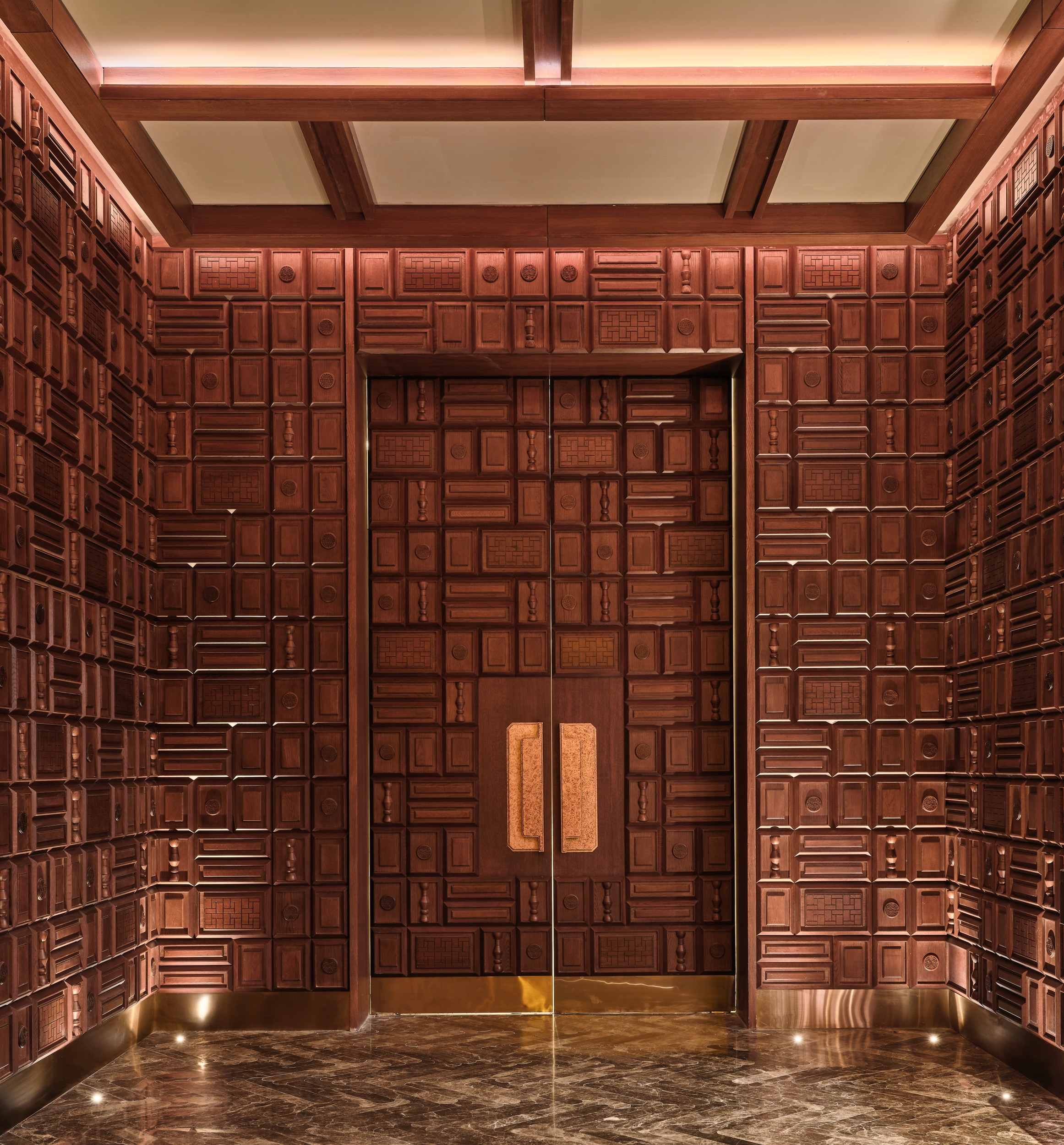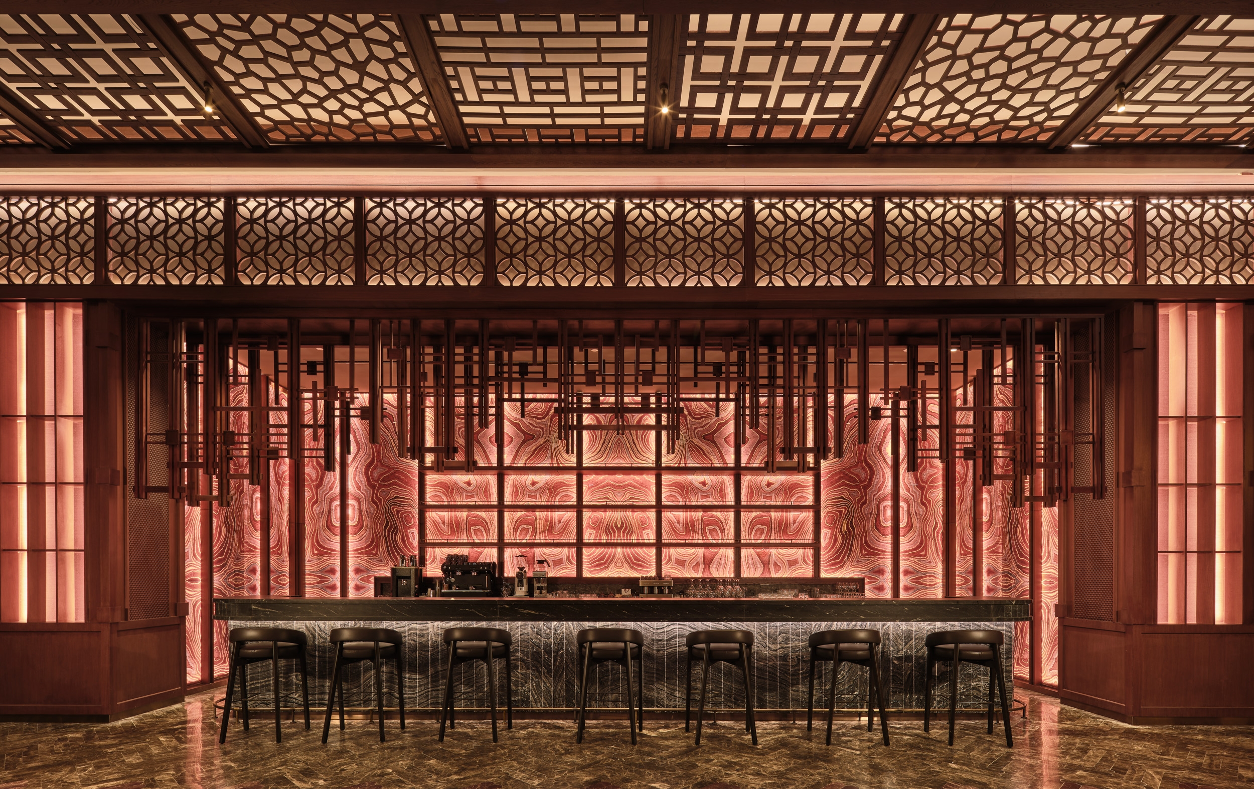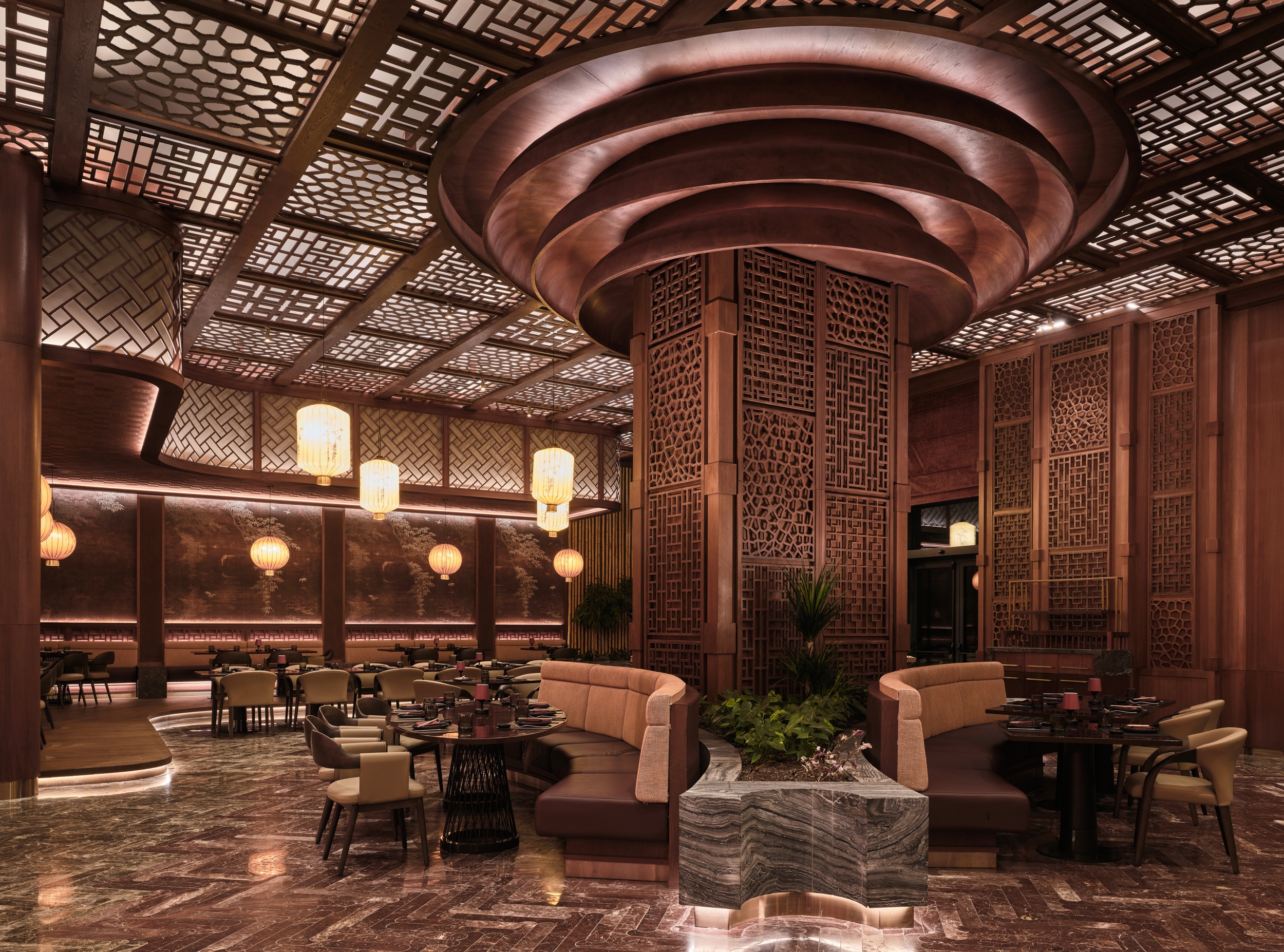 Yanji Restaurant reinterprets the spatial hierarchy of a traditional Chinese courtyard within a contemporary hospitality context. The layout organizes seating under lowered ceilings and eaves, creating layers of intimacy and rhythm around the central dining space. Wallcoverings and finishes echo the tactile character of Asian craft, while custom furniture, painted glass panels, and three-dimensional timber claddings transform material into an expressive surface. Cultural symbols are abstracted and reintroduced through woodworking details, establishing continuity between heritage and modern design. Light and reflection play central roles, animating textured surfaces and enhancing the sense of depth. The atmosphere evolves through subtle shifts in color and tone, offering a calm yet sensory experience. Sustainable thinking underpins the design, with durable finishes and upcycled materials extending the life of each crafted surface. Yanji translates cultural memory into a refined architectural language—grounded in craftsmanship, proportion, and spatial clarity.
