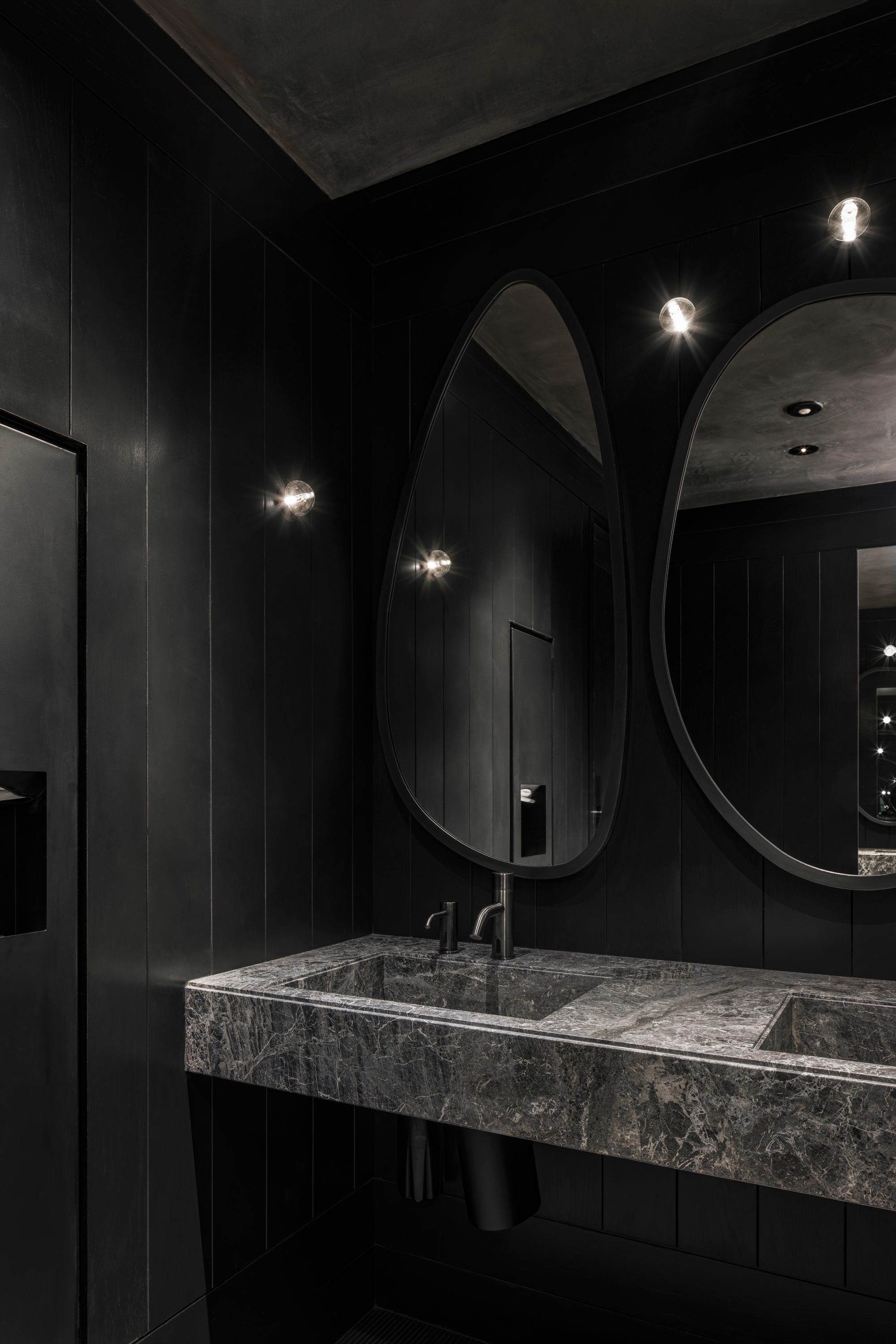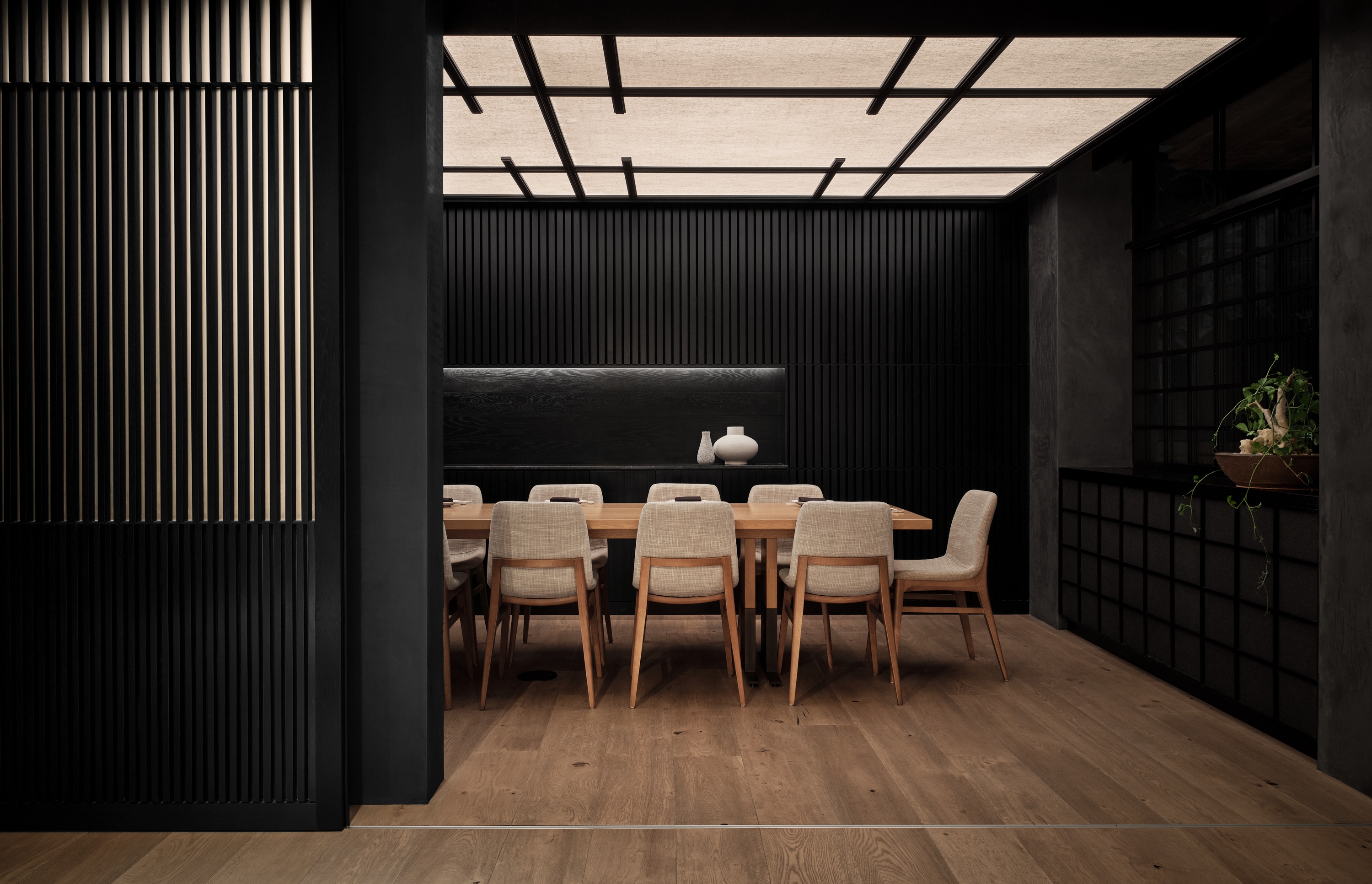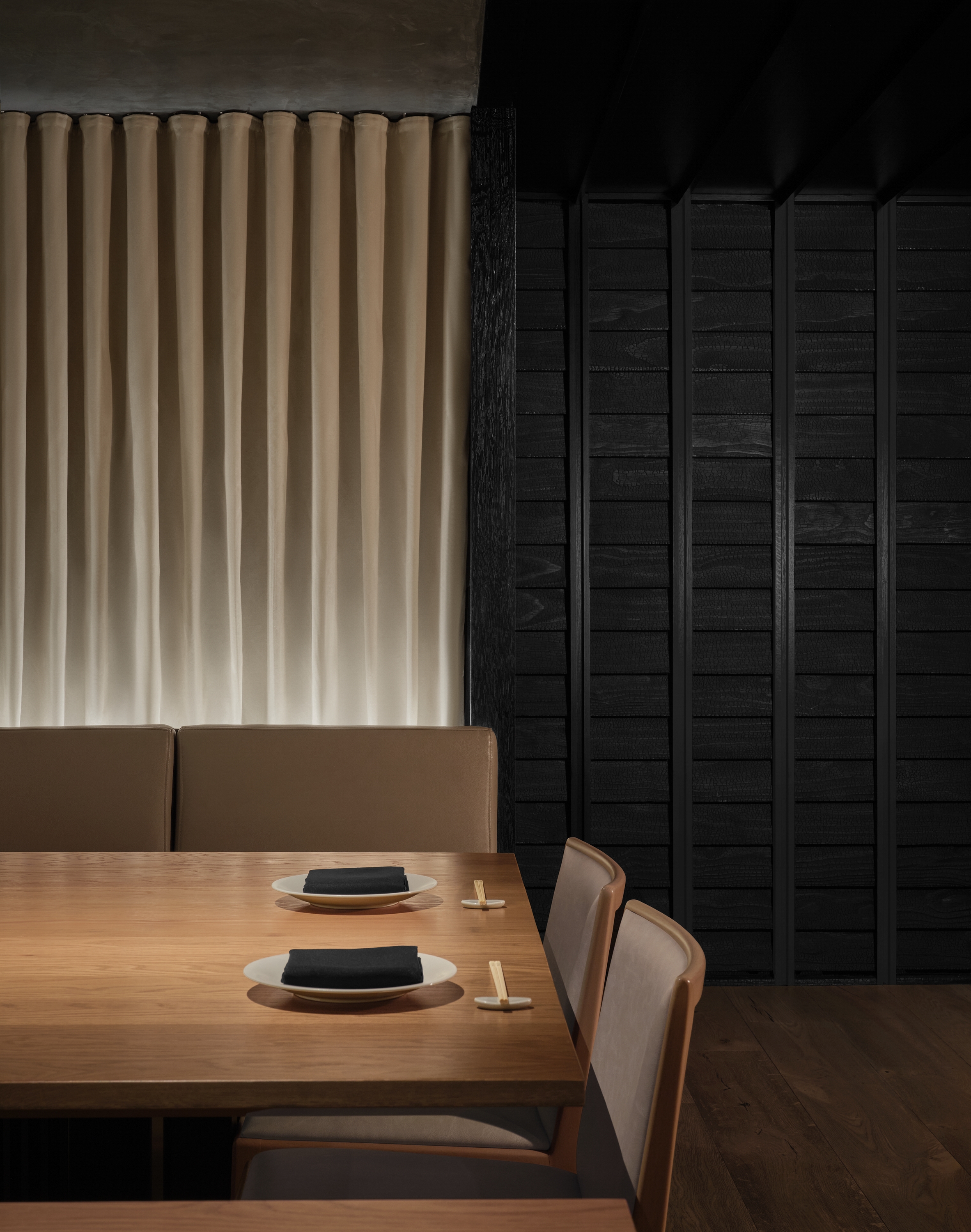 Furniture emphasizes natural materials and craft, with semi-custom maple and birch chairs, leather banquettes on ebonized oak bases, and resin wall panels inspired by Japanese washi paper. Dramatic lighting heightens the sense of quiet opulence and comfort.