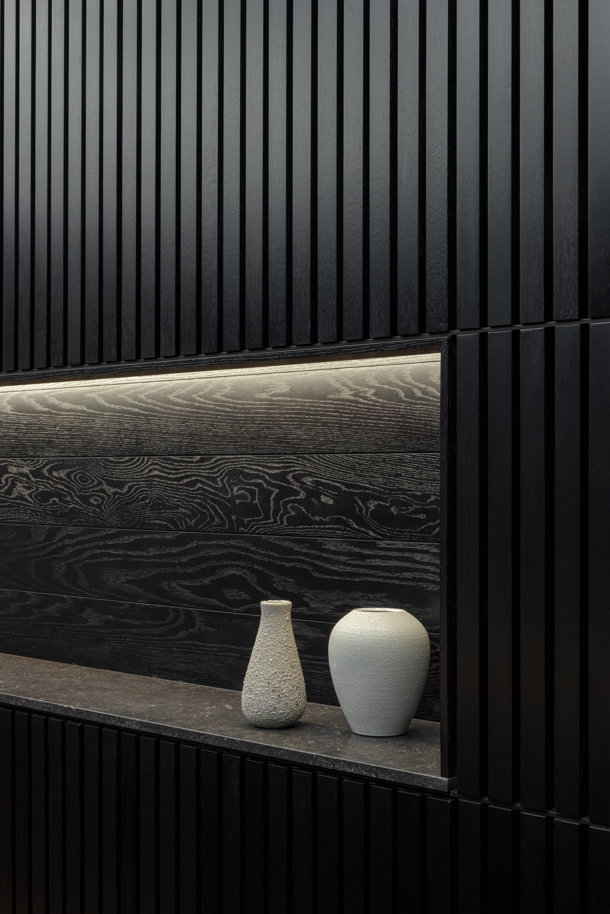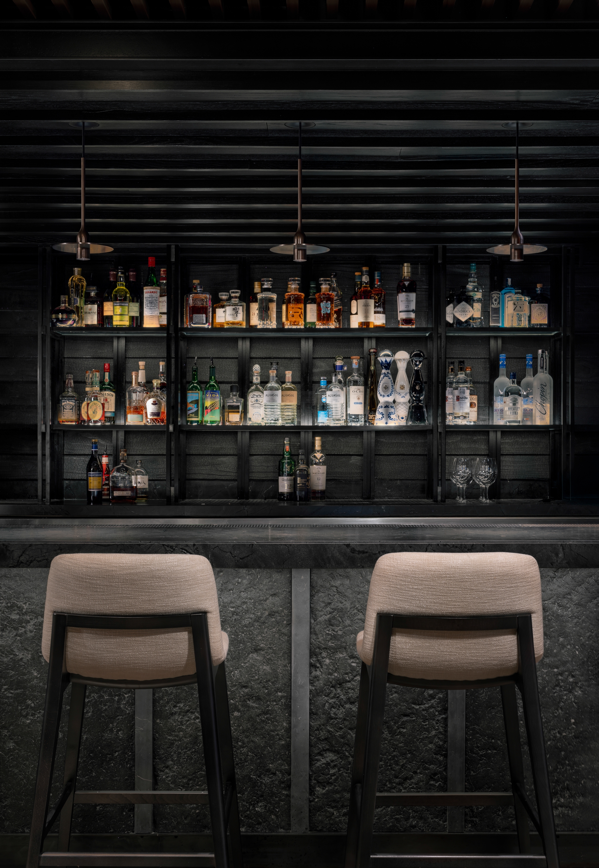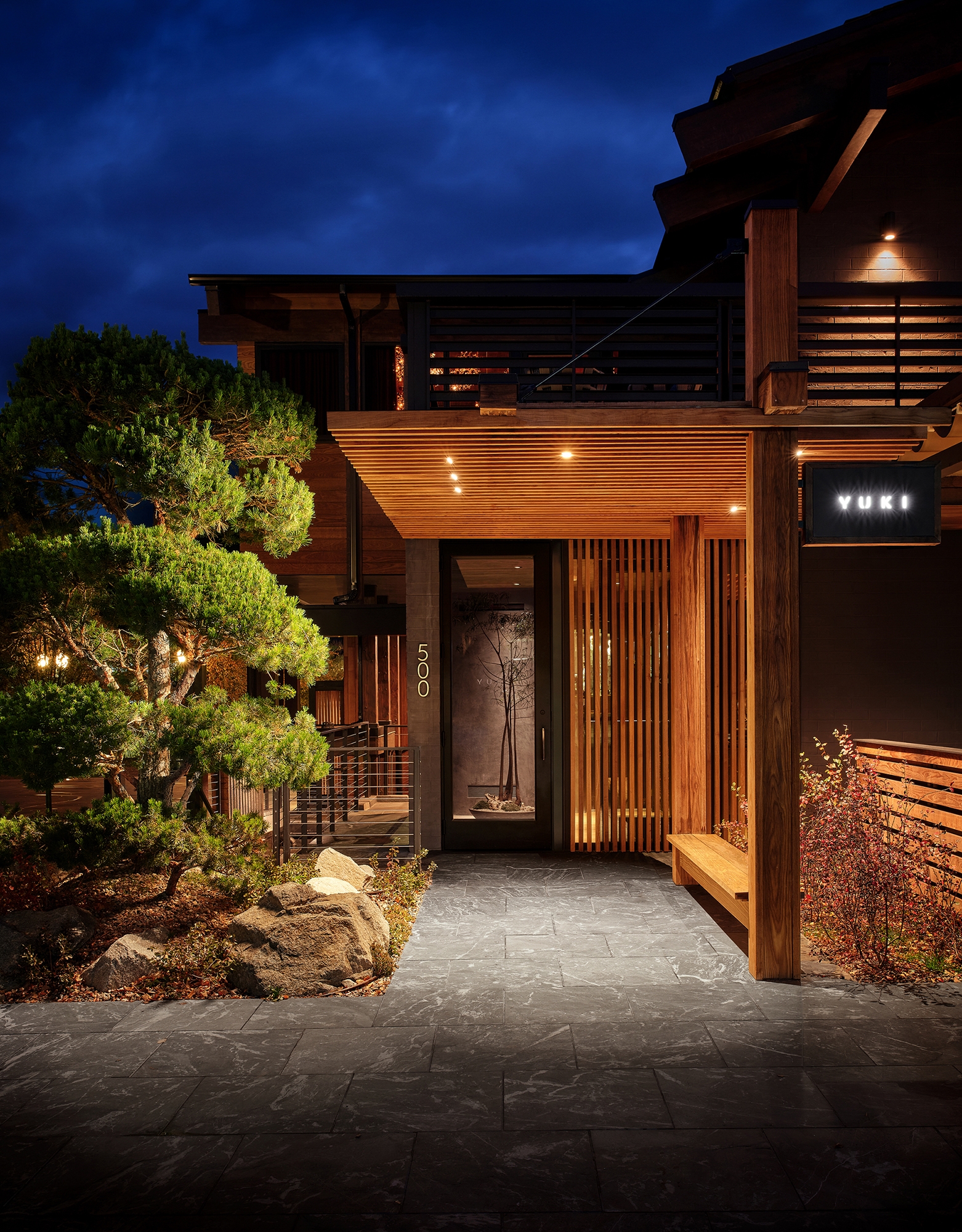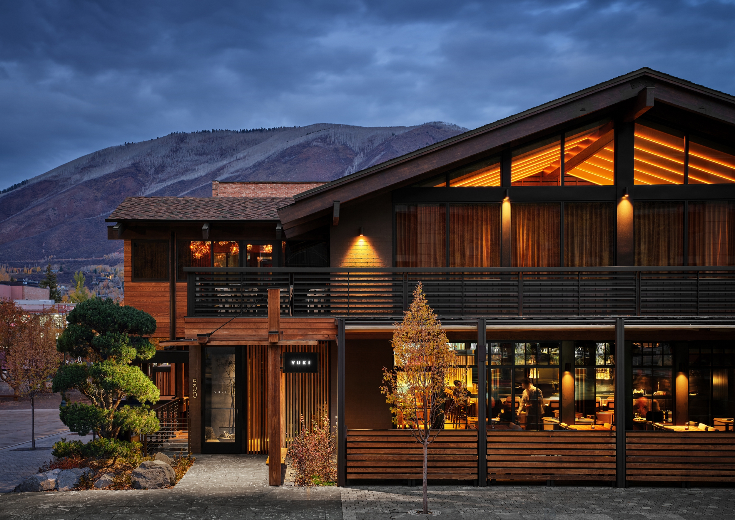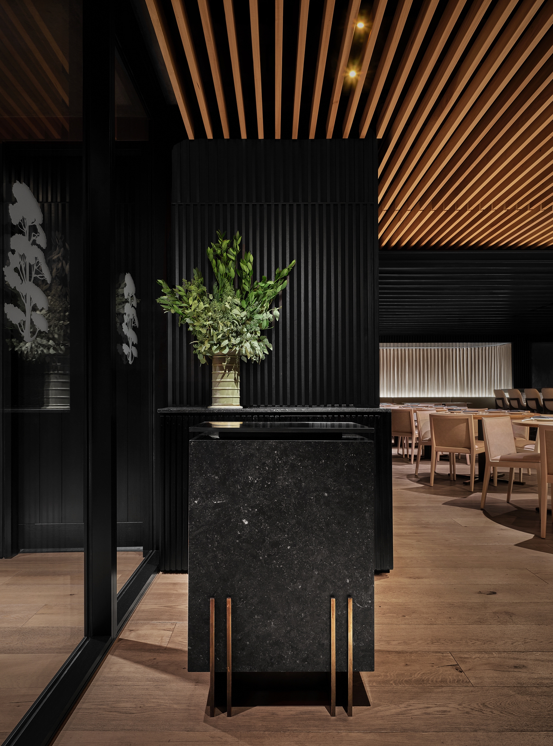 Perched beneath Aspen’s iconic mountain views and steps from the gondola, this Japanese-inspired restaurant embodies refined elegance. The layered interior pairs warm woods and natural stone with clean lines and balanced proportions to create a calm, harmonious atmosphere rooted in Japanese design principles. Dark, monochromatic tones are offset by lighter moments, while repeated wood slats and rippling drapery introduce rhythm. Clear and ebonized oak, plaster, quartzite, and stone form a serene backdrop for the culinary experience.