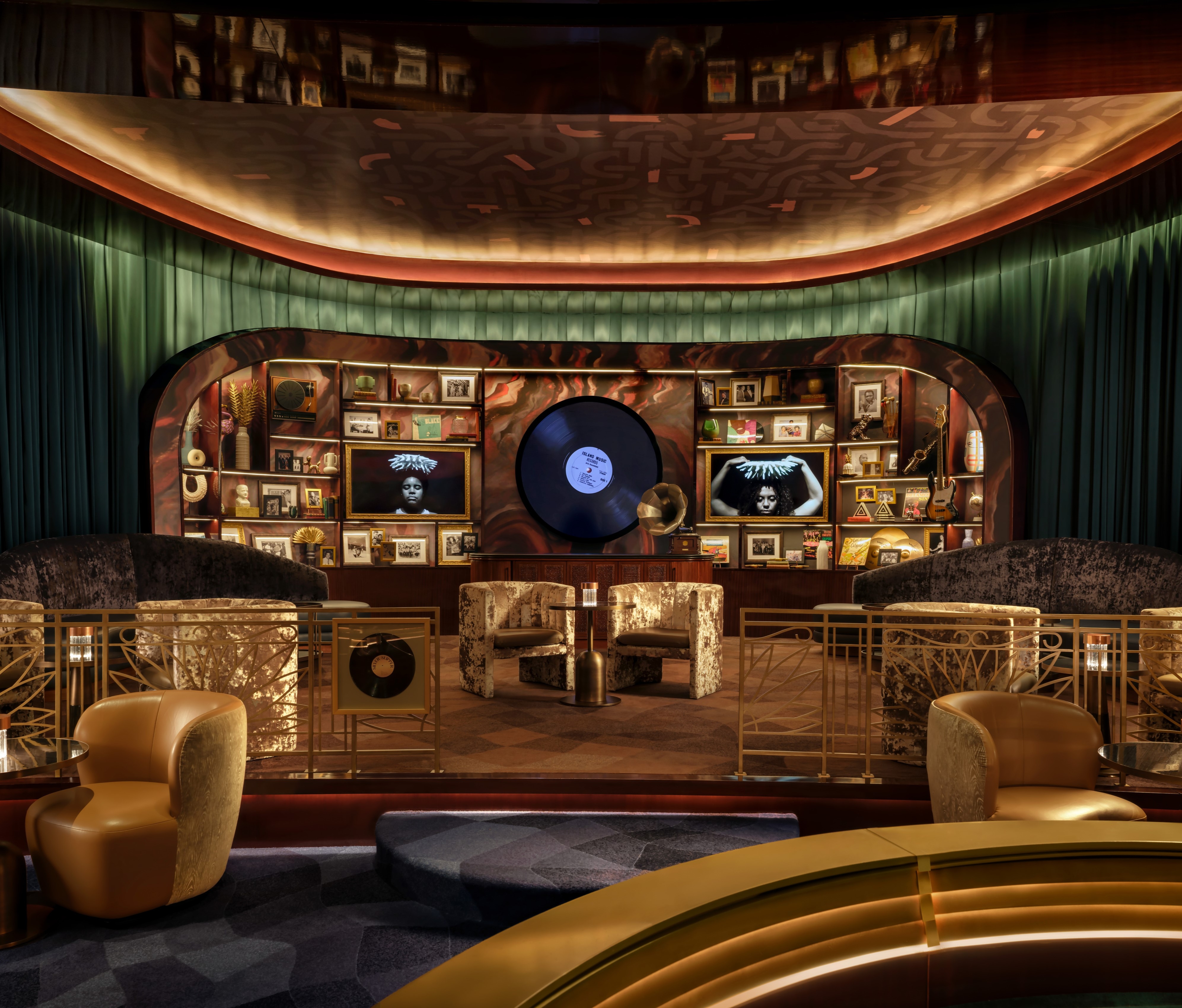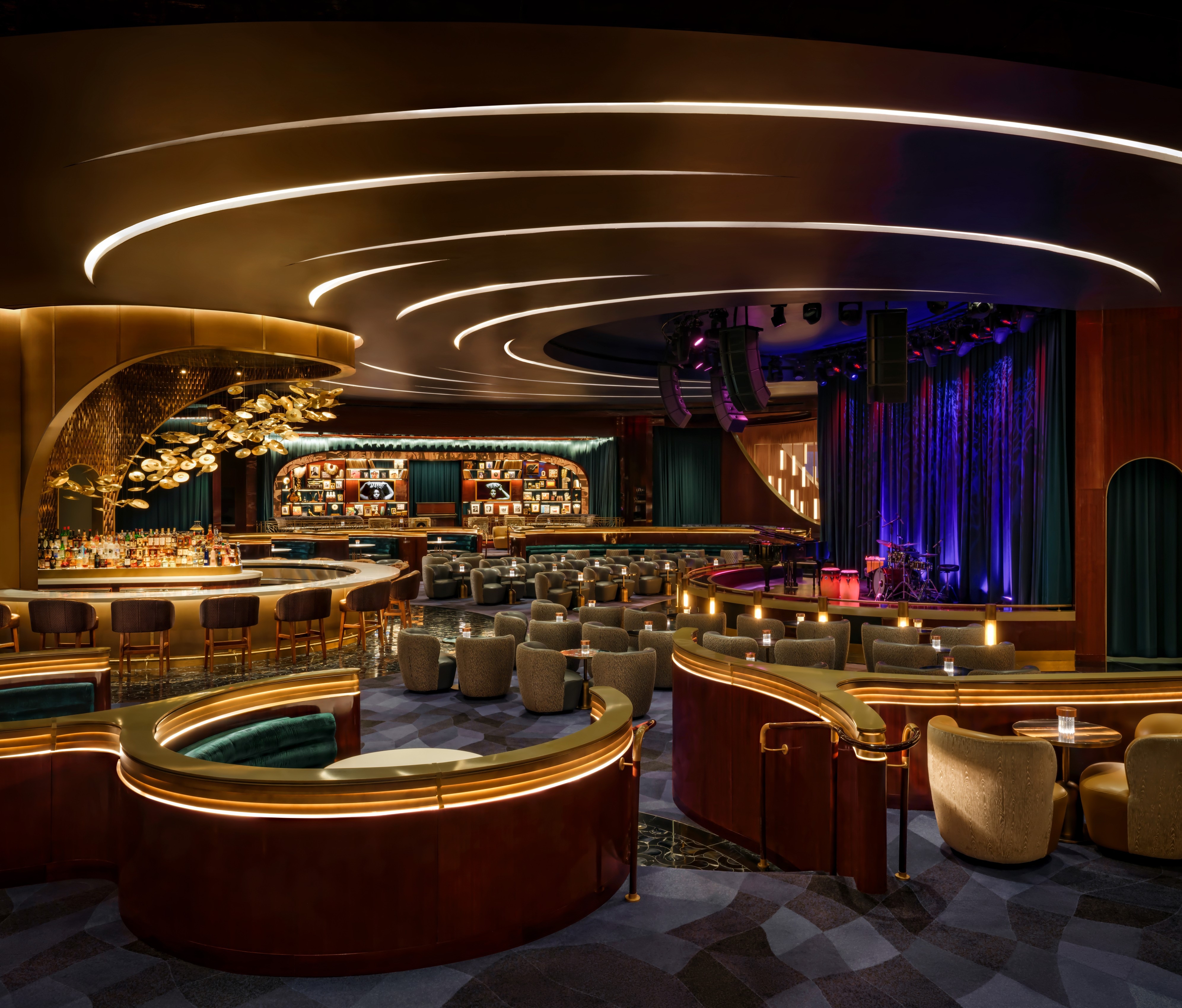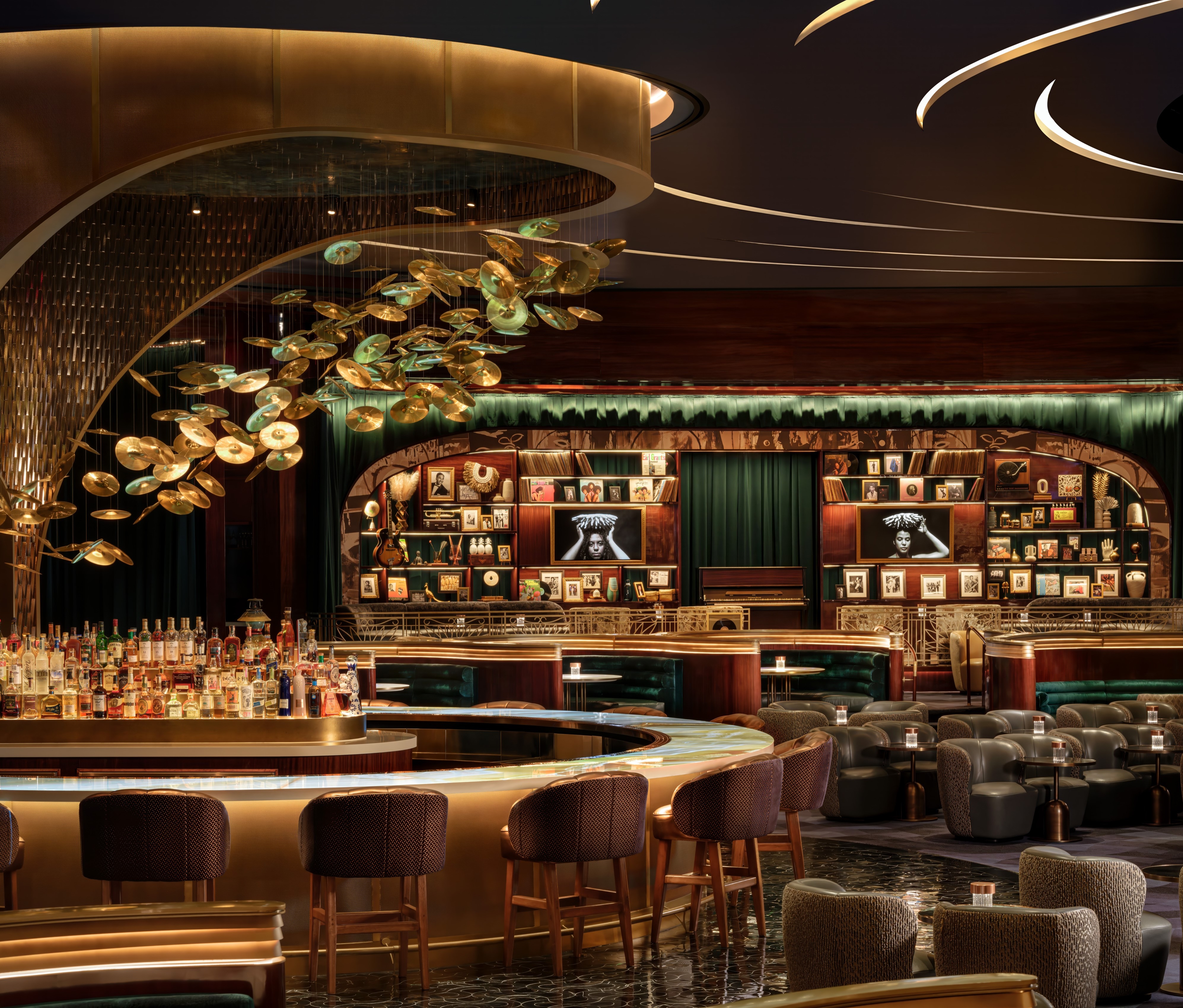 Designed to host “jazz & everything else,” Jon Batiste’s intimate jazz bar at Baha Mar captures the rhythm and vibrancy of Bahamian culture. What was once a gaming area has been completely transformed; 80% of the slot machines were removed to create an open, luxurious lounge filled with rich textures, curated art, and immersive light installations. Throughout the day, the atmosphere shifts effortlessly. Drapery and lighting transitions allow the space to move from a laid-back daytime venue to an energetic, late-night performance setting. Multi-level seating from tables and banquettes to VIP perches draw intimacy and buzz to every corner. An 11-foot curved LED screen marks the entrance, pulling guests in with dynamic motion and color. Inside, it’s all about mood, music, and connection — a soulful escape blending art, design, and sound.