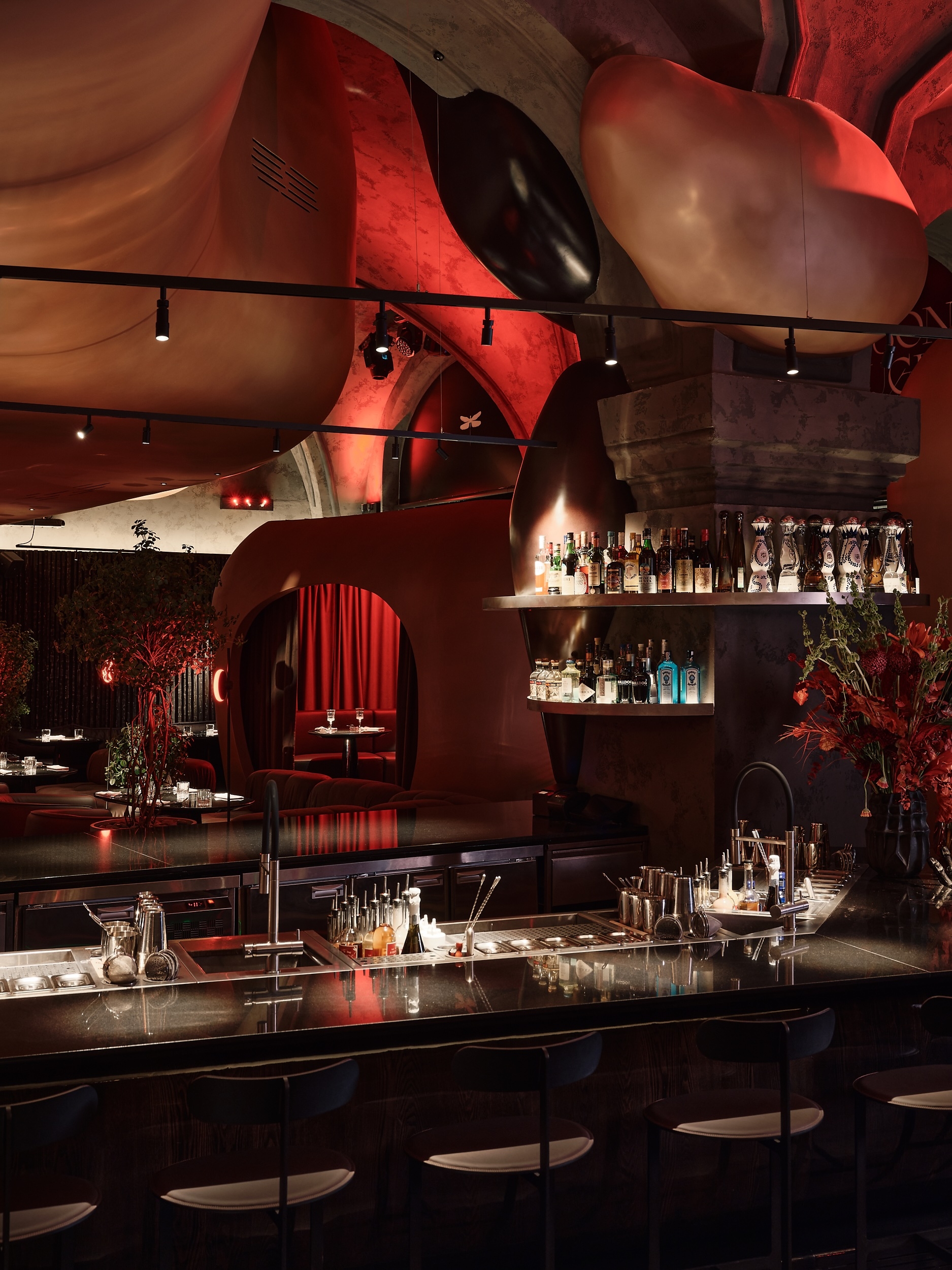 The interior concept is inspired by a lava lamp, expressed through 16 amorphous fibreglass volumes with fluid, molten shapes finished in metallic enamel. These sculptural elements define key functional zones — including the cloakroom, VIP area, hookah bar and kitchen — while the largest suspended form conceals the ventilation system, acting as both architecture and art.