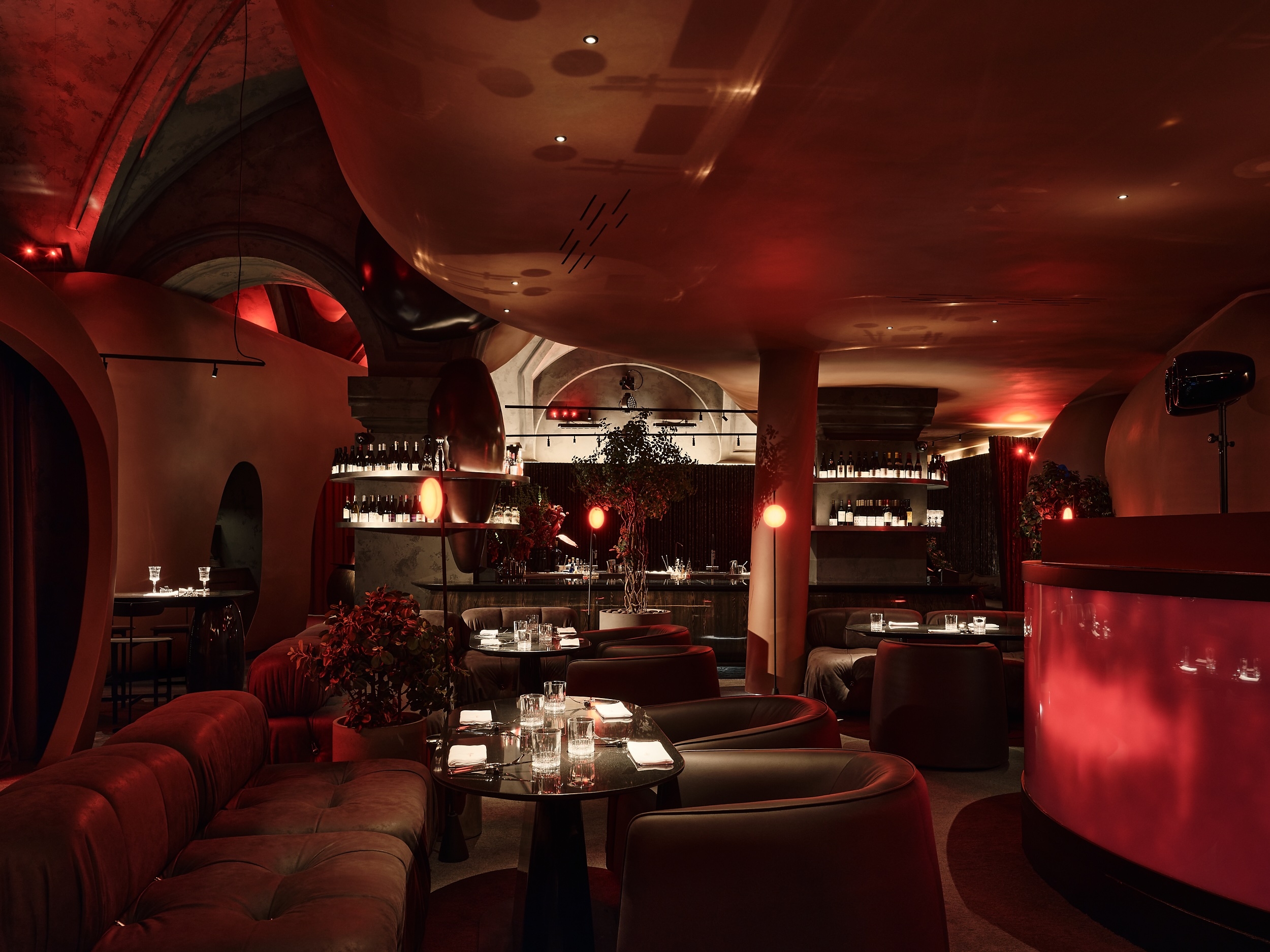 The space transforms throughout the day from a refined restaurant to an intimate lounge and, at night, into a nightclub with DJ sets. Guests enter through a sculptural lacquered bar connected to a communal table. The layout combines bar, dining and lounge seating, with low sofas facing an interactive DJ booth. A separate cocoon-like room functions as an independent VIP space. Lighting scenarios and a palette of wood, stone, metal, suede and leather reinforce the venue’s premium character.