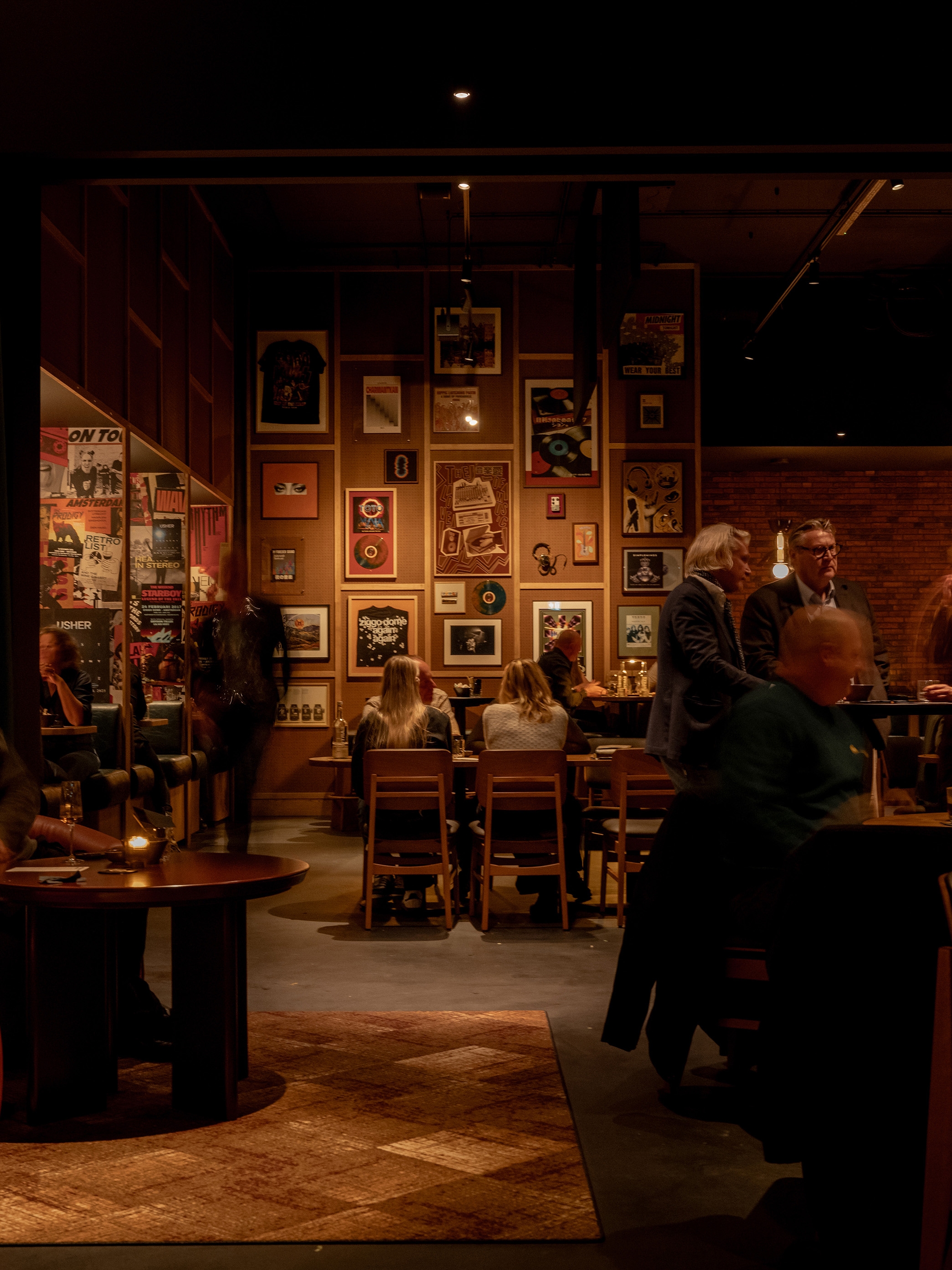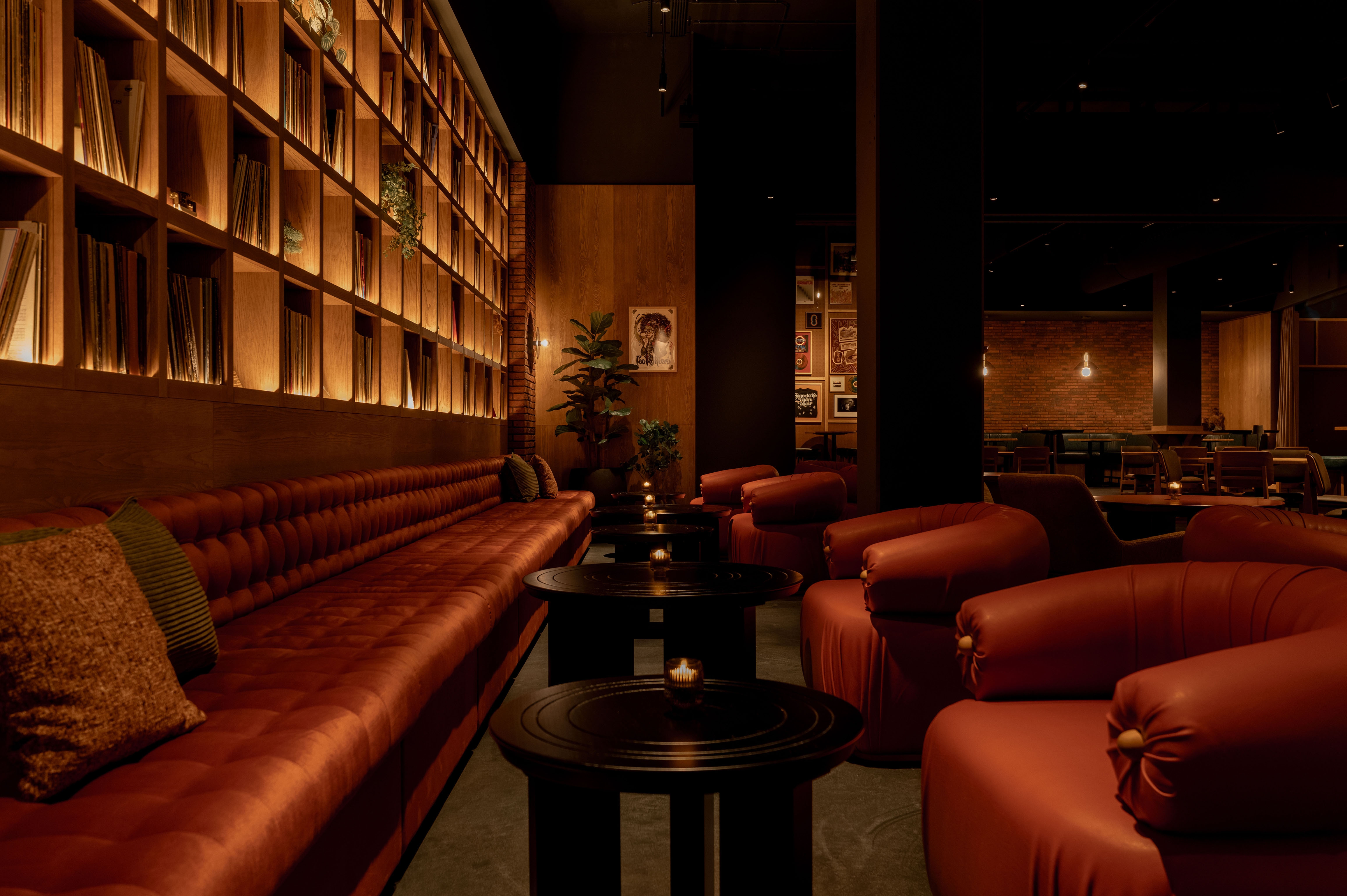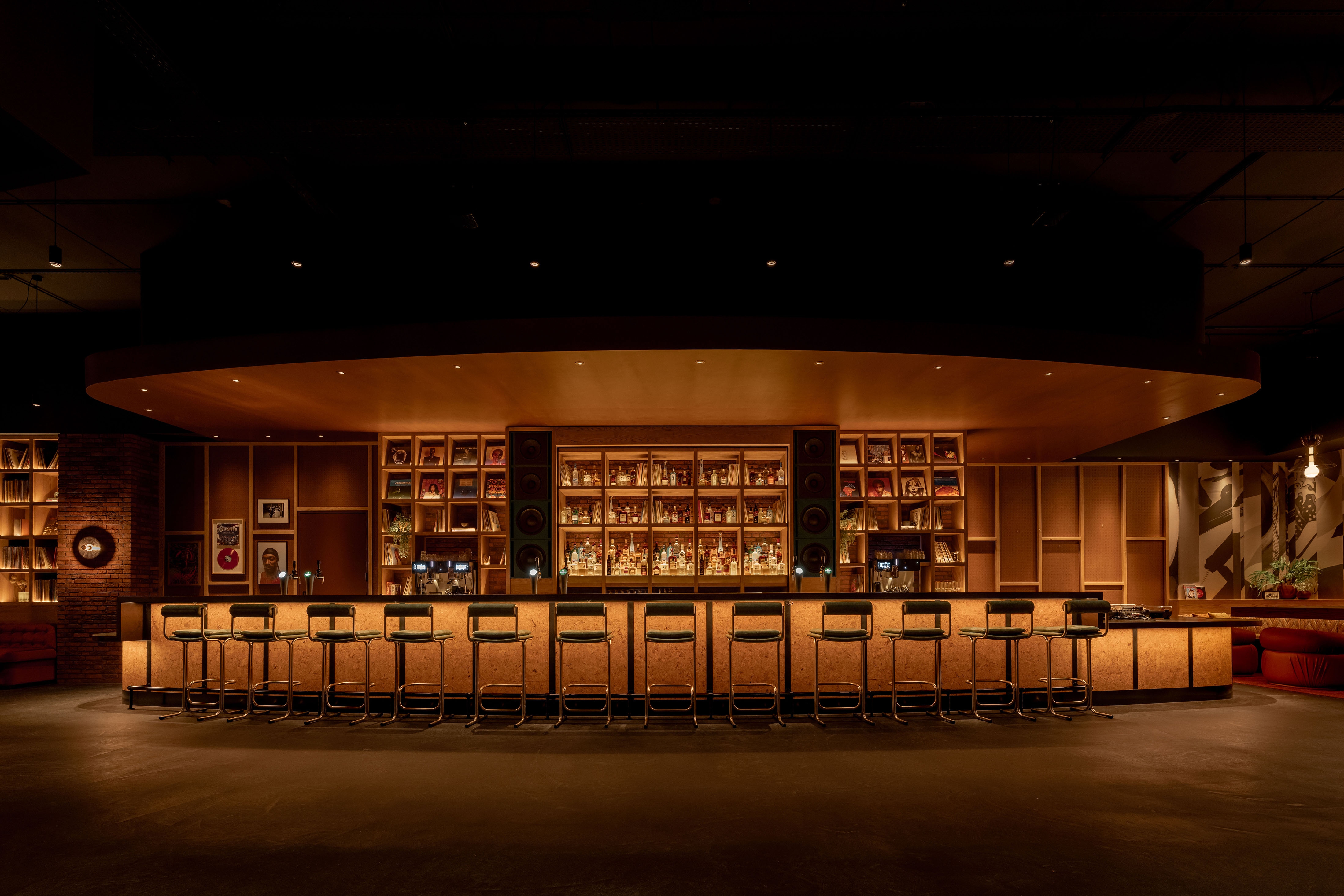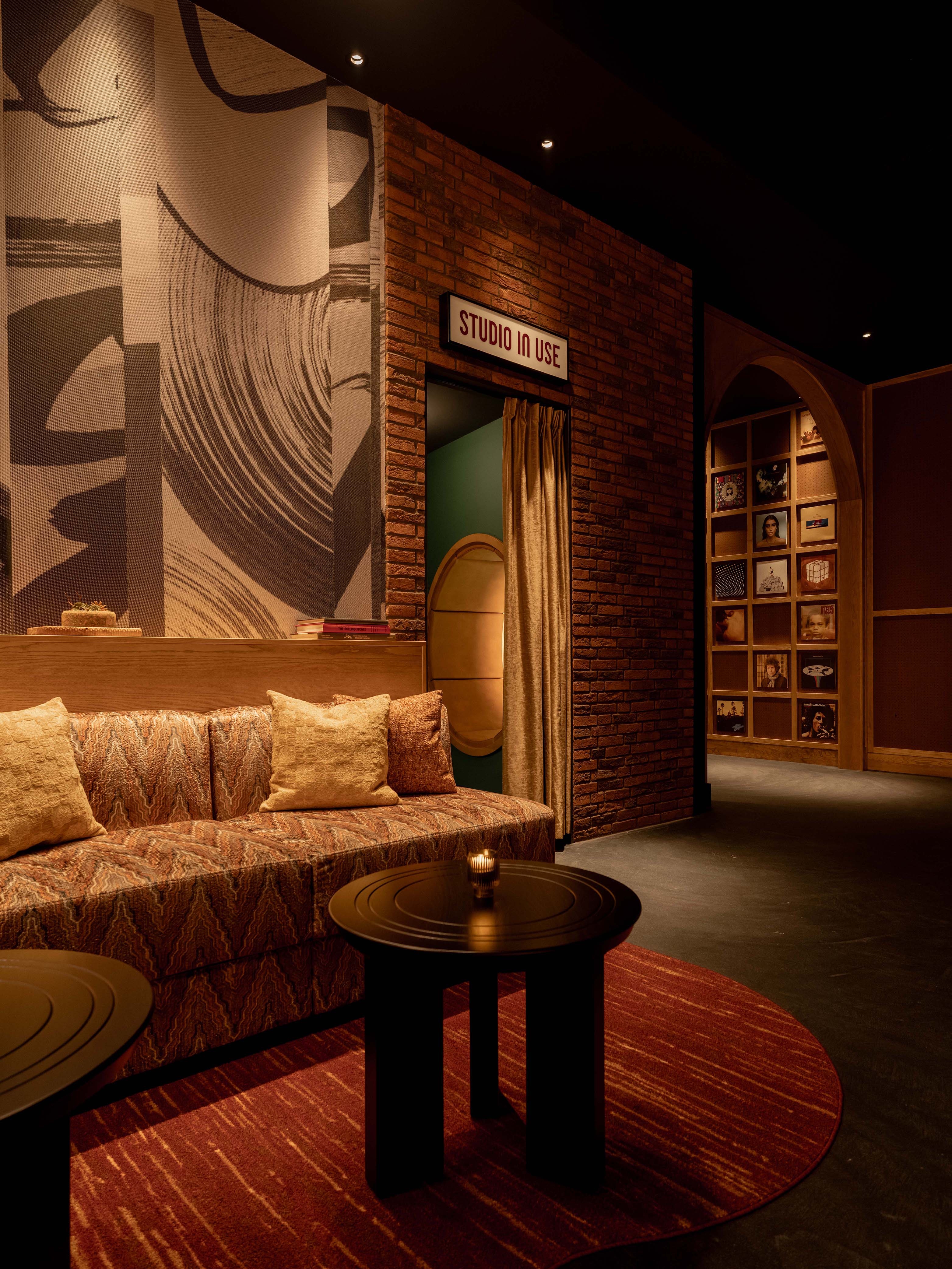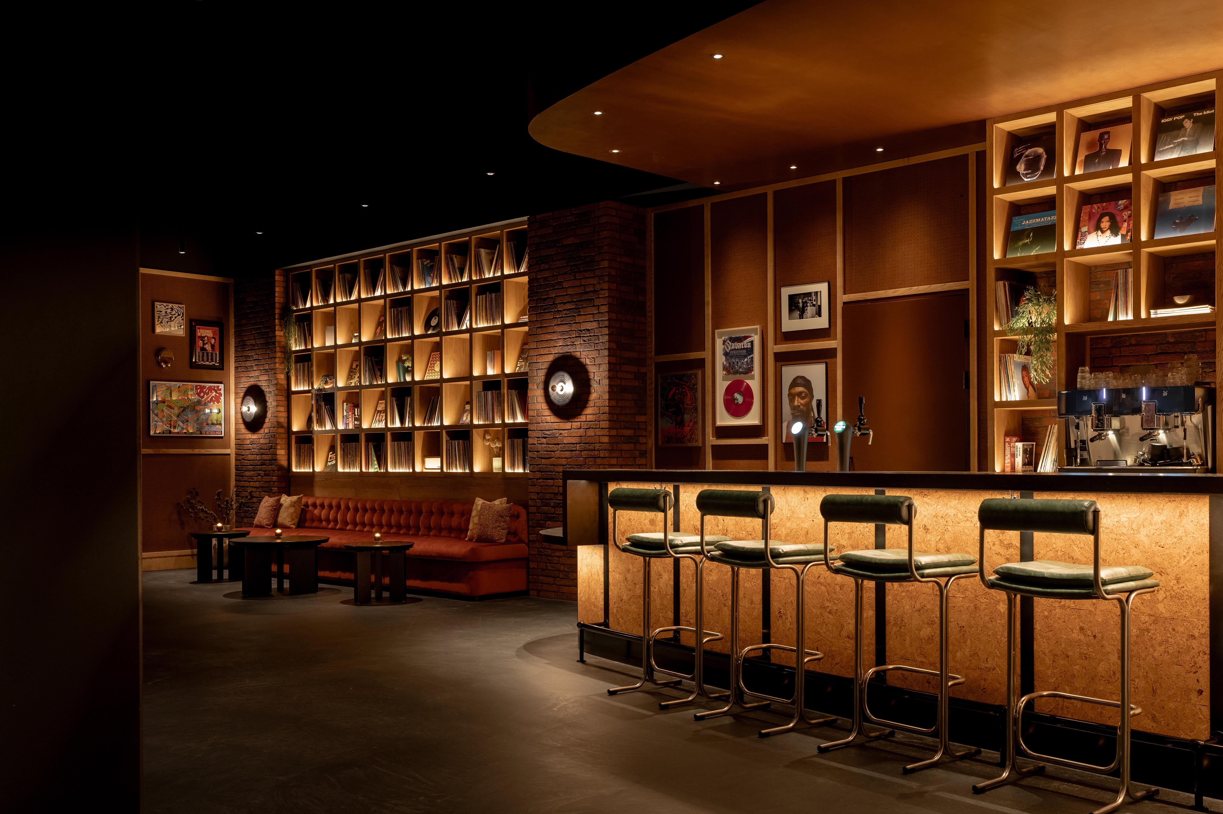 Upon arrival, a carefully curated tunnel of vinyl records sets the tone, before being welcomed into a warmly lit space offering cosy corners, earthy tones and rich textures. At the heart of the room, an expansive curved bar takes centre stage, featuring integrated speakers and turntables for an authentic vinyl experience. Distinctive bespoke lighting, wallcovering and audio-focused accessories support the music-led narrative, whilst show posters from the venue’s archives add cultural relevance. Sofa-style banquettes, leather upholstered booths, warm timber and lacquered tables offer a variety of seating styles to sit back and enjoy the atmosphere of this pre and post-show retreat.