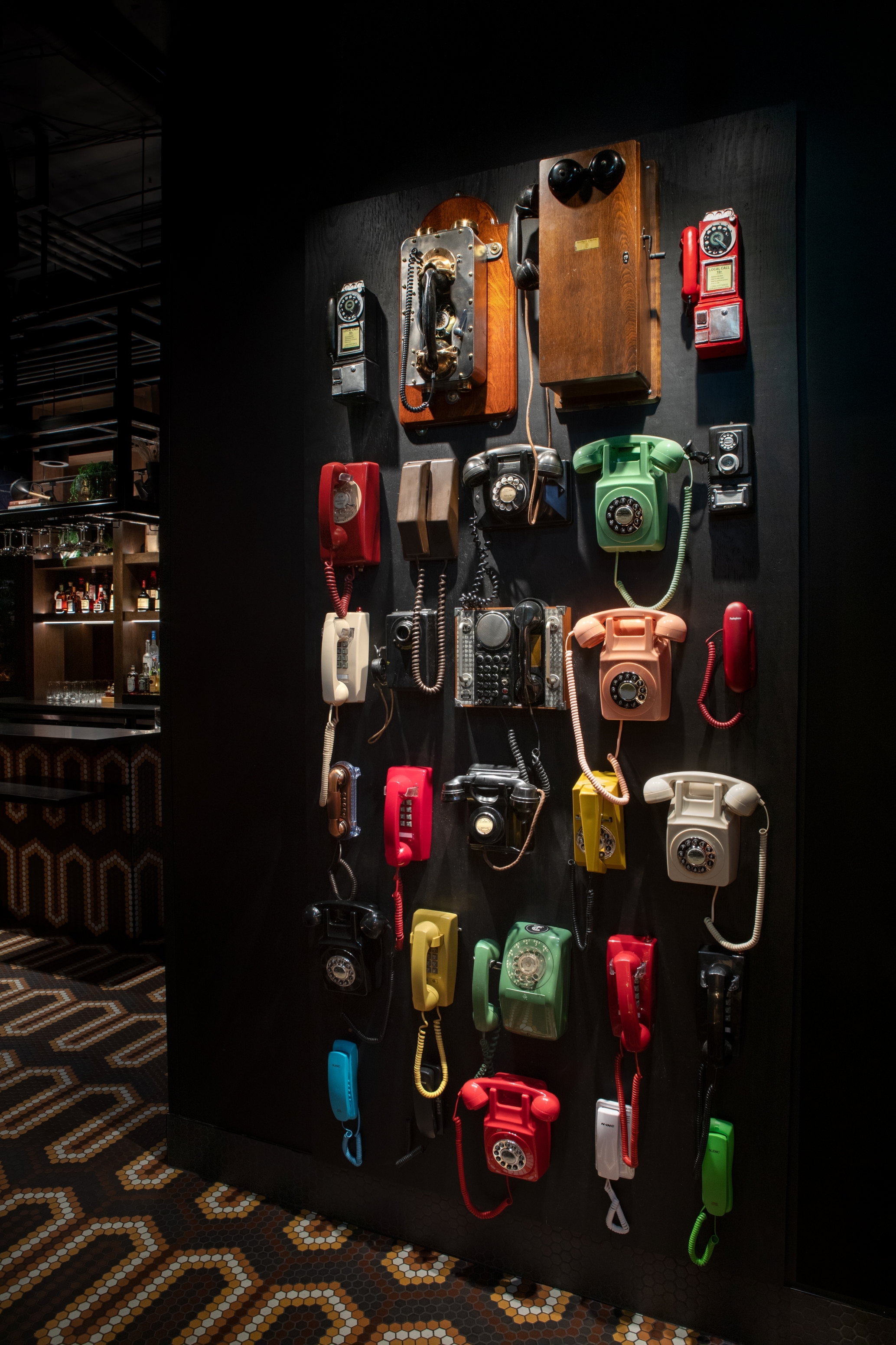 A door resembling a British telephone booth door in the pub provides access to the intimate 600 square foot lounge. Wall hung telephones greet guests as they enter and inspired the lounge’s name: Call Me Back. Reflections in the mylar wallcovering, gilded mirrors and back bar mirrors provide sparkle and create the illusion of a larger space. Velvet drapery and feather pendant lights add to the allure of the 22 seat lounge. Glassware, extra bottles and accessories are housed in a suspended overbar shelving feature.