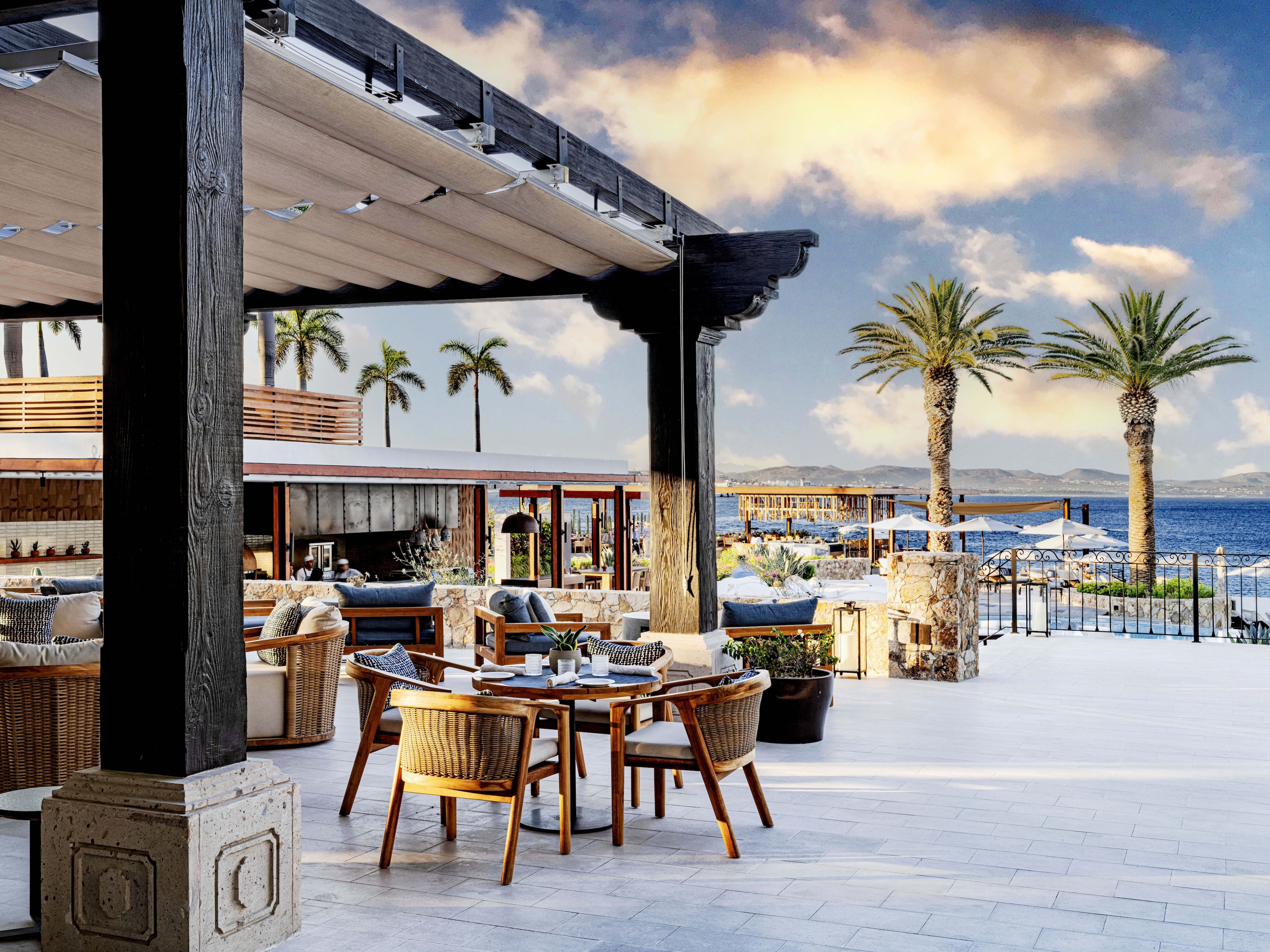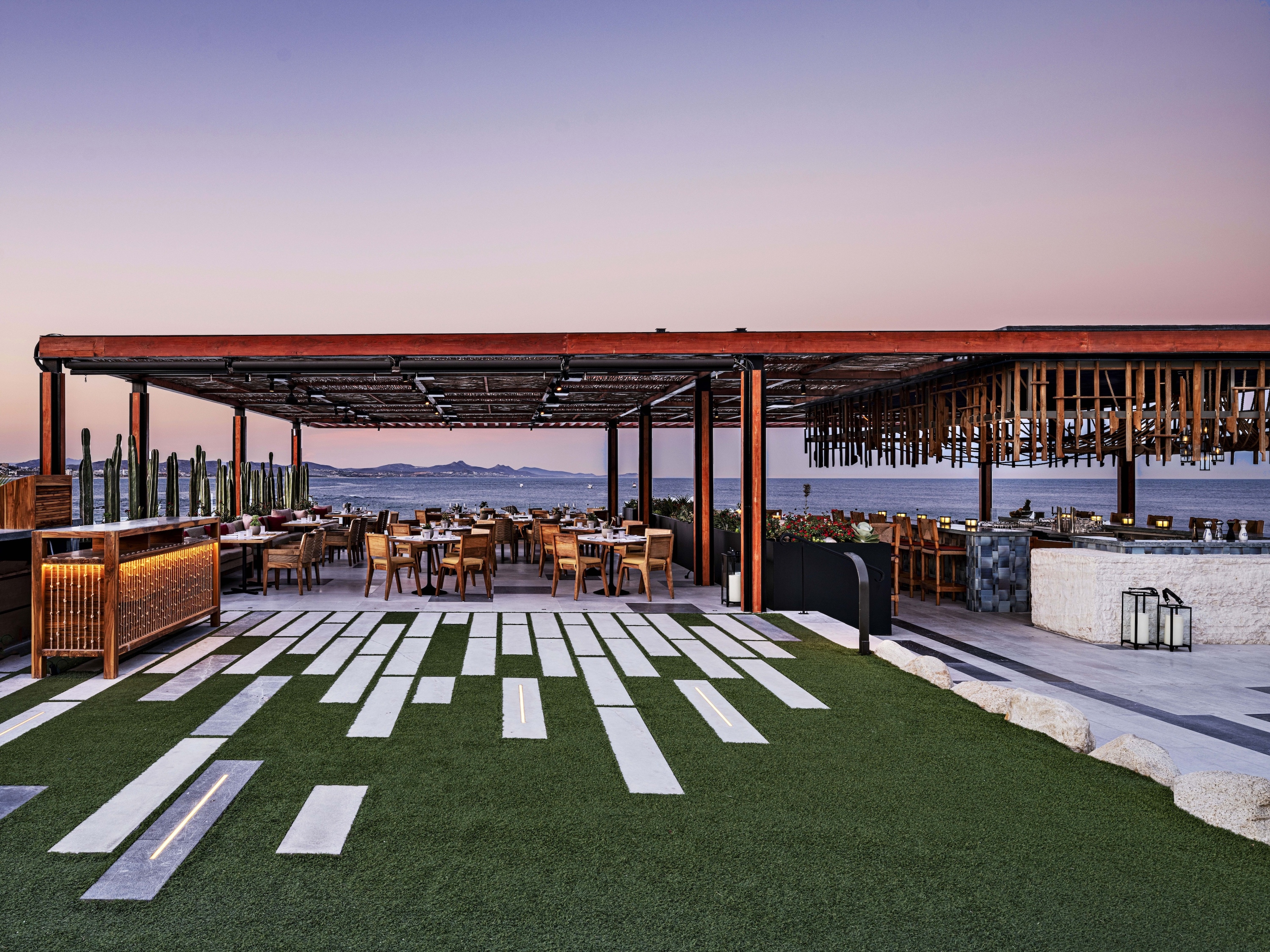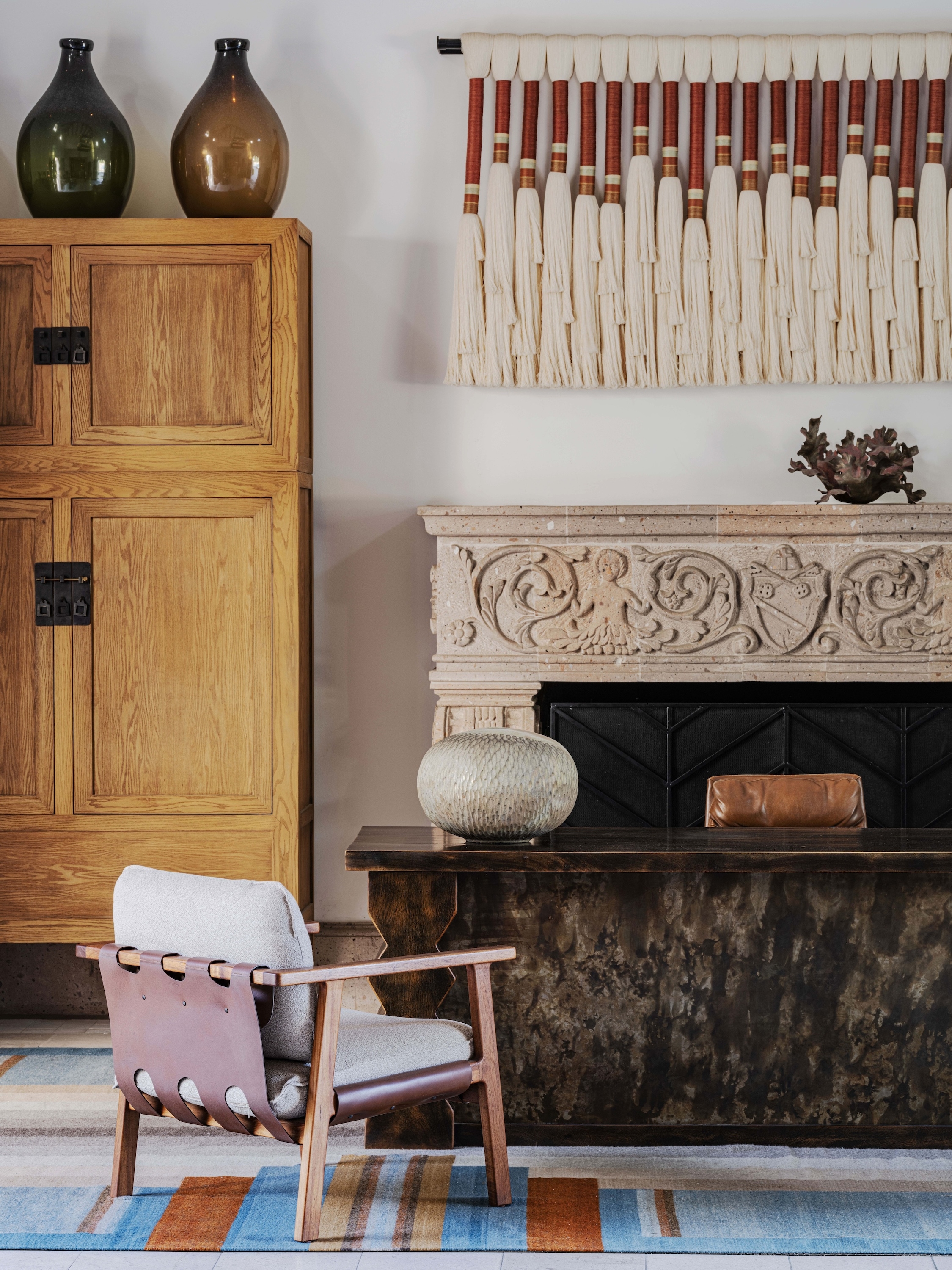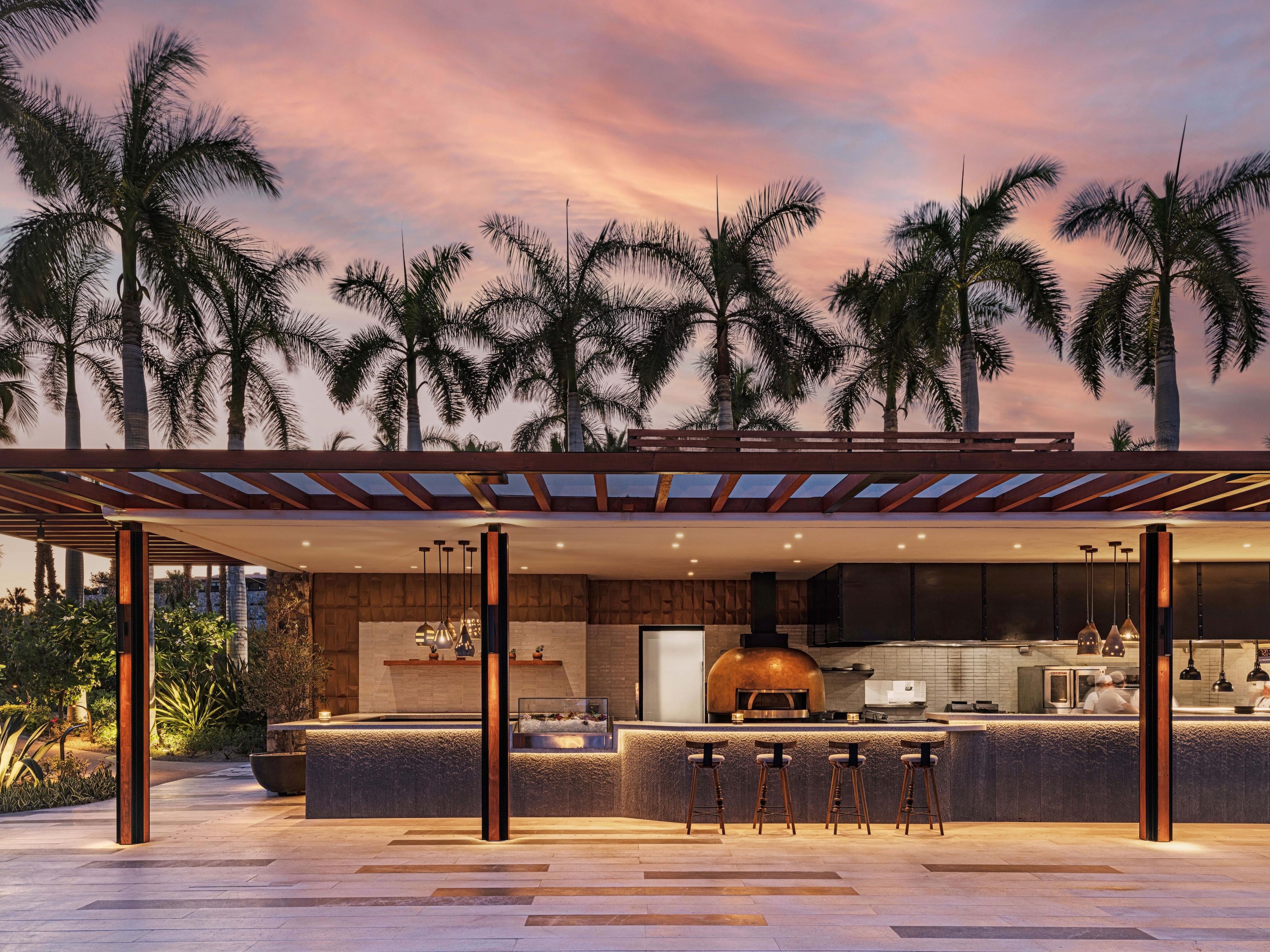 Elements of the historical structure were retained, now complemented by new custom furniture and décor that use traditional materials and colors, interpreted through a contemporary lens. Local Ojinaga limestone tile is used throughout, the color and textures indicating shifts of programming in the largely open-air space.
