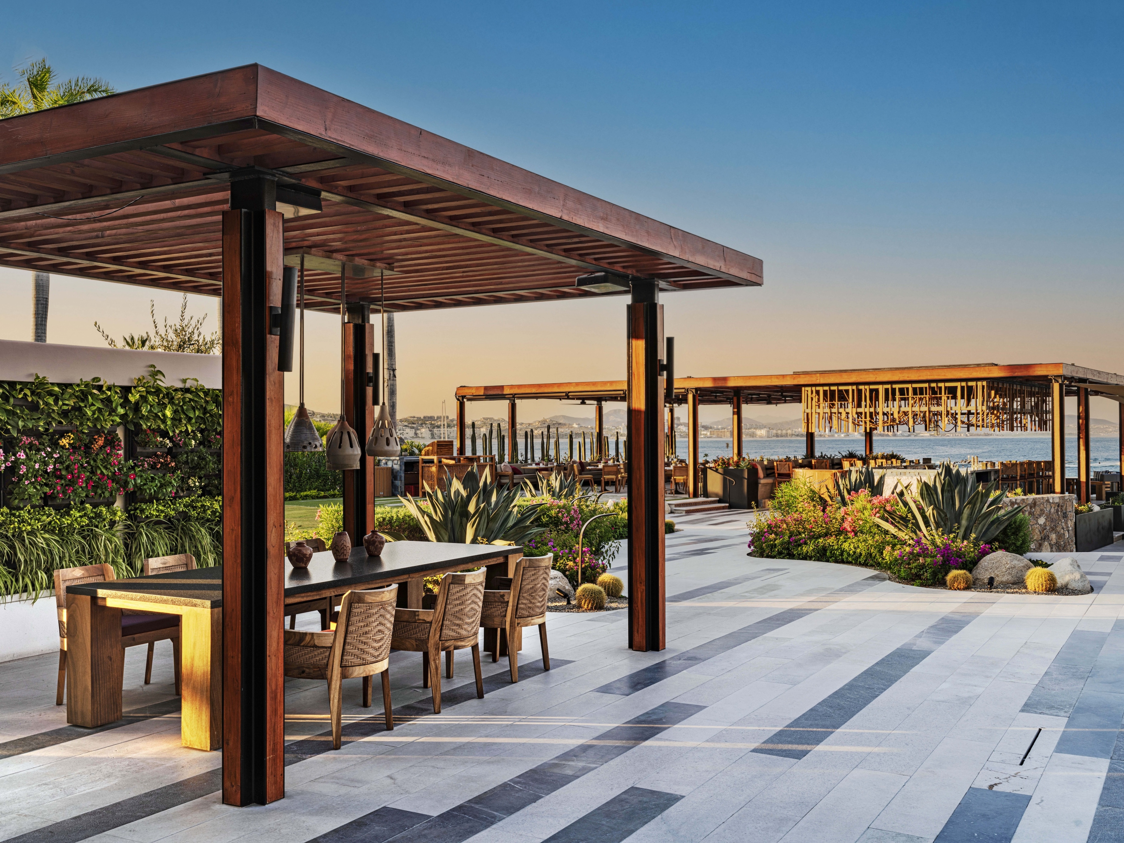 An underutilized space adjacent to the main pool was transformed into an action kitchen and open-air chef’s table. The kitchen’s mix of textures, materiality, and proportion exudes earthy elegance. The nearby chef’s table sits peacefully beneath a teak and steel pergola and backdrop of a living wall.