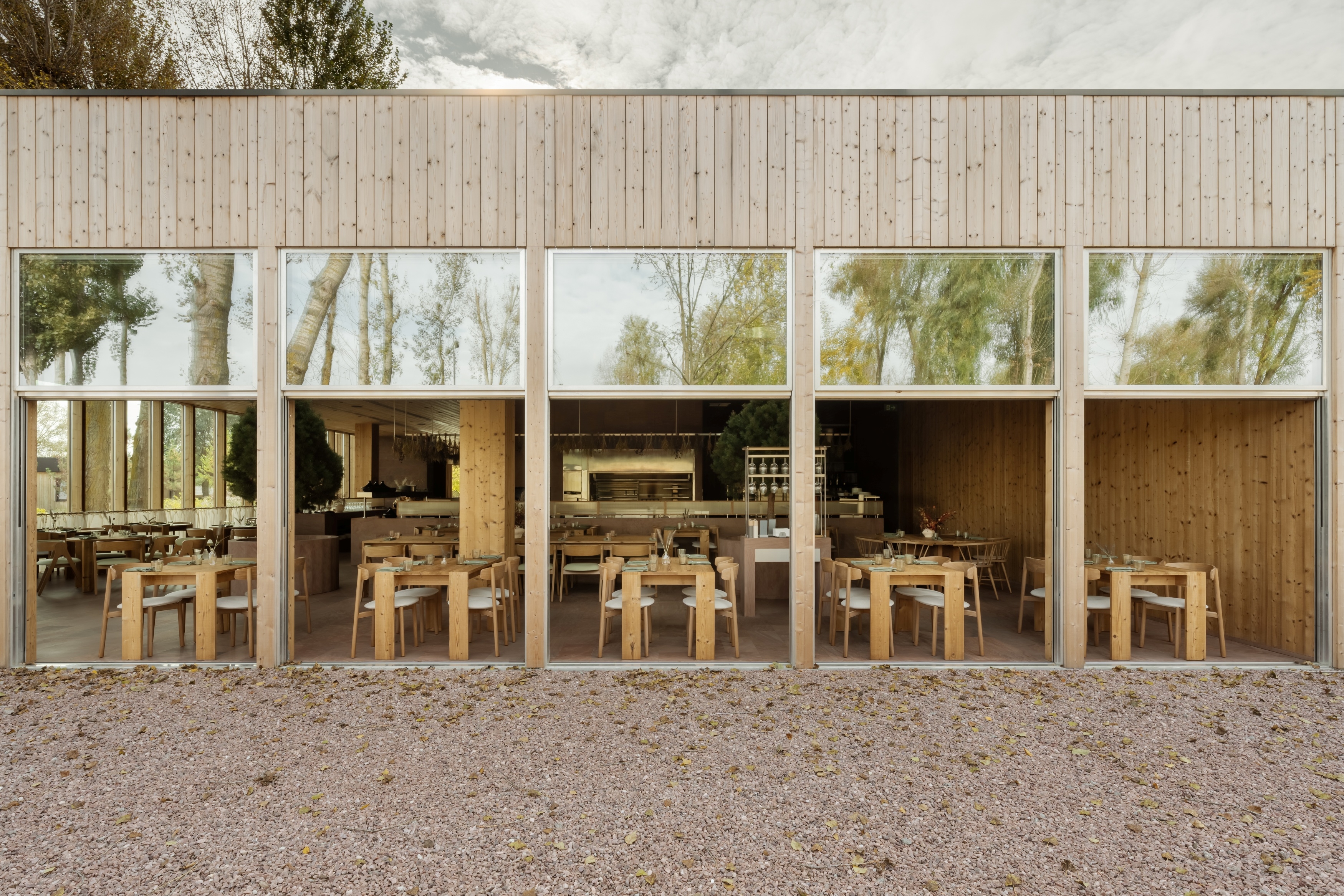 The interior embraces this ethos through natural textures, lightness, and a calming, tactile atmosphere. Floor-to-ceiling windows with a guillotine opening system dissolve the boundary between dining room and garden, while the open kitchen turns cooking into a shared experience.