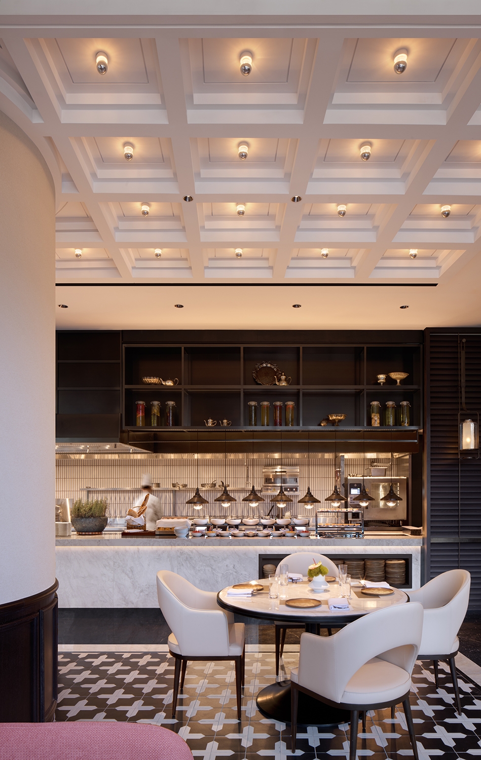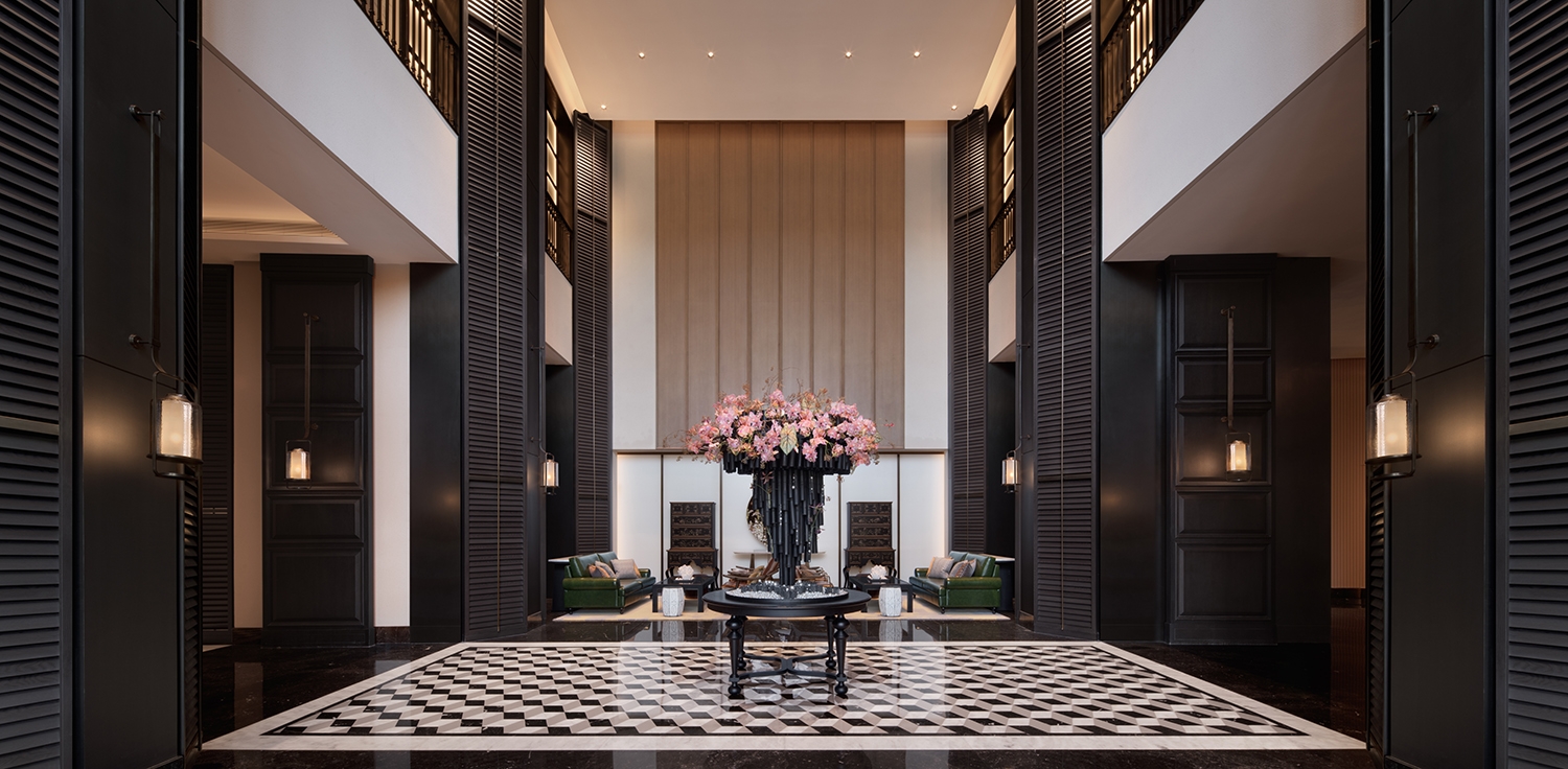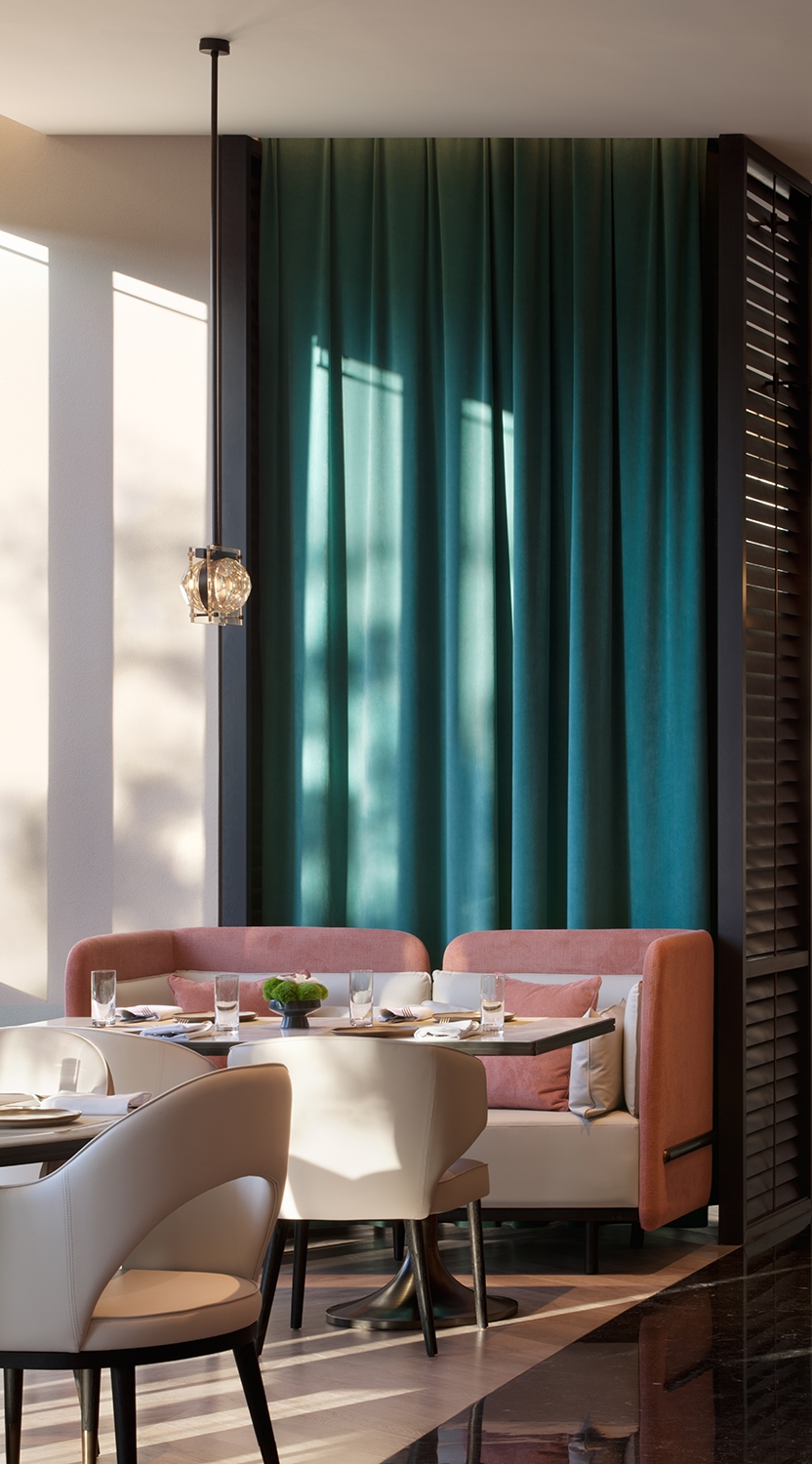 The lobby is arranged on a strict central axis, with a grand floral installation placed precisely at the visual focal point. Six pairs of towering floor-to-ceiling louvered windows stand in deliberate opposition, creating a sense of order and rich spatial layering. The So Nanyang restaurant is adorned with lush greenery and floral art. By orchestrating scenery shifts with each step, every transition within the space becomes a surprise.