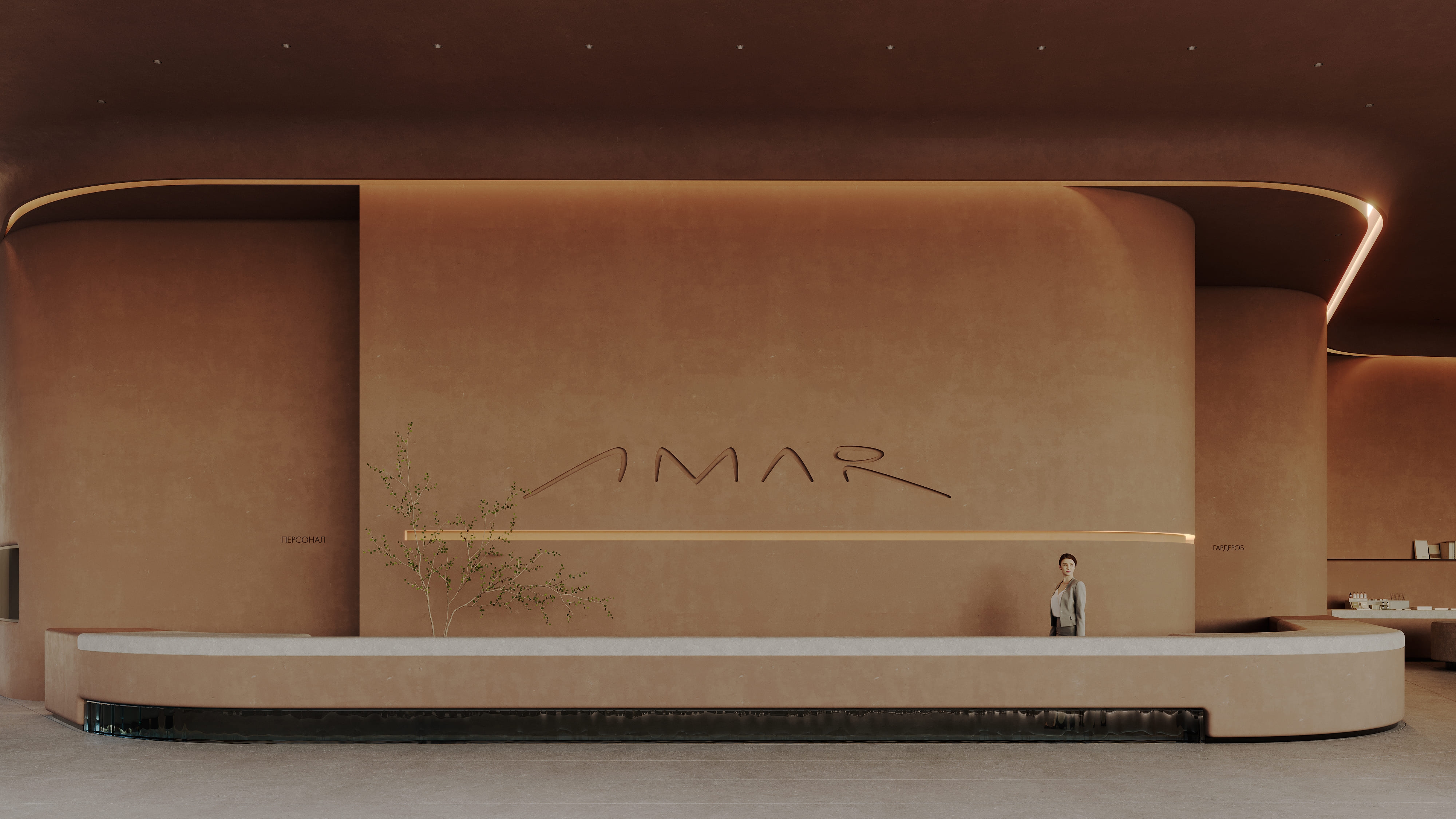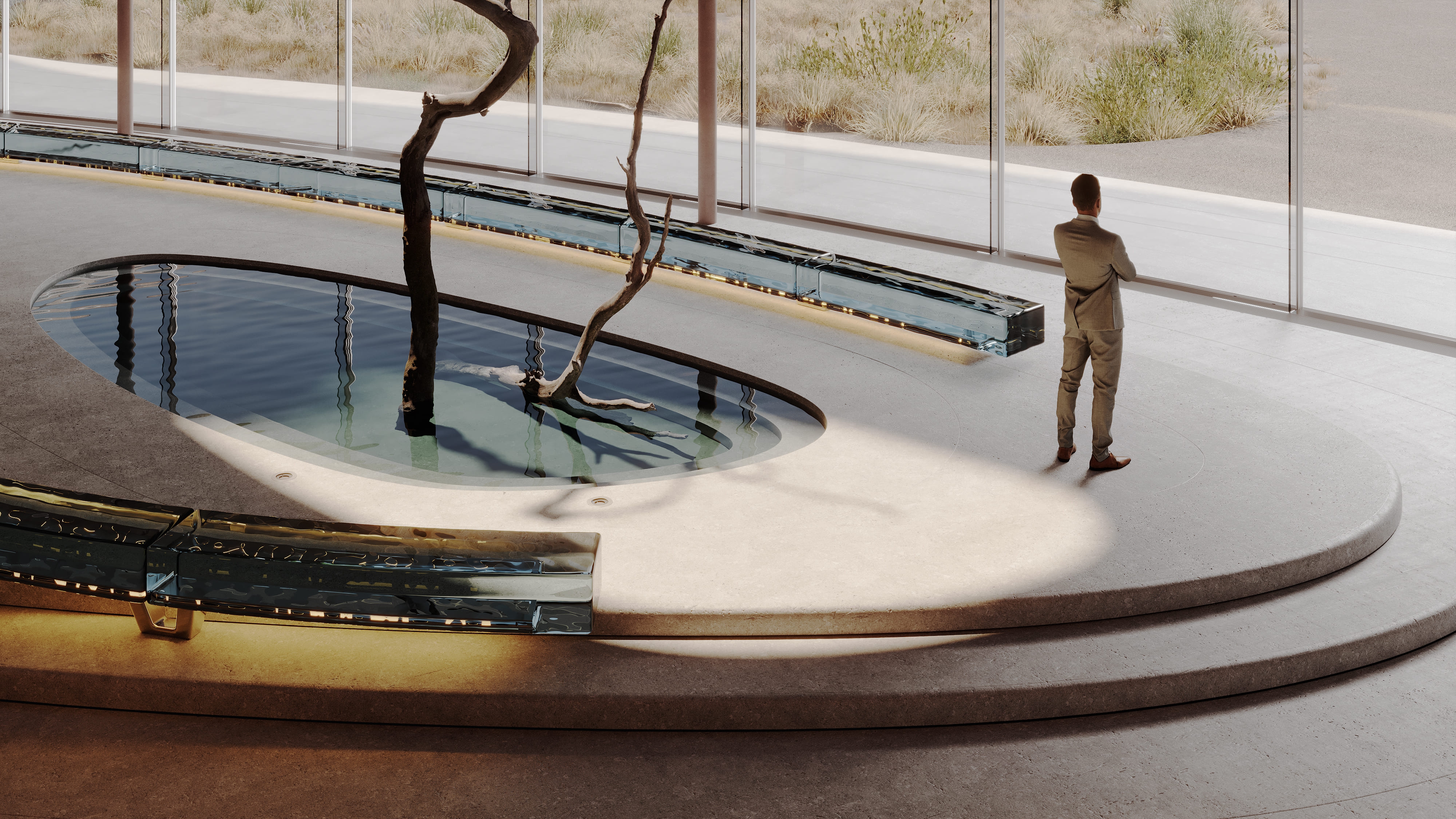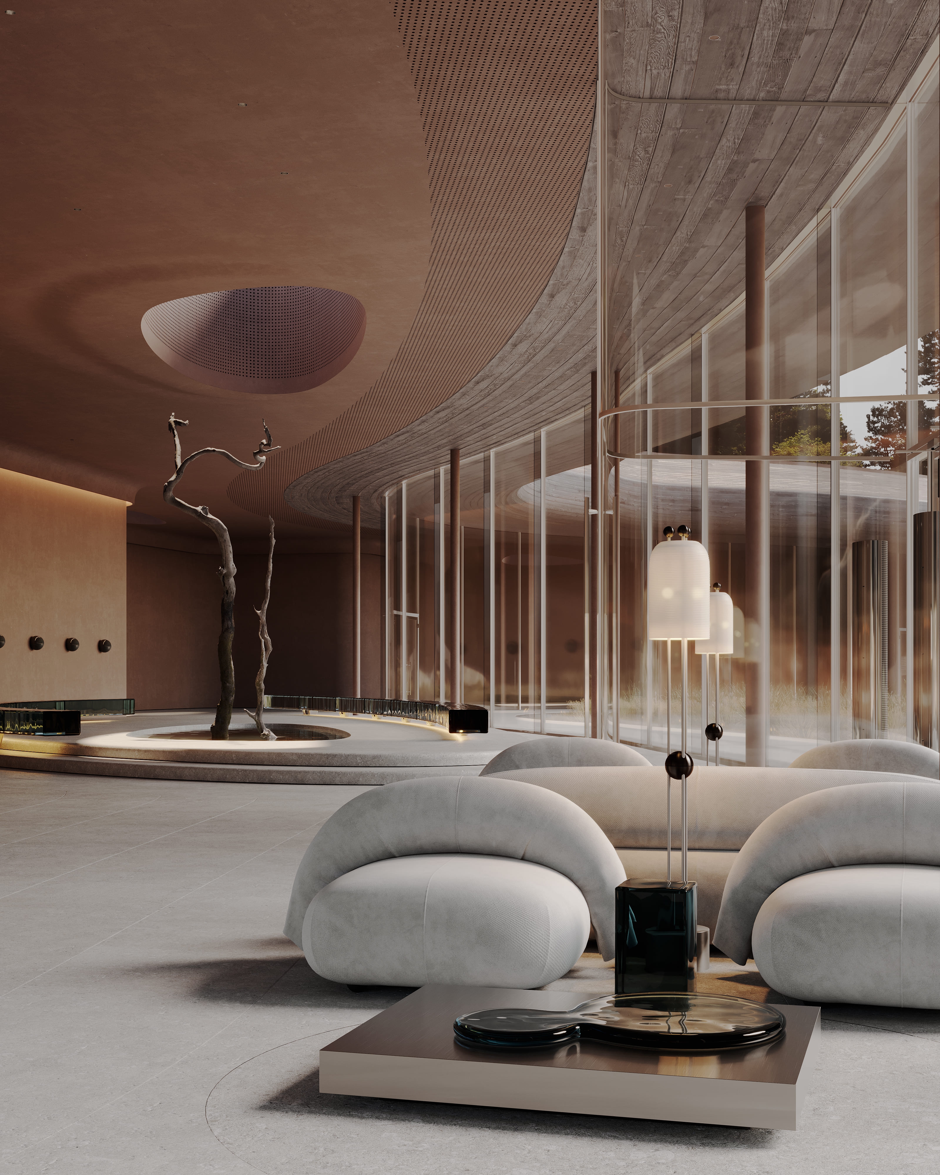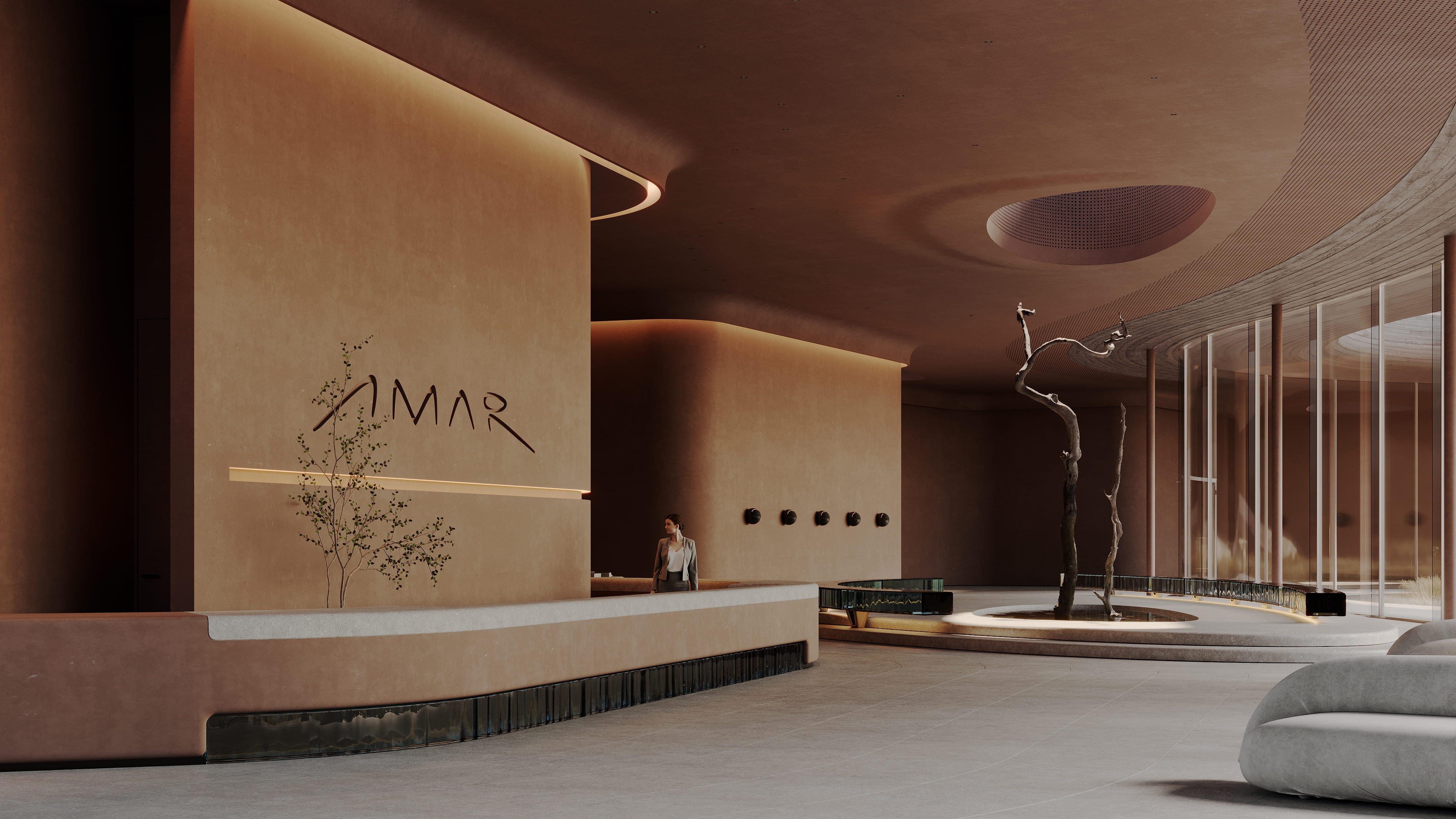 The interior of the AMAR welcome center is part of a large-scale cultural, educational, and recreational complex emerging on the shores of Lake Baikal — the deepest lake in the world. Designed by Babayants Architects, the space reflects the surrounding nature through sculptural forms and tactile materials. A central water feature with a symbolic tree, glass benches reminiscent of frozen lake surfaces, and a palette of warm sand tones and cool stone create an atmosphere of calm immersion. Inspired by trees, dunes, light, and water, the design dissolves the boundary between architecture and nature, inviting guests into a contemplative dialogue with the landscape.