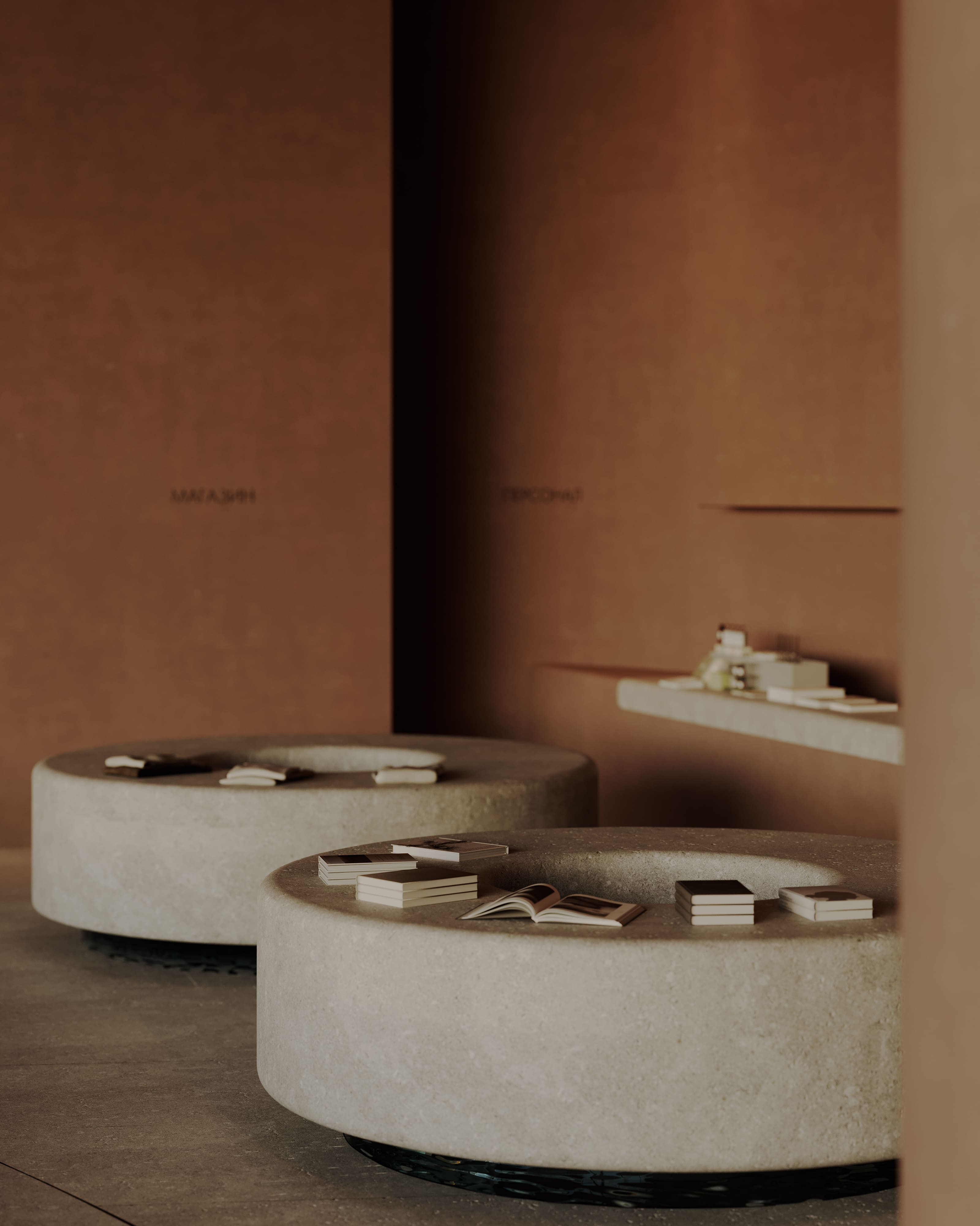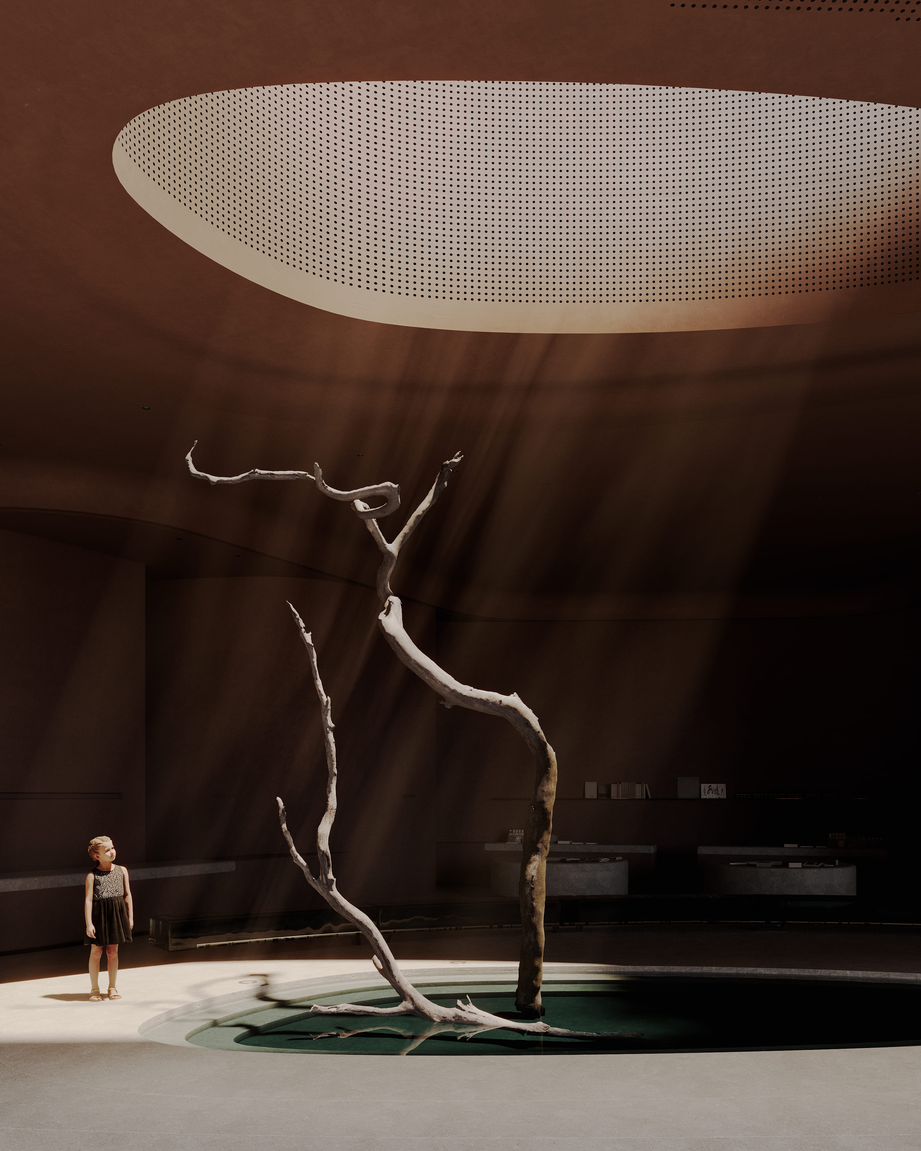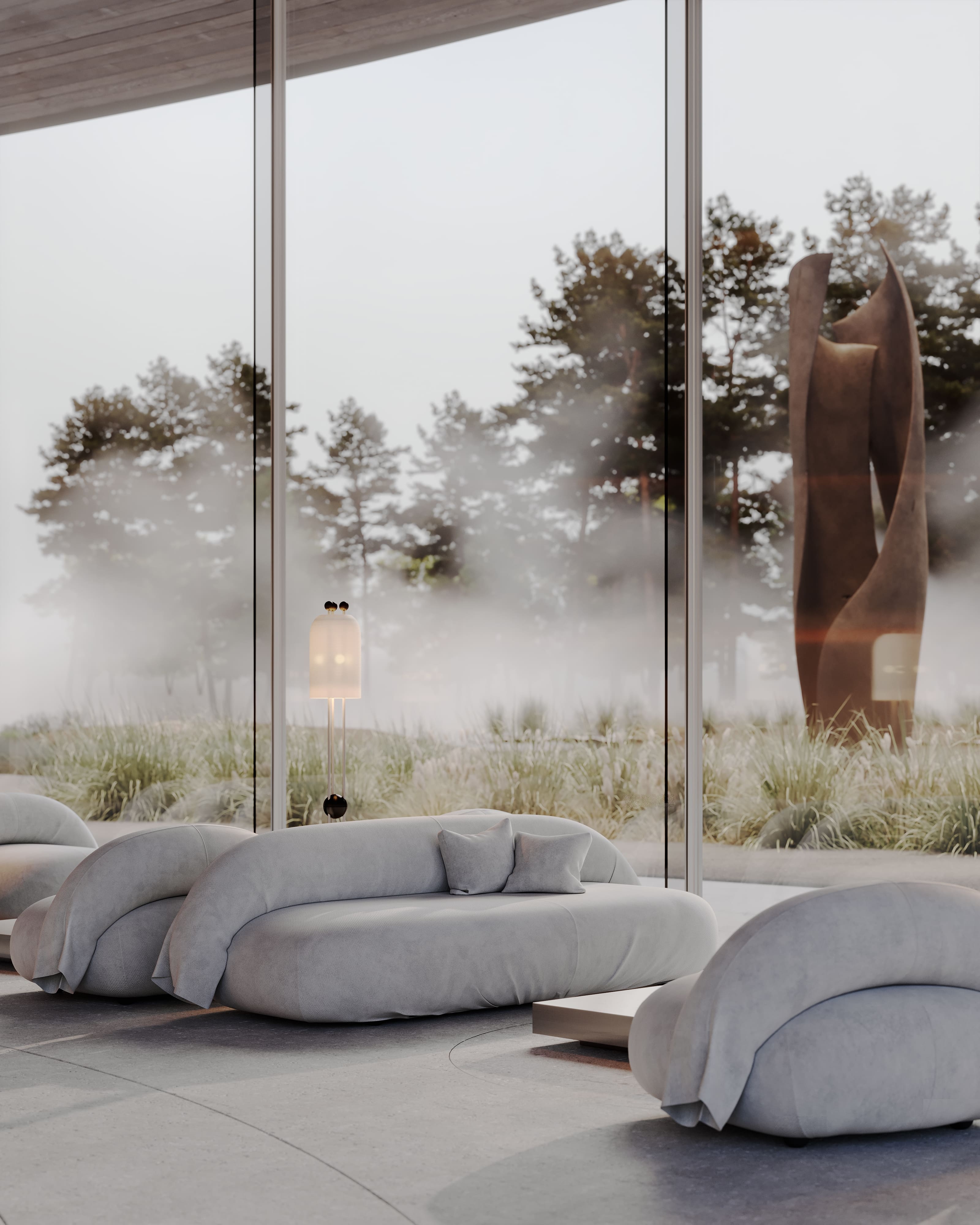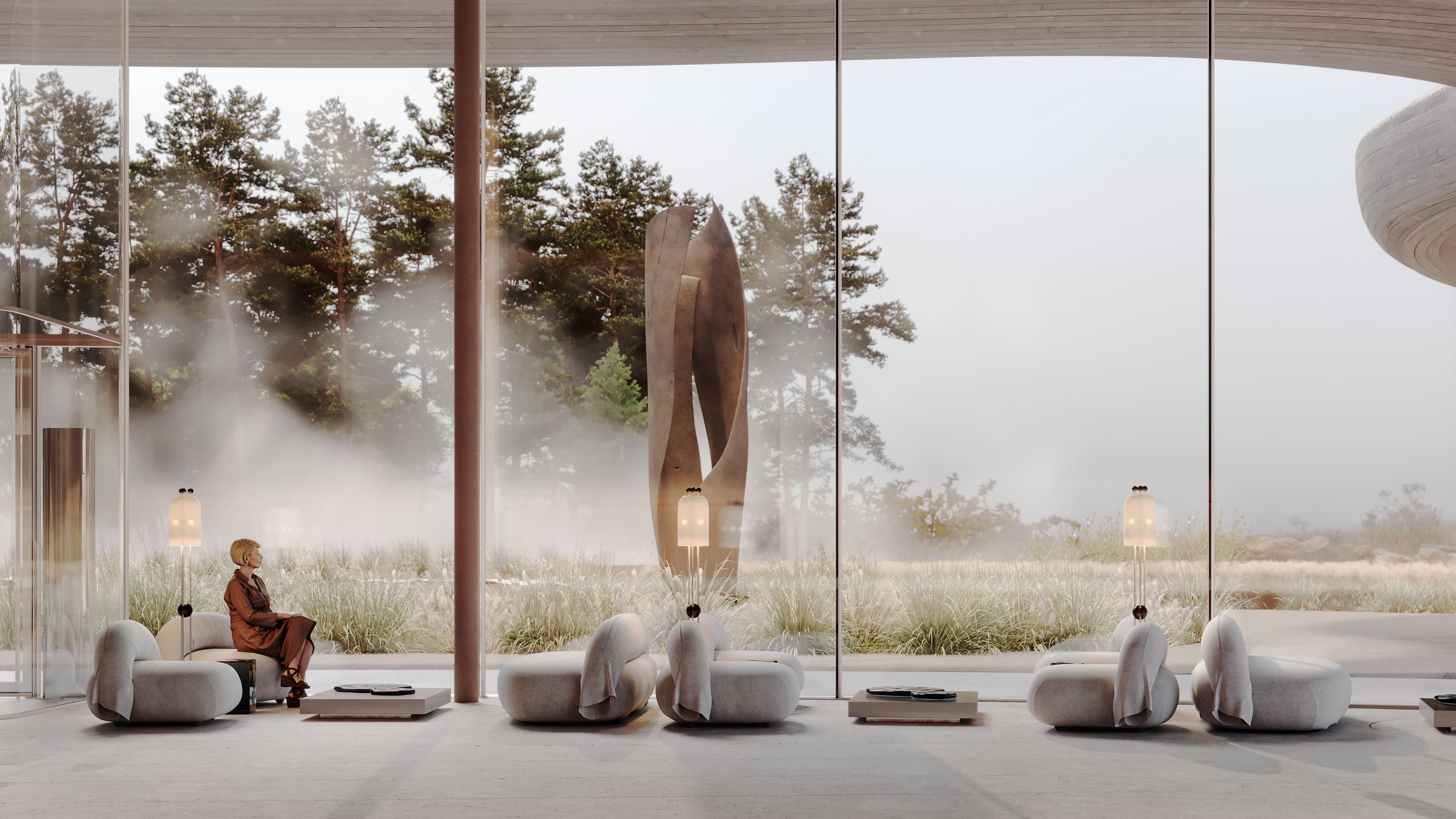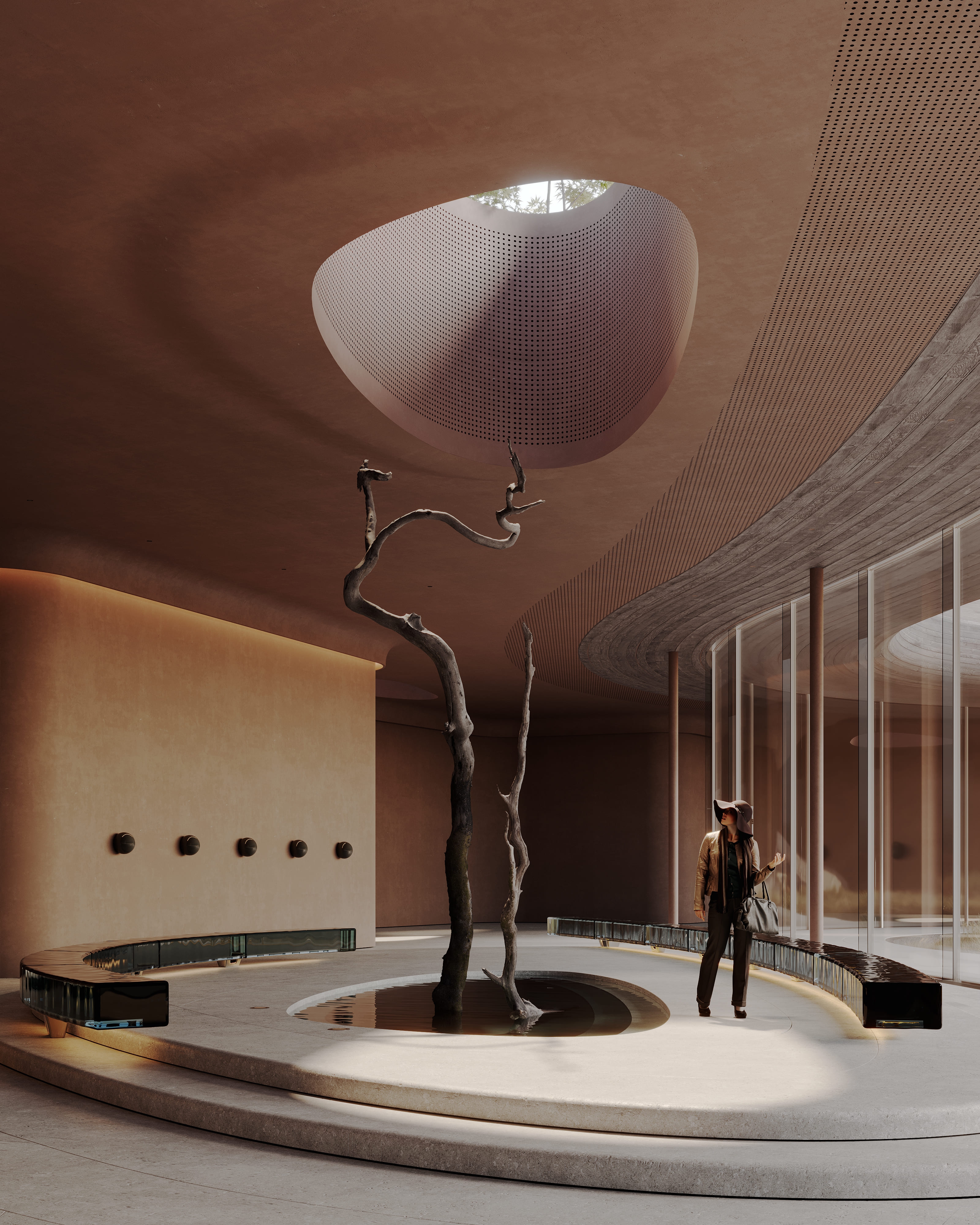 The interior of the AMAR welcome center is part of a large-scale cultural, educational, and recreational complex emerging on the shores of Lake Baikal — the deepest lake in the world. Designed by Babayants Architects, the space reflects the surrounding nature through sculptural forms and tactile materials. A central water feature with a symbolic tree, glass benches reminiscent of frozen lake surfaces, and a palette of warm sand tones and cool stone create an atmosphere of calm immersion. Inspired by trees, dunes, light, and water, the design dissolves the boundary between architecture and nature, inviting guests into a contemplative dialogue with the landscape.