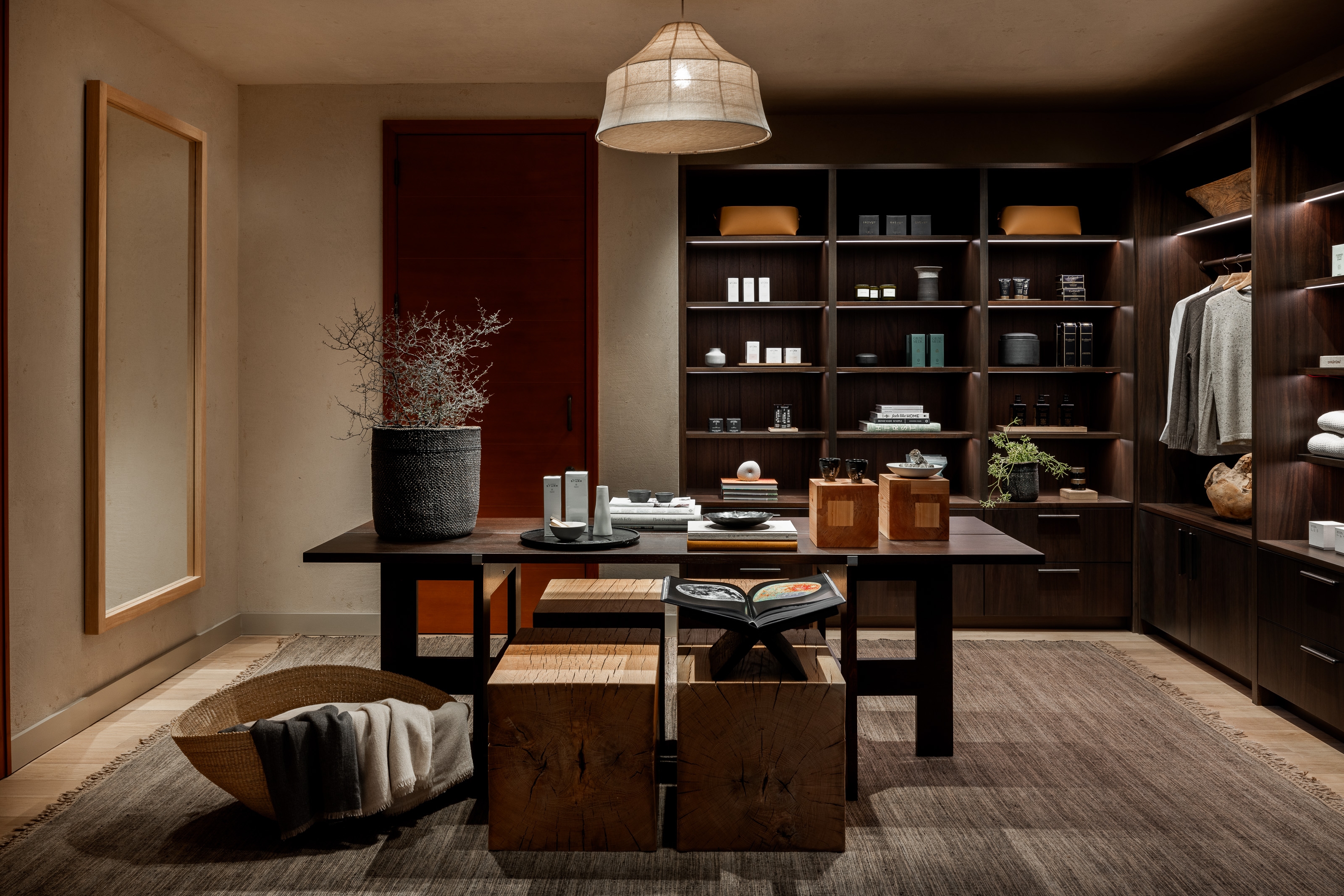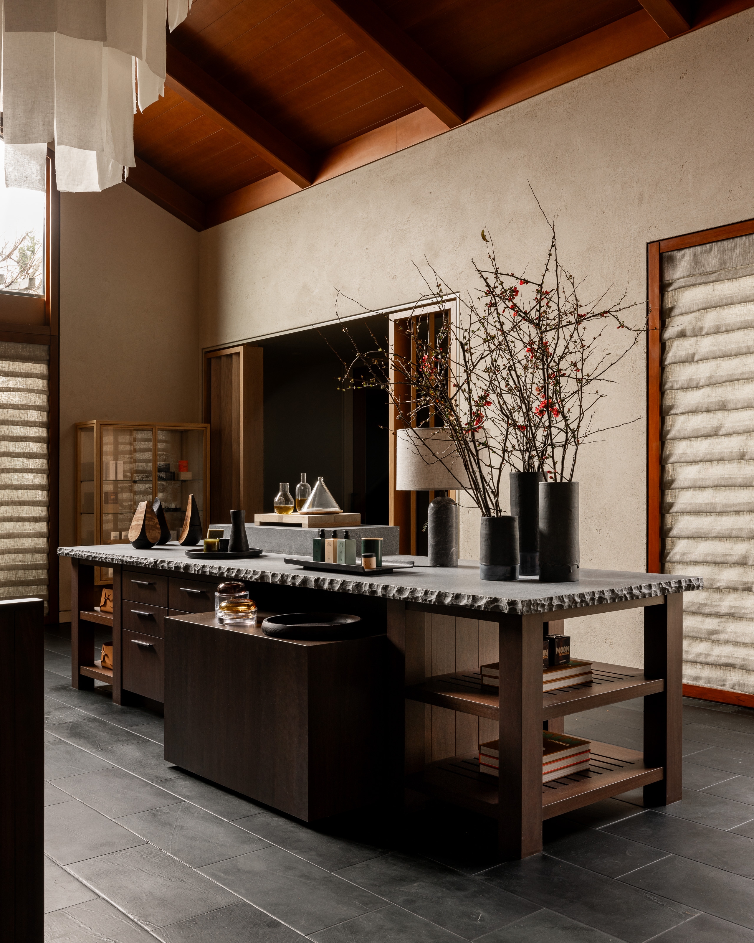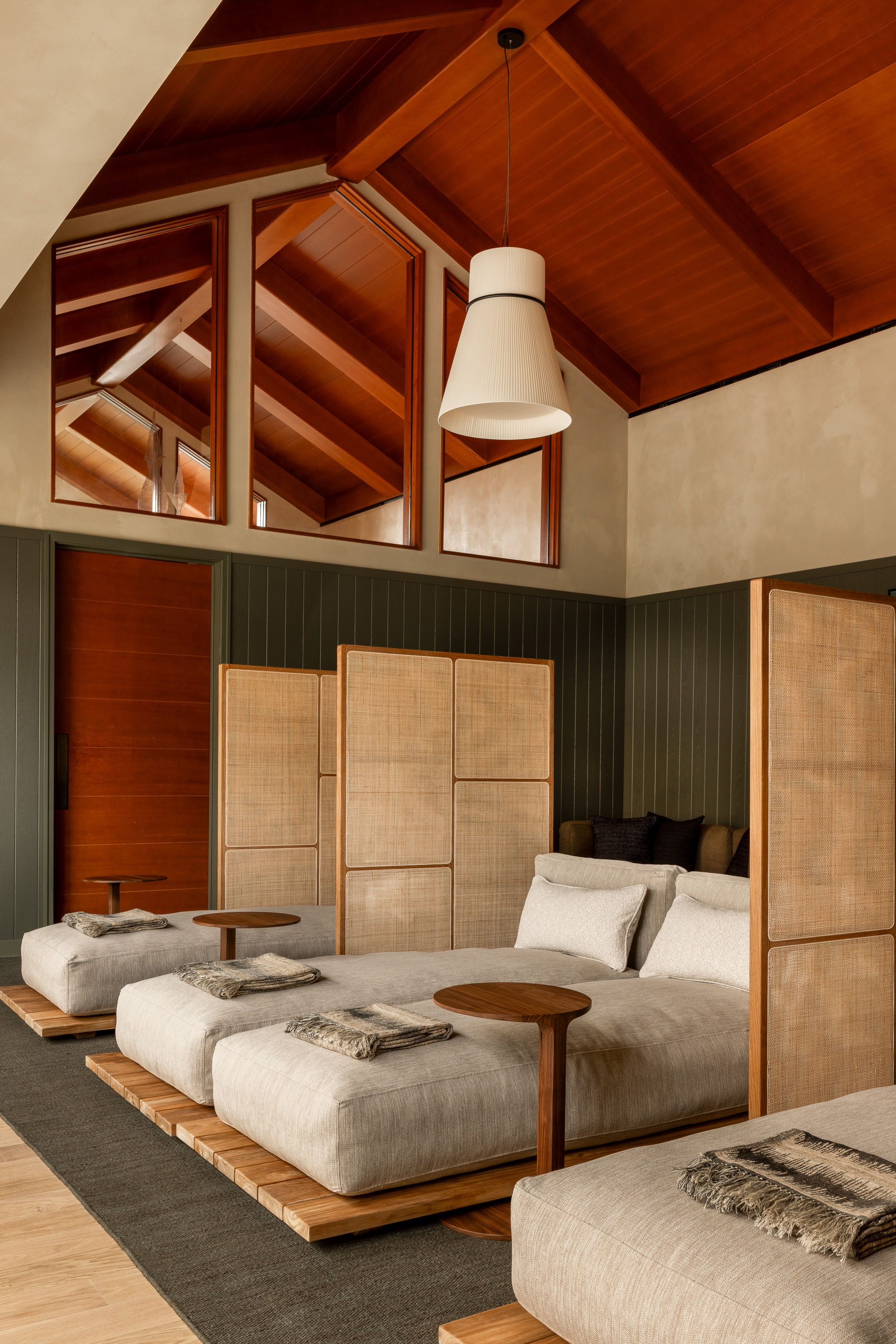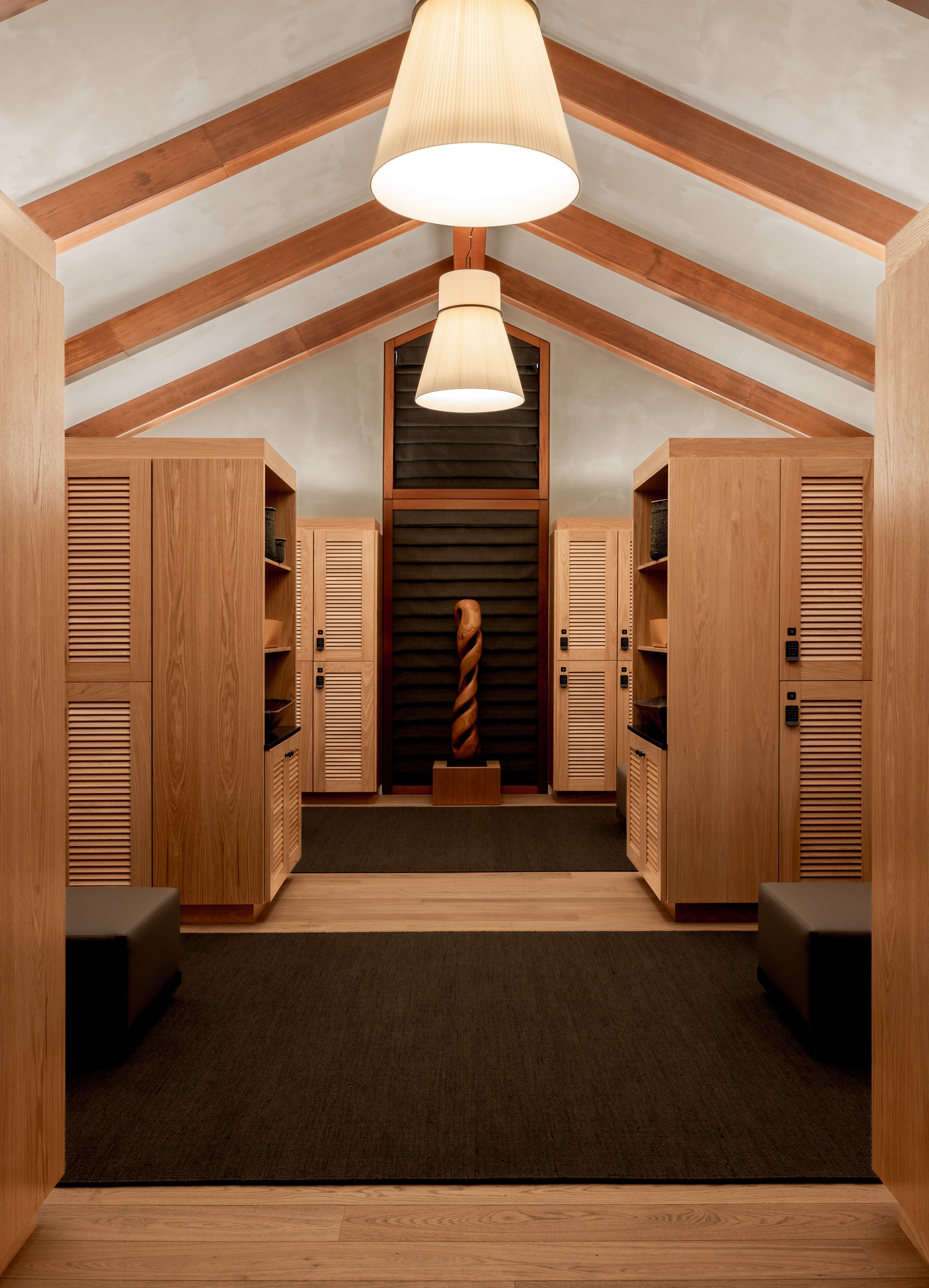 Rosewood Sand Hill’s Asaya Spa was reimagined as a serene wellness retreat nestled in the Santa Cruz Mountains. Inspired by the natural surroundings, the design incorporates rich wood, chiseled stone, woven rattan, and textured textiles to create a grounded, organic atmosphere. The refreshed reception features textured plaster, custom millwork, and a central linen pendant for warmth. Local artists were commissioned to create ceramic and sculptural works, including a terracotta tile installation inspired by atmospheric rivers and lumen prints from expired flora. The manicure/pedicure salon highlights slatted wood, shou sugi ban details, and handcrafted finishes. Locker rooms were transformed with dark basalt floors, limestone showers, a Finnish sauna, and steam room. Treatment areas feature lime wash plaster, oak floors, and concealed millwork for a calming, minimalist aesthetic. Outdoor spaces were enhanced with local flora, bold tile, and custom seating. The overall design prioritizes sustainability, artistry, and connection to place.