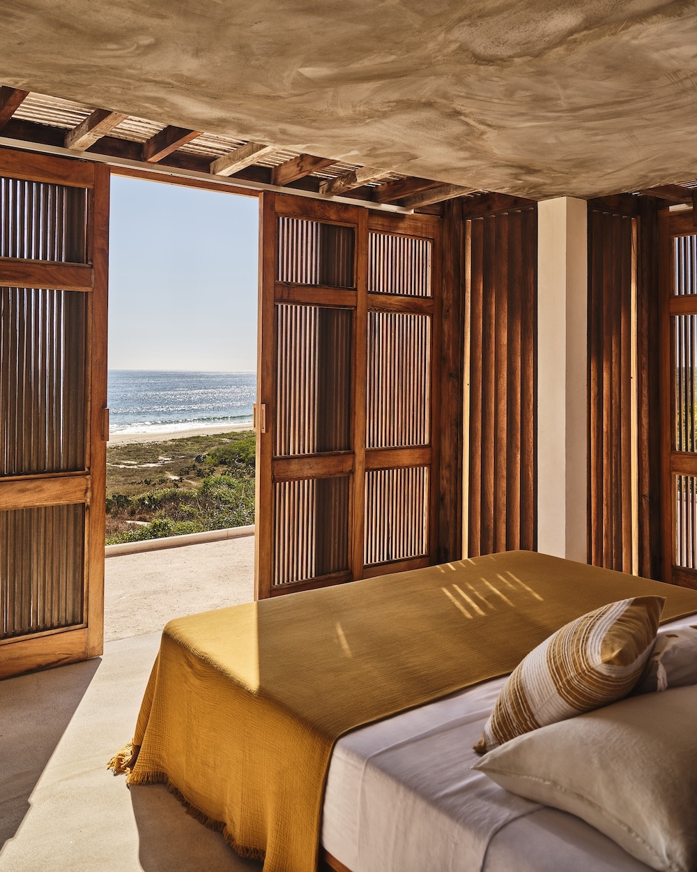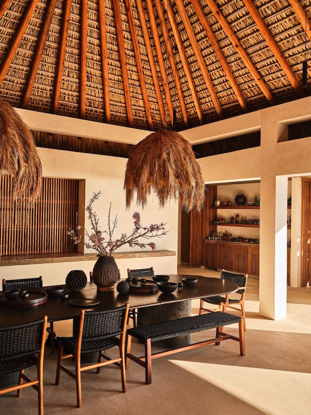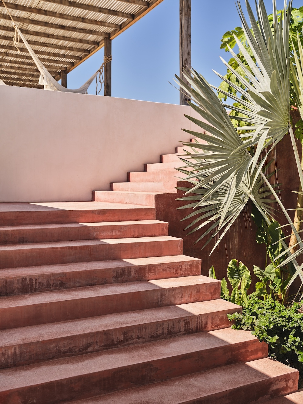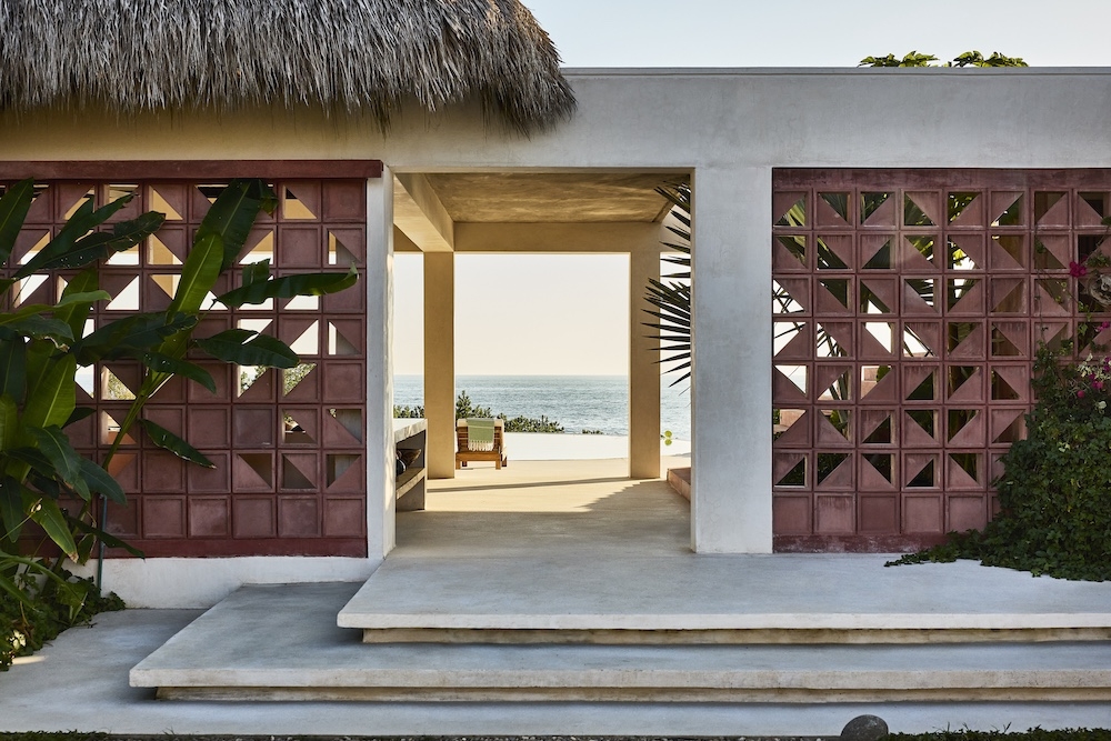 Set within the landscape of Oaxaca, this residence is an expression of heritage, friendship, and connection to the land. Rooted in principles of simplicity and reduction, the home embraces purposeful minimalism. Furnishings are paired back, emphasizing the integration of built-in elements within the architecture; while the muted, terracotta, earth-toned palette mirrors the surroundings, with white surfaces amplifying subtle shifts in light and color. Pigments drawn from local sands appear in the pool and staircase, reinforcing the relationship between home and site. Architecturally, the residence draws from two influences: the palapa structure and Mexican modernism. The palapa’s thatched form reflects tradition and craftsmanship, shaping a dialogue between old and new that carries throughout the home. Breeze blocks play a defining role, transforming the house into a sculptural composition shaped by light. The geometric patterns encourage a natural cross ventilation throughout the home, while casting shifting shadows that animate the interiors. A curated collection of locally sourced pottery, textiles, rugs, and pillows reflect longstanding relationships with Oaxacan artisans.