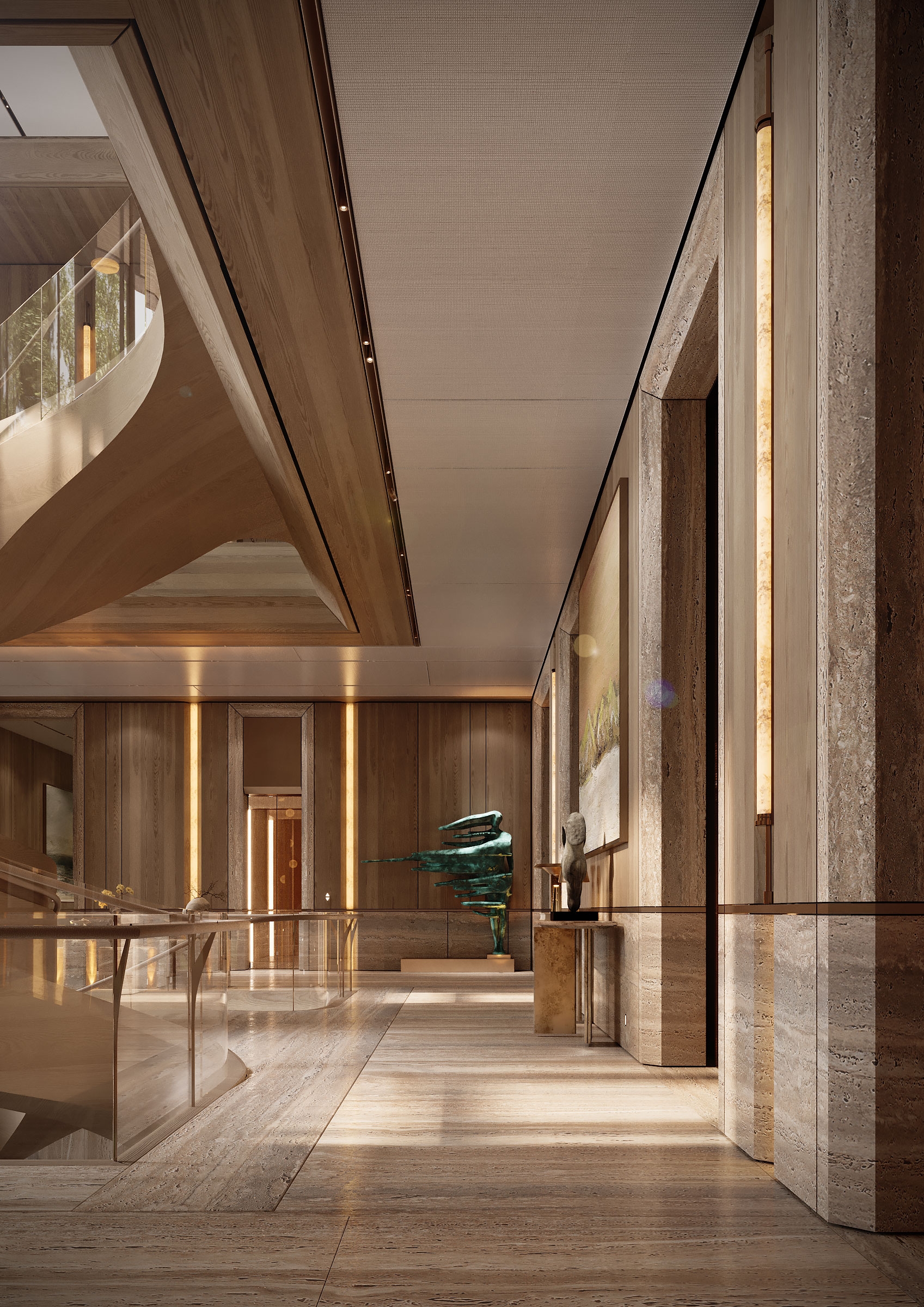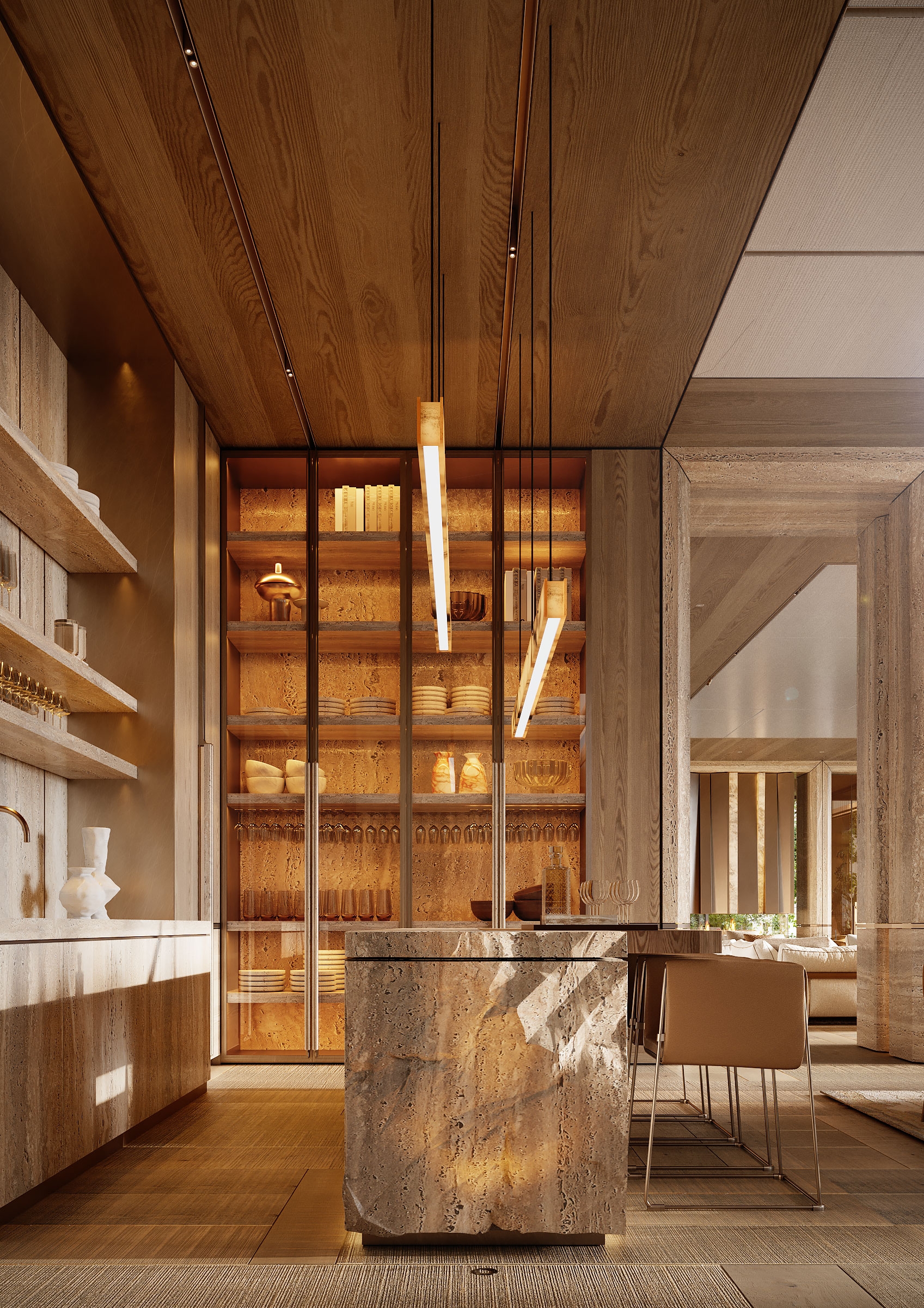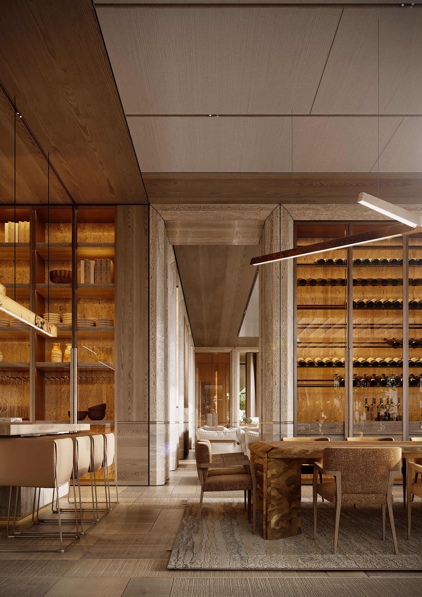 The Arbour was conceived as a serene retreat where architecture quietly blends with nature. A warm, restrained material palette sets the tone, while a sculptural staircase becomes the central symbolic gesture of the house. The layout unfolds as a calm, continuous flow of spaces. Large glass facades blur the line between indoors and outdoors, while the common areas transition naturally from one zone to another. Textures, volumes, and sightlines are arranged to maintain balance and visual clarity, with the staircase anchoring the entire composition. Light, travertine, oak, and brass work together to shape an atmosphere made for contemplation, connection, and everyday beauty. The home becomes a harmonious dialogue between nature and architecture — a serene, enduring living experience.
