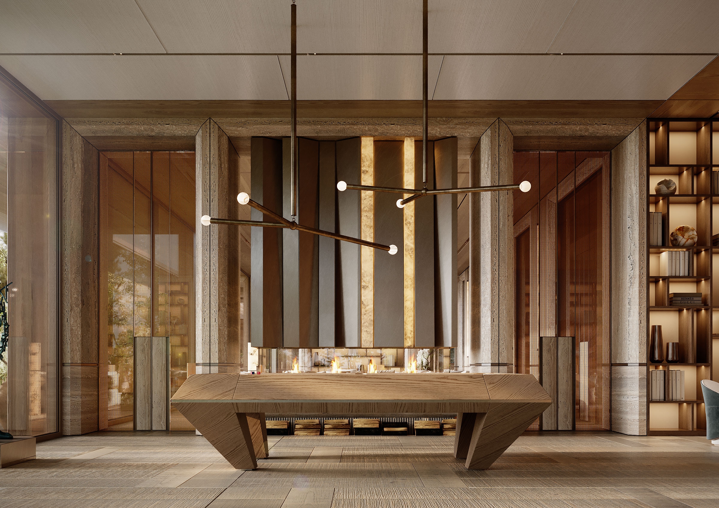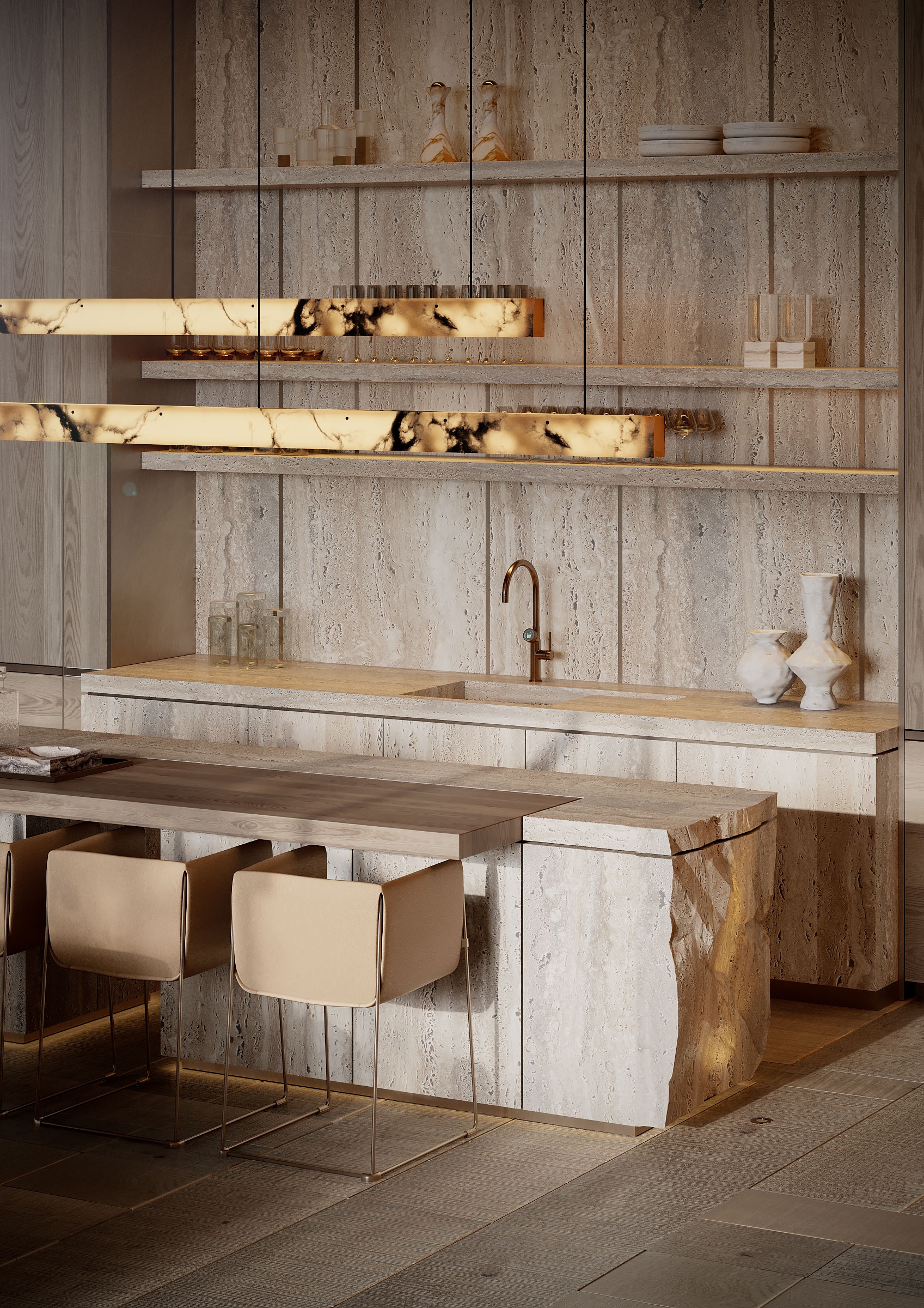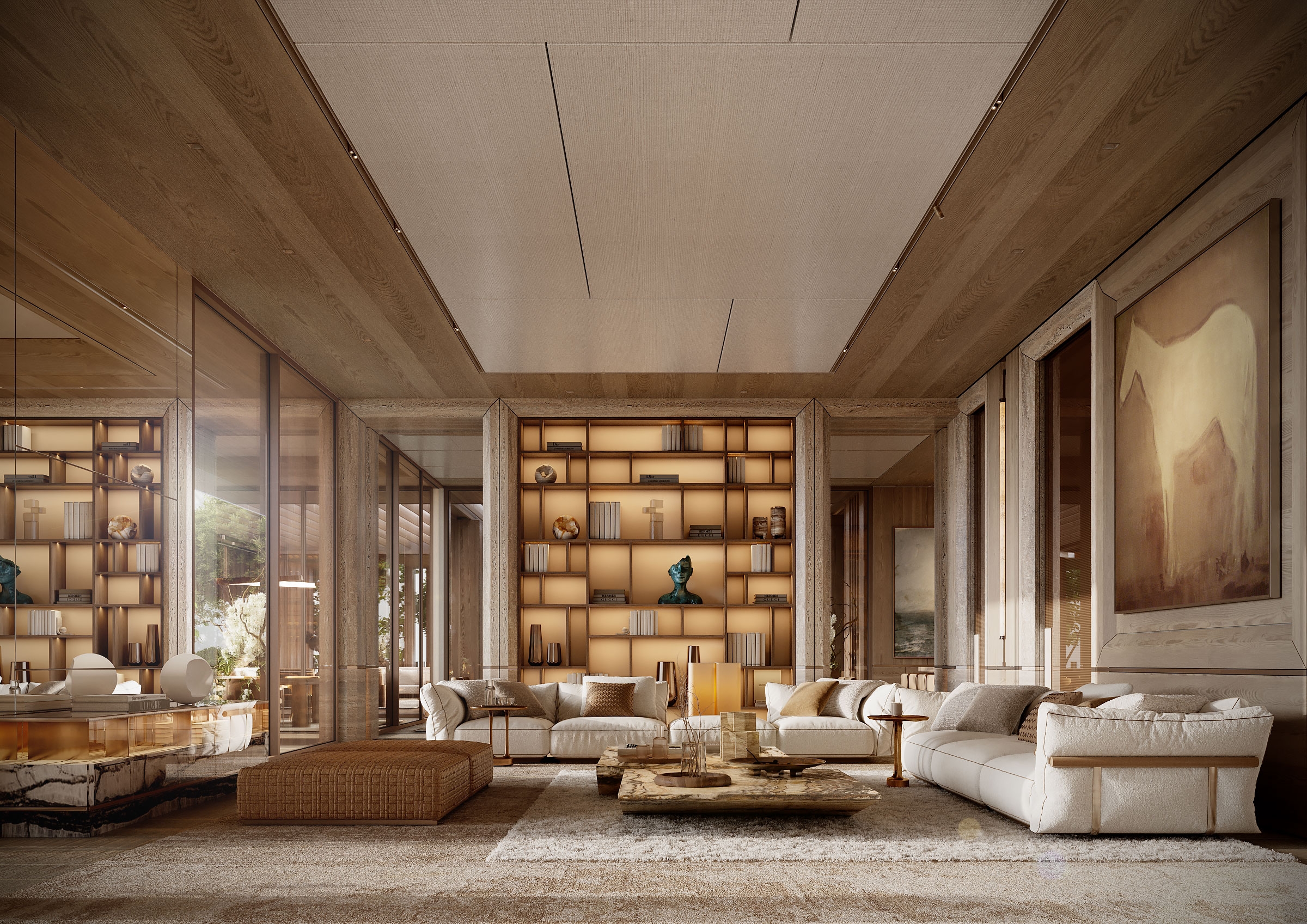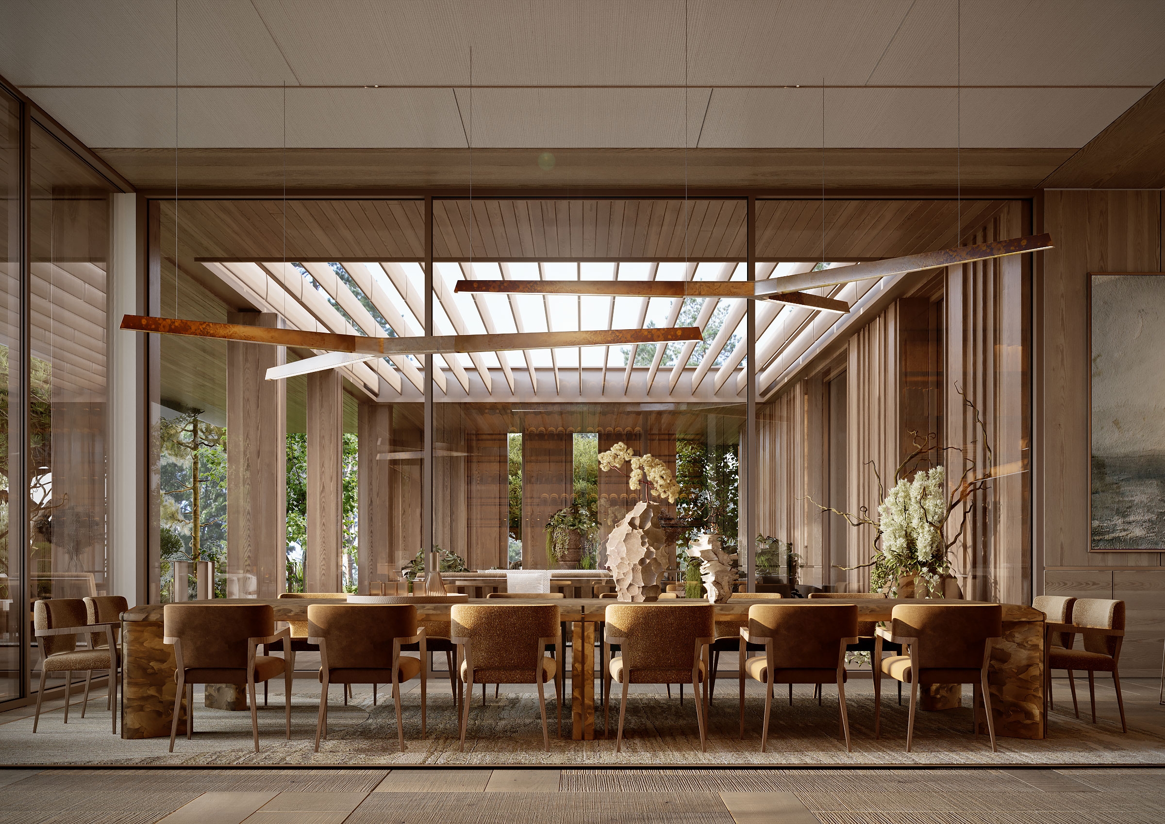 The Arbour was conceived as a serene retreat where architecture quietly blends with nature. A warm, restrained material palette sets the tone, while a sculptural staircase becomes the central symbolic gesture of the house. The layout unfolds as a calm, continuous flow of spaces. Large glass facades blur the line between indoors and outdoors, while the common areas transition naturally from one zone to another. Textures, volumes, and sightlines are arranged to maintain balance and visual clarity, with the staircase anchoring the entire composition. Light, travertine, oak, and brass work together to shape an atmosphere made for contemplation, connection, and everyday beauty. The home becomes a harmonious dialogue between nature and architecture — a serene, enduring living experience.