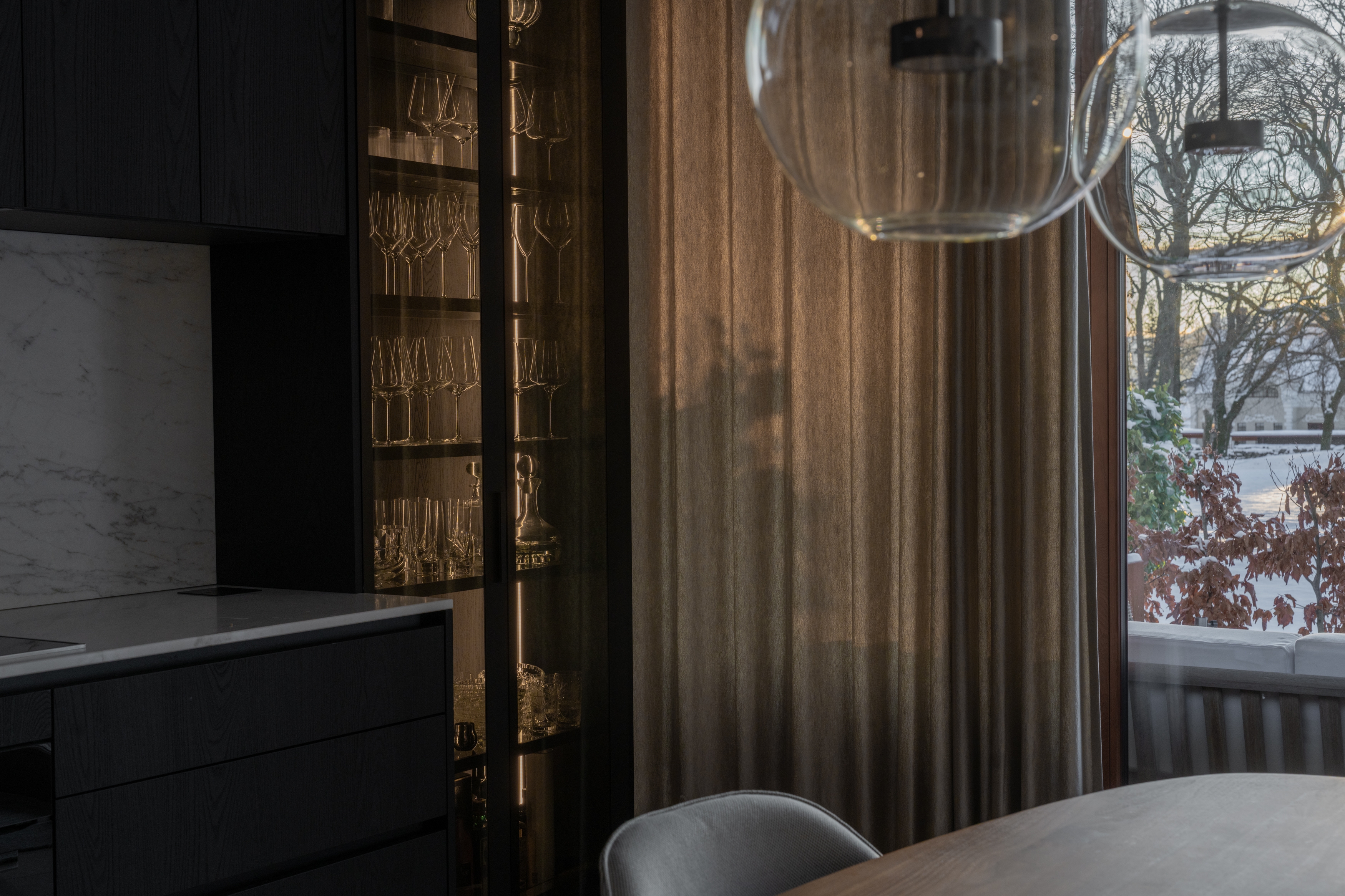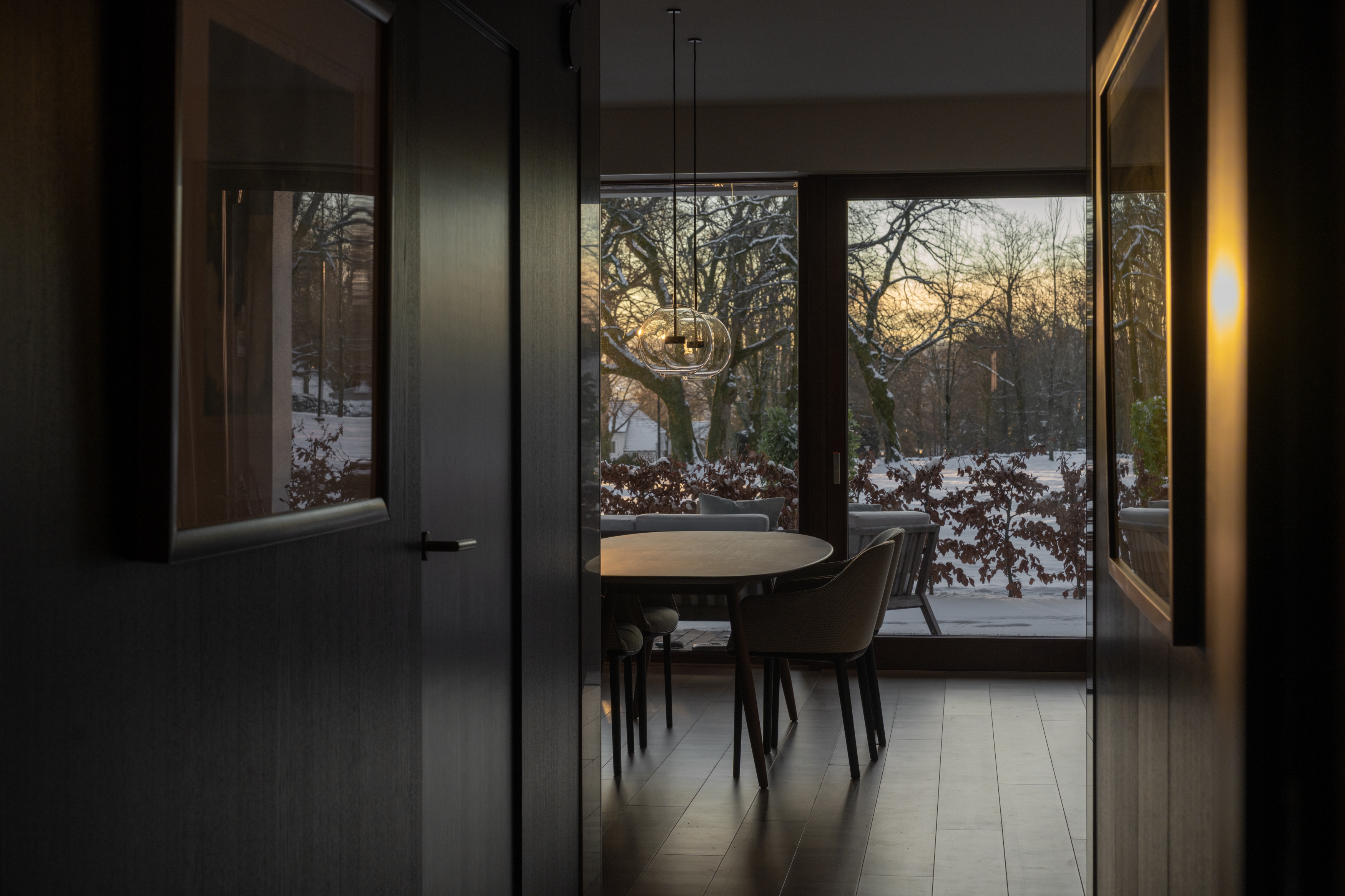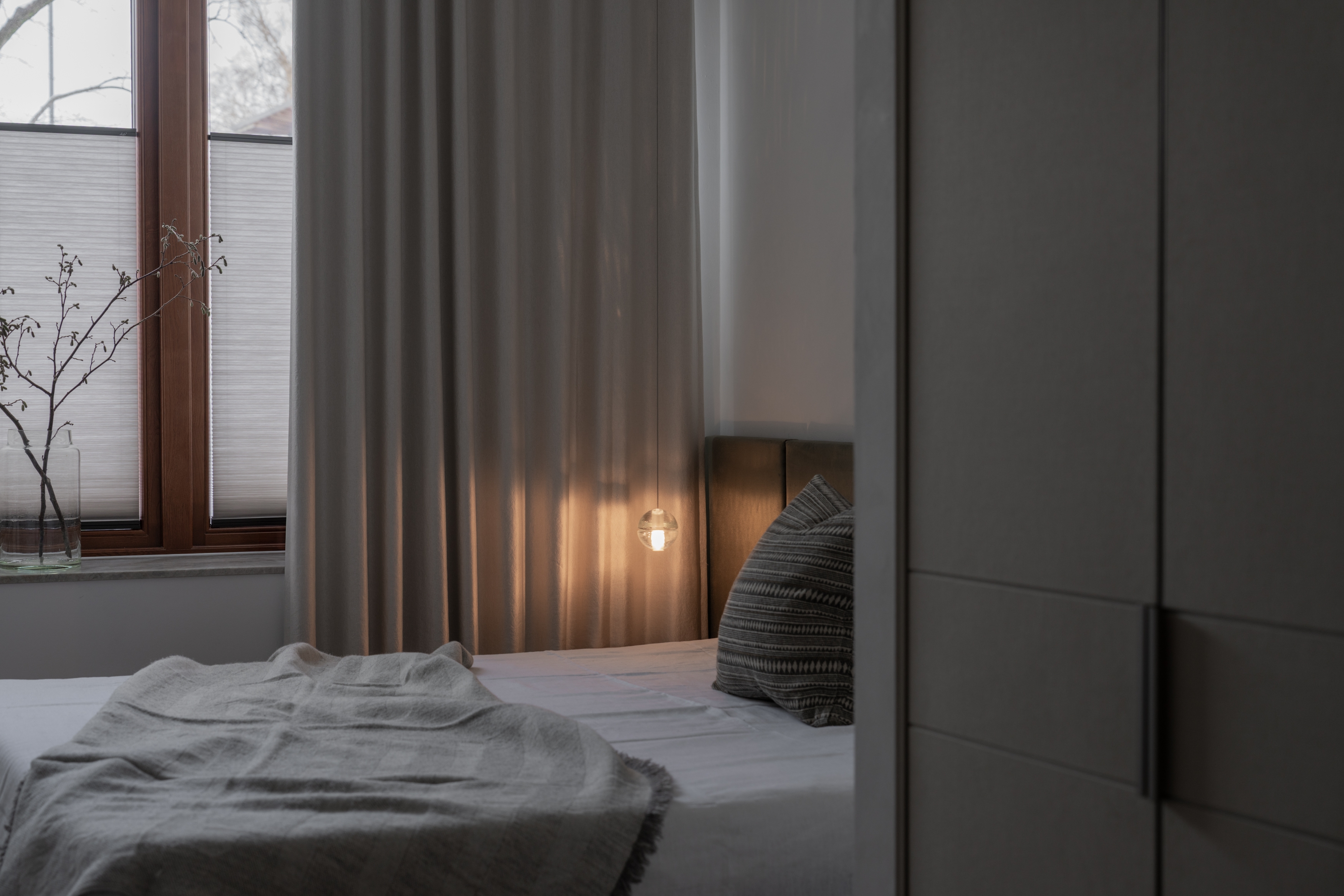 The apartment is located in a historic building with direct access to a park, formerly housing the Norwegian School of Canning. The renovation respects the building’s history while introducing contemporary comfort, allowing traditional craftsmanship and modern living to coexist.
