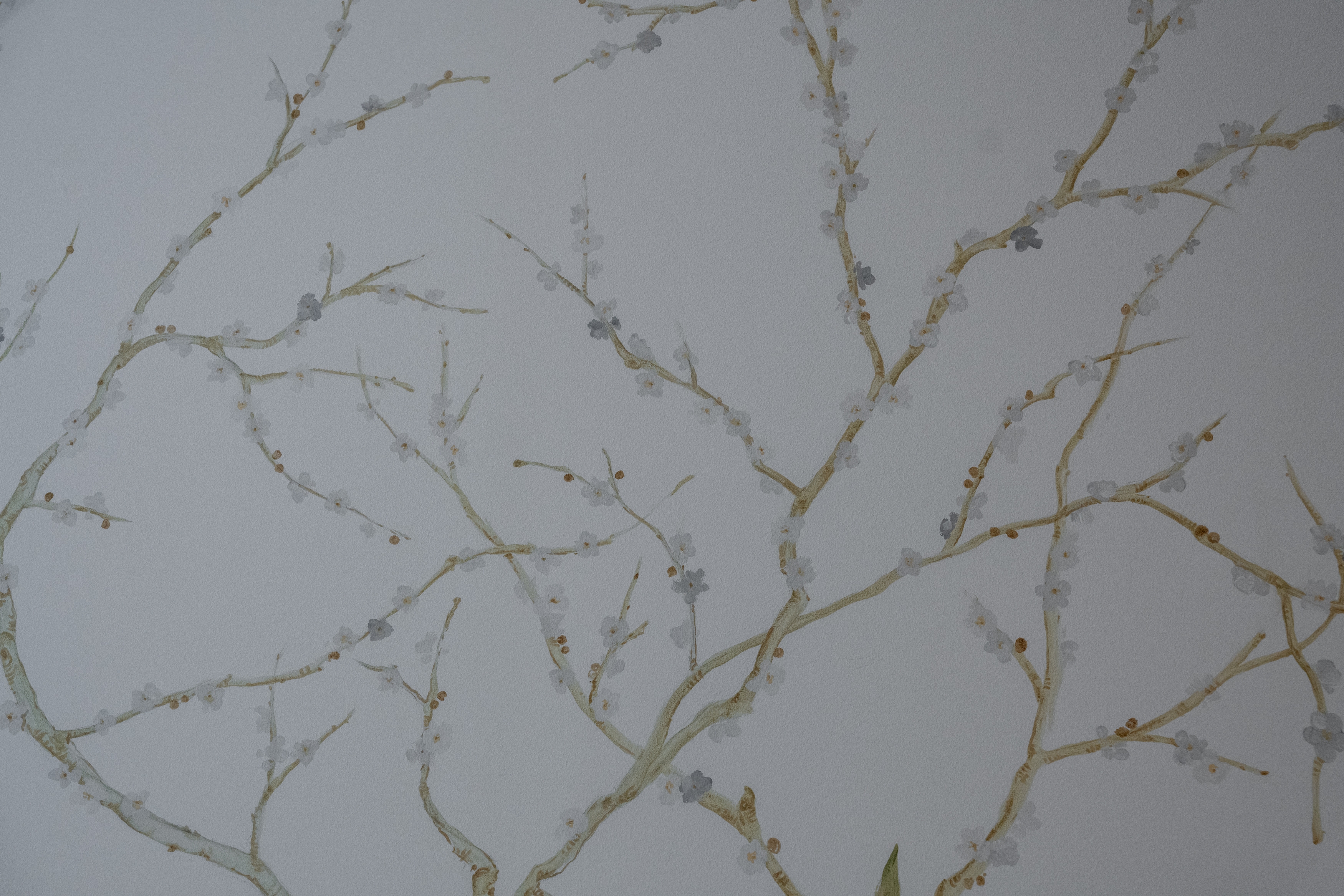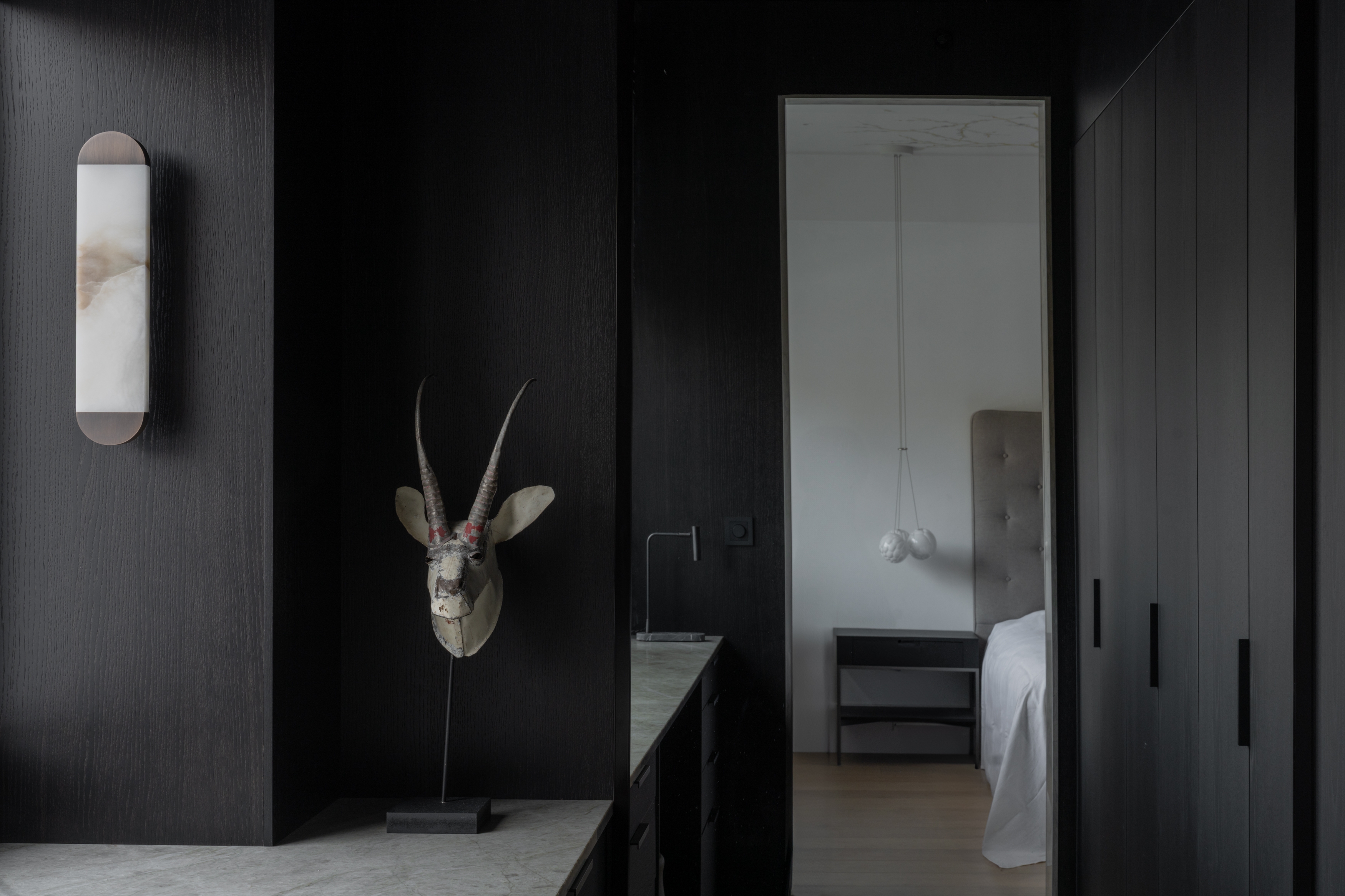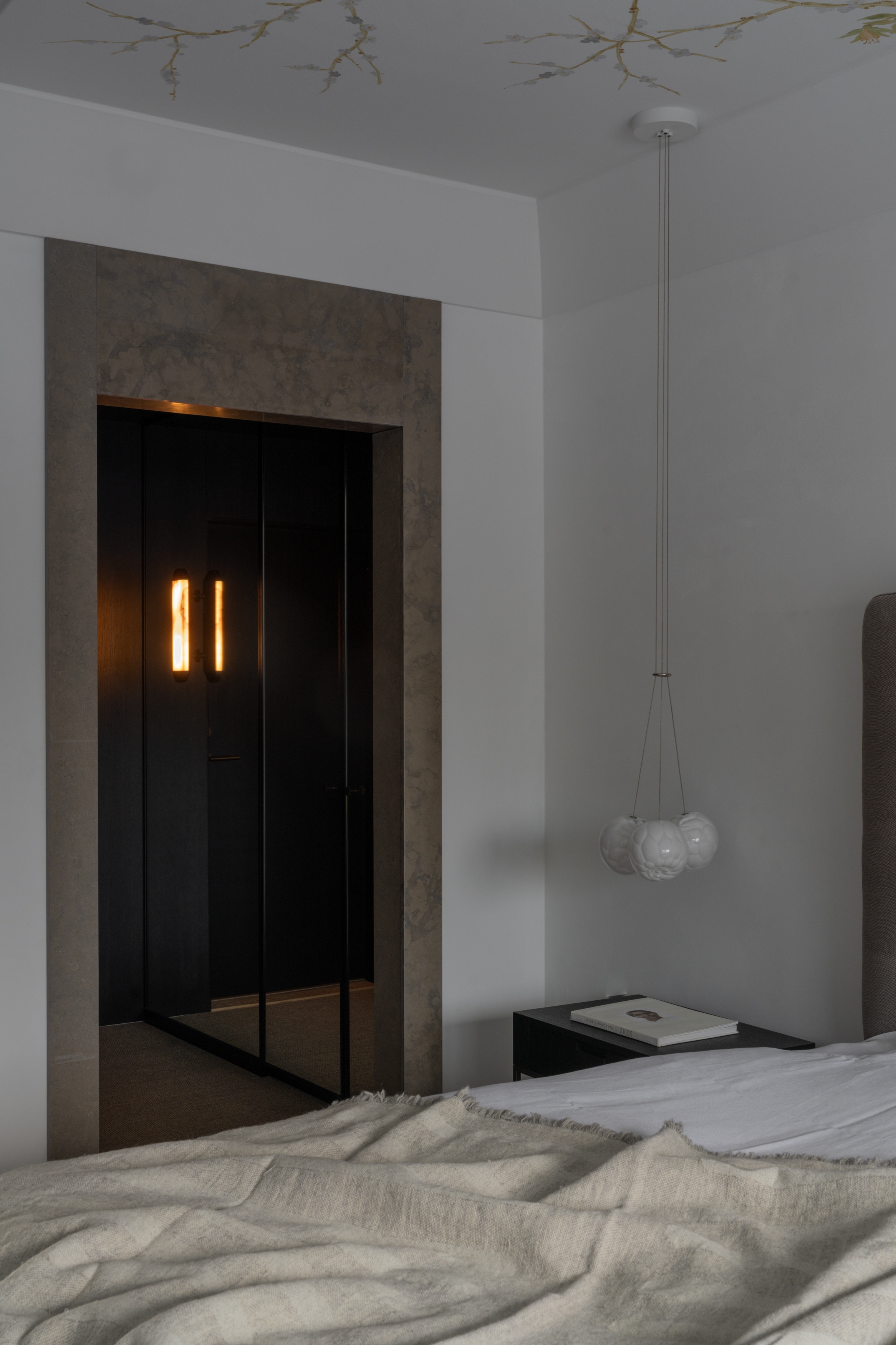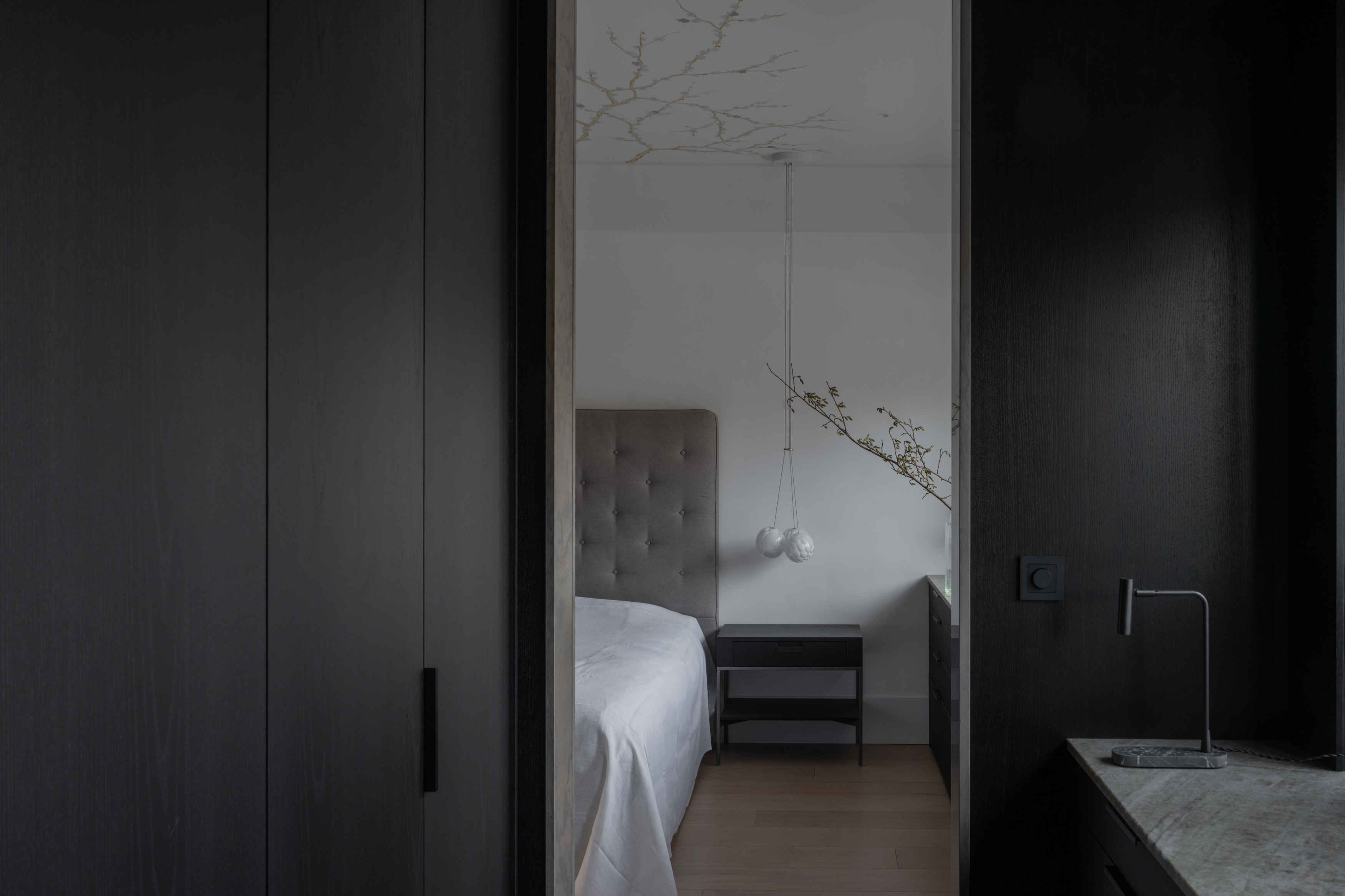 Within 125 square meters, the layout is carefully optimized. An open kitchen and living area forms the social core, while the private spaces offer calm and retreat. Custom-designed ceiling moldings frame the main rooms and continue into the master bedroom, where they transition into a hand-painted floral ceiling. This light expression contrasts with the darker, wood-clad wardrobe rooms, creating depth and intimacy.