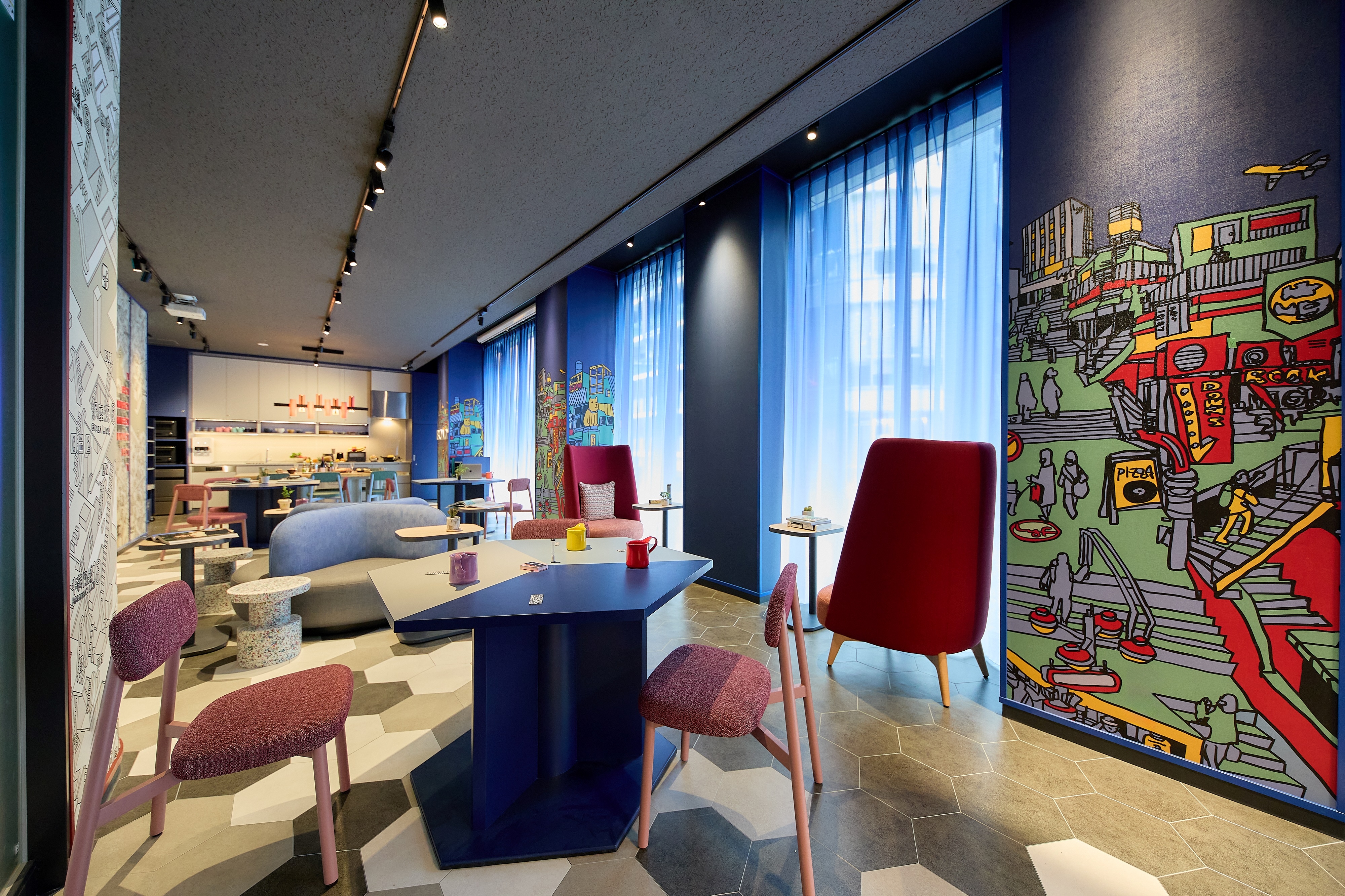 Interiors include modular furniture, graphic walls, and flexible communal zones for socializing, co-working, or relaxing. Materials like brushed metal, raw concrete, and warm timber evoke urban grit and creative warmth. Lighting plays a key role, with ambient systems that shift throughout the day, echoing the rhythm of the city.
