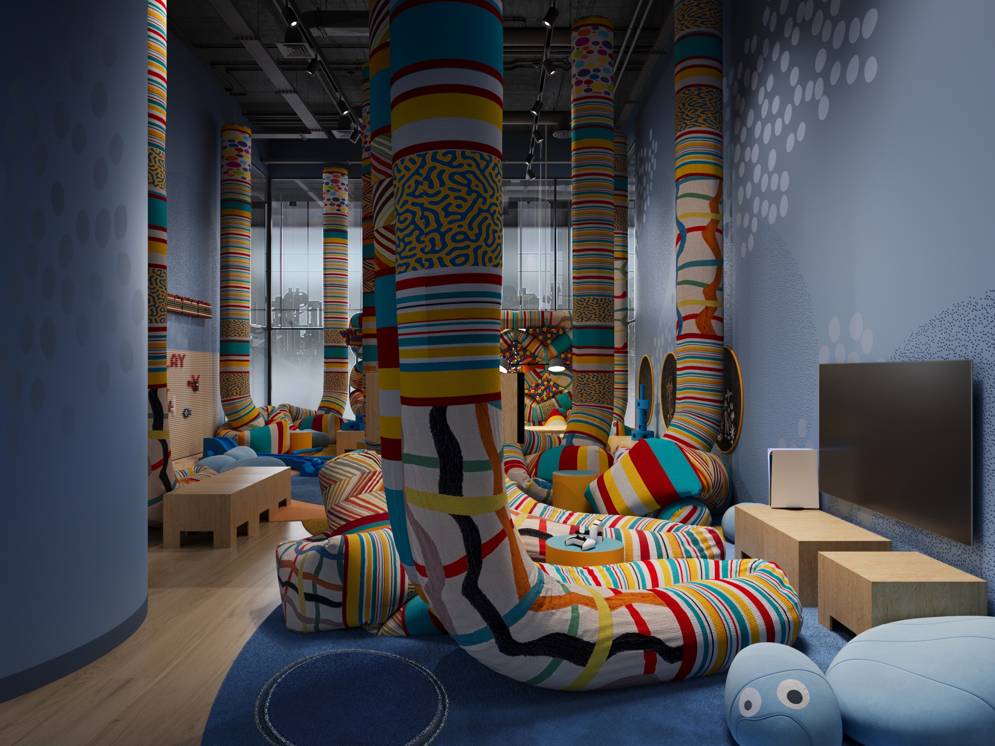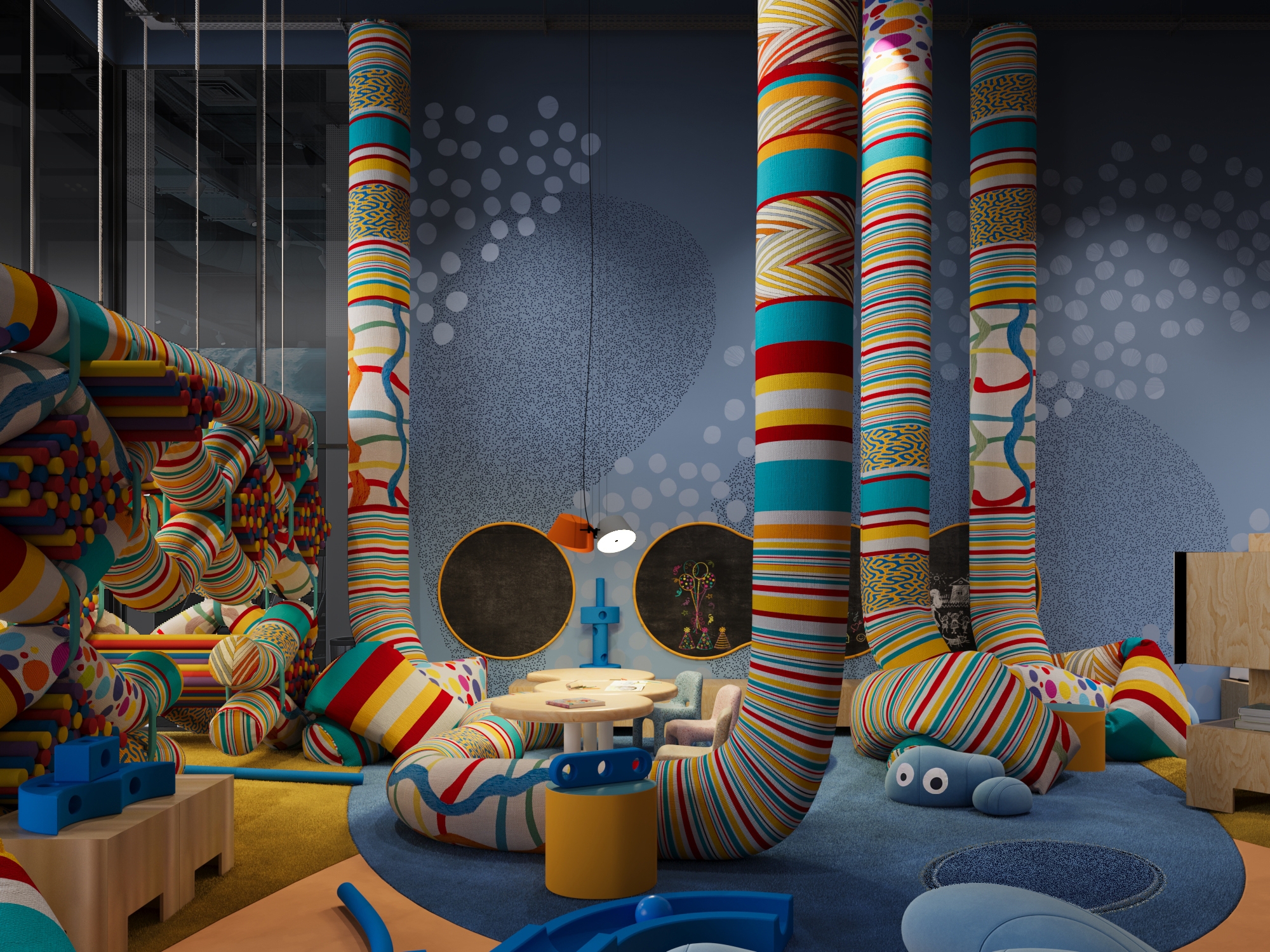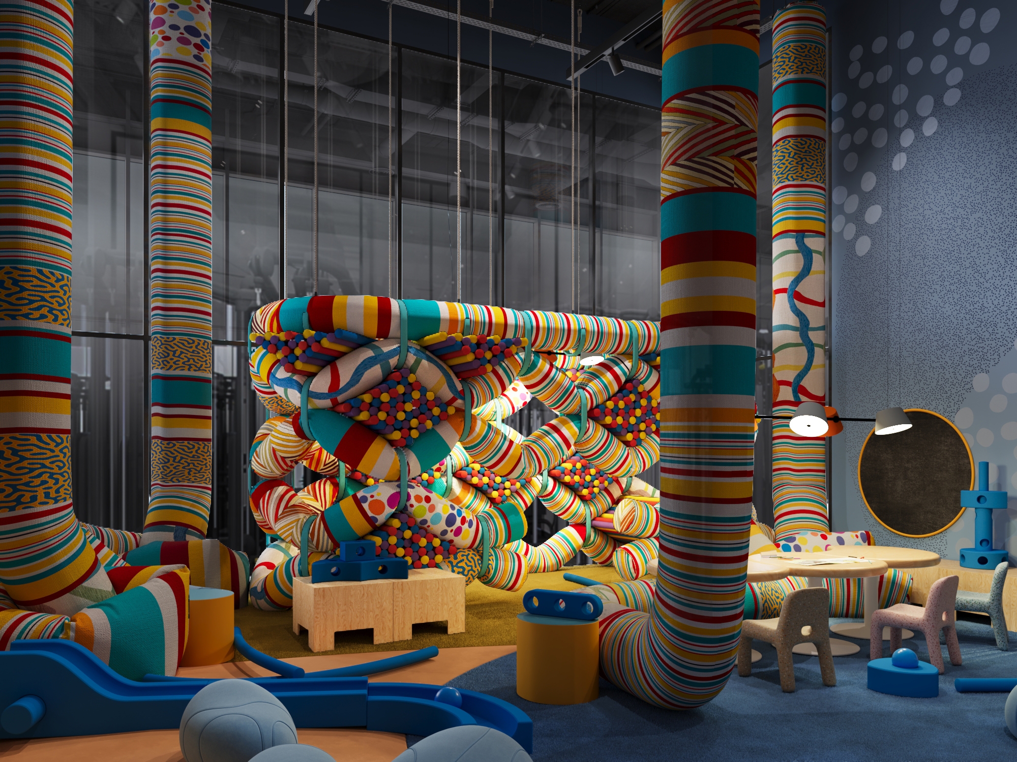 The concept redefines the idea of a children’s playroom by shifting from static equipment to dynamic. Soft suspended tubes and modular foam blocks act as creative tools and building materials, empowering children to construct and invent their own furniture and micro-spaces. This approach fosters independent thinking, teamwork, and sensory exploration while ensuring complete safety.
