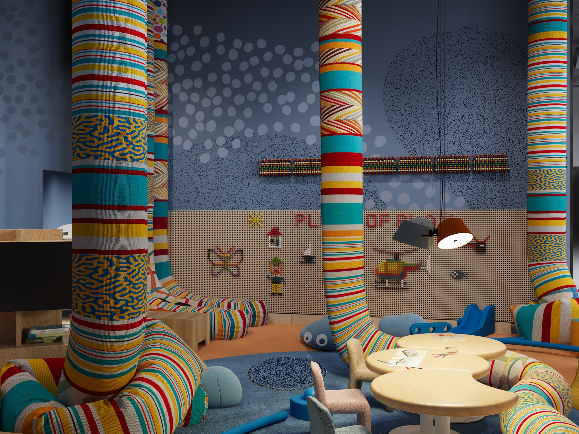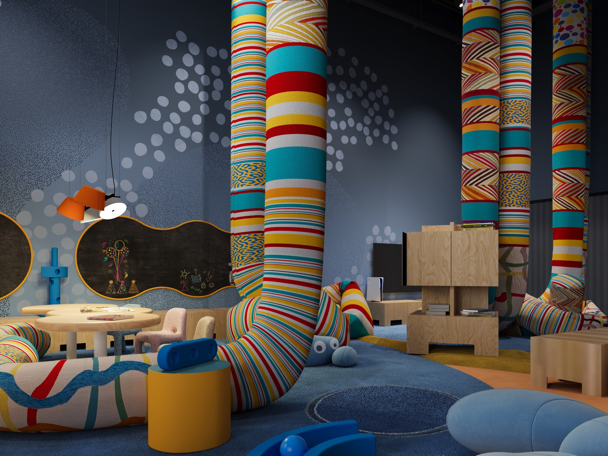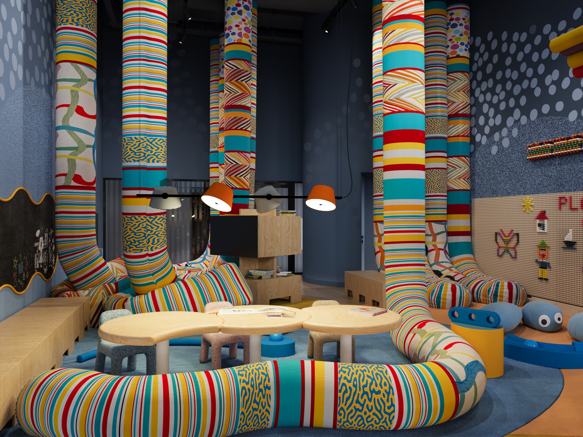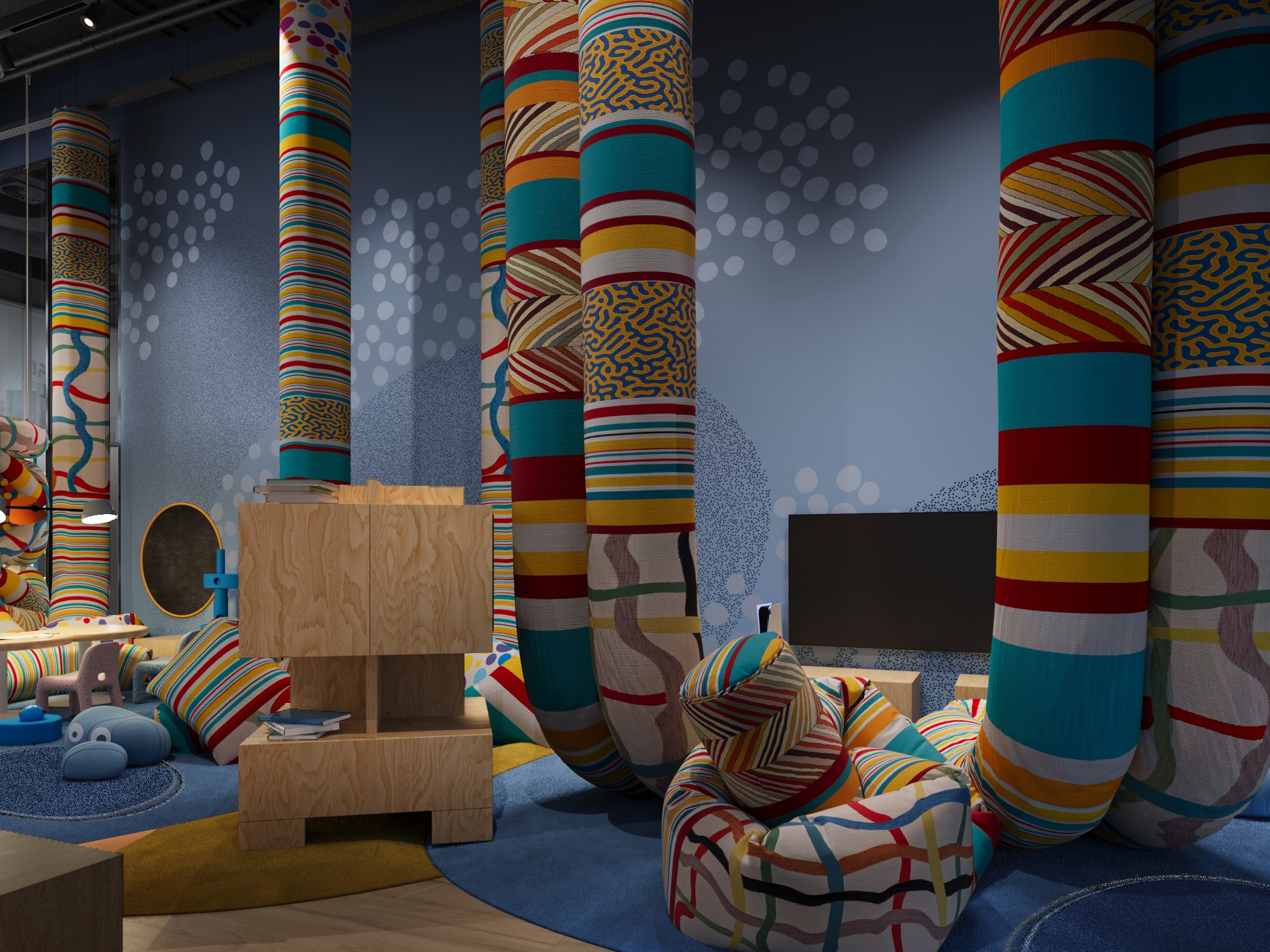 The concept redefines the idea of a children’s playroom by shifting from static equipment to dynamic. Soft suspended tubes and modular foam blocks act as creative tools and building materials, empowering children to construct and invent their own furniture and micro-spaces. This approach fosters independent thinking, teamwork, and sensory exploration while ensuring complete safety.