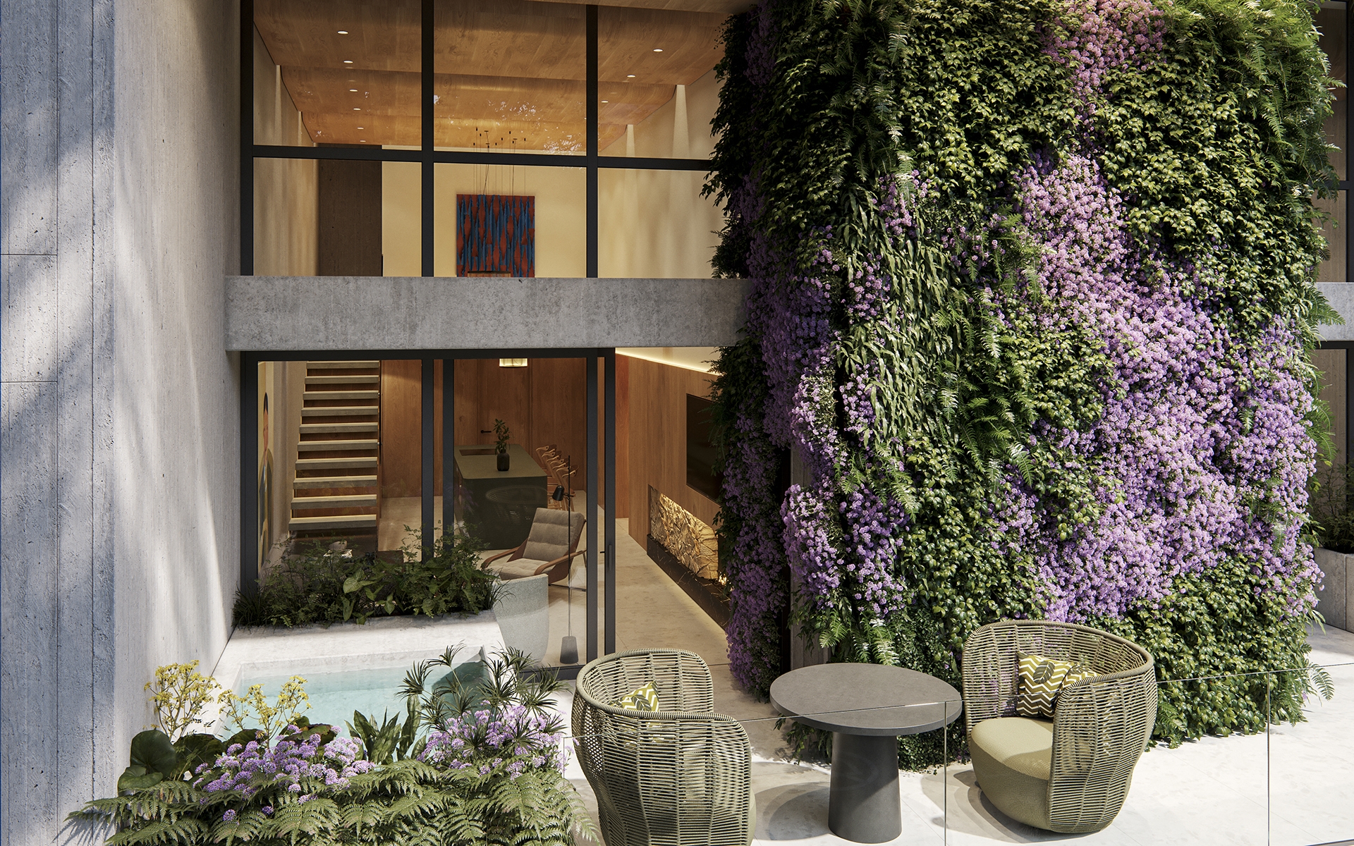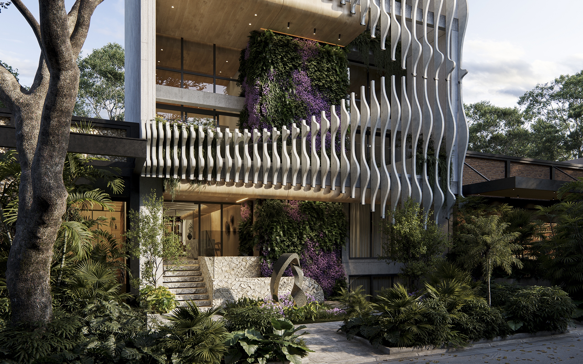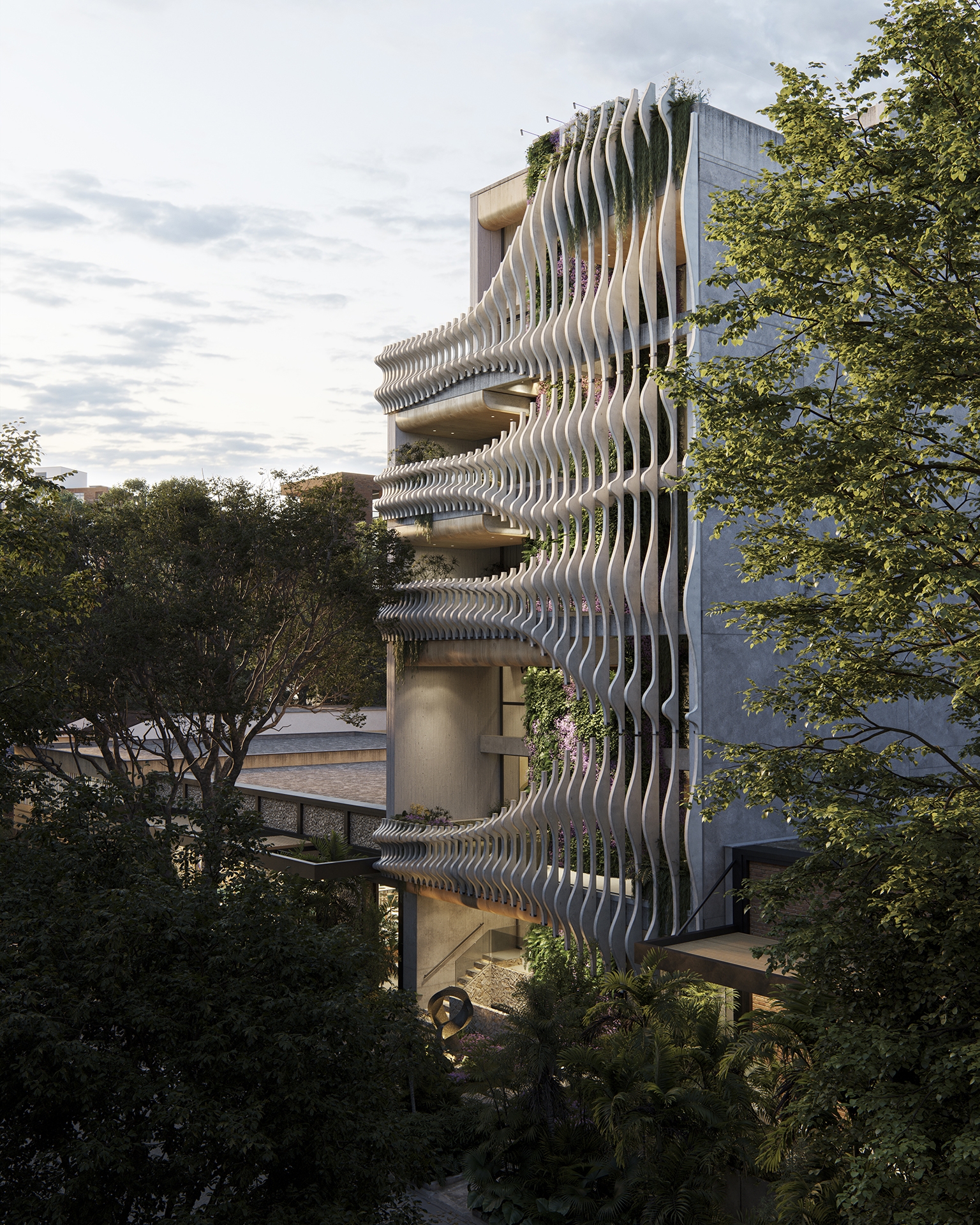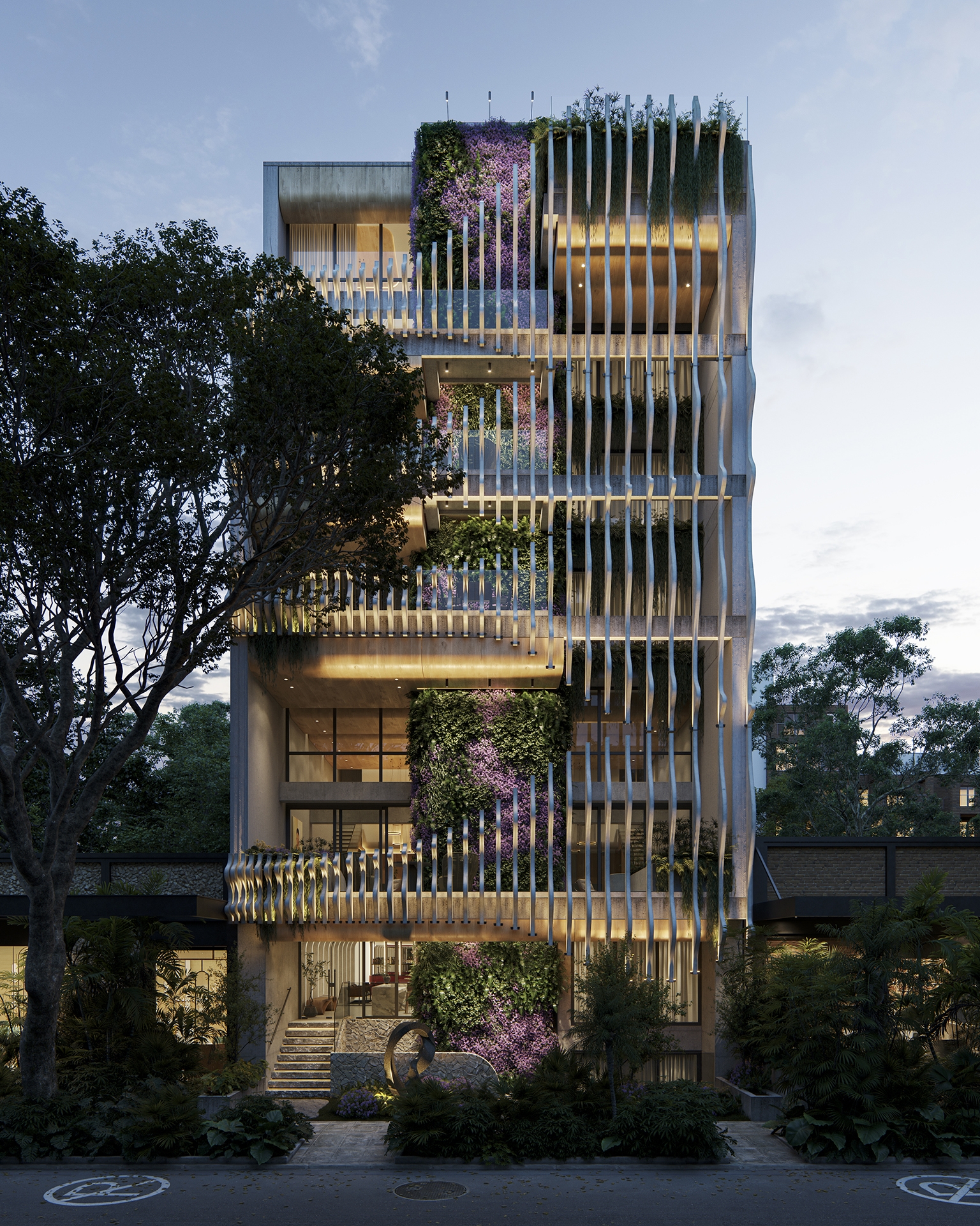 Inspired by Cattleya trianae, Colombia’s national orchid, the building’s vertical composition mirrors the flower’s form—roots, stem, leaves, petals—creating a botanical narrative expressed through light and flow. Its six suites feature full kitchens, laundry, and workspace for extended stays, while open areas encourage both privacy and connection.