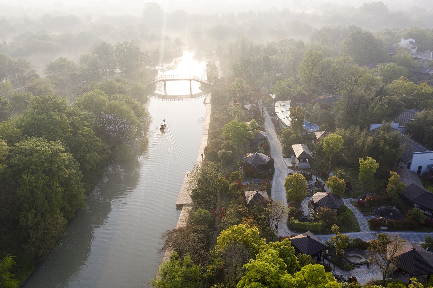 Set within the historic landscape of Slender West Lake, the 13-hectare resort transforms a fragmented site into a fluid, water-centered retreat. Inspired by Yangzhou garden traditions, a central lake replaces isolated hot spring pools and becomes the spatial core, linking arrival, spa zones, pools, and villas into a continuous journey.
