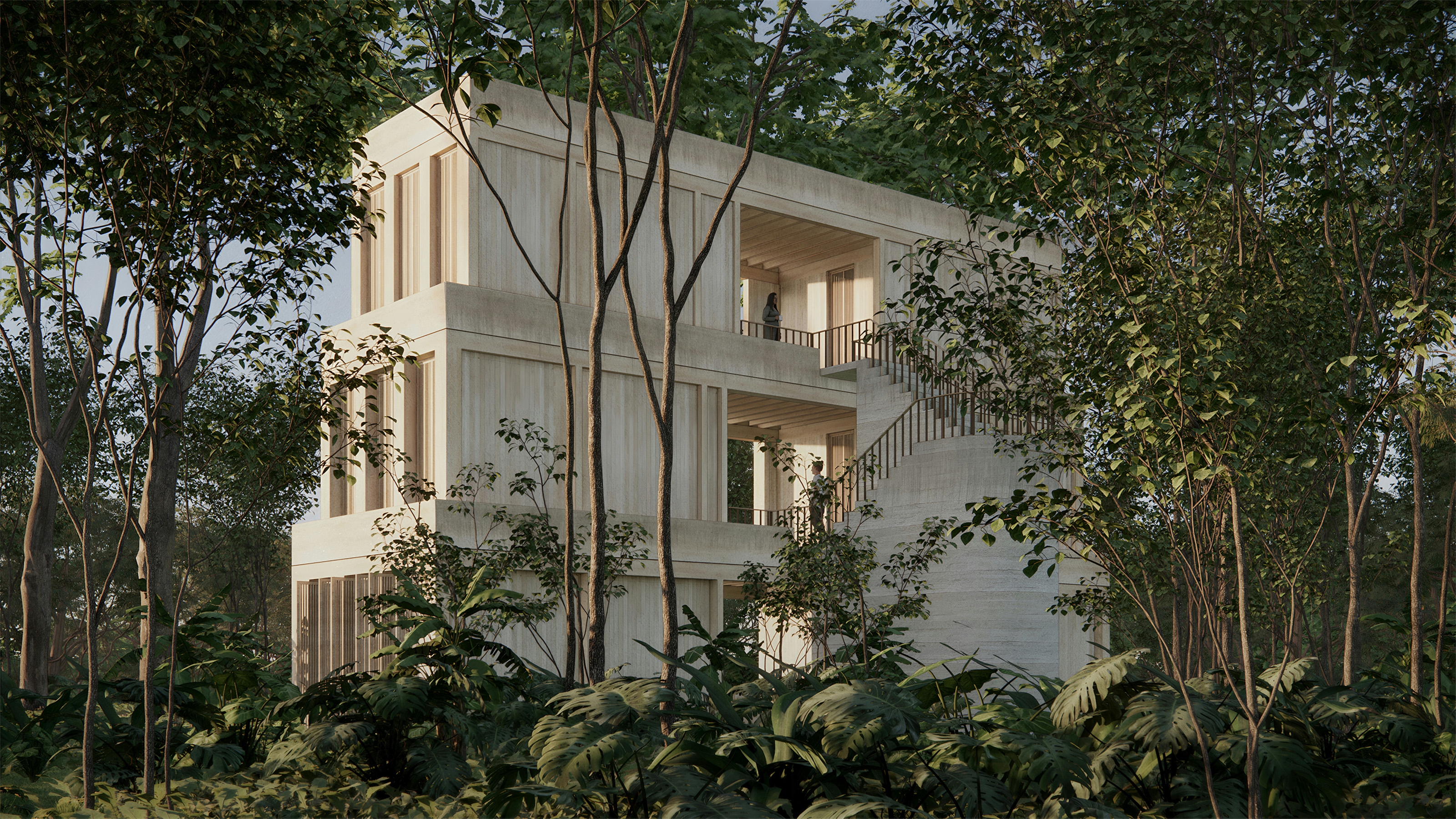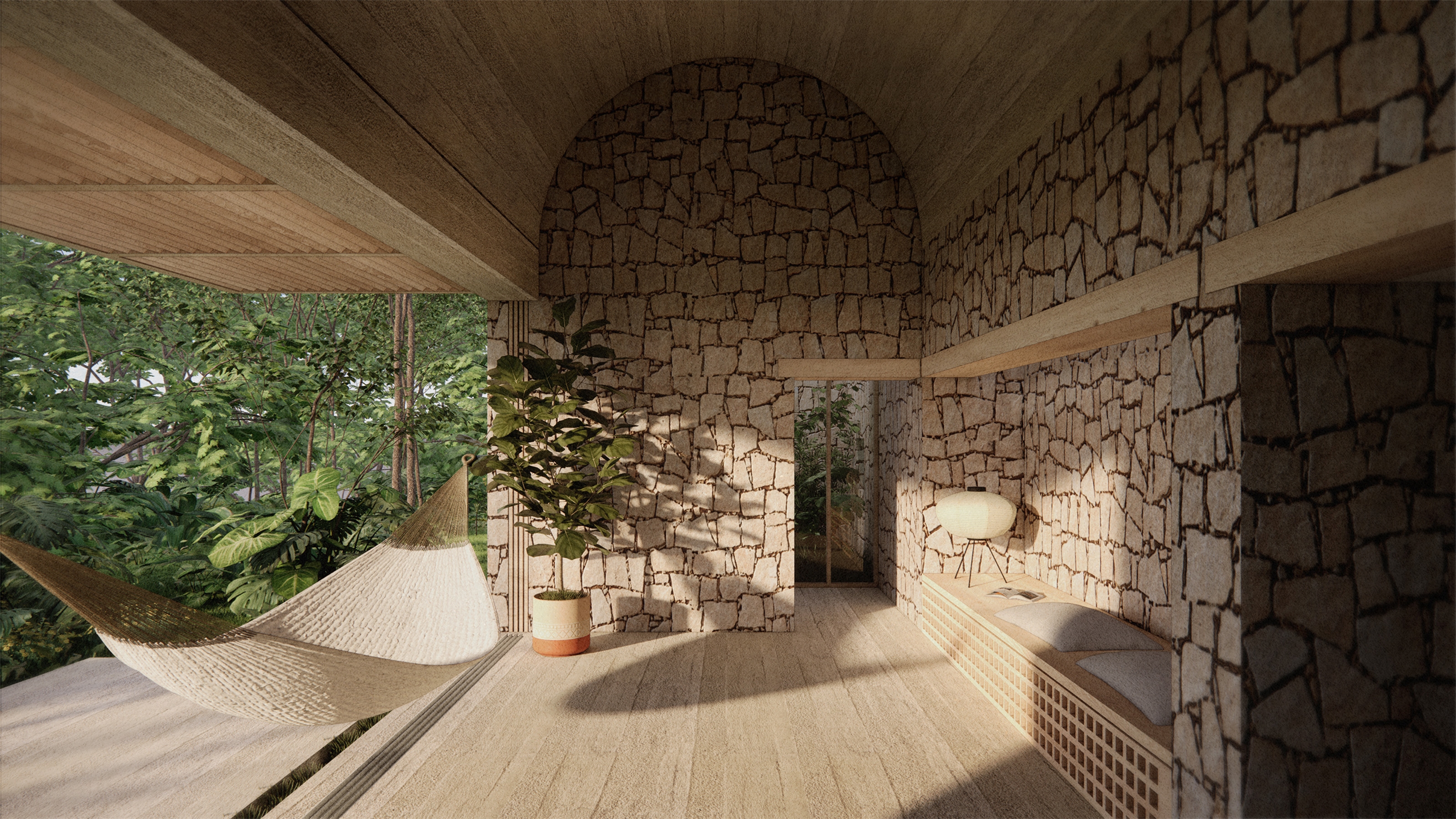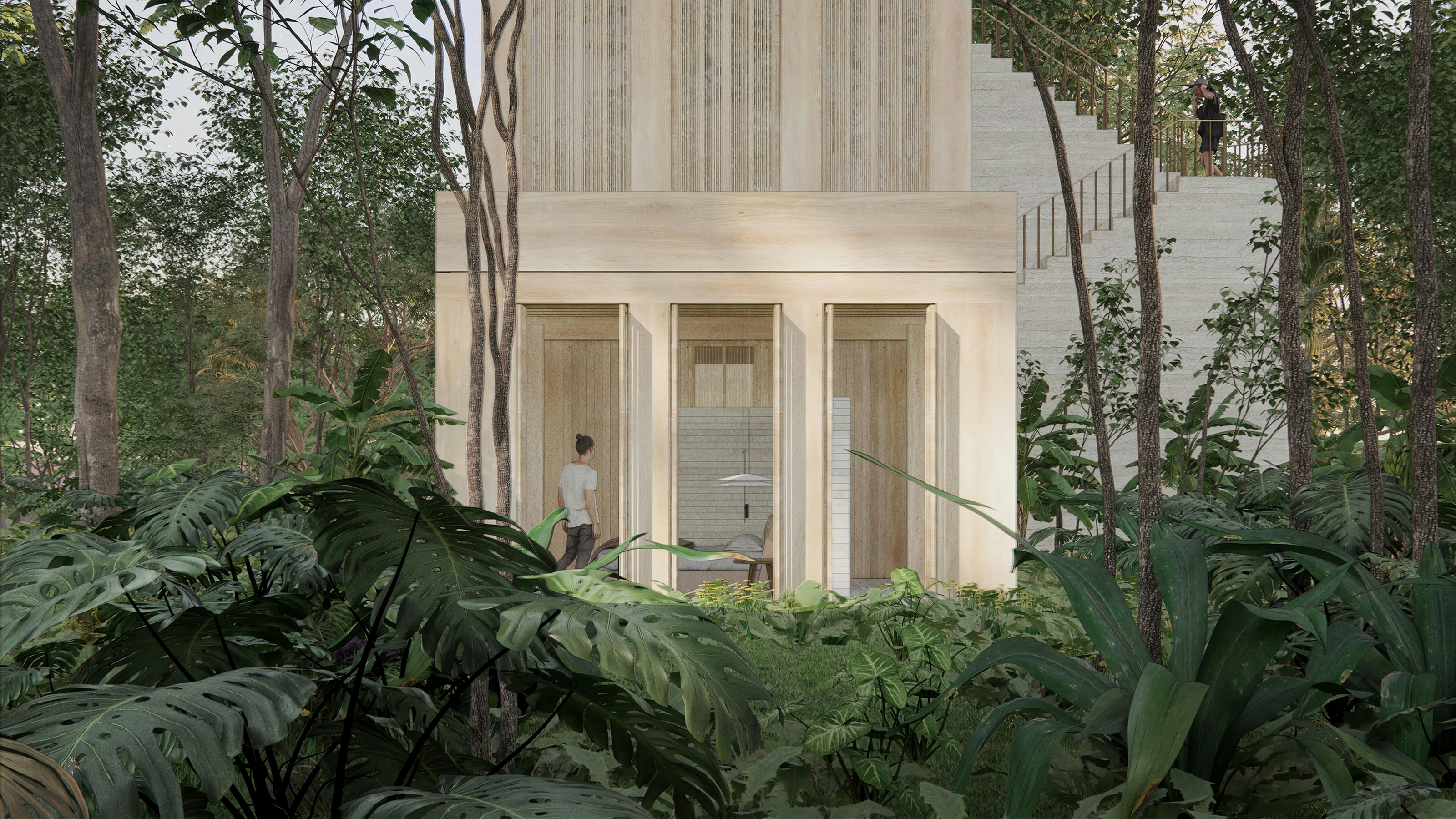 Within this village core, guest rooms are elevated to the second story, featuring private balconies and gardens that merge with the jungle canopy. Beyond the historic grounds, two new guest typologies, semi-private and standalone villas, are sited to maximize immersion in the landscape. Drawing on local construction techniques and vernacular language, the architecture is impactful, immersive, and luxurious while remaining deeply rooted in its location. Through passive design strategies such as high ceilings, modest window-to-wall ratios, and cross ventilation, the project ensures ecological sensitivity. The result is a self-sufficient, low-impact hospitality experience where the architecture dissolves into the landscape.