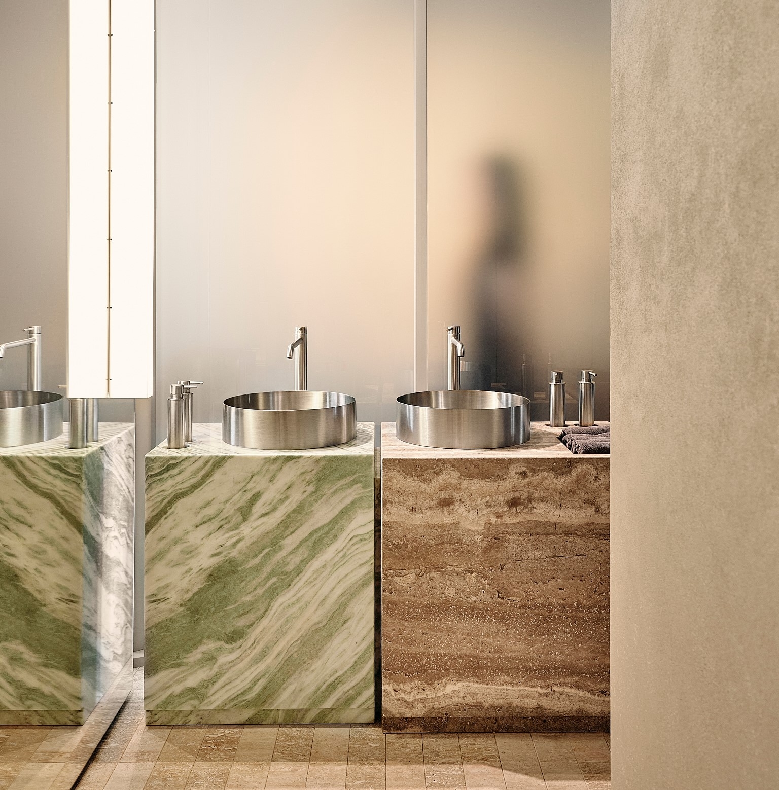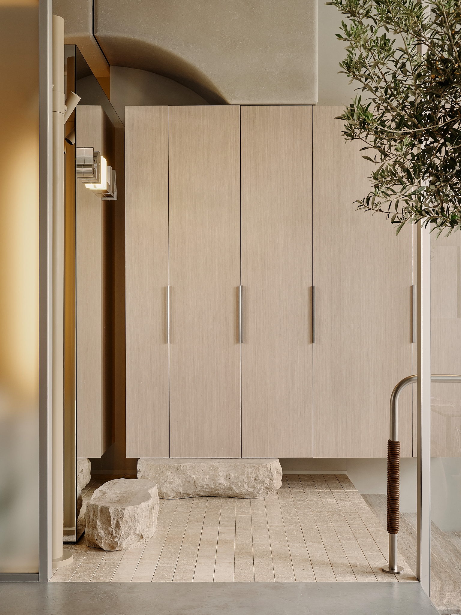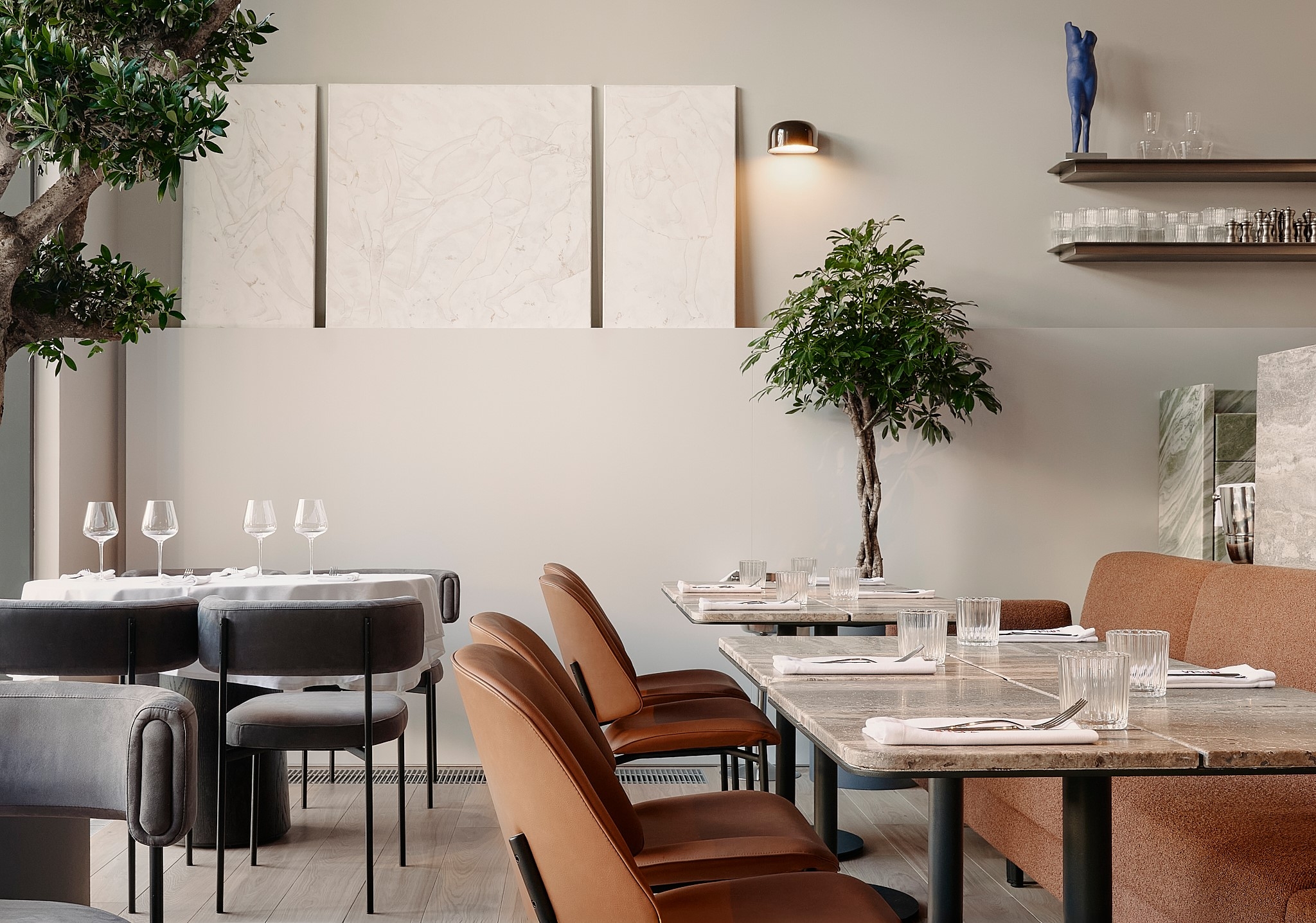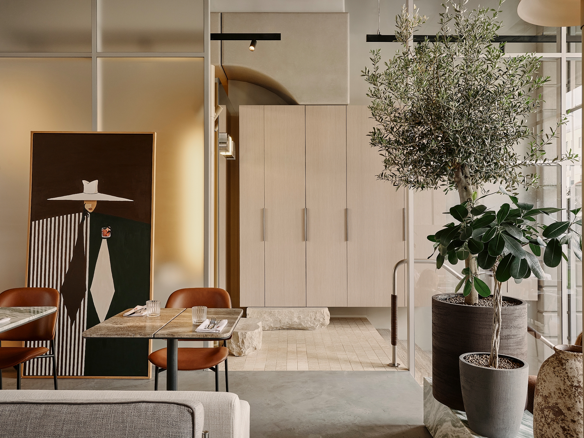 The interior draws inspiration from fashionable, fast-paced Milan, a city where street life flows naturally and energetically. This influence gave rise to the idea of “controlled chaos,” expressed through shifted axes, varied textures, and irregular geometry that create a sense of movement. The central dining area recalls a lively city street with lampposts and trees, where symmetry gives way to spontaneity.