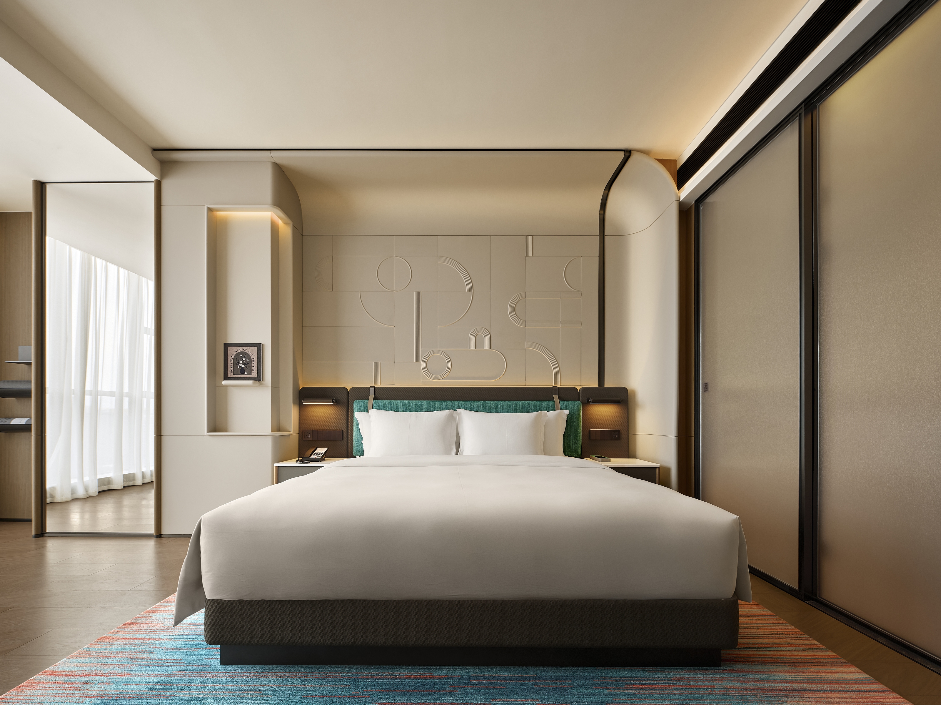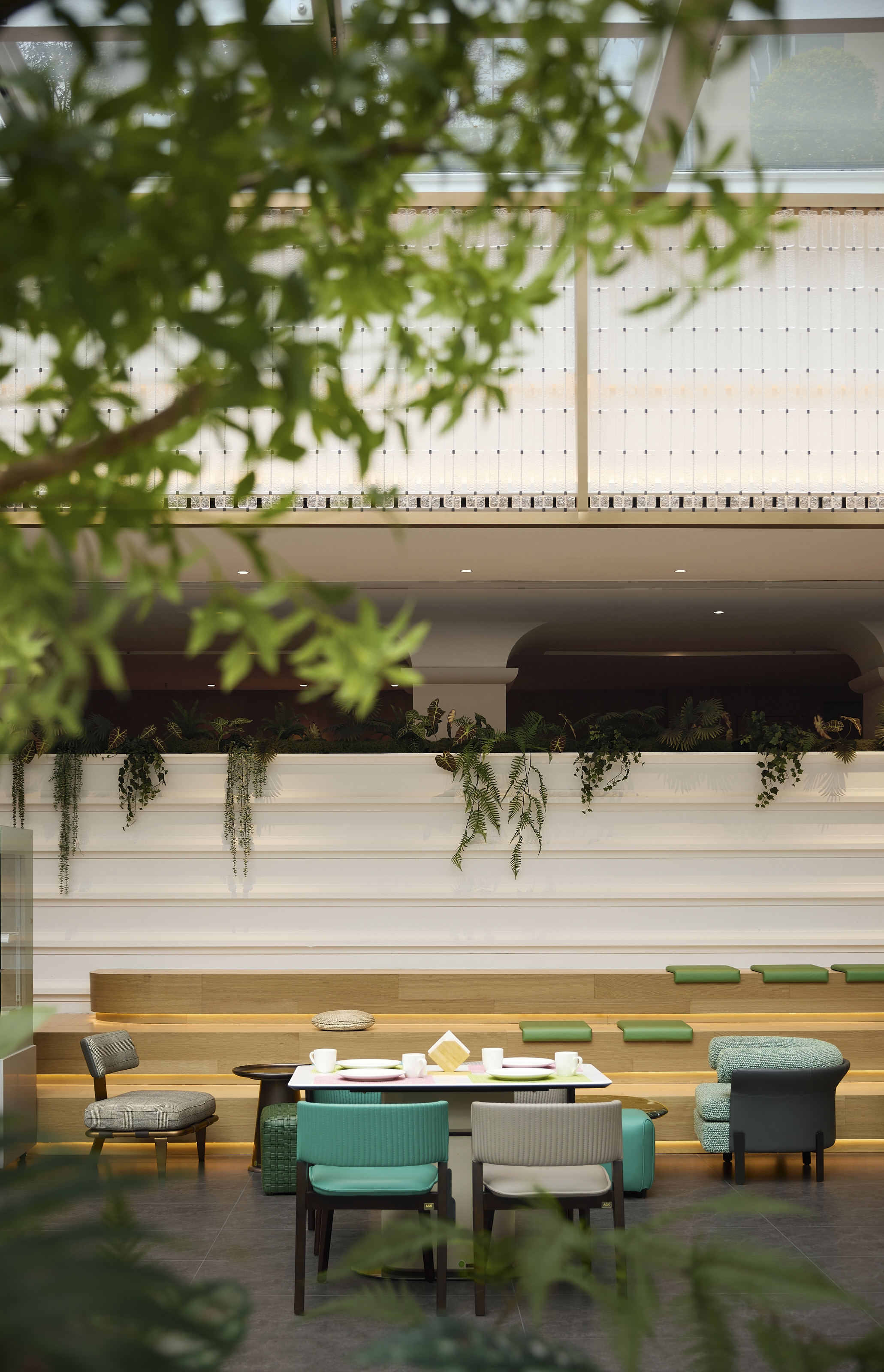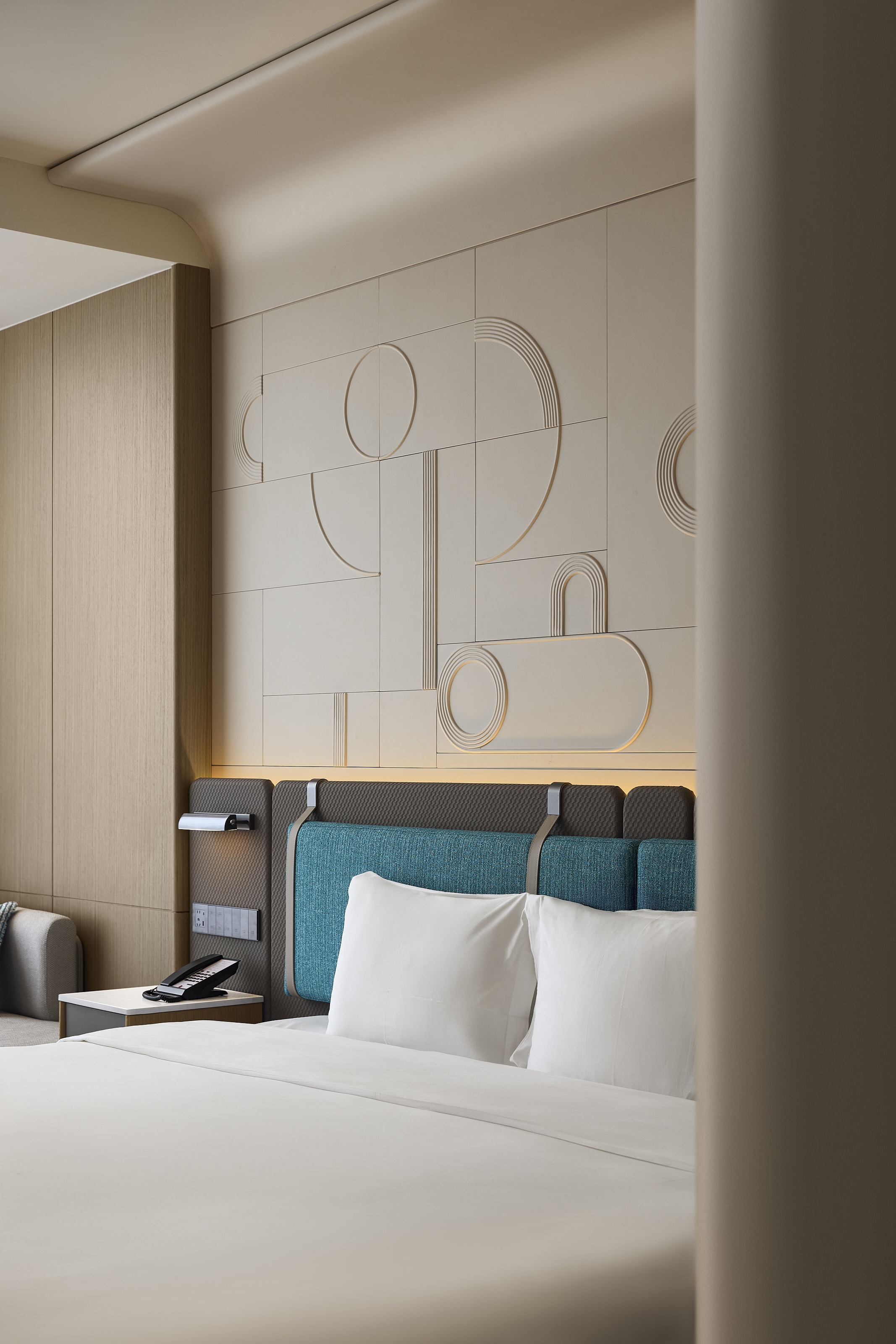 The hotel comprises five functional zones, catering to the full spectrum of traveler needs—from fitness and dining to focused work and restorative rest. In the lobby, a living green wall creates a visual highlight, complemented by marble flooring and light-toned wood panels to generate a refreshing atmosphere. The restaurant atrium draws in daylight via an expansive skylight, where a botanical-inspired installation becomes the focal point. Light-toned patterned tiles and subtle metallic accents add a touch of rhythm and vibrancy. Guestrooms feature a distinctive palette of cinnabar orange and indigo green, softened by light hues and organic materials, offering travelers a sanctuary that balances relaxation and efficiency.