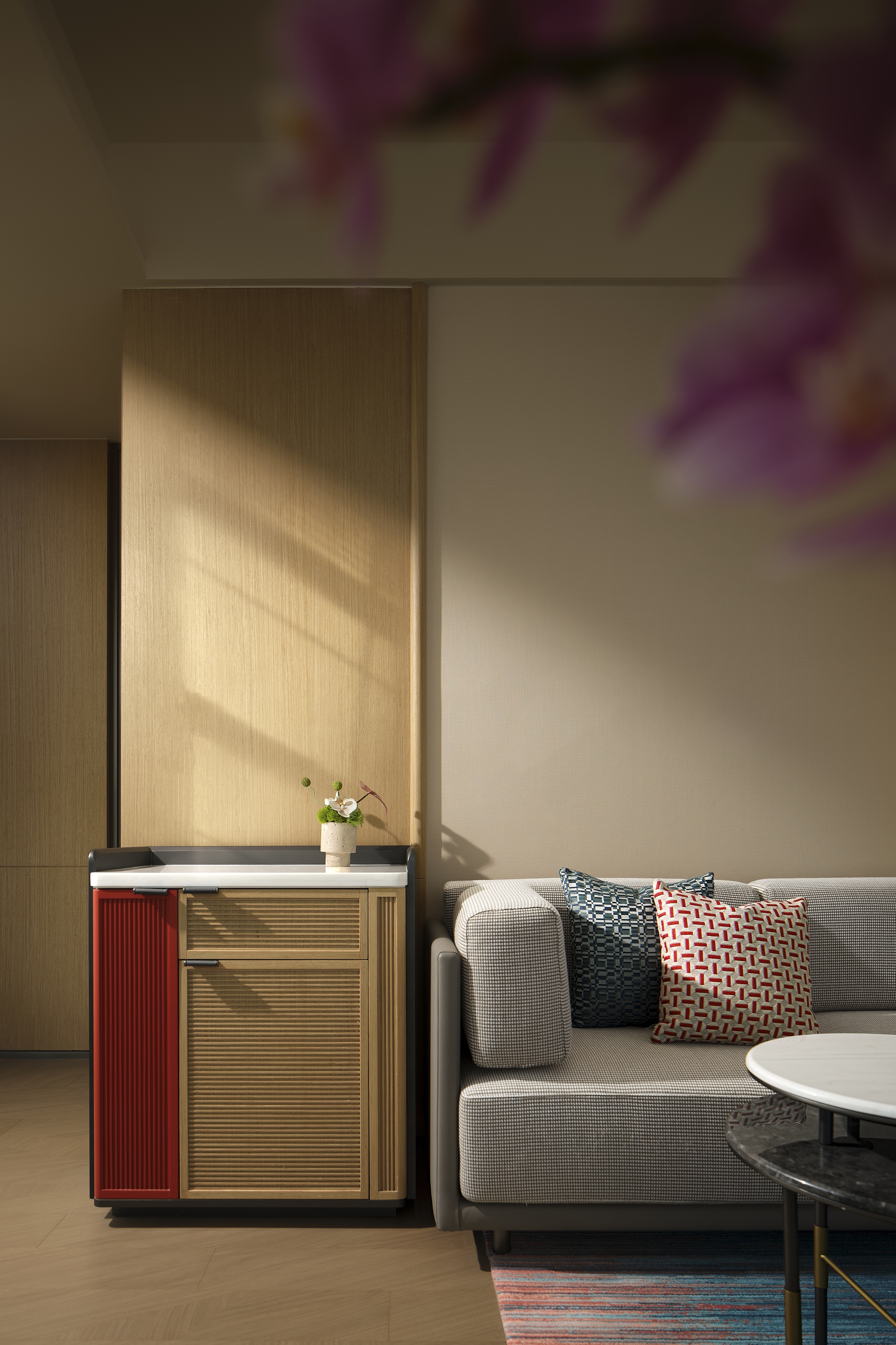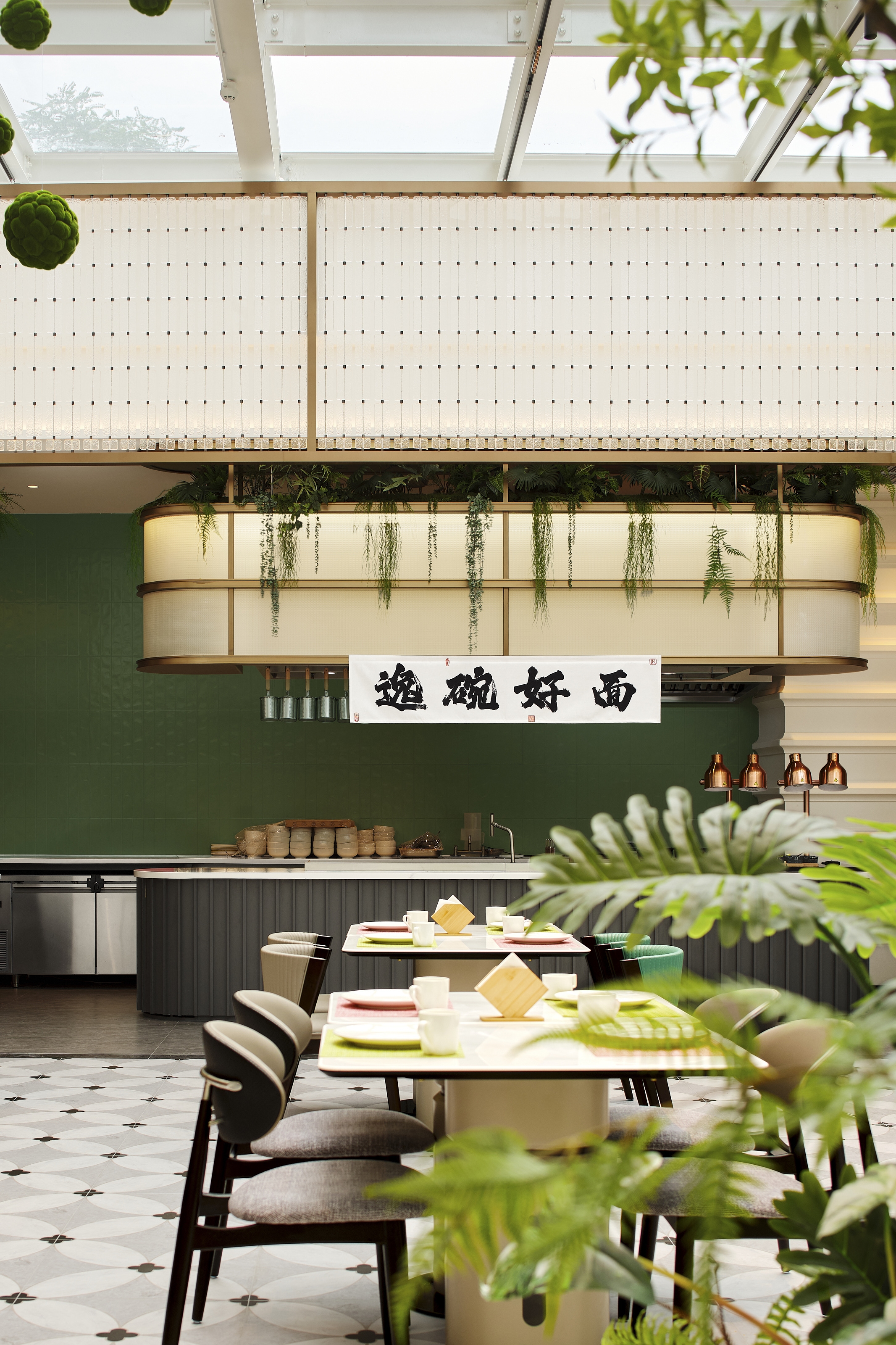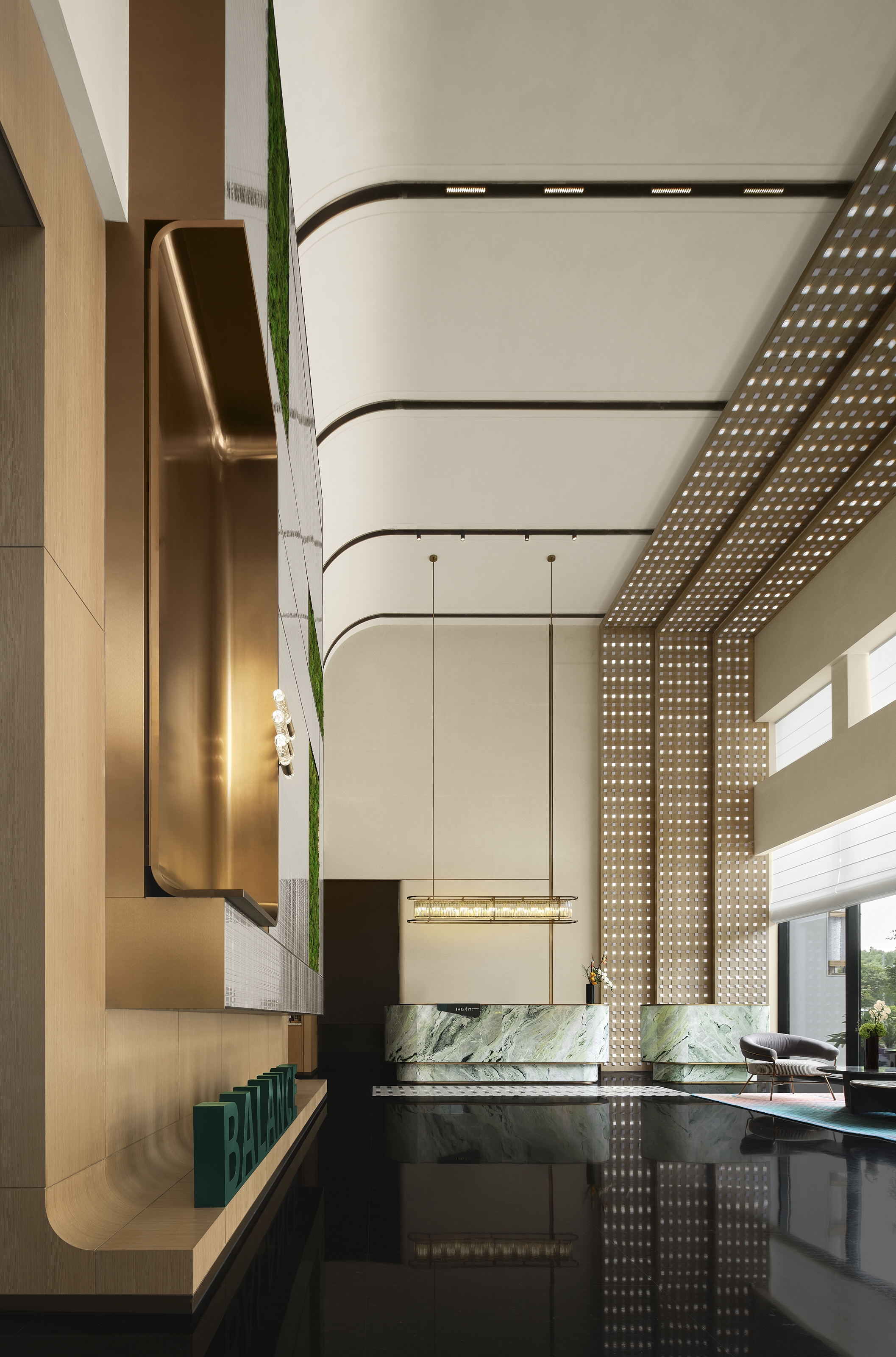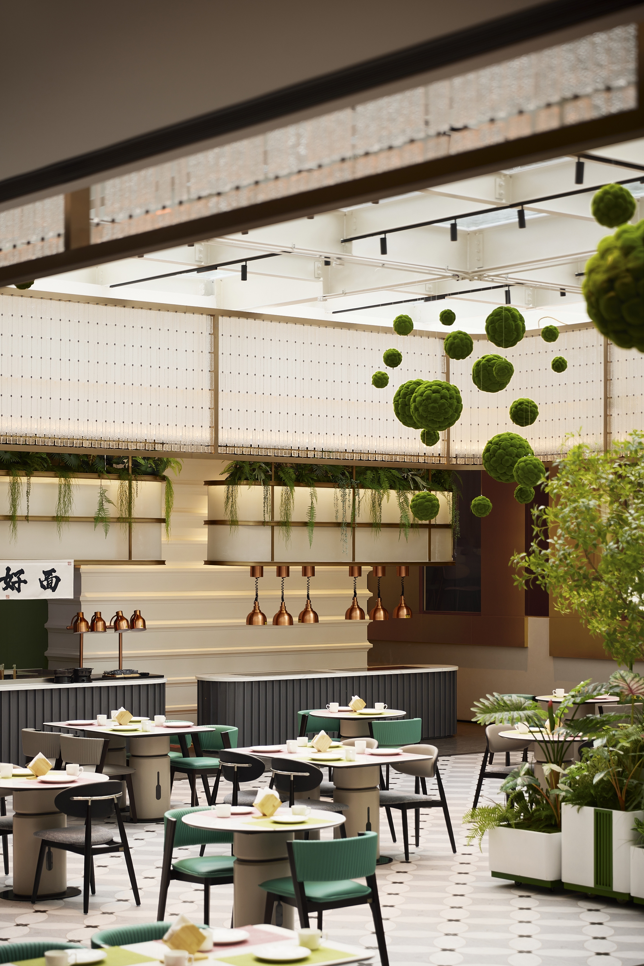 The hotel comprises five functional zones, catering to the full spectrum of traveler needs—from fitness and dining to focused work and restorative rest. In the lobby, a living green wall creates a visual highlight, complemented by marble flooring and light-toned wood panels to generate a refreshing atmosphere. The restaurant atrium draws in daylight via an expansive skylight, where a botanical-inspired installation becomes the focal point. Light-toned patterned tiles and subtle metallic accents add a touch of rhythm and vibrancy. Guestrooms feature a distinctive palette of cinnabar orange and indigo green, softened by light hues and organic materials, offering travelers a sanctuary that balances relaxation and efficiency.