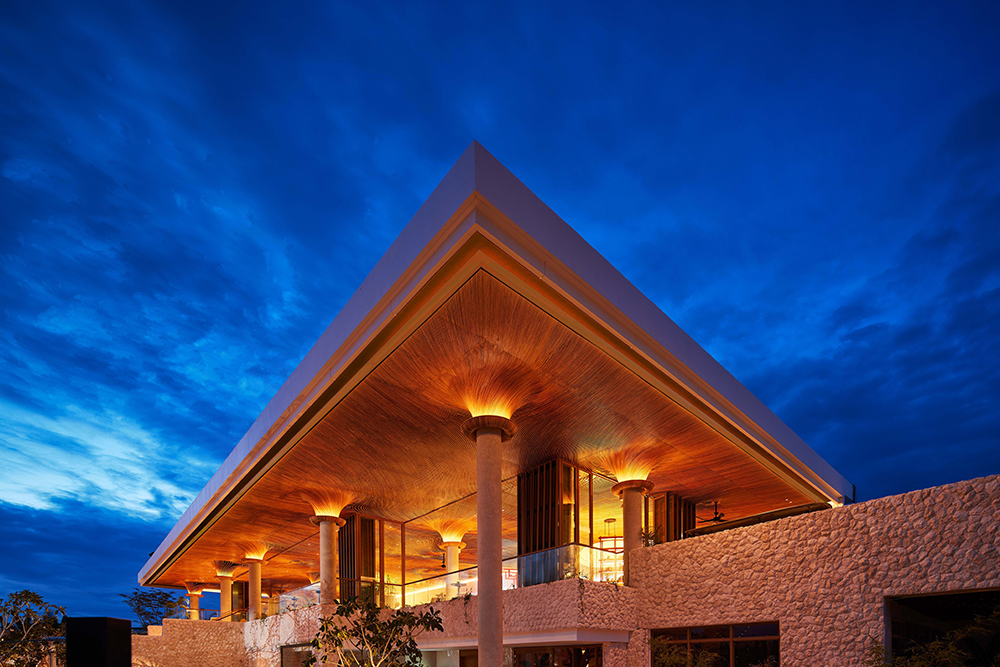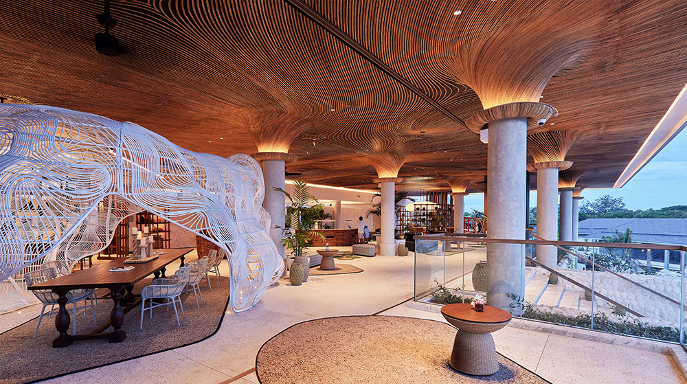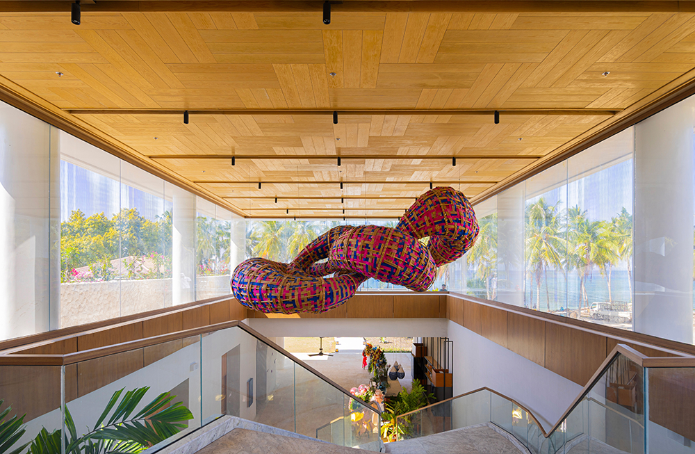 At the heart of the resort, the event pavilion—a 95 sqm shell-inspired structure—embraces natural ventilation through its amoebic form and shell-like shingles. This design enhances guest comfort while harmonizing with the sea & sand palette. The stair sculpture, a closed-loop rattan installation interwoven with colorful recycled fabric, symbolizes continuity & connection, anchoring the resort’s narrative of harmony between people & planet.