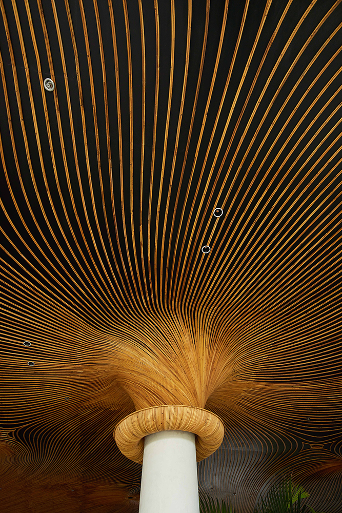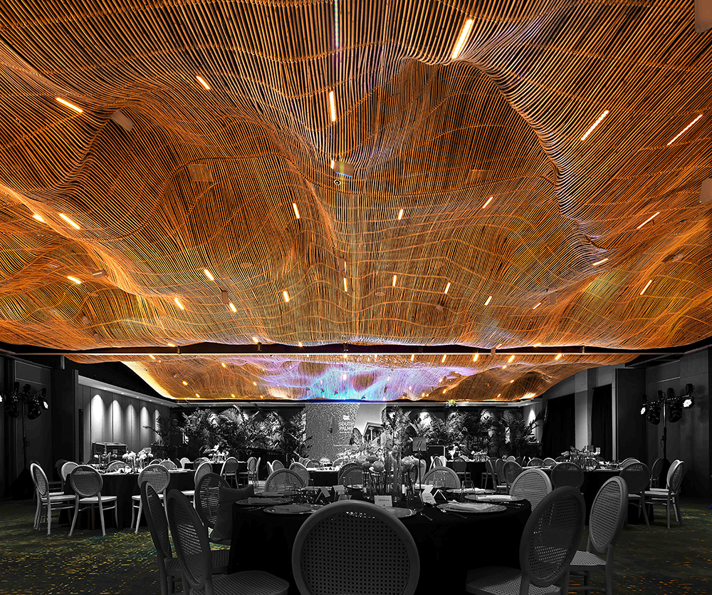 Inside the lobby and conference ceilings, over one kilometer of plastic finishes were replaced with handwoven rattan. These natural forms converge into vortex-like patterns—a digital simulation of energy in motion. The result is an immersive spatial experience that radiates warmth, tactility & ecological consciousness.