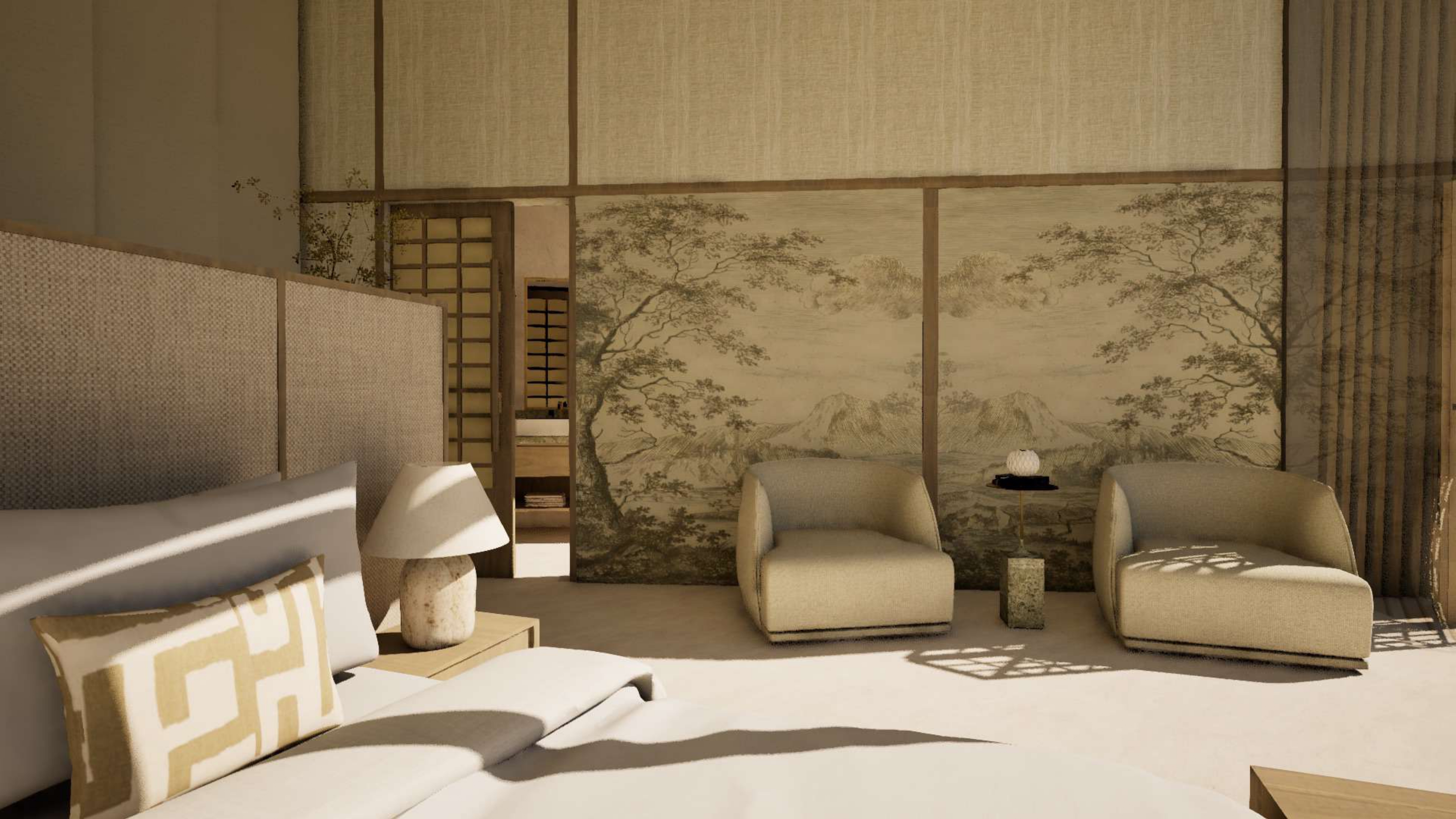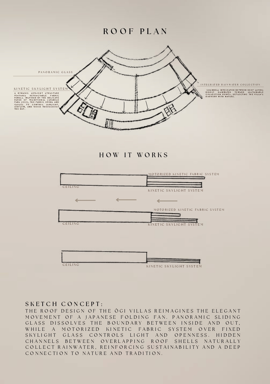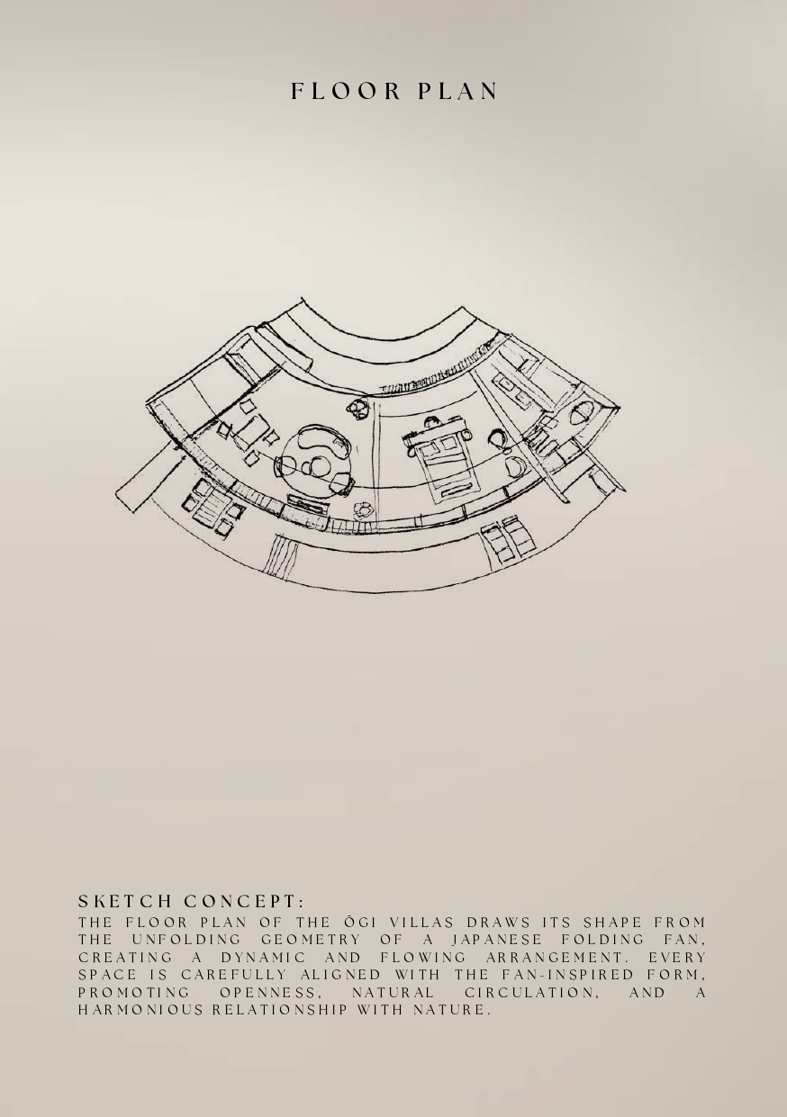 The concept responds to the post-pandemic demand for personalized, healing, and adaptive retreats. Guests seek flexible privacy, wellness rituals, and immersive experiences in nature. Inspired by the graceful geometry and symbolism of the ?gi fan, this suite system offers a space that unfolds to the user's changing needs: rest, reflection, connection, or rejuvenation.