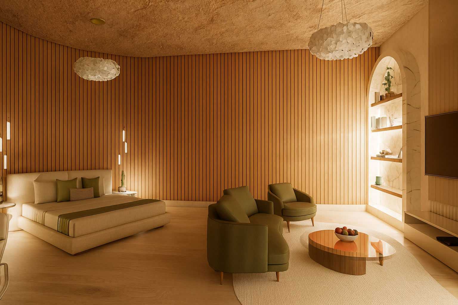 Sustainable and health conscious finish materials reinforce the project’s focus on well being. Overall, Le Désert Doré provides a peaceful, luxurious experience that promotes renewal, comfort, and connection to the surrounding desert landscape.